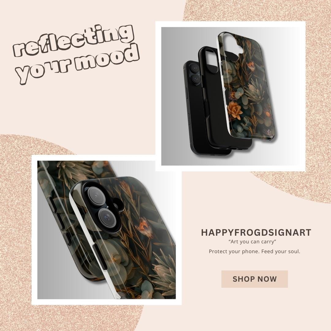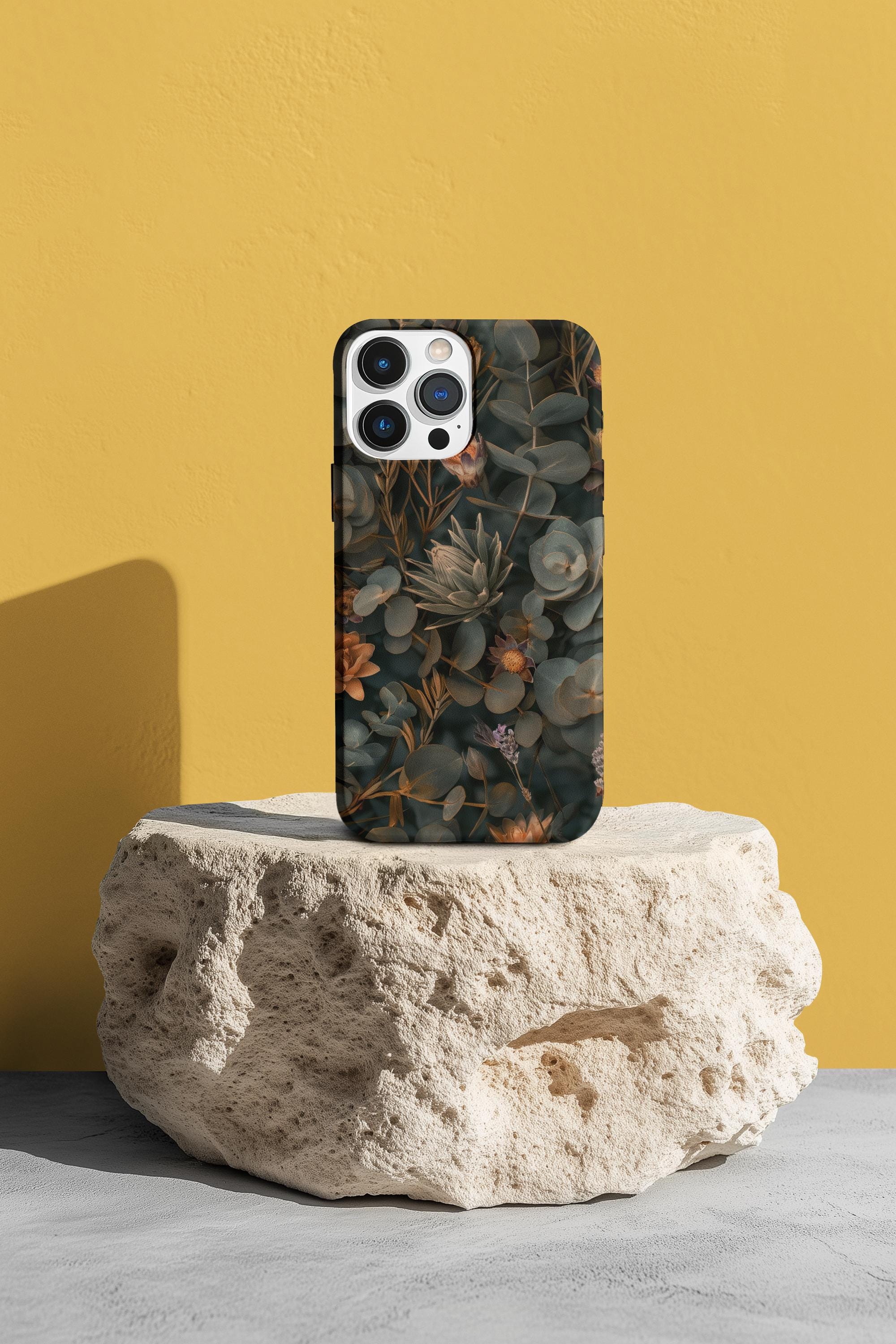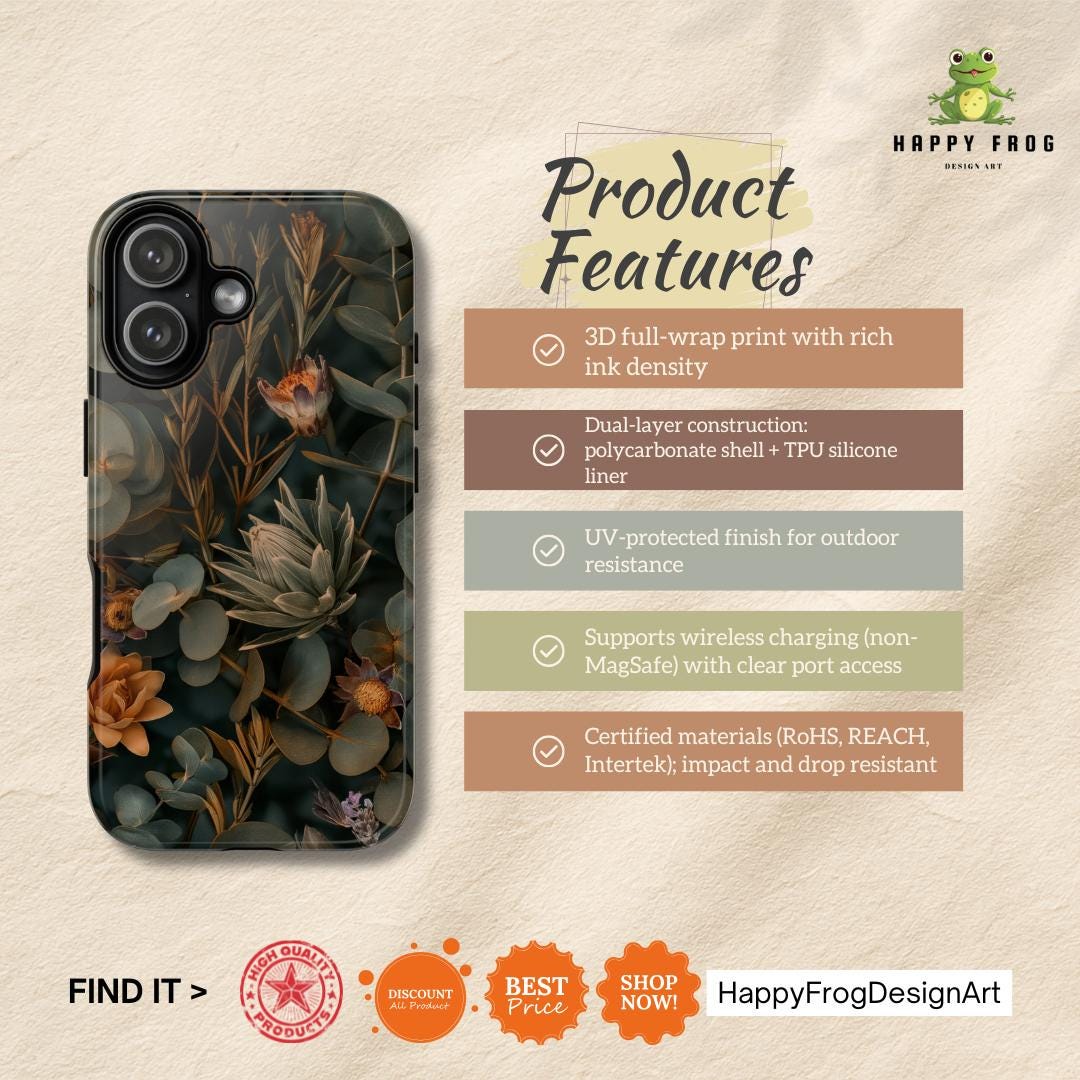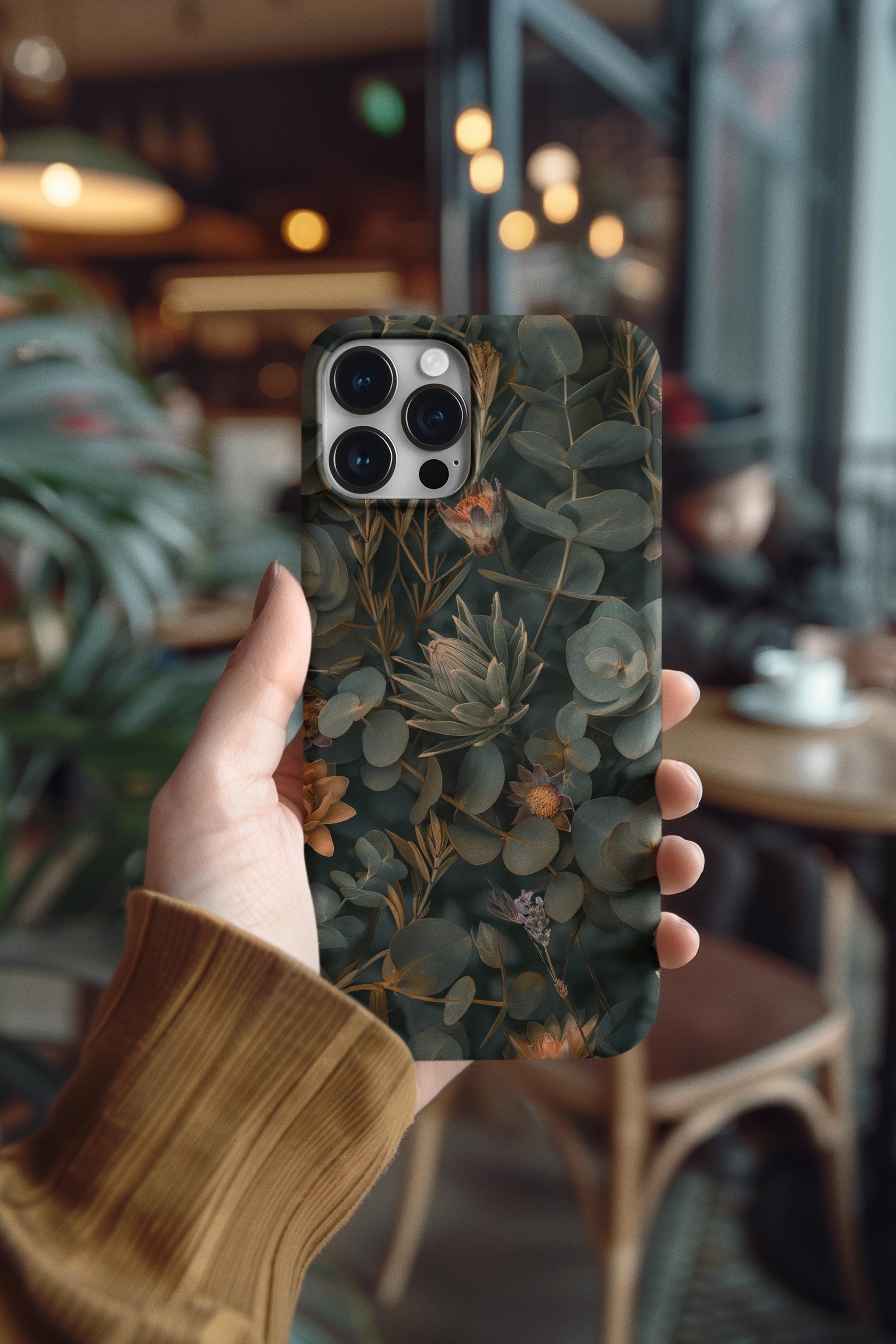 This tough phone case wraps your device in a moody, botanical tapestry — deep greens, muted golds, and sculpted succulents layered to feel like a pocket of quiet forest. The dual-layer shell and TPU liner cushion against shocks and drops, while the full-wrap print preserves the art across edges for a seamless, gallery-like look. It wears well outdoors thanks to UV protection, and the glossy or matte finish keeps the colors rich without losing detail. Slim enough for daily carry, with clear port openings and wireless charging compatibility, it’s built to protect without hiding the style you live in.