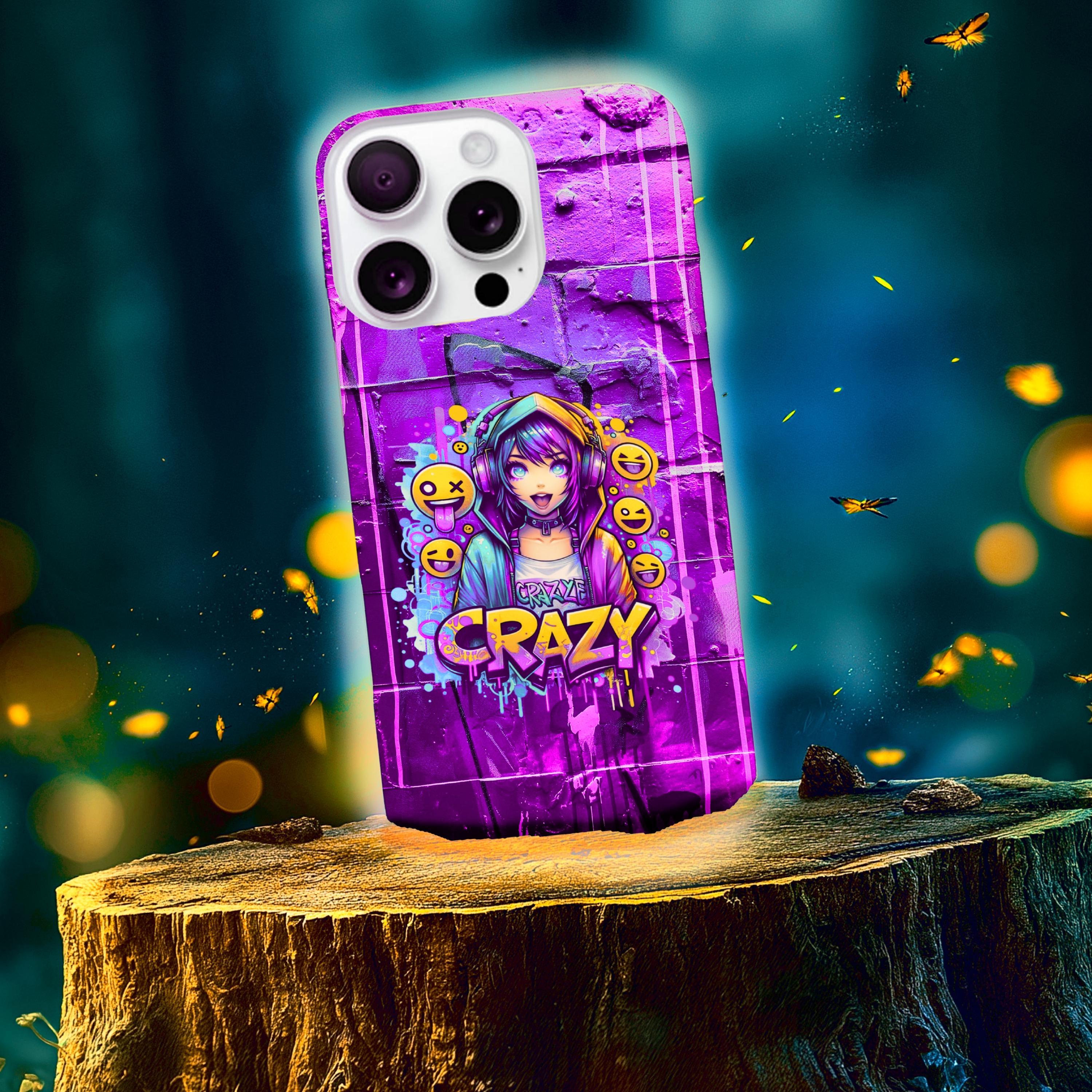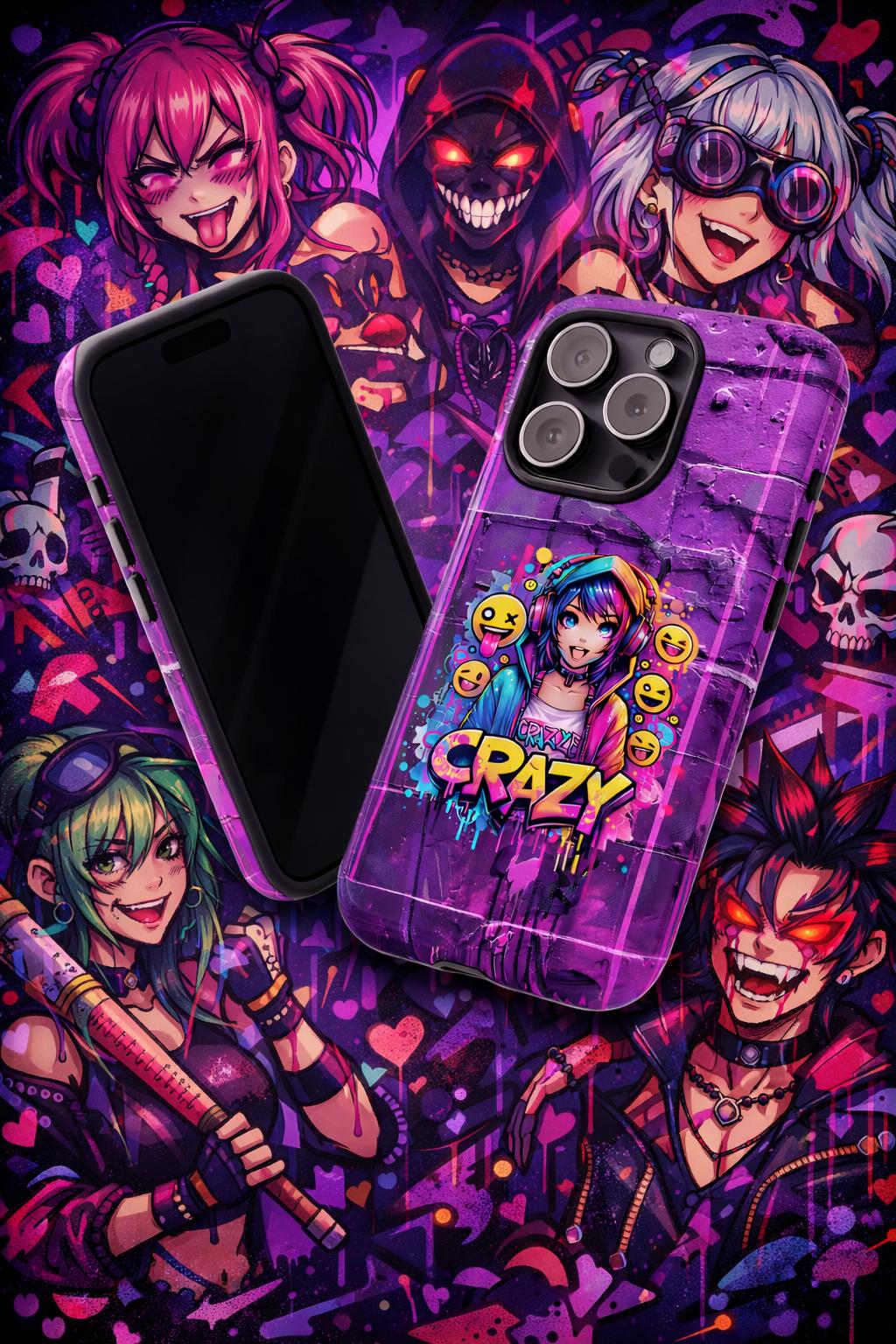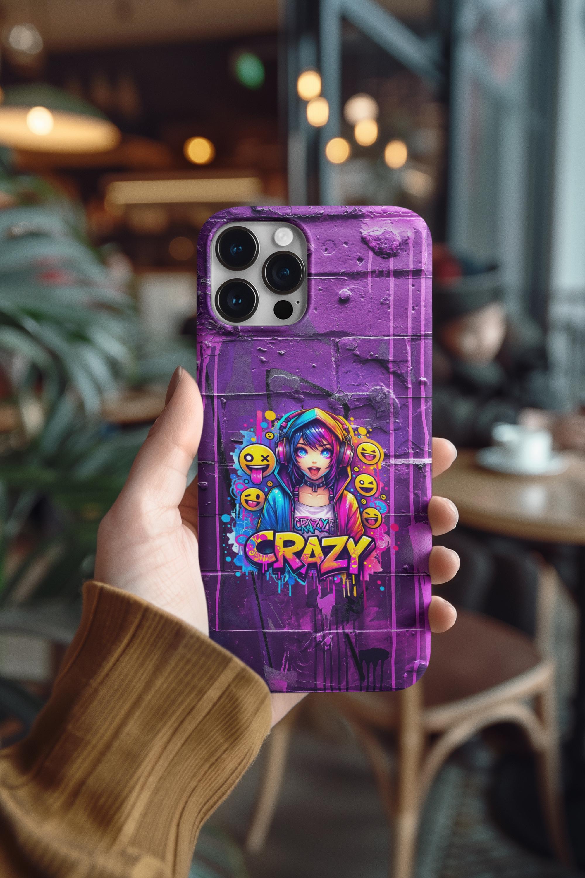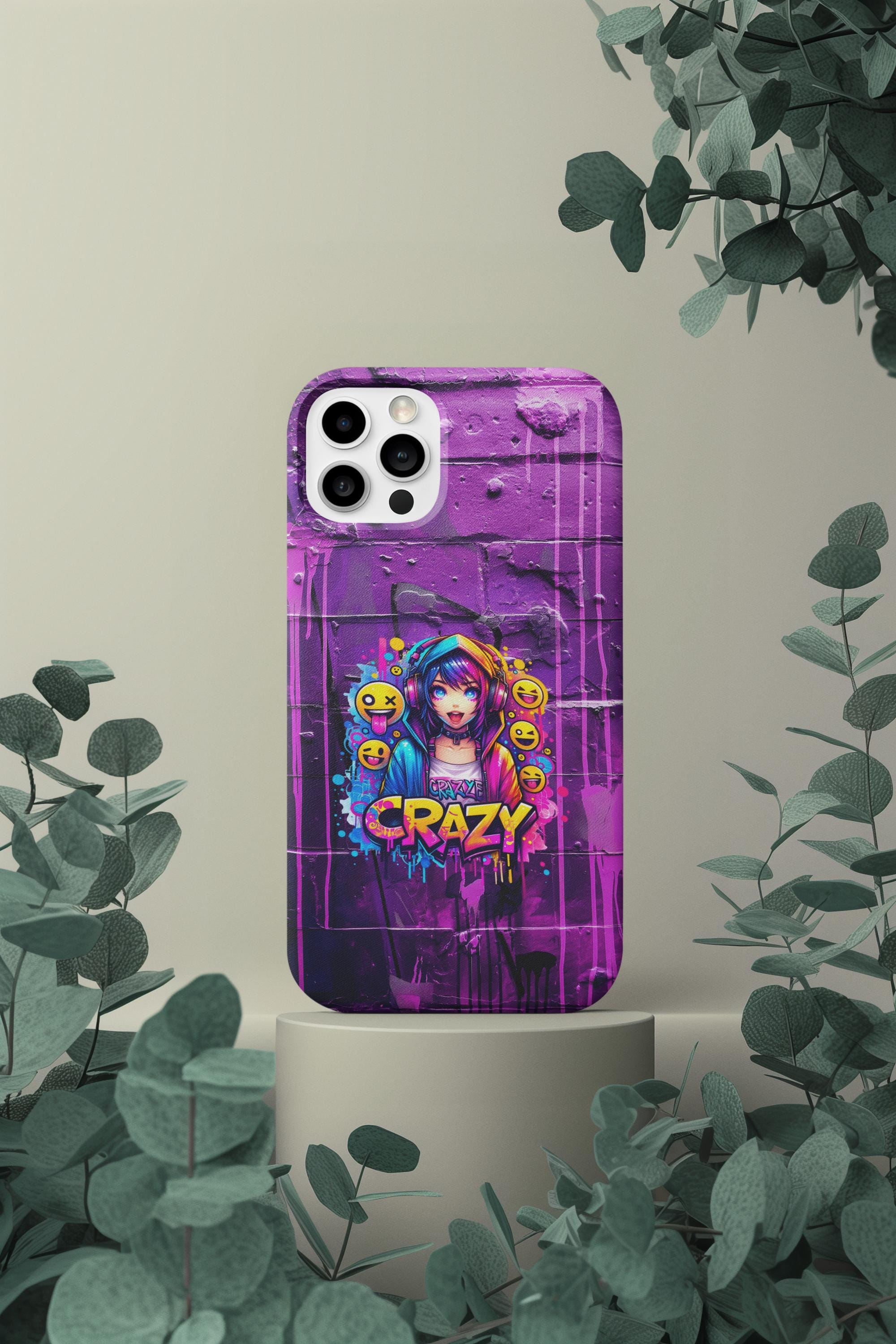 raffiti Anime Phone Case in Harajuku Y2K style. Designed for trendsetters and anime enthusiasts alike, this vibrant street-art inspired cover features a dynamic high-energy anime girl with headphones, surrounded by playful emojis and eye-catching "Crazy" graffiti lettering. Perfect for those who love to stand out, this purple aesthetic case blends cyberpunk vibes with edgy streetwear fashion.