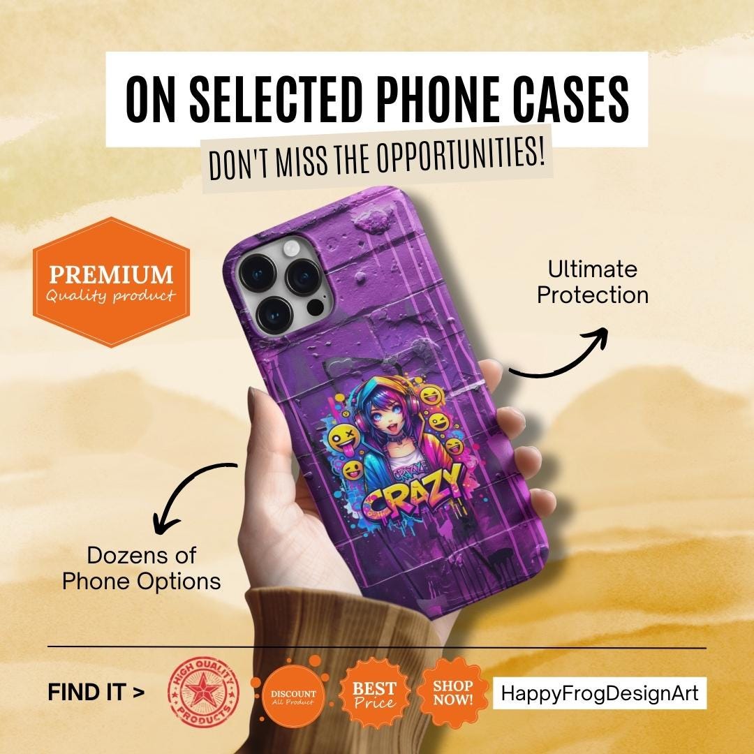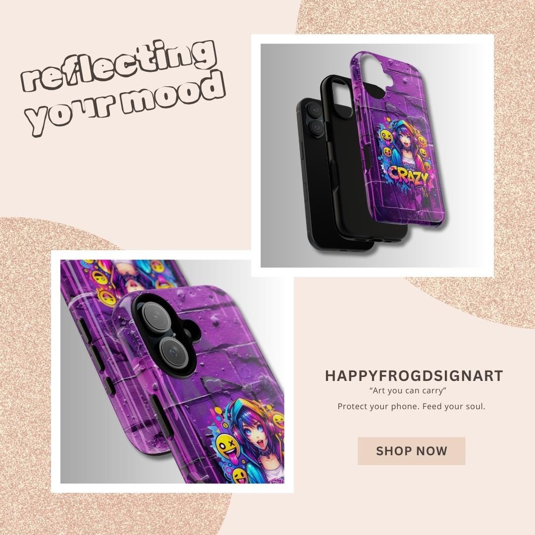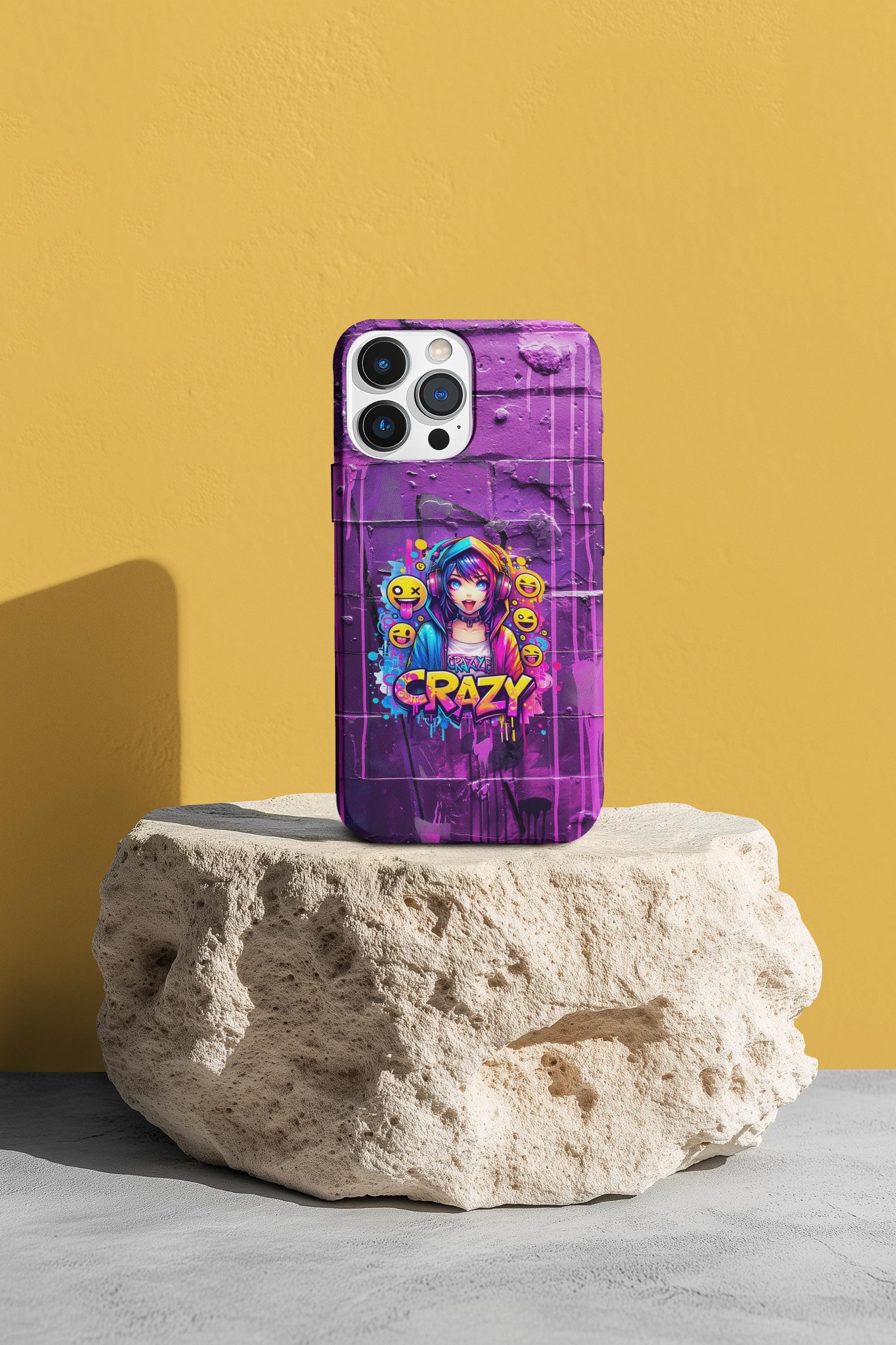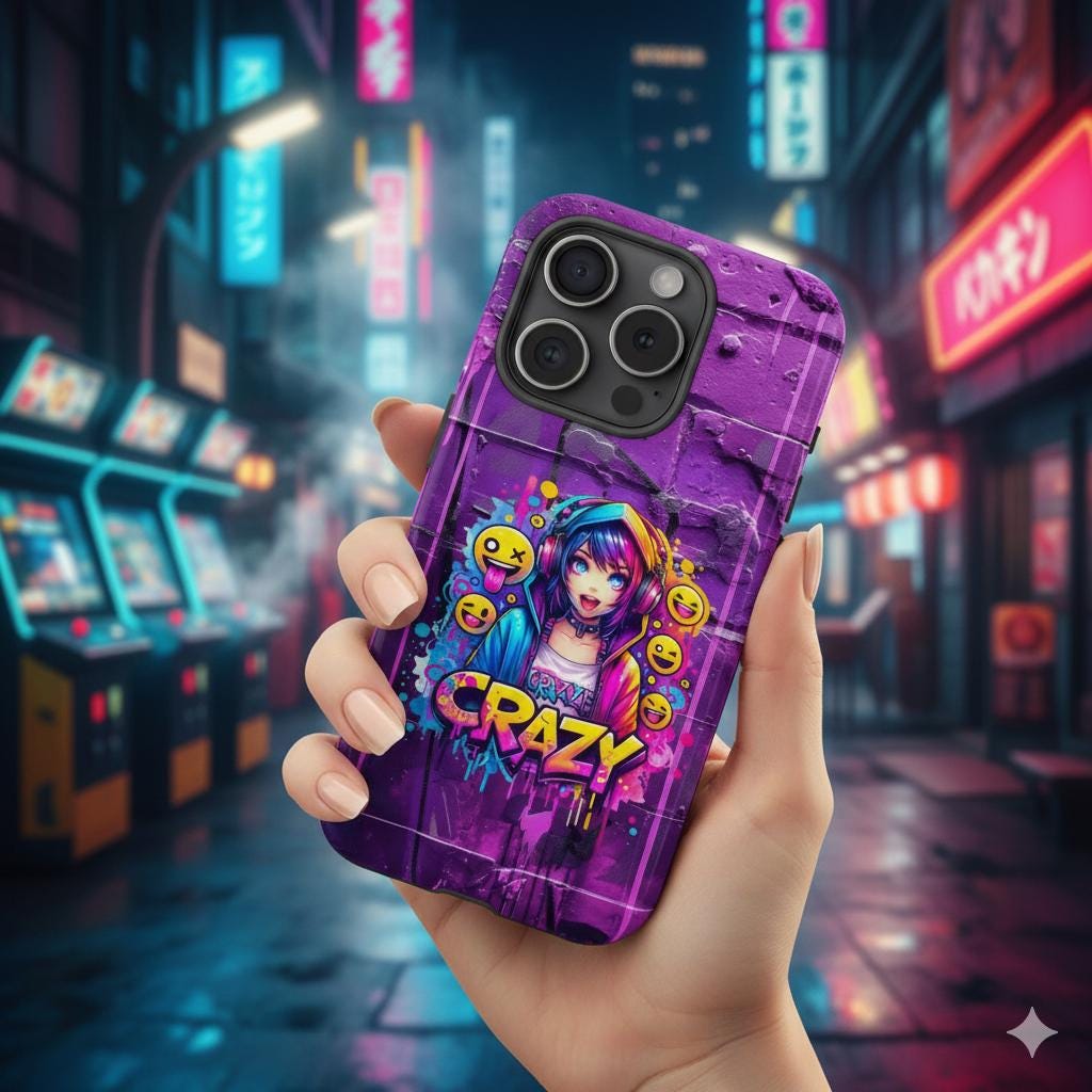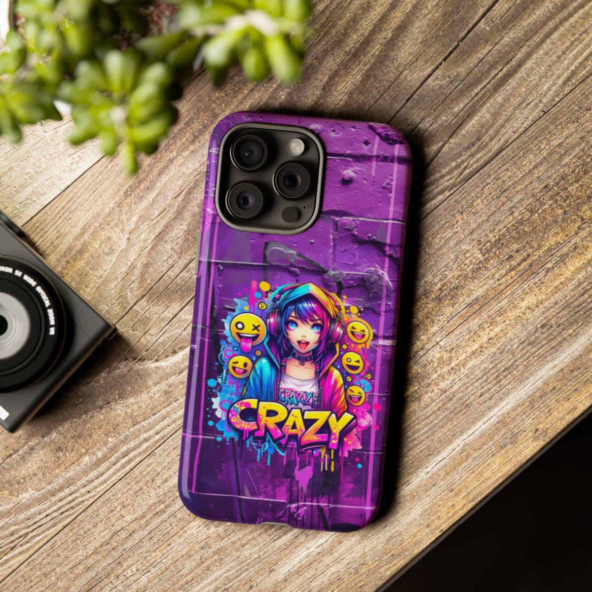 raffiti Anime Phone Case in Harajuku Y2K style. Designed for trendsetters and anime enthusiasts alike, this vibrant street-art inspired cover features a dynamic high-energy anime girl with headphones, surrounded by playful emojis and eye-catching "Crazy" graffiti lettering. Perfect for those who love to stand out, this purple aesthetic case blends cyberpunk vibes with edgy streetwear fashion.