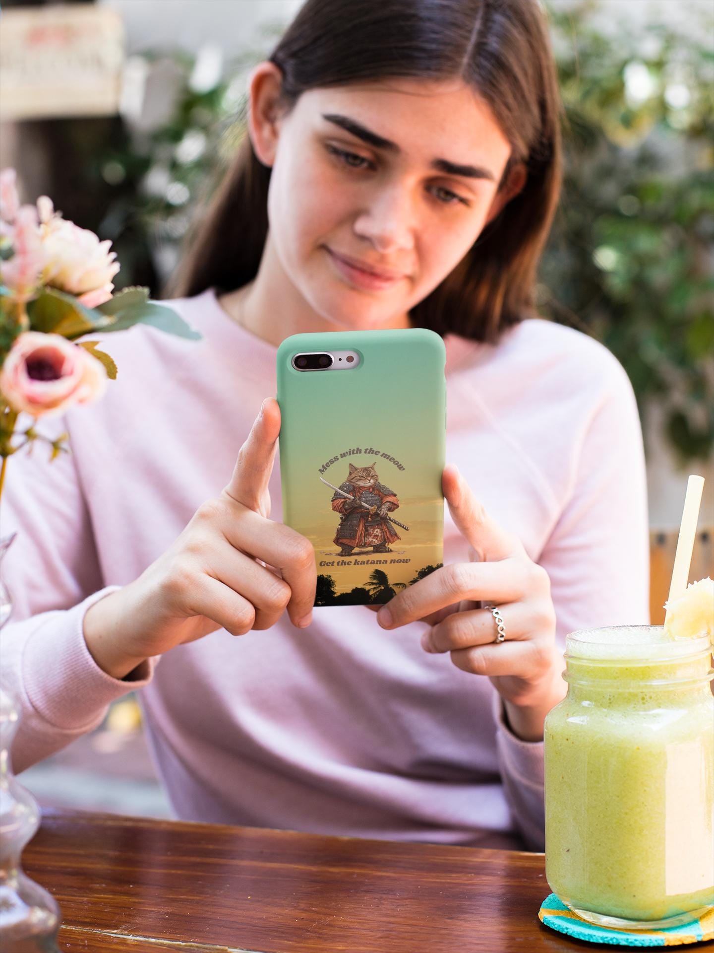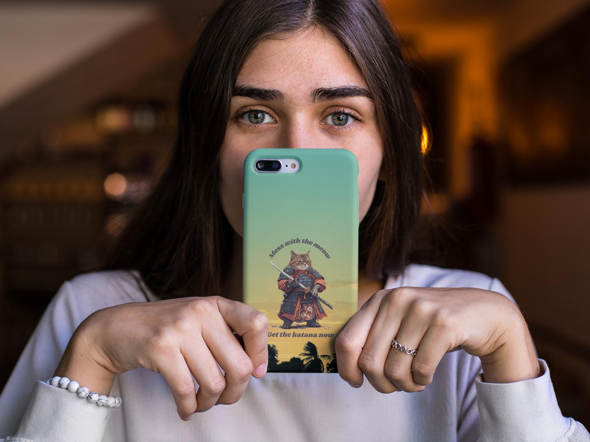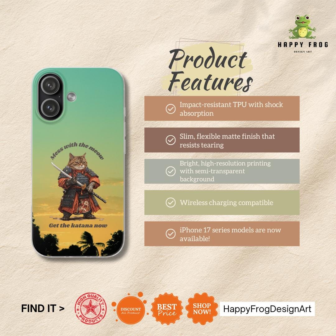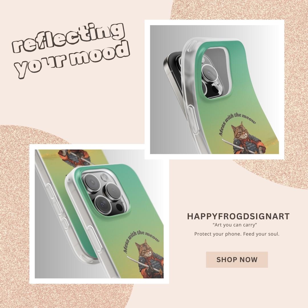 This slim Flexi case brings together playful attitude and everyday protection. A warrior-cat illustration stands against a warm gradient sky, giving the case a bold, storybook vibe that’s both whimsical and slightly fierce. The semi-transparent matte finish keeps the look subtle while allowing the vibrant print to pop. Lightweight and flexible, the case hugs the phone’s profile with precise cutouts for charging and cameras, yet absorbs shocks and resists tears so your device stays safe from daily knocks. It’s an unobtrusive companion that adds personality without bulk — great for those who love quirky art, samurai imagery, or a touch of humor in their tech gear.