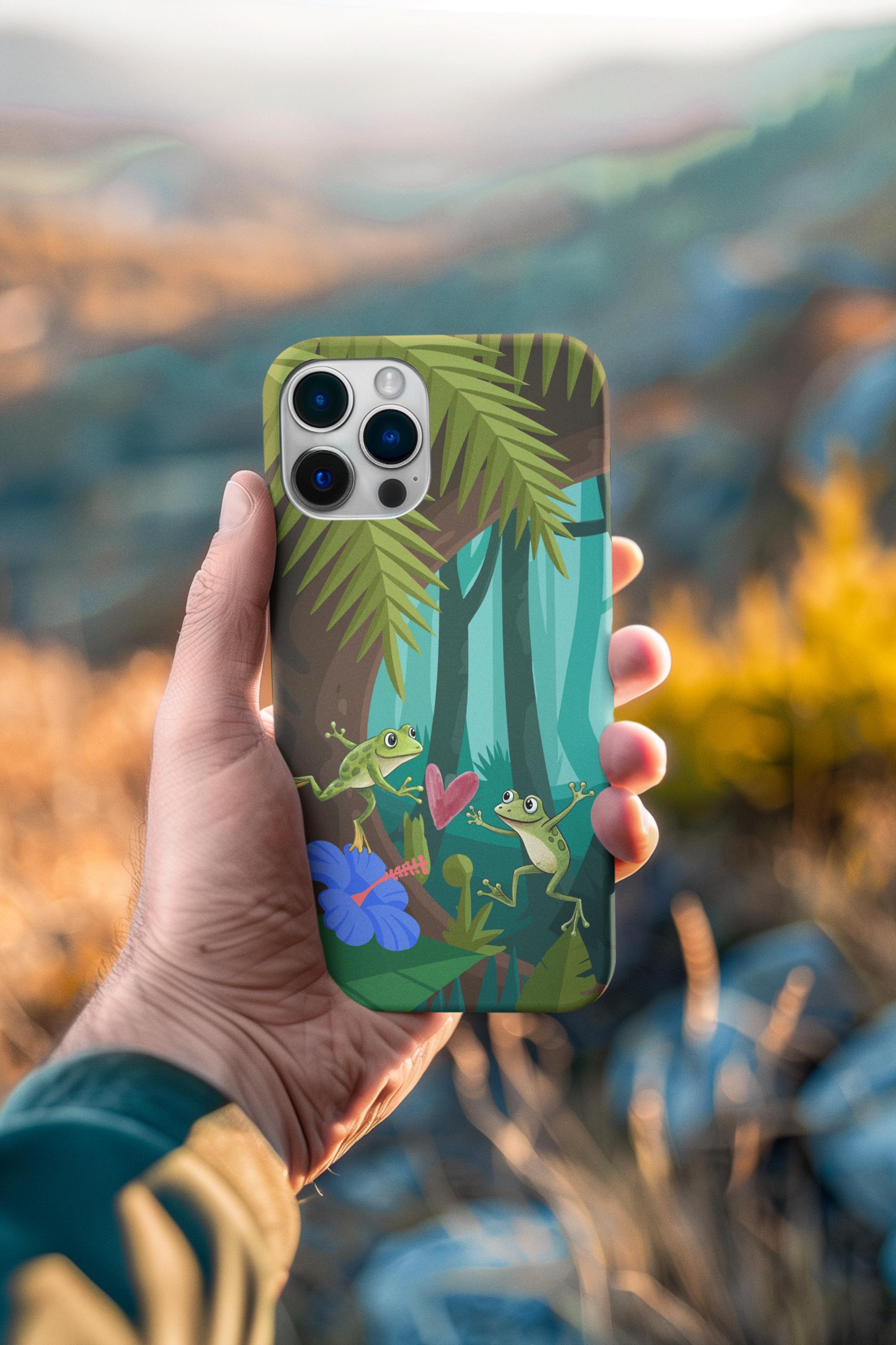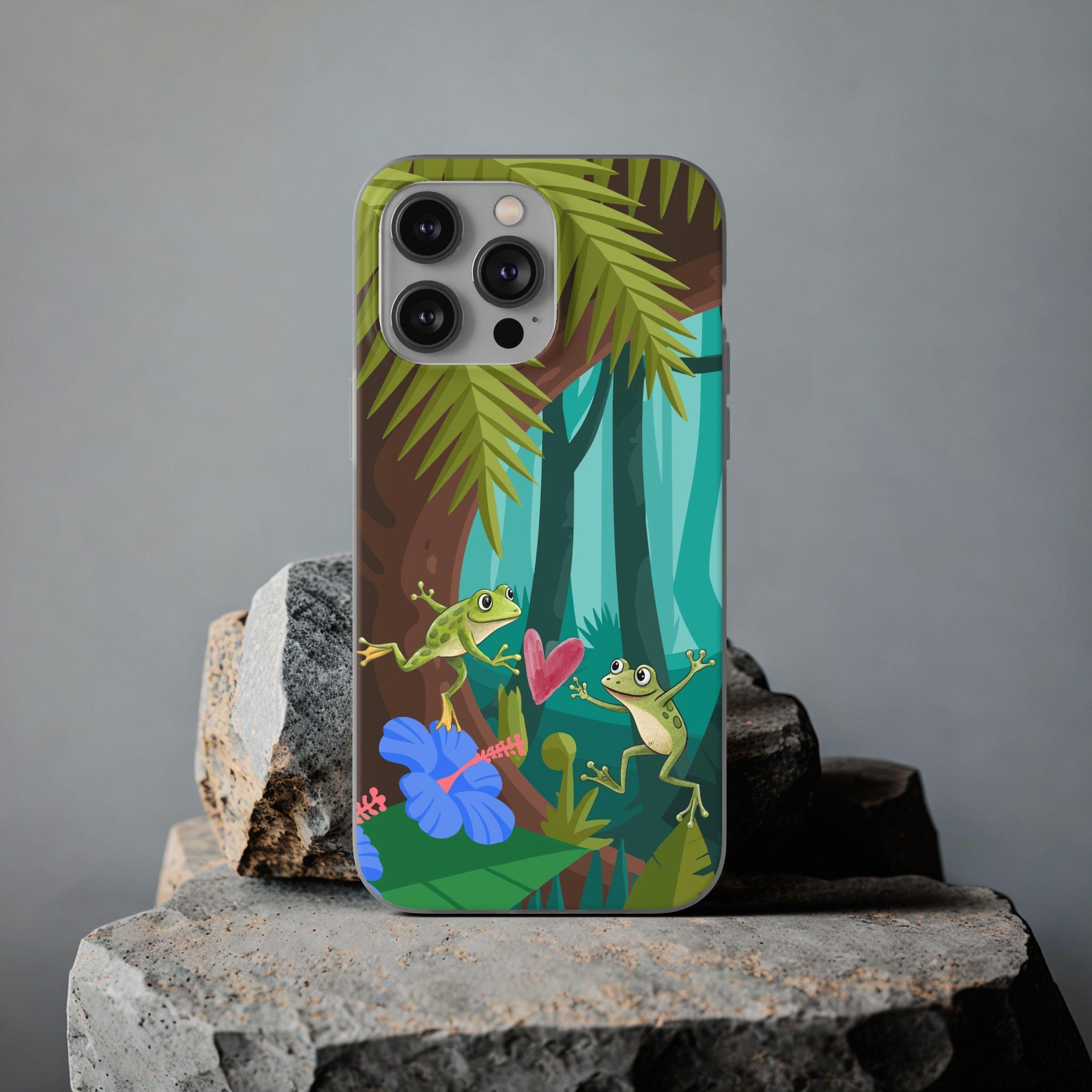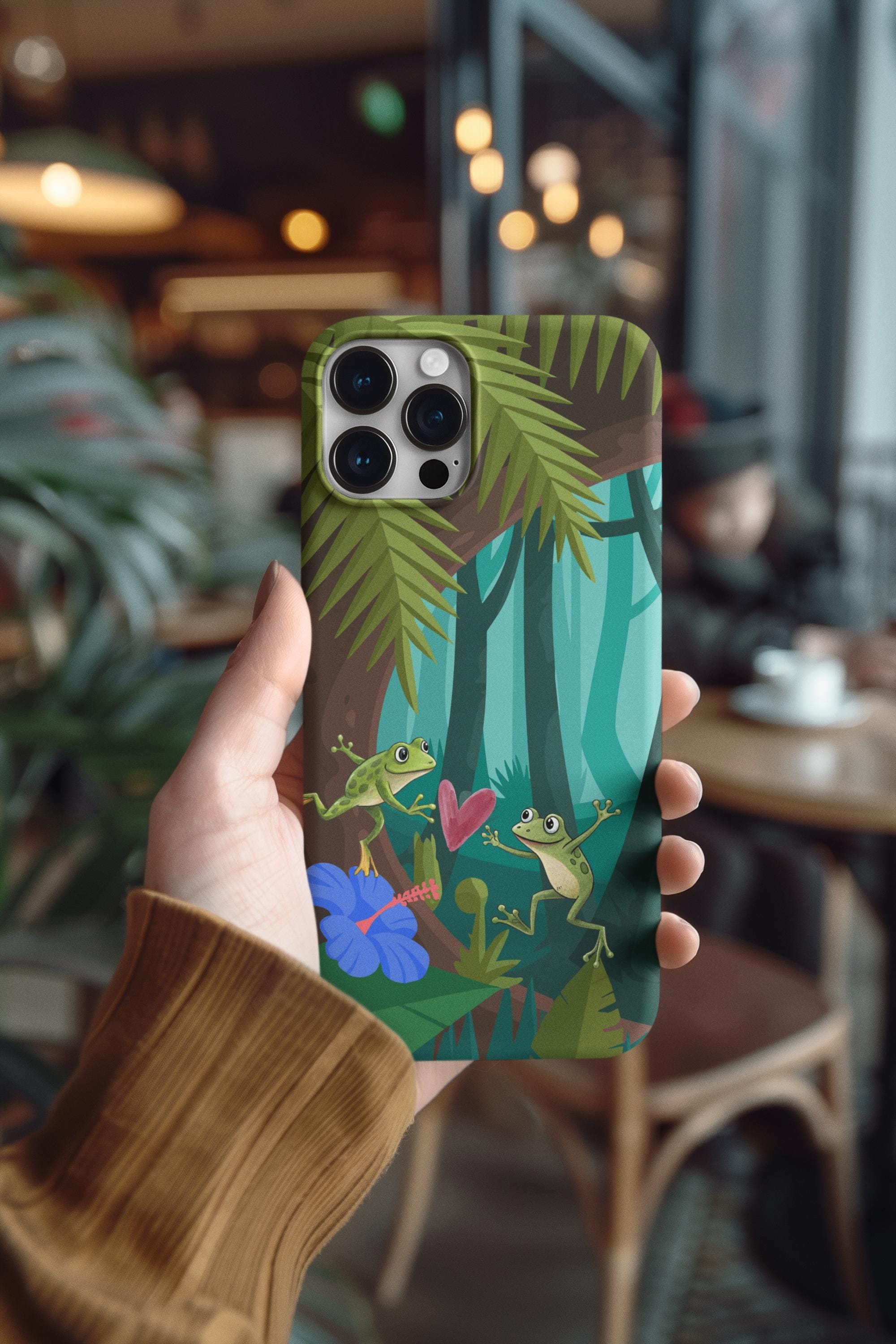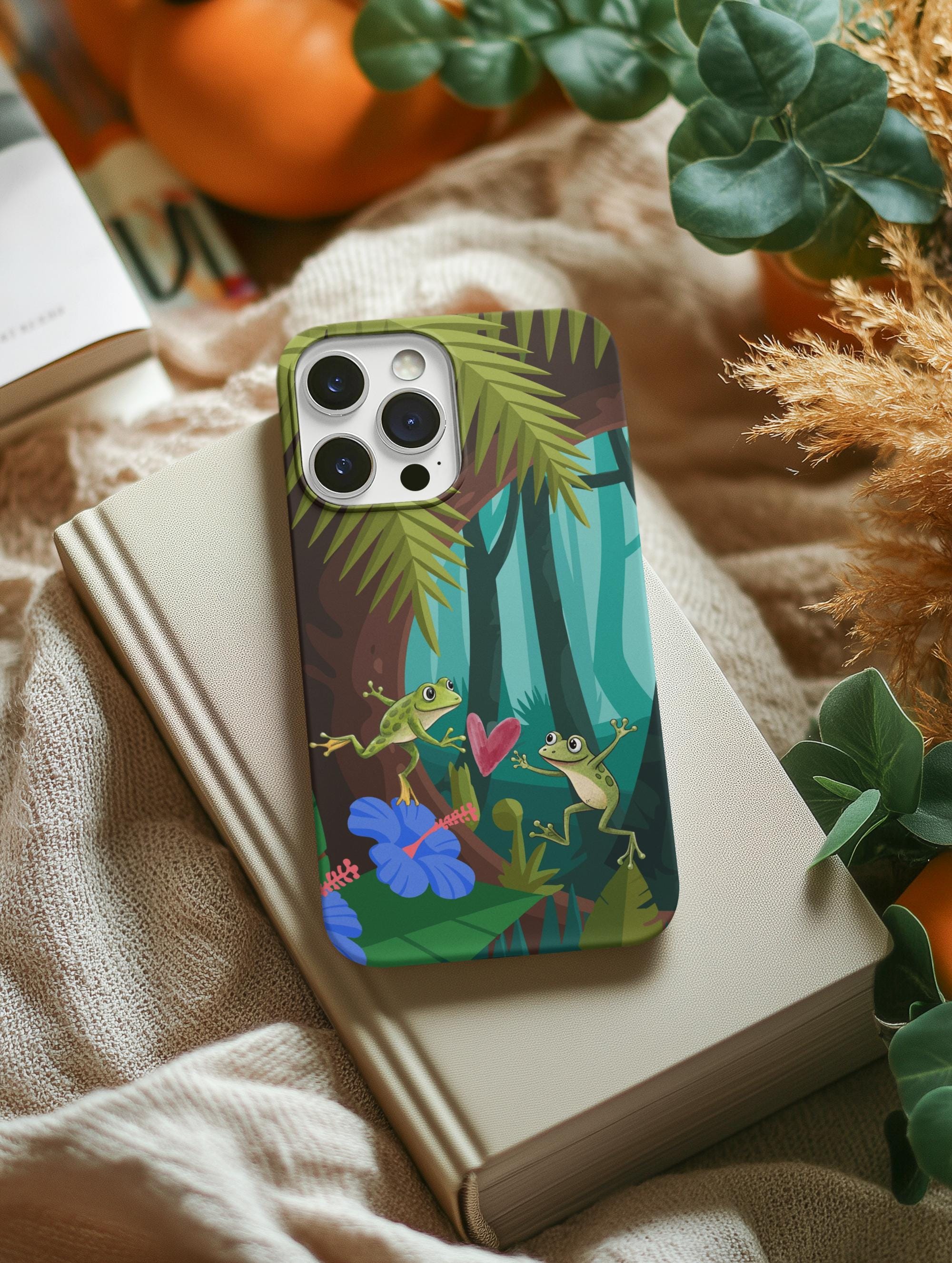 Carry a little patch of jungle with you. This slim, flexible phone case wraps your device in a semi-transparent matte shell printed with a playful rainforest scene — frogs sharing a heart among oversized leaves and bright tropical blooms. It feels smooth in the hand, slips easily into a pocket, and cushions against everyday knocks while keeping the phone’s profile low. The printing is crisp and colorful, so the illustration stays lively, and precise cutouts keep charging and cameras accessible. For people who love nature, whimsy, and compact protection, this case adds personality without bulk.