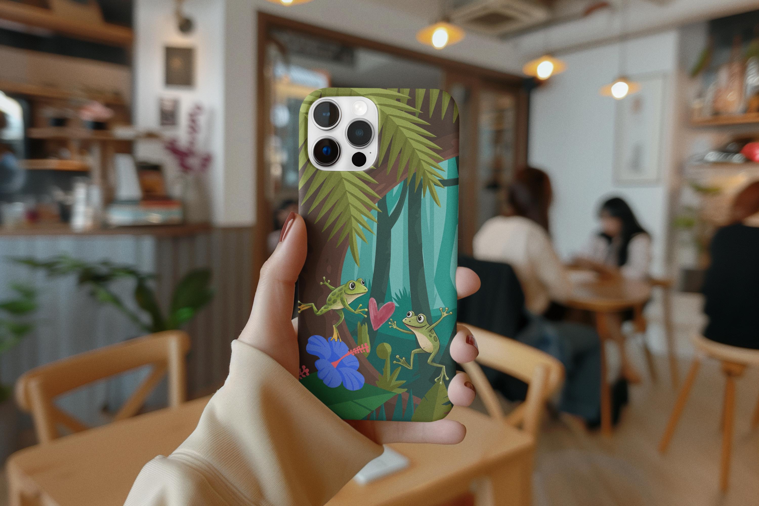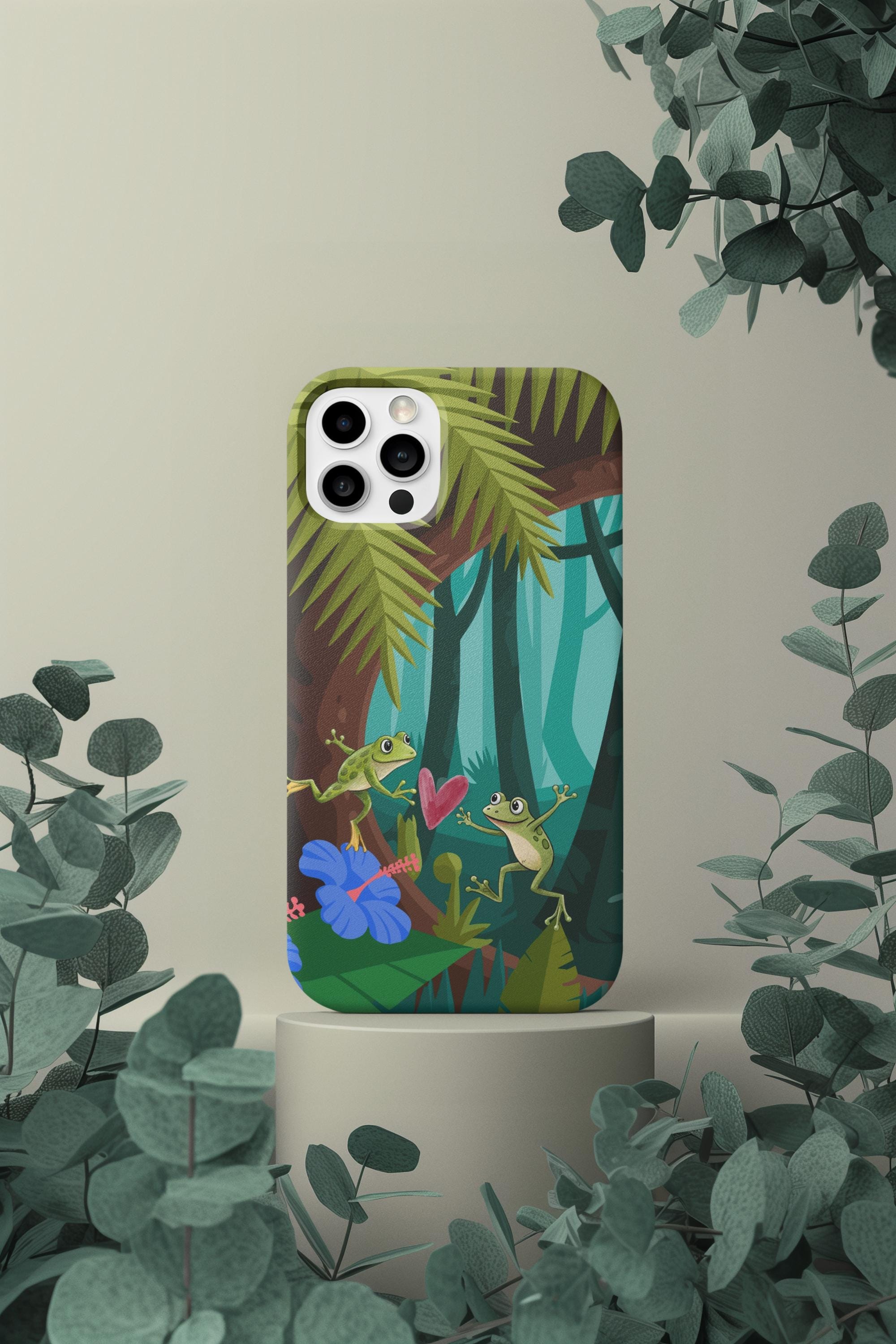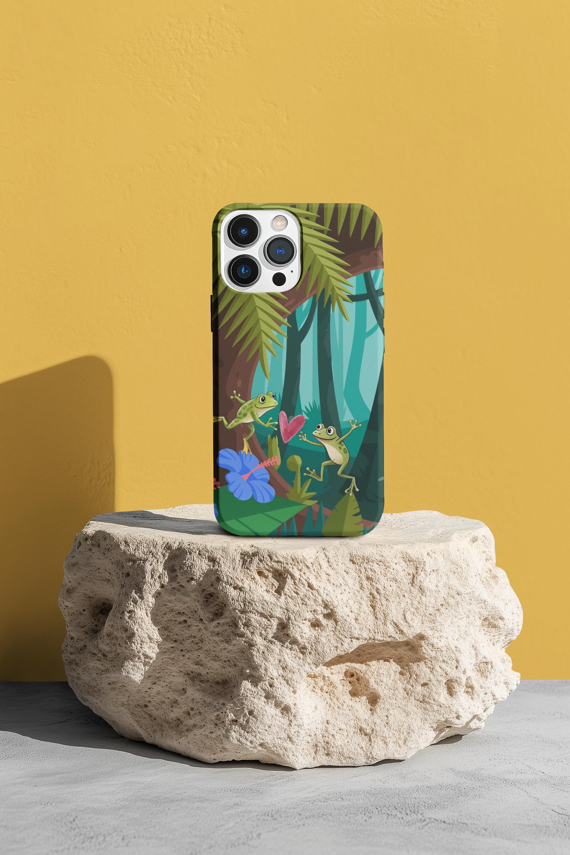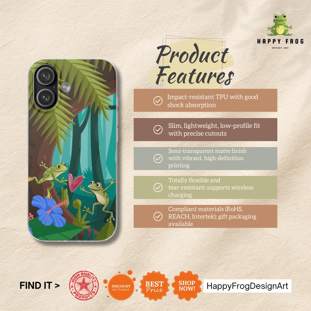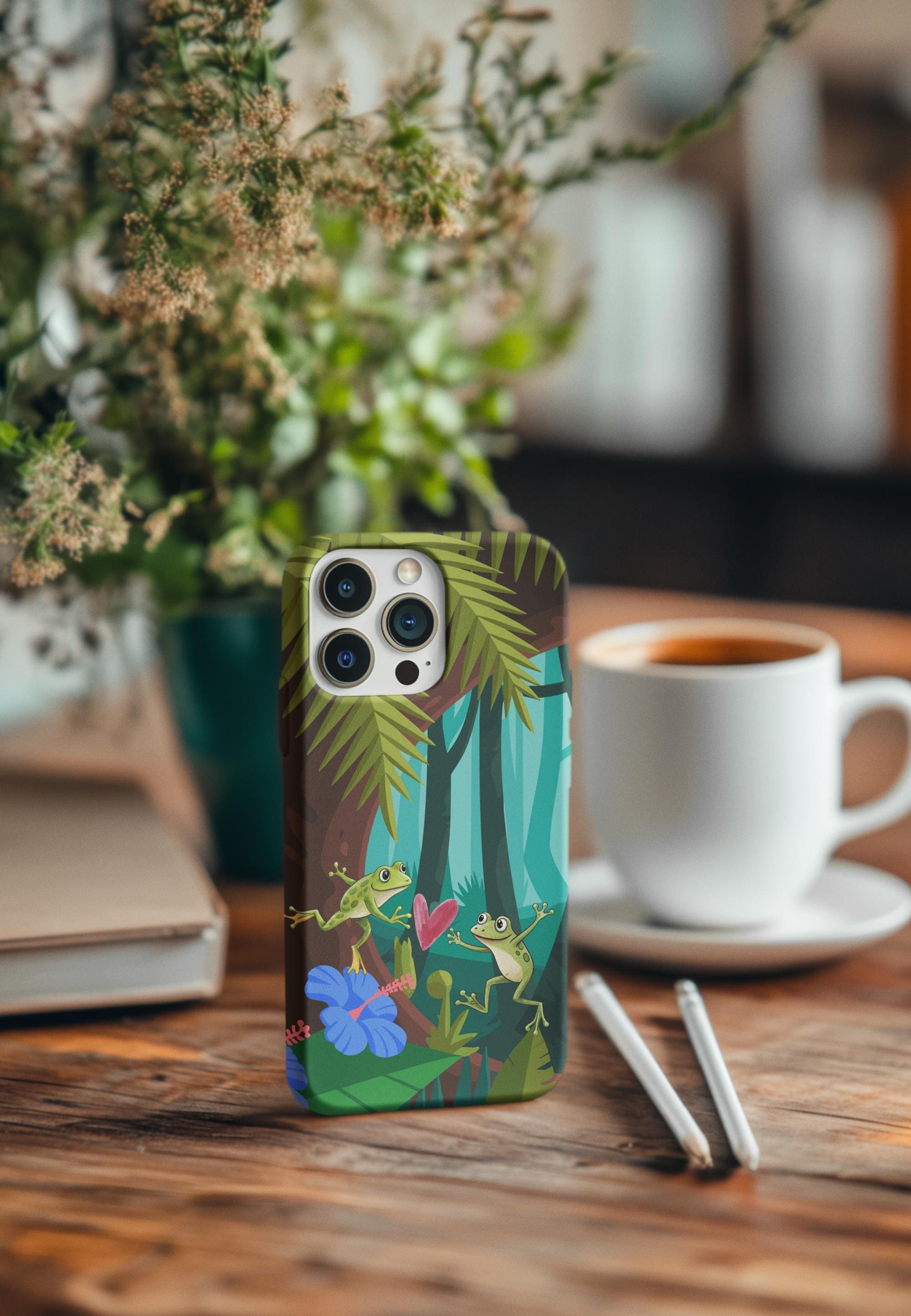 Carry a little patch of jungle with you. This slim, flexible phone case wraps your device in a semi-transparent matte shell printed with a playful rainforest scene — frogs sharing a heart among oversized leaves and bright tropical blooms. It feels smooth in the hand, slips easily into a pocket, and cushions against everyday knocks while keeping the phone’s profile low. The printing is crisp and colorful, so the illustration stays lively, and precise cutouts keep charging and cameras accessible. For people who love nature, whimsy, and compact protection, this case adds personality without bulk.