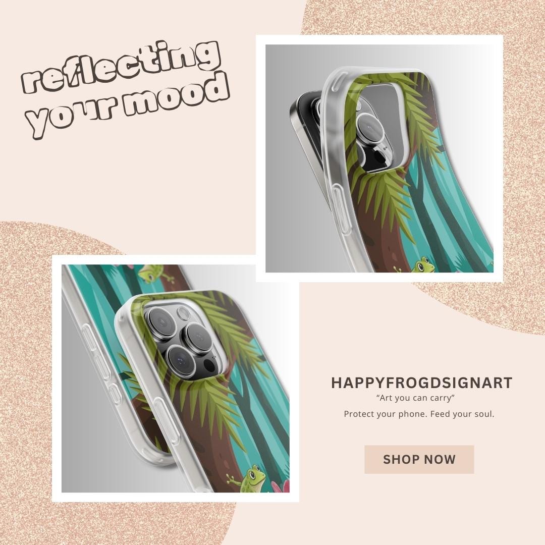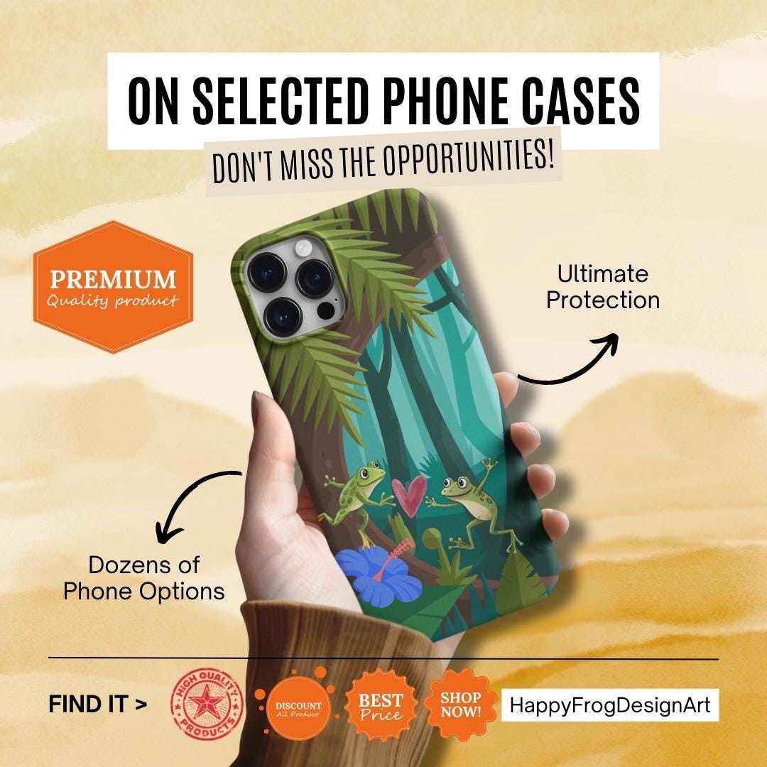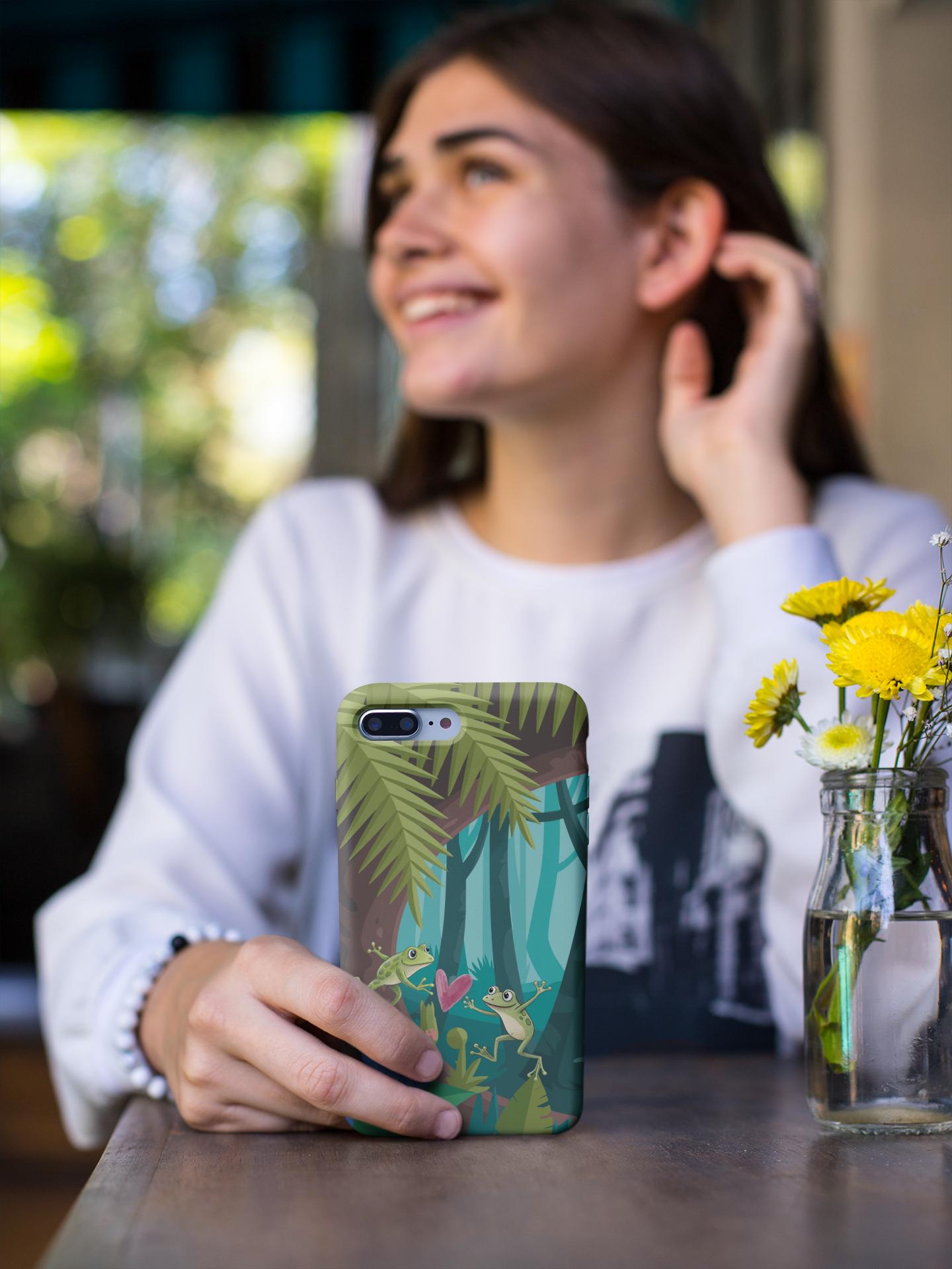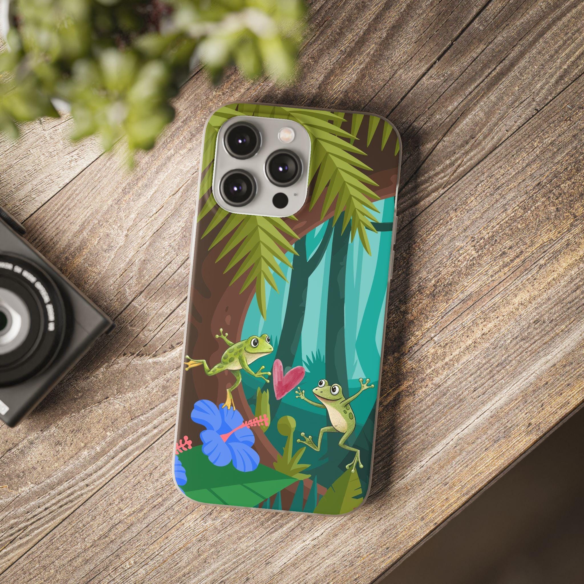 Carry a little patch of jungle with you. This slim, flexible phone case wraps your device in a semi-transparent matte shell printed with a playful rainforest scene — frogs sharing a heart among oversized leaves and bright tropical blooms. It feels smooth in the hand, slips easily into a pocket, and cushions against everyday knocks while keeping the phone’s profile low. The printing is crisp and colorful, so the illustration stays lively, and precise cutouts keep charging and cameras accessible. For people who love nature, whimsy, and compact protection, this case adds personality without bulk.