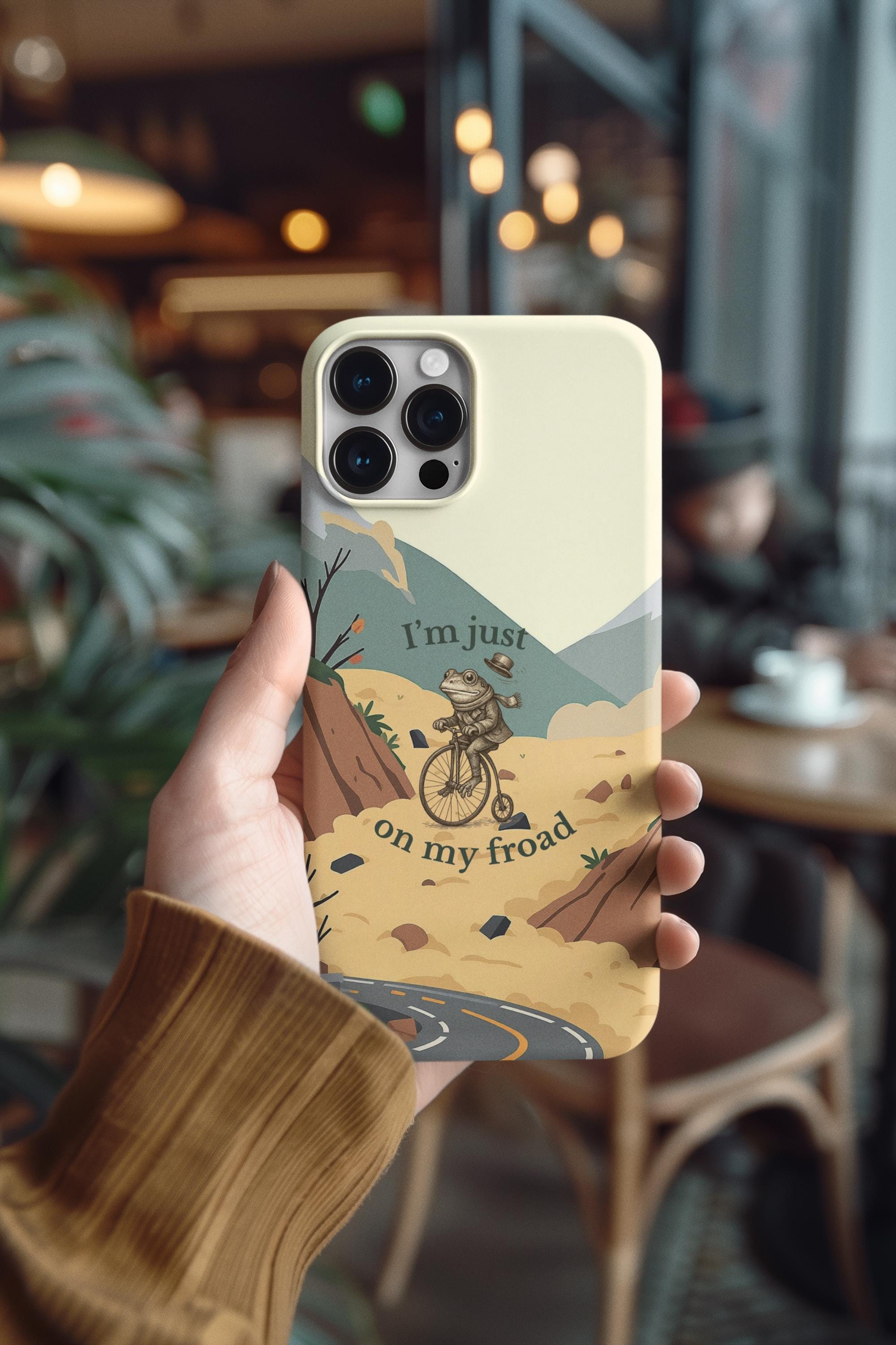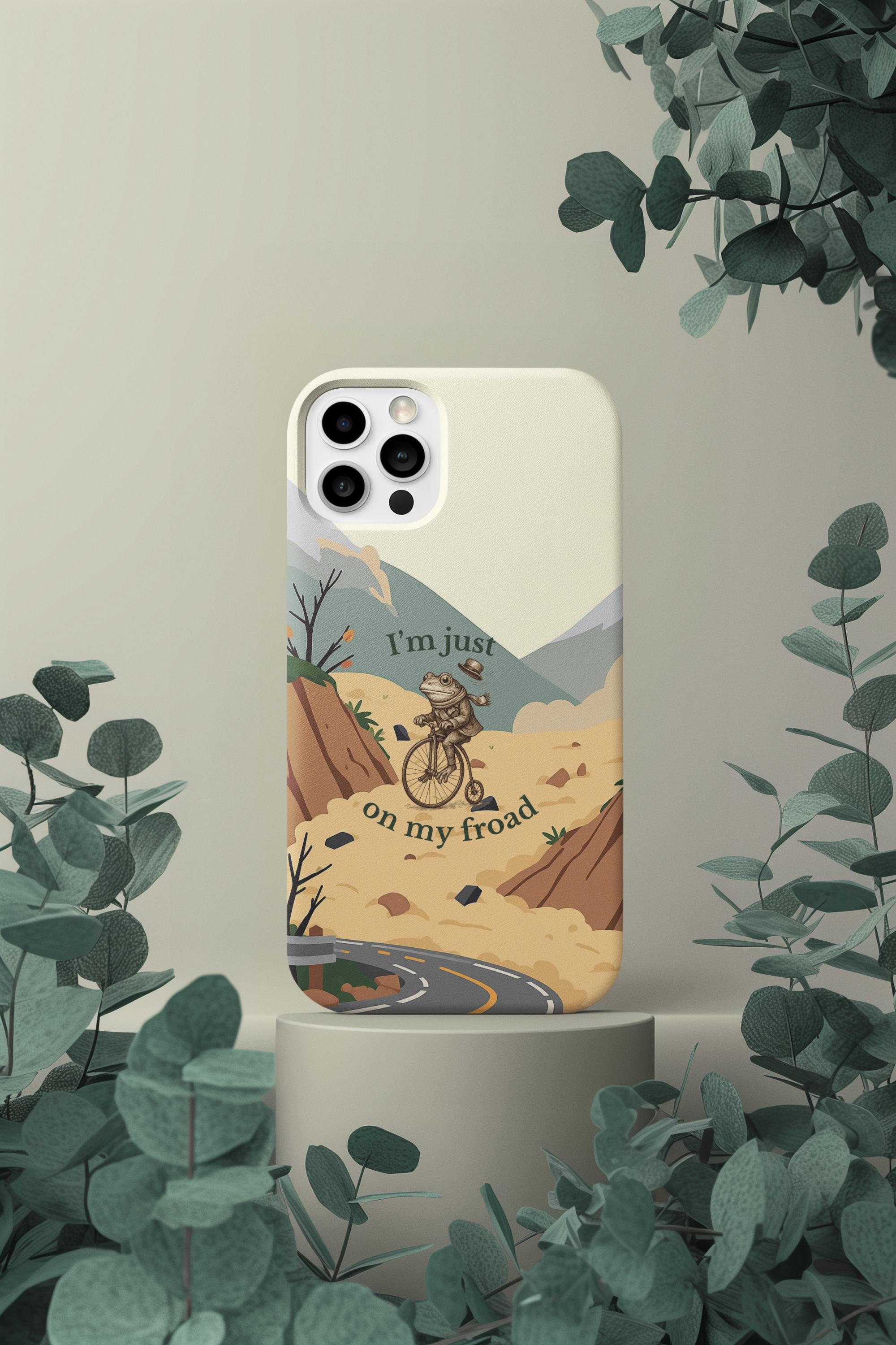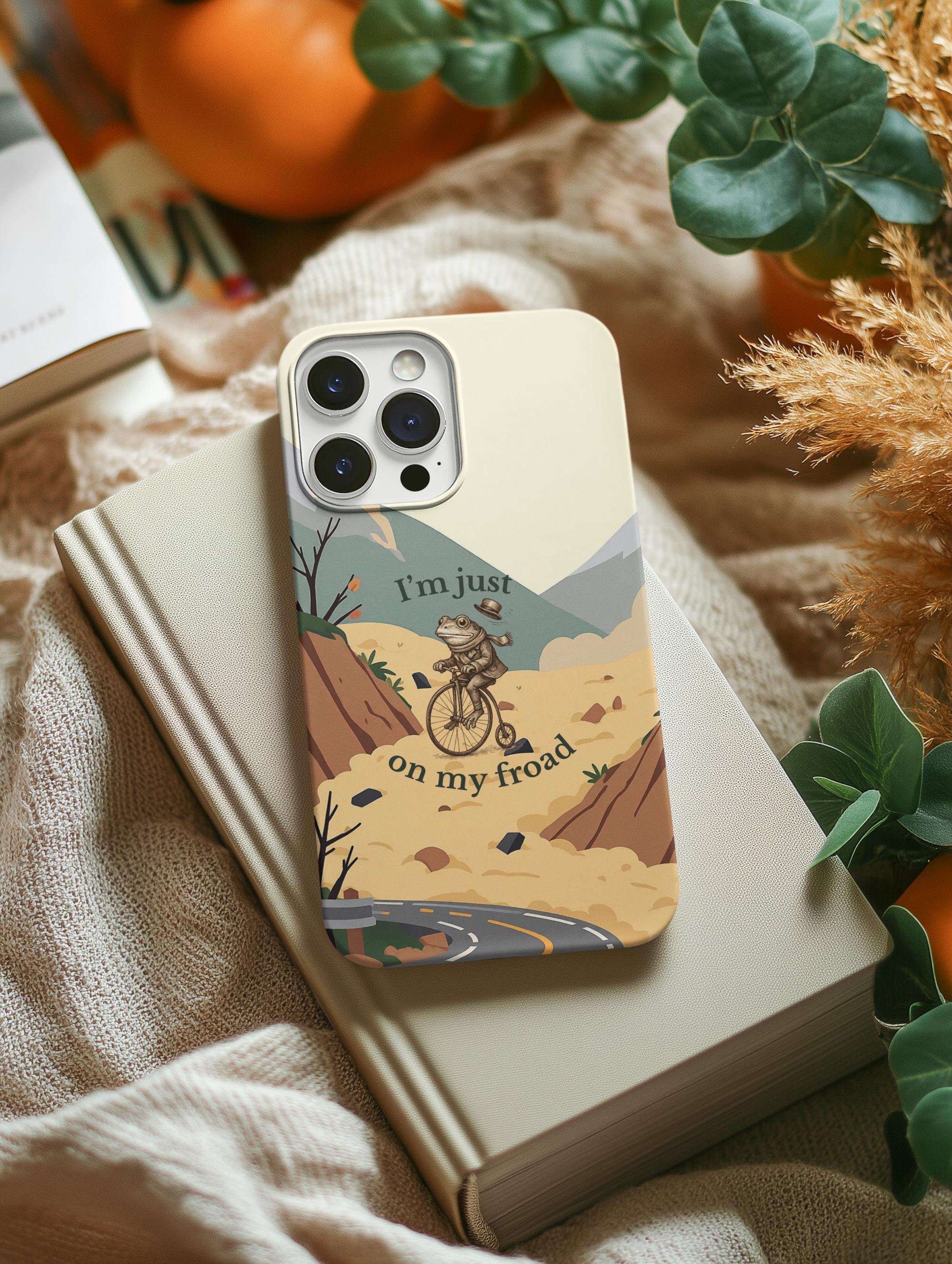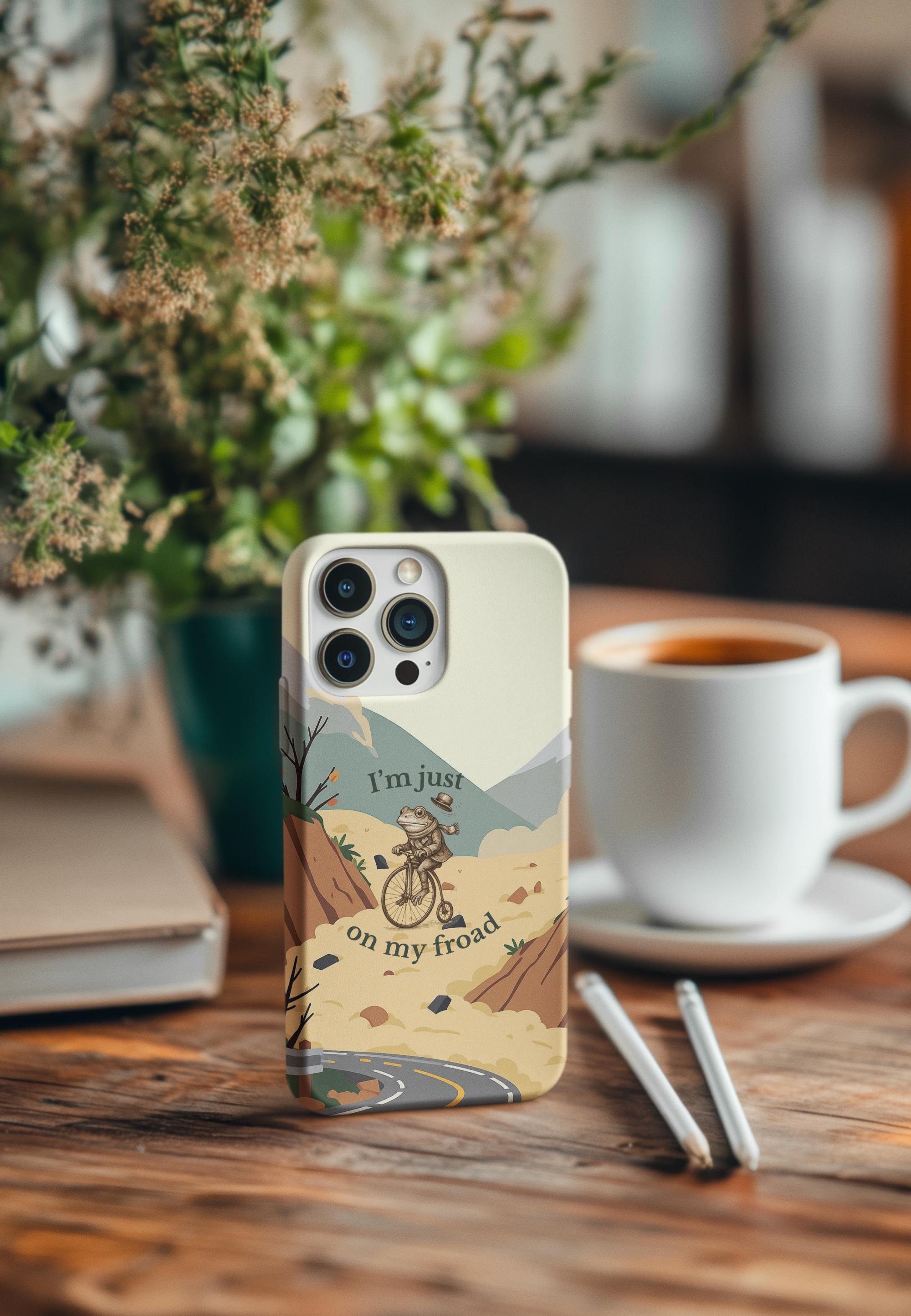 This funny frog pun phone case features a cute frog riding a bicycle with the quote “I’m just on my froad.” A perfect humorous gift for frog lovers, pun fans, and anyone who loves quirky aesthetic art.