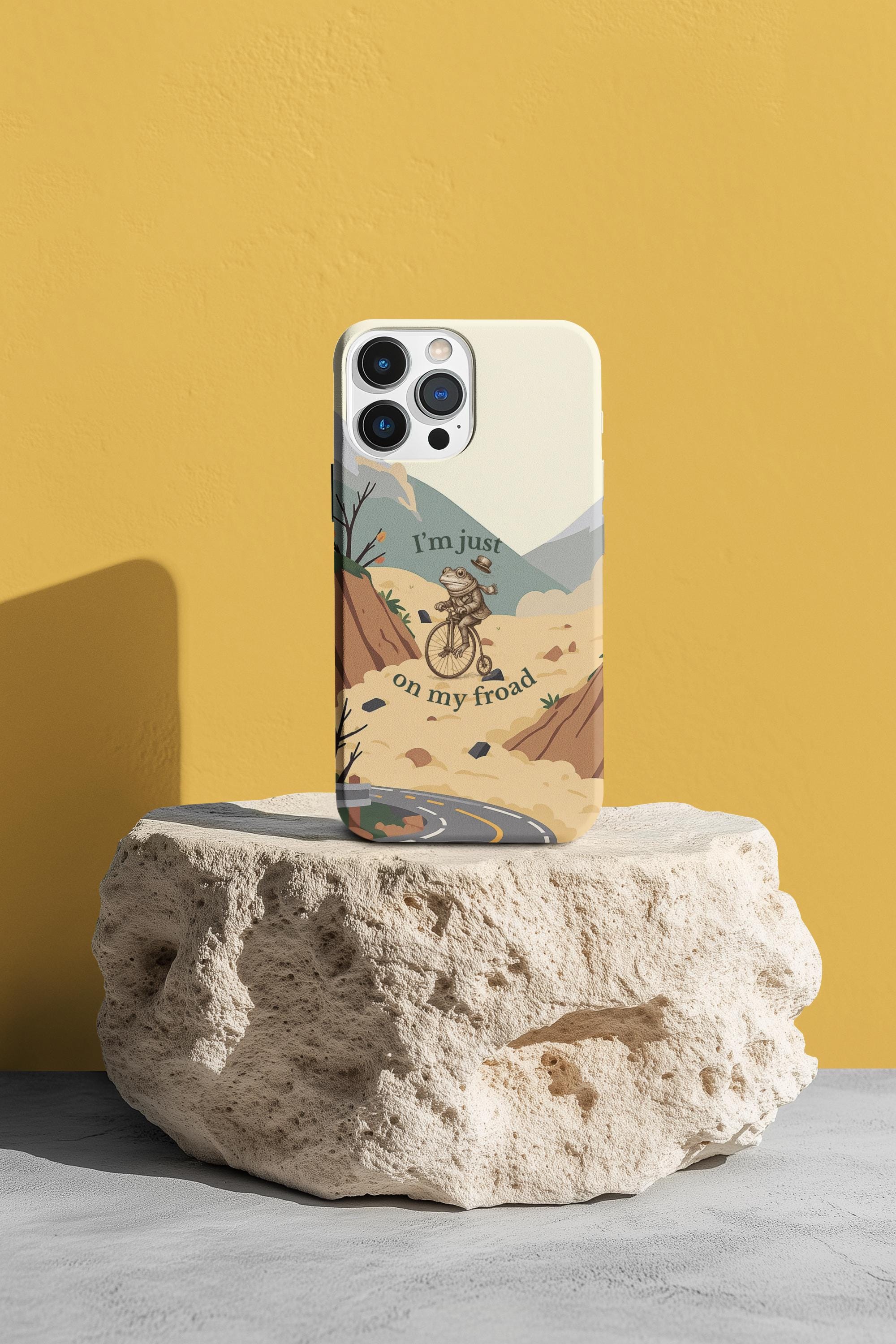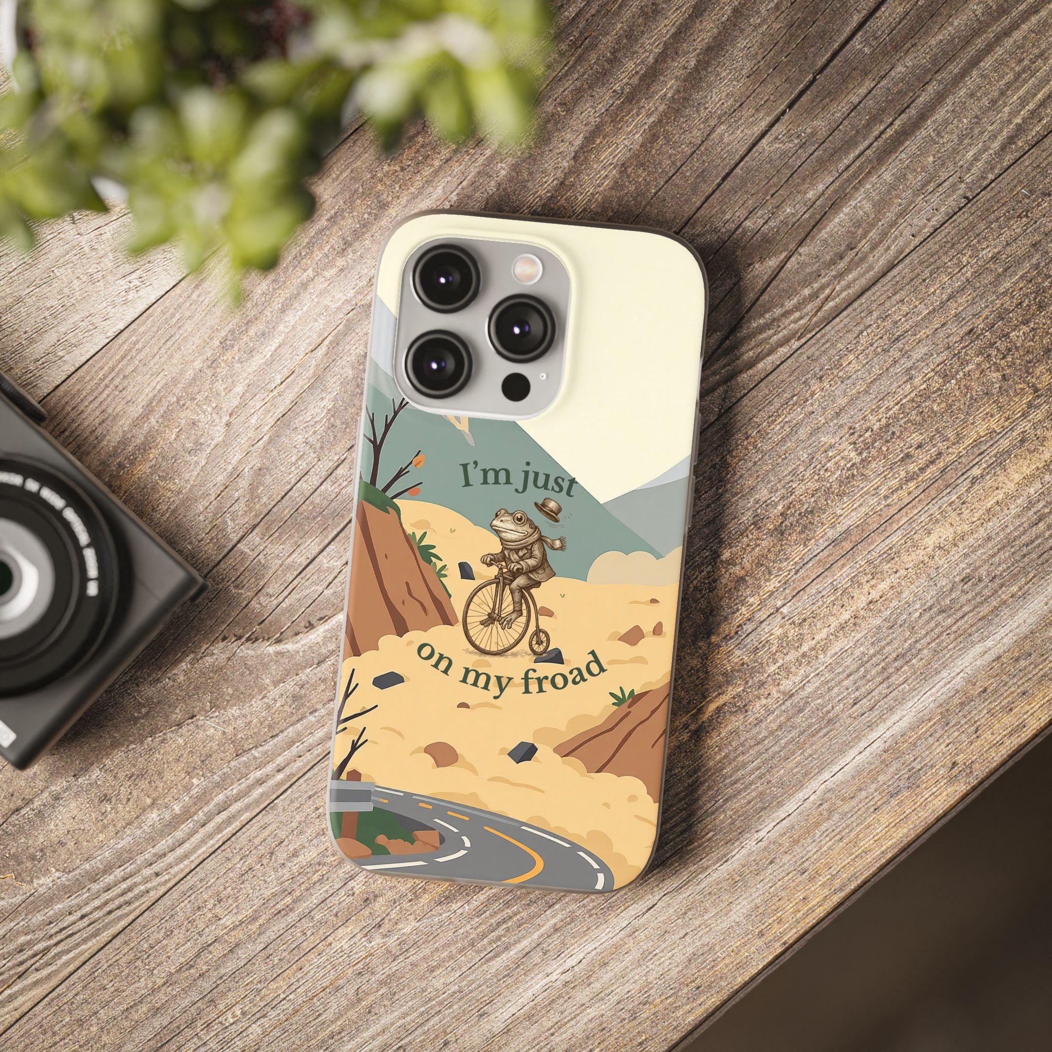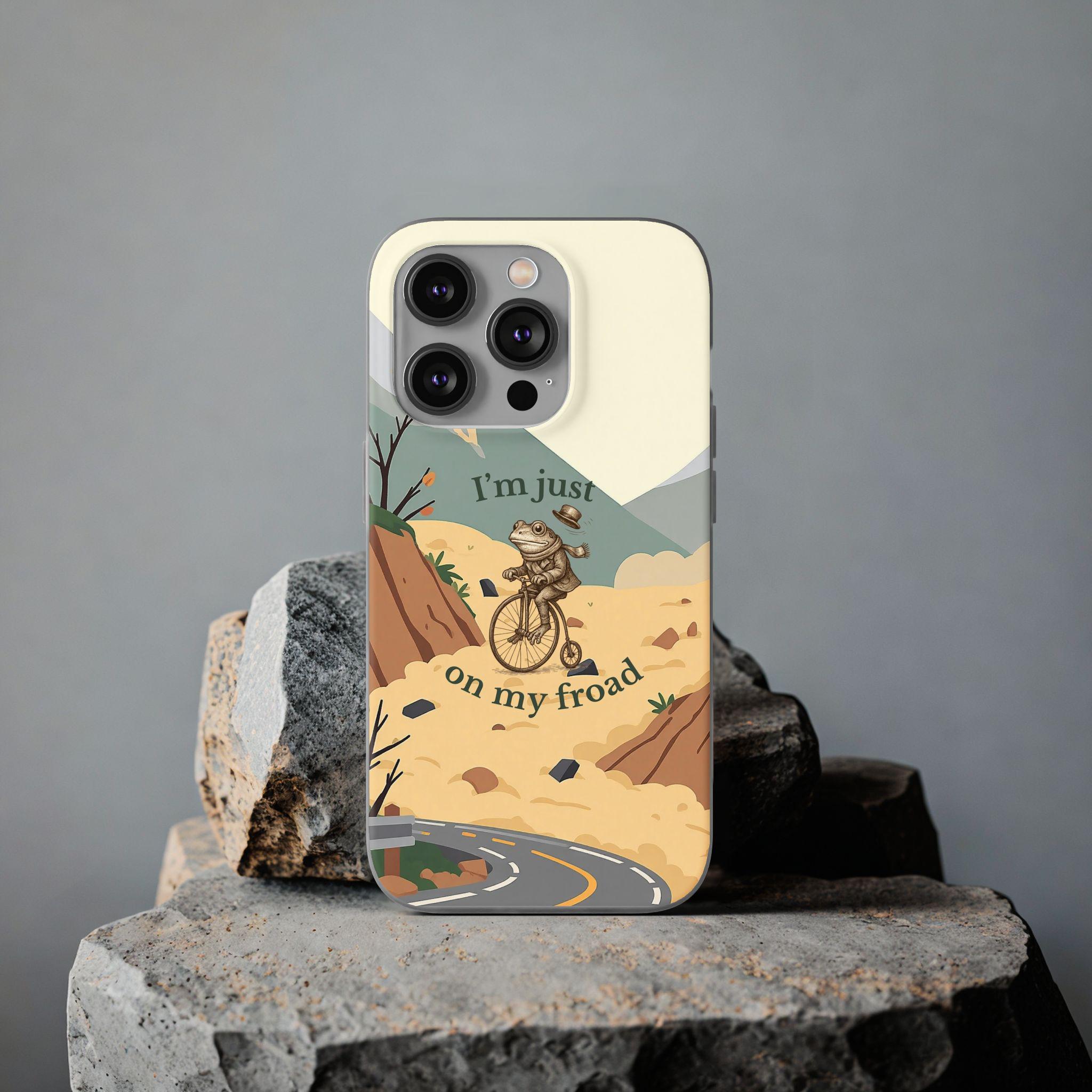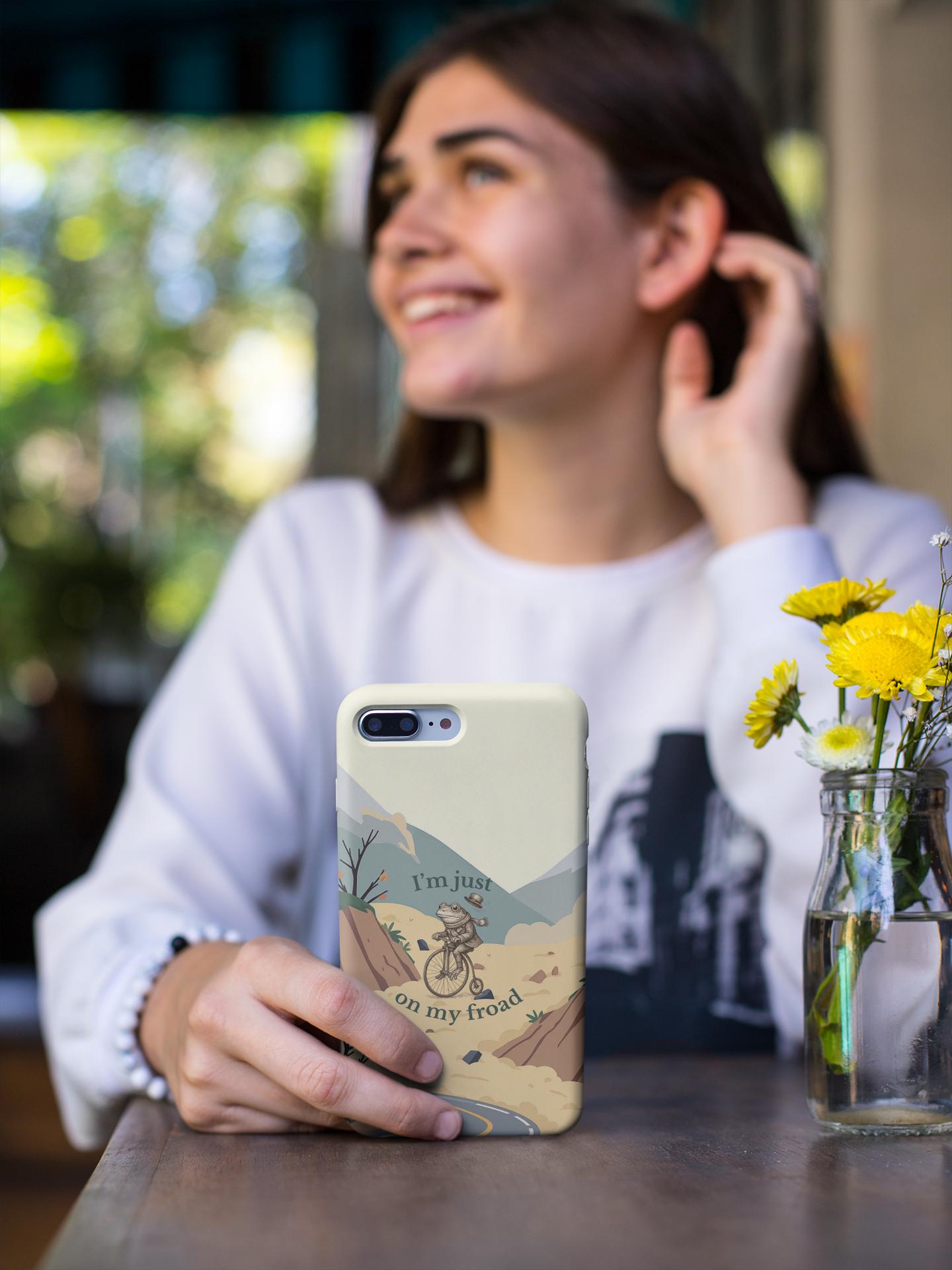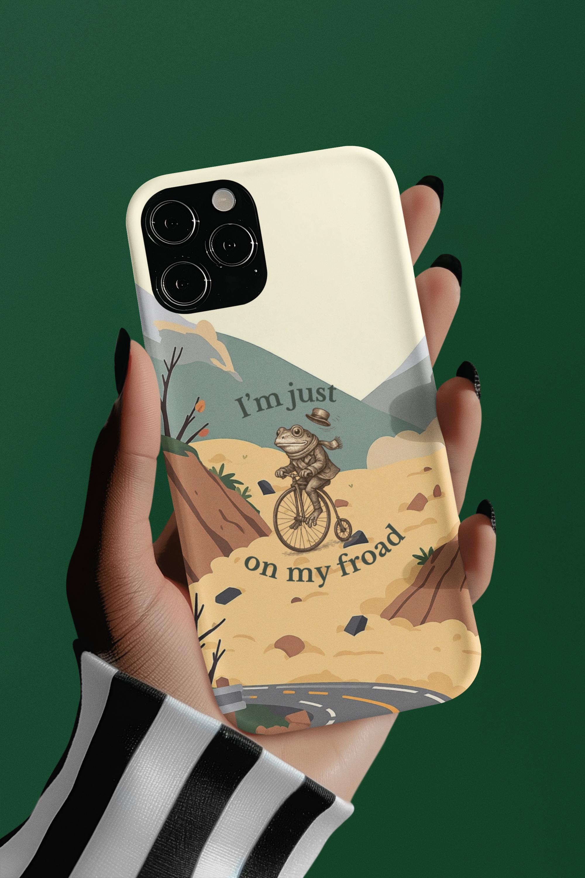 This funny frog pun phone case features a cute frog riding a bicycle with the quote “I’m just on my froad.” A perfect humorous gift for frog lovers, pun fans, and anyone who loves quirky aesthetic art.