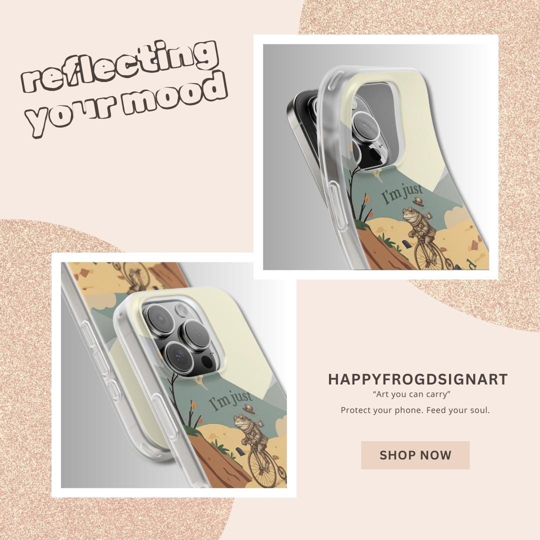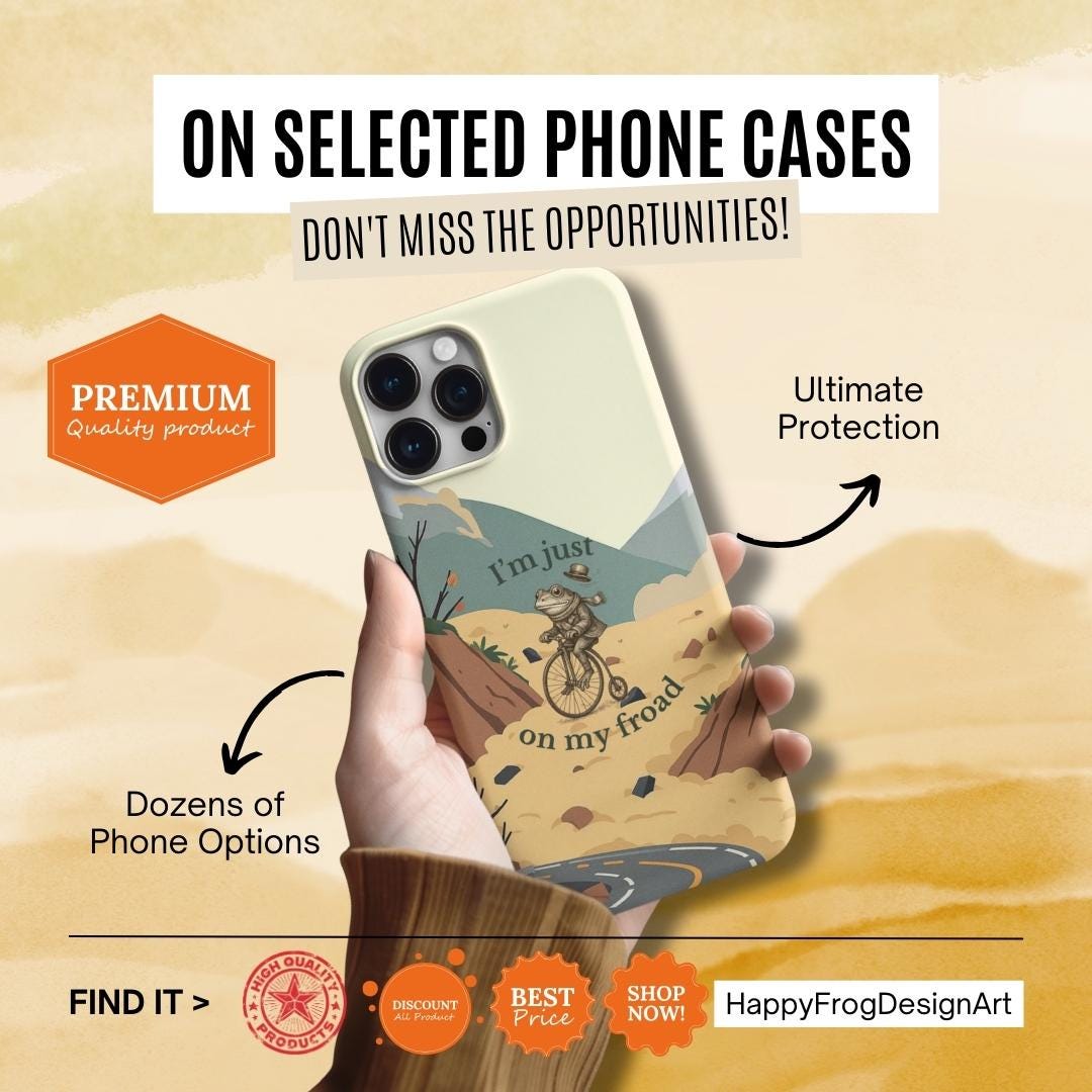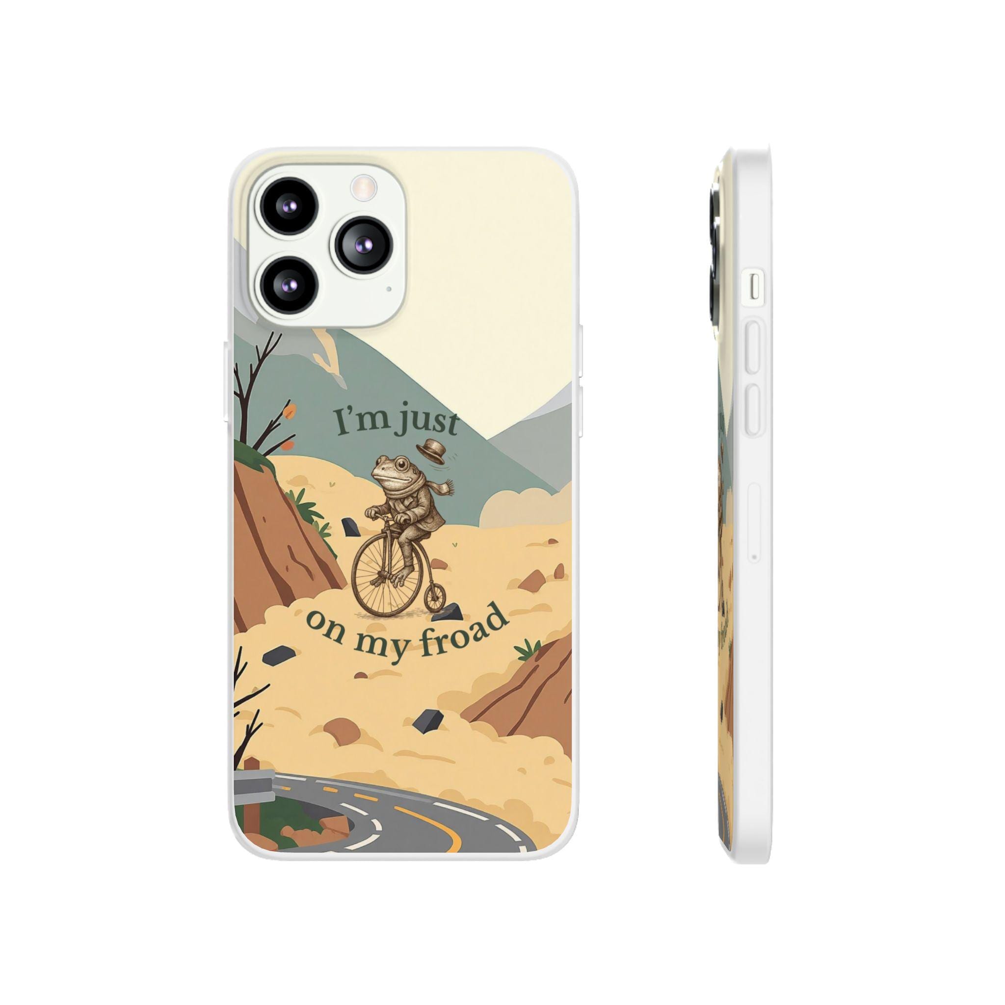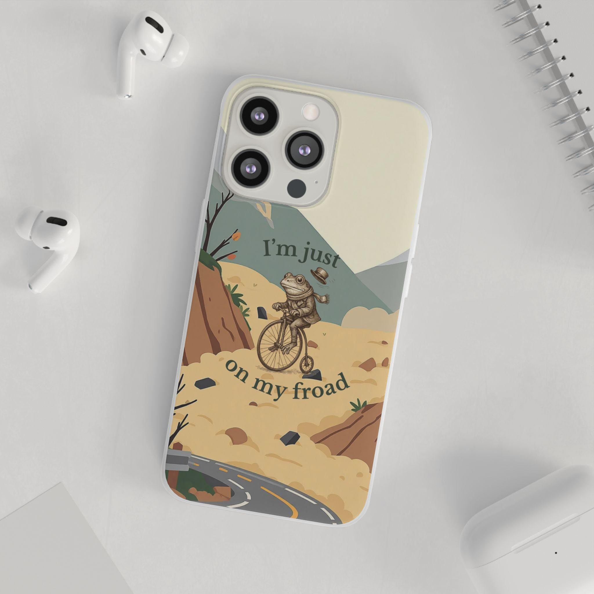 This funny frog pun phone case features a cute frog riding a bicycle with the quote “I’m just on my froad.” A perfect humorous gift for frog lovers, pun fans, and anyone who loves quirky aesthetic art.