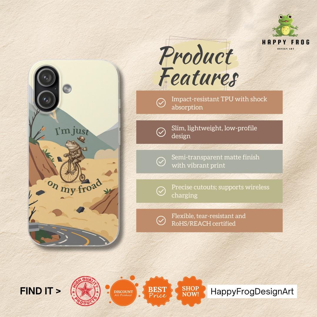 A slim, semi-transparent phone case that blends protection with playful adventure. The frosted TPU finish feels soft to the touch while flexing to absorb bumps and drops. Bright, crisp printing brings the whimsical illustration — a carefree frog cycling along a winding road through sunlit hills — to life. Lightweight and low-profile, it slips into pockets without bulk, keeps all ports and buttons accessible through precise cutouts, and supports wireless charging. Thoughtfully certified and sourced, it offers dependable everyday defense with a touch of personality.
