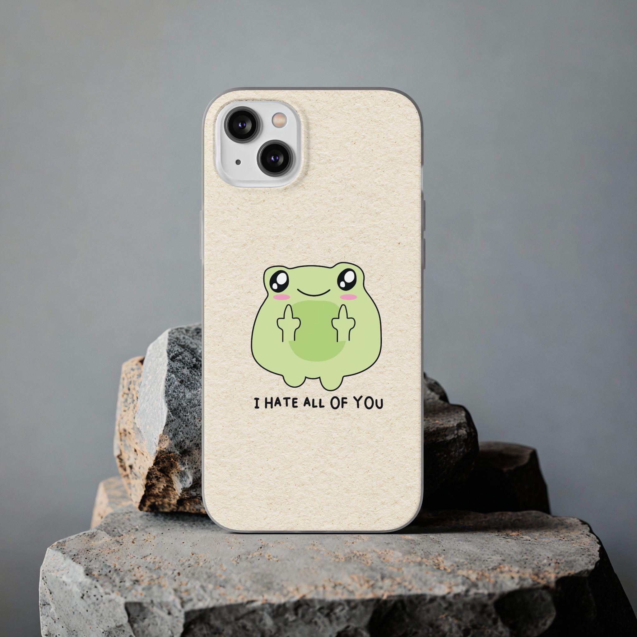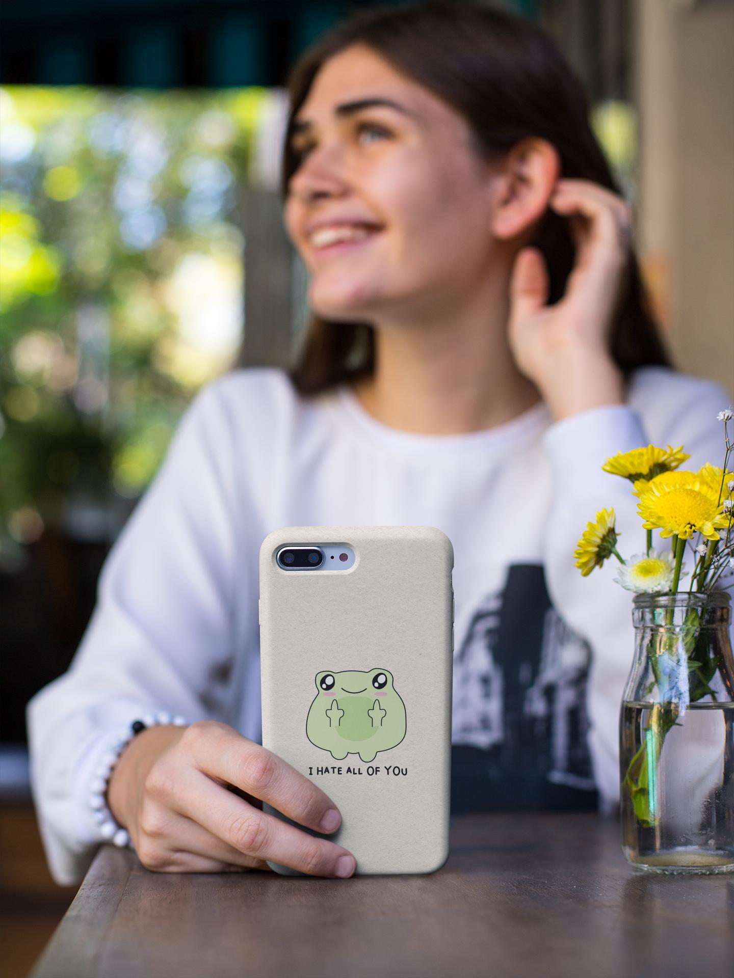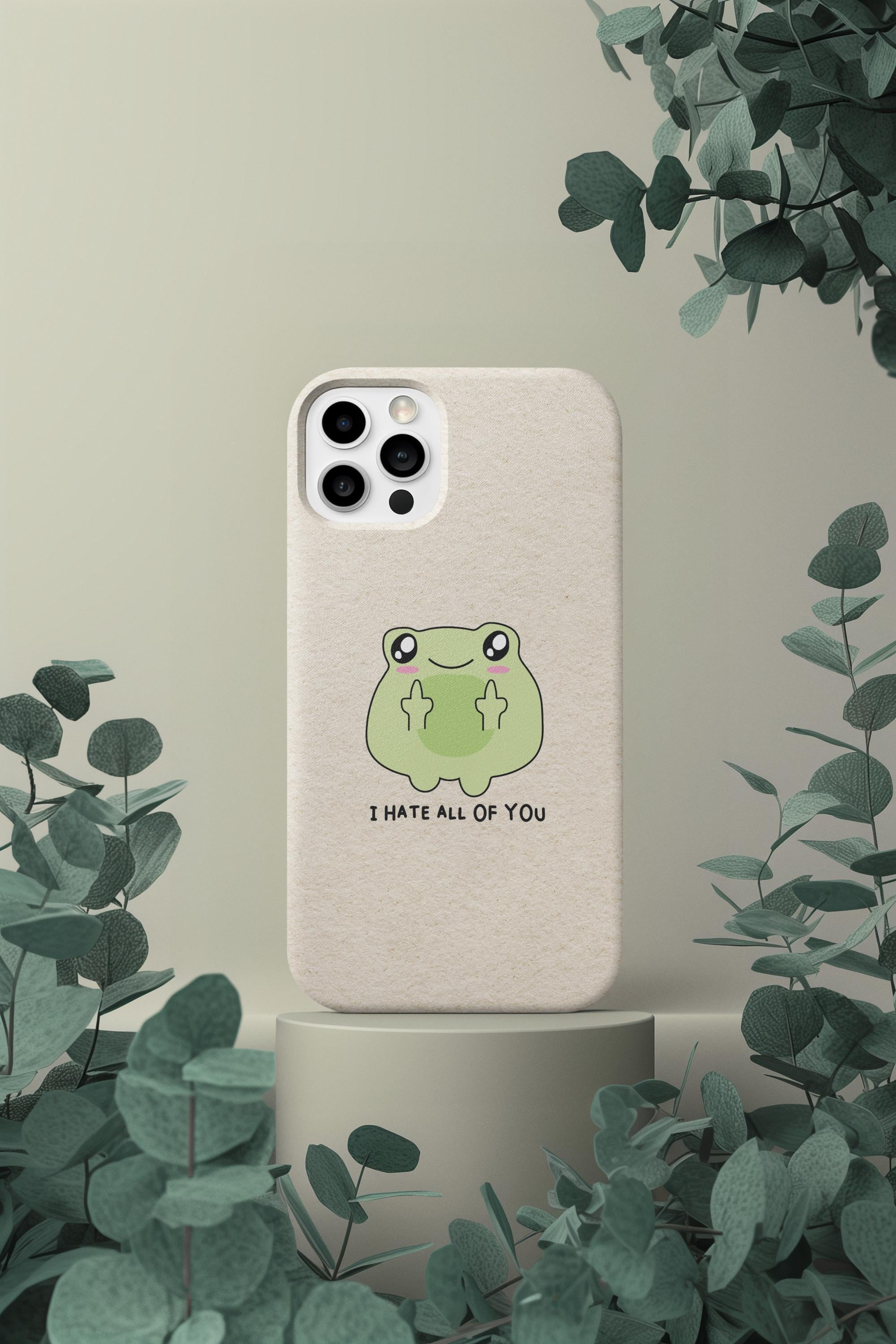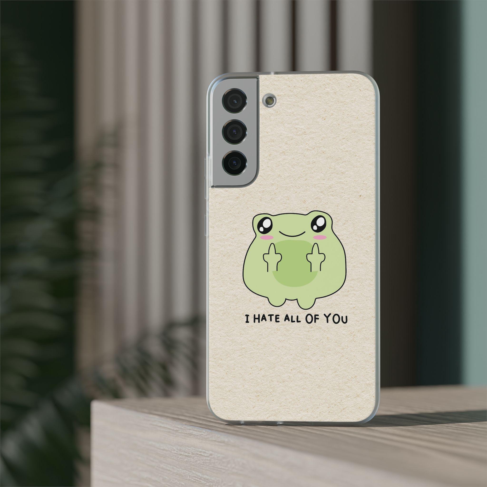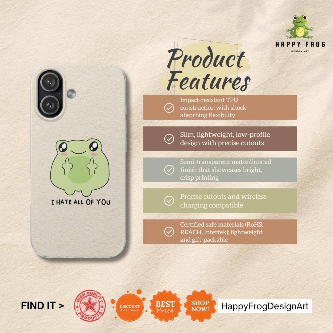 Carry a little bit of cheeky charm wherever you go. This slim, flexible phone case pairs a semi-transparent matte finish with a soft, frosted texture and a playful frog graphic that says "I HATE ALL OF YOU"—a quirky, dark-humored touch that reads as honest and unapologetic. Lightweight and low-profile, it slips easily into pockets while offering impact-resistant TPU protection and precise cutouts for full access to ports and wireless charging. The muted background keeps the colorful print crisp and lively, so the design stands out without shouting. It’s for someone who prefers practical protection with personality—an everyday shield that also starts conversations.