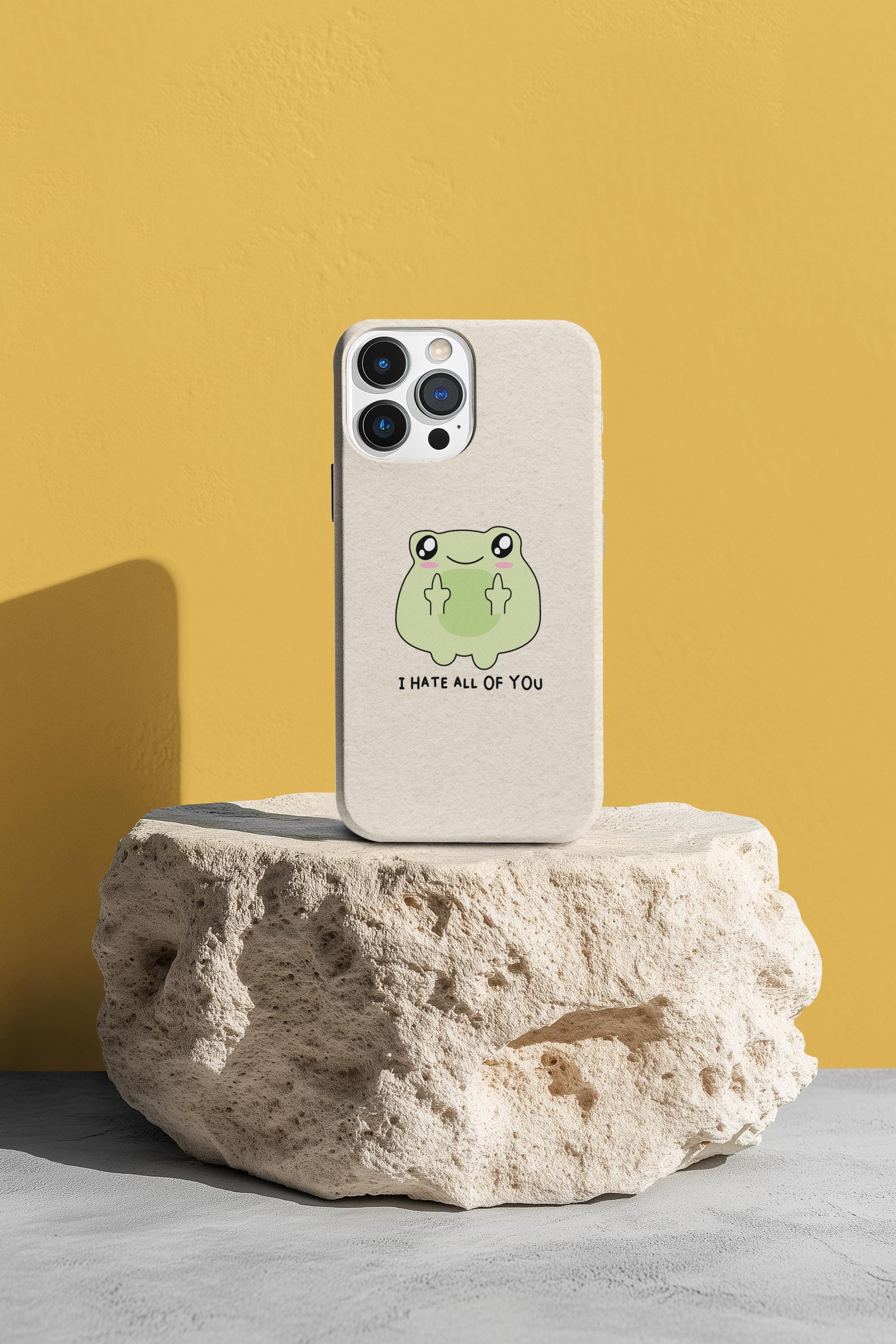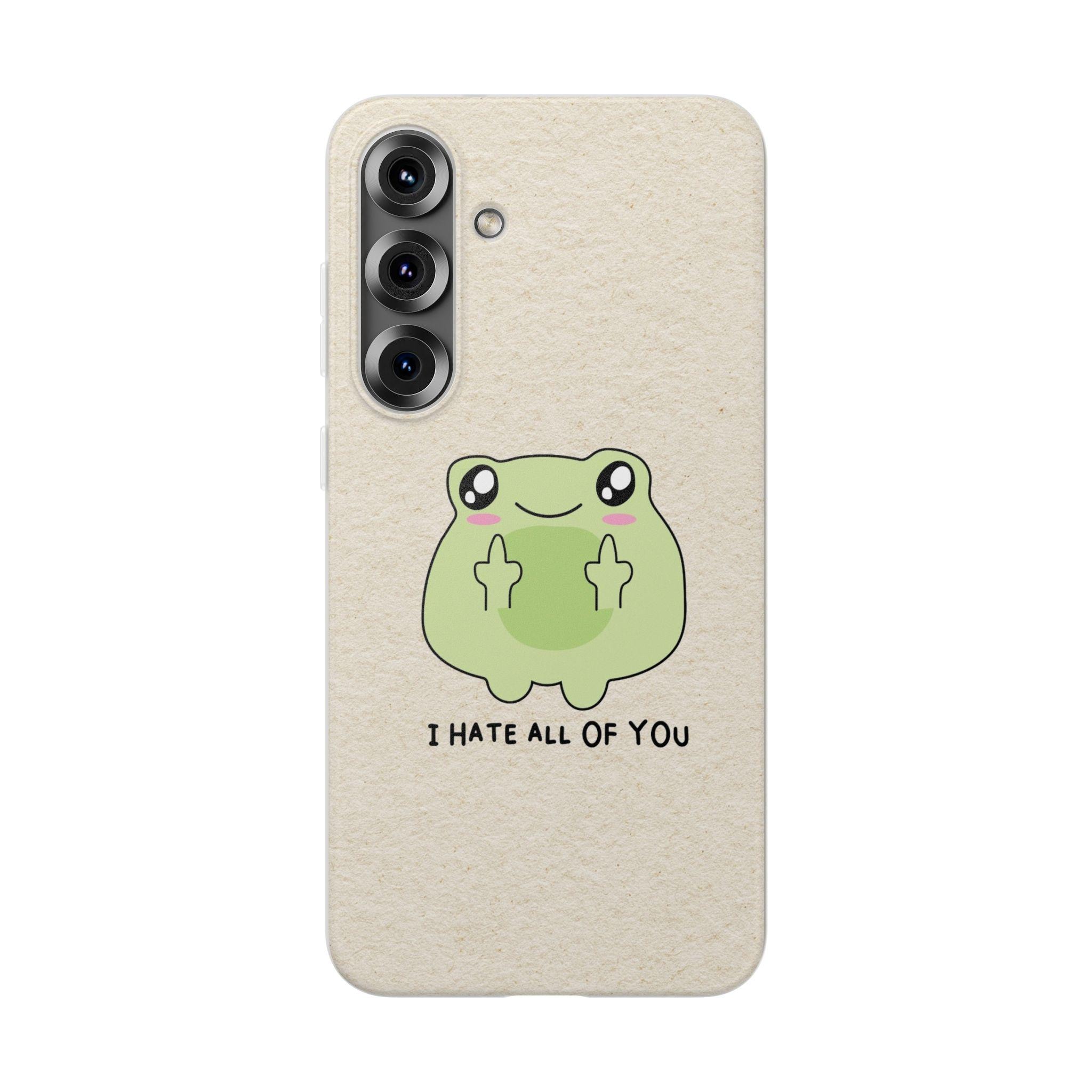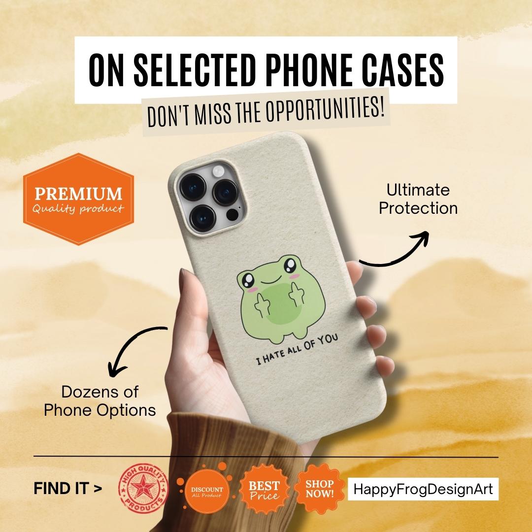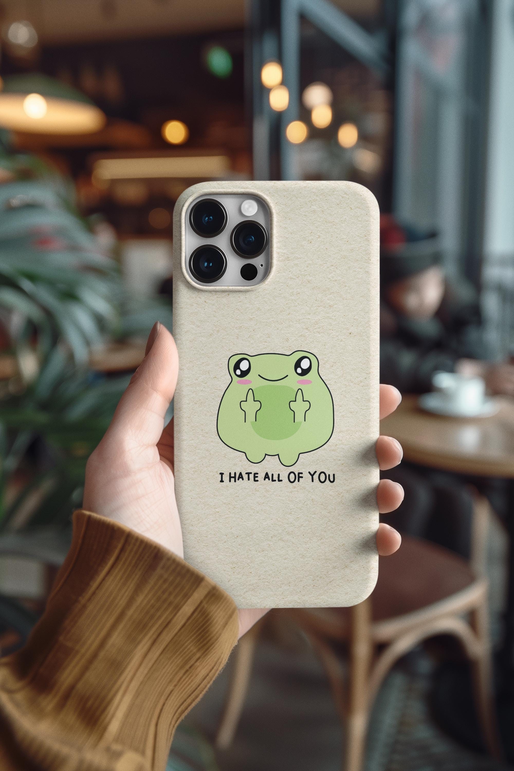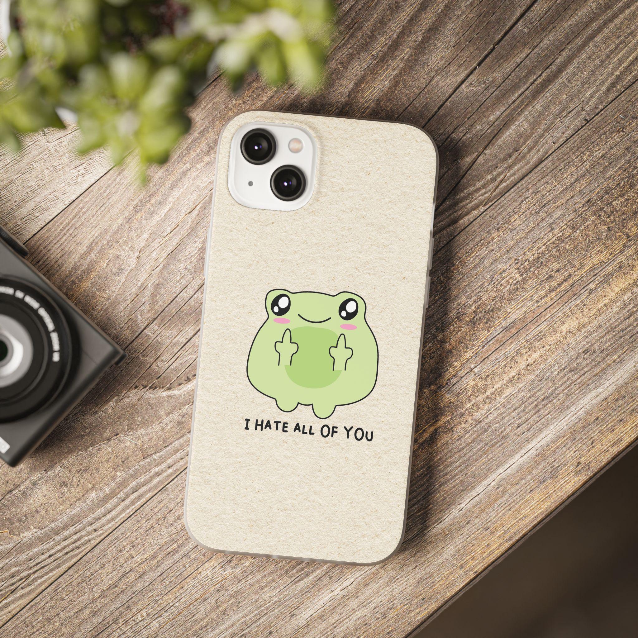 Carry a little bit of cheeky charm wherever you go. This slim, flexible phone case pairs a semi-transparent matte finish with a soft, frosted texture and a playful frog graphic that says "I HATE ALL OF YOU"—a quirky, dark-humored touch that reads as honest and unapologetic. Lightweight and low-profile, it slips easily into pockets while offering impact-resistant TPU protection and precise cutouts for full access to ports and wireless charging. The muted background keeps the colorful print crisp and lively, so the design stands out without shouting. It’s for someone who prefers practical protection with personality—an everyday shield that also starts conversations.