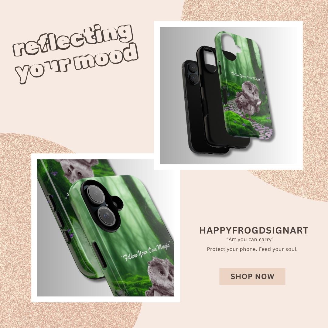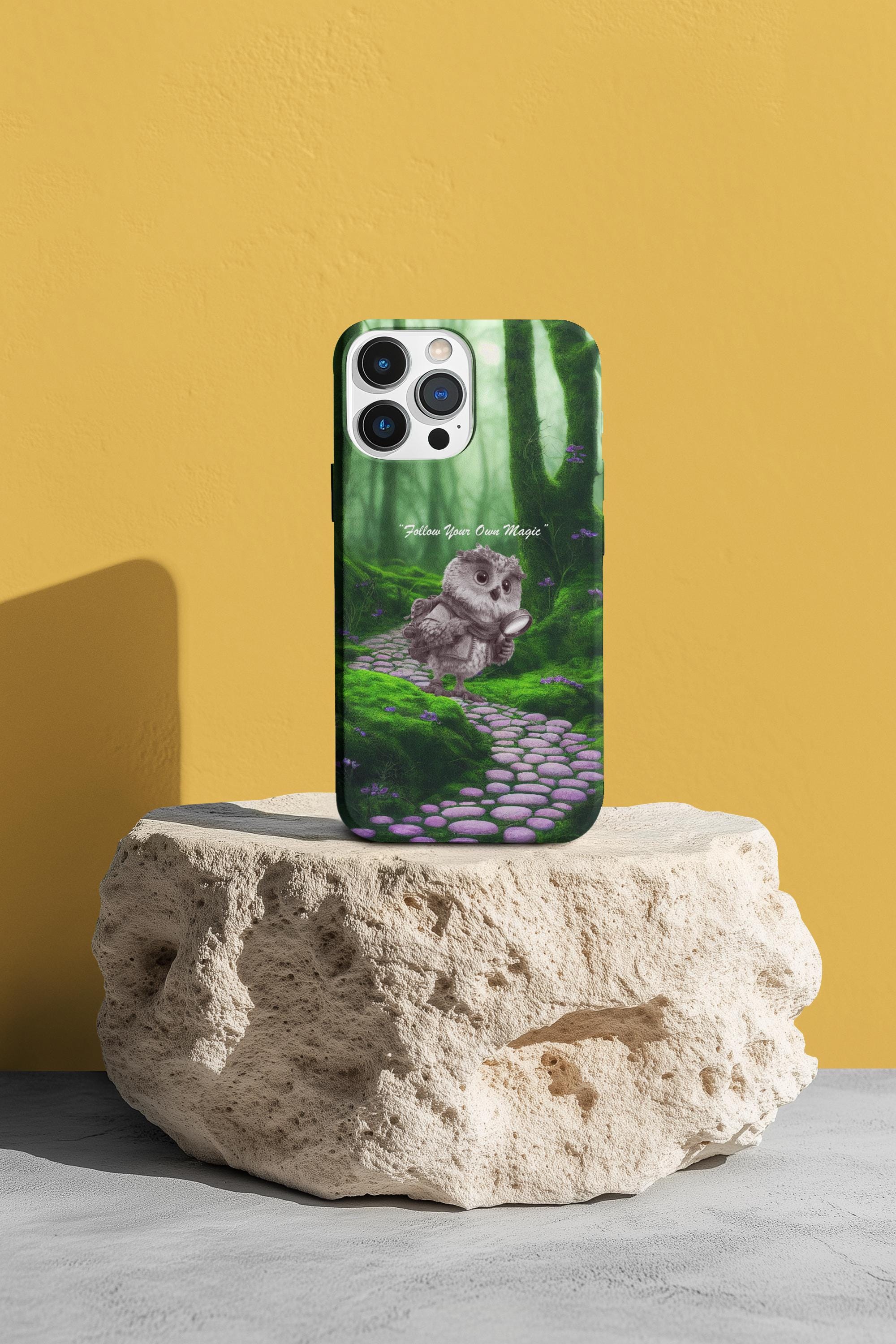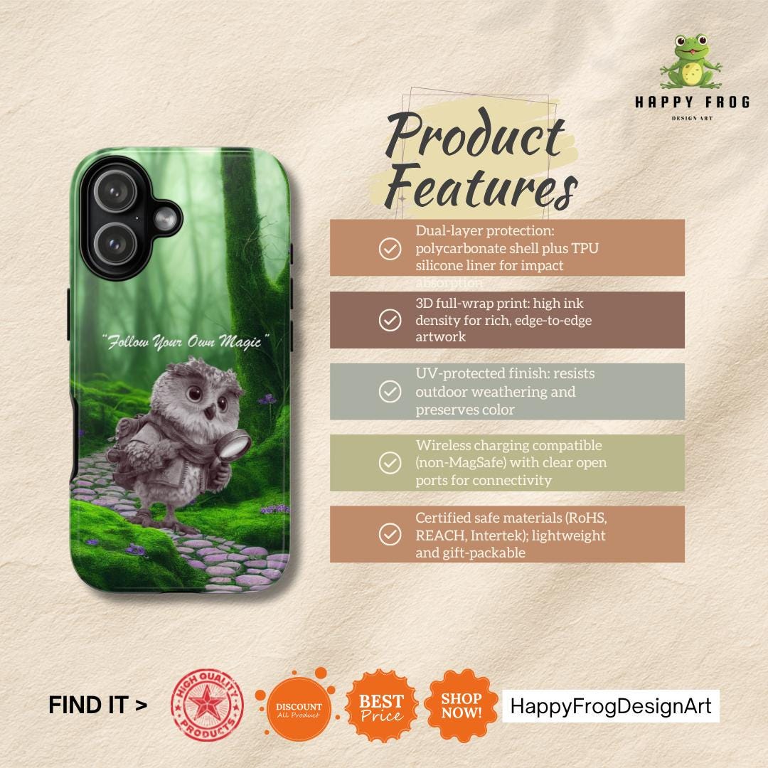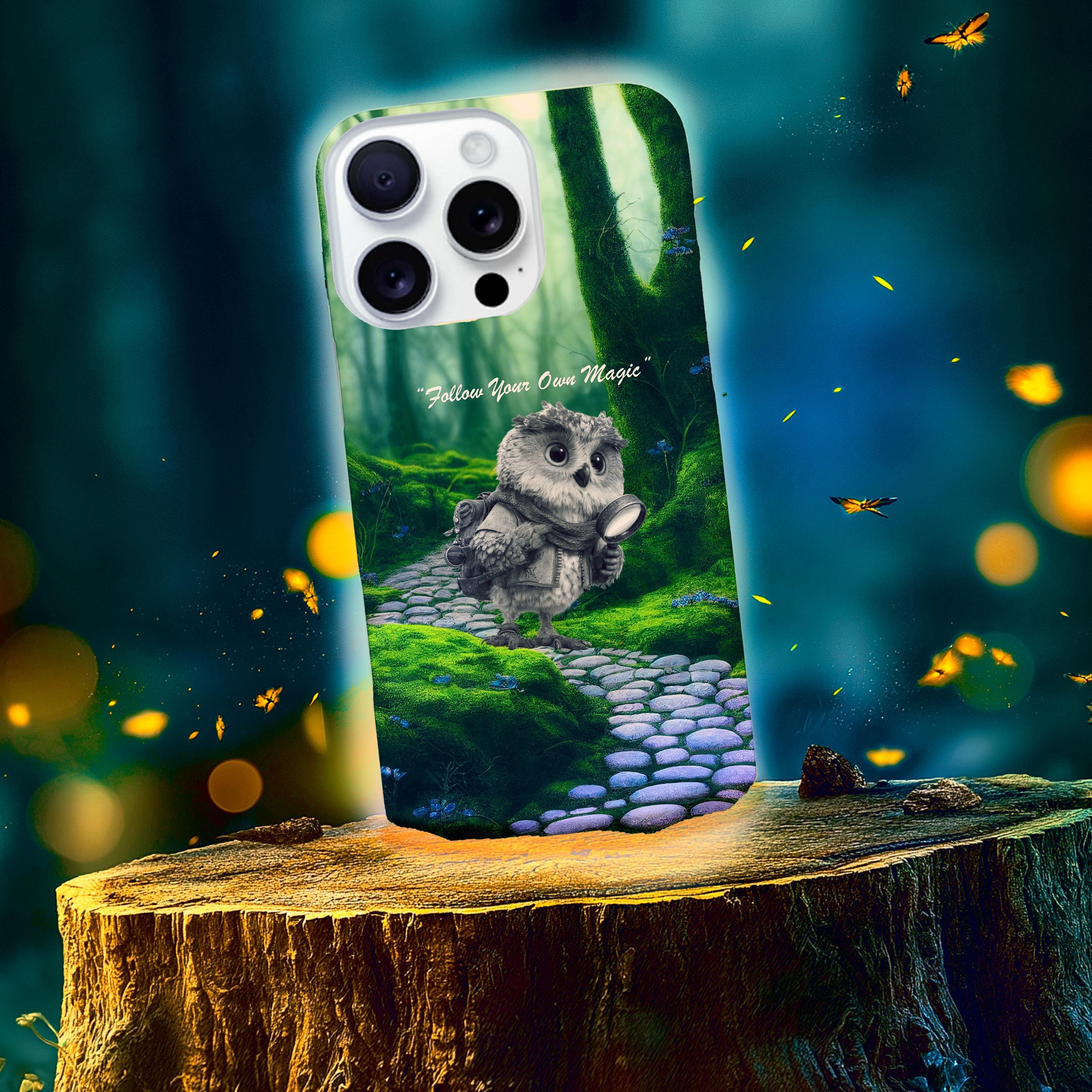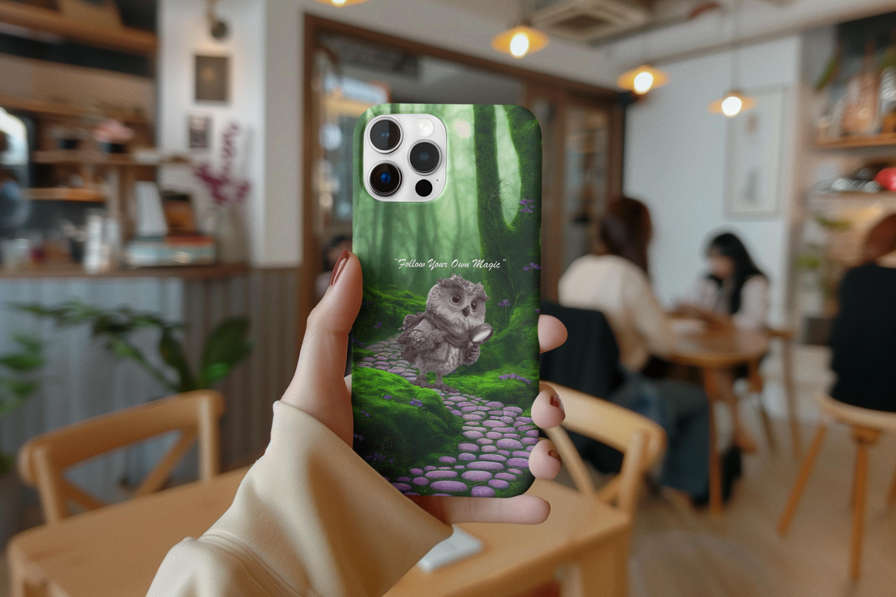 Carry a tiny pocket of wonder with you. This durable phone case wraps a soft, woodland scene around your device — a mossy stone path, shafts of green light, and a wide-eyed owl cradling a glowing lantern. The words “Follow Your Own Magic” are woven into the scene as a quiet reminder to trust small, brave steps. It feels like a whispered story on the back of your phone: wistful, slightly enchanted, and built to travel. The dual-layer construction and protective silicone liner keep your phone safe while the high-density 3D wrap preserves the rich, forest tones so the artwork stays vivid during everyday use. Lightweight enough to slip into a bag, tough enough to stand up to life on the go, this case turns your device into a small talisman for anyone who lives by curiosity and quiet courage.