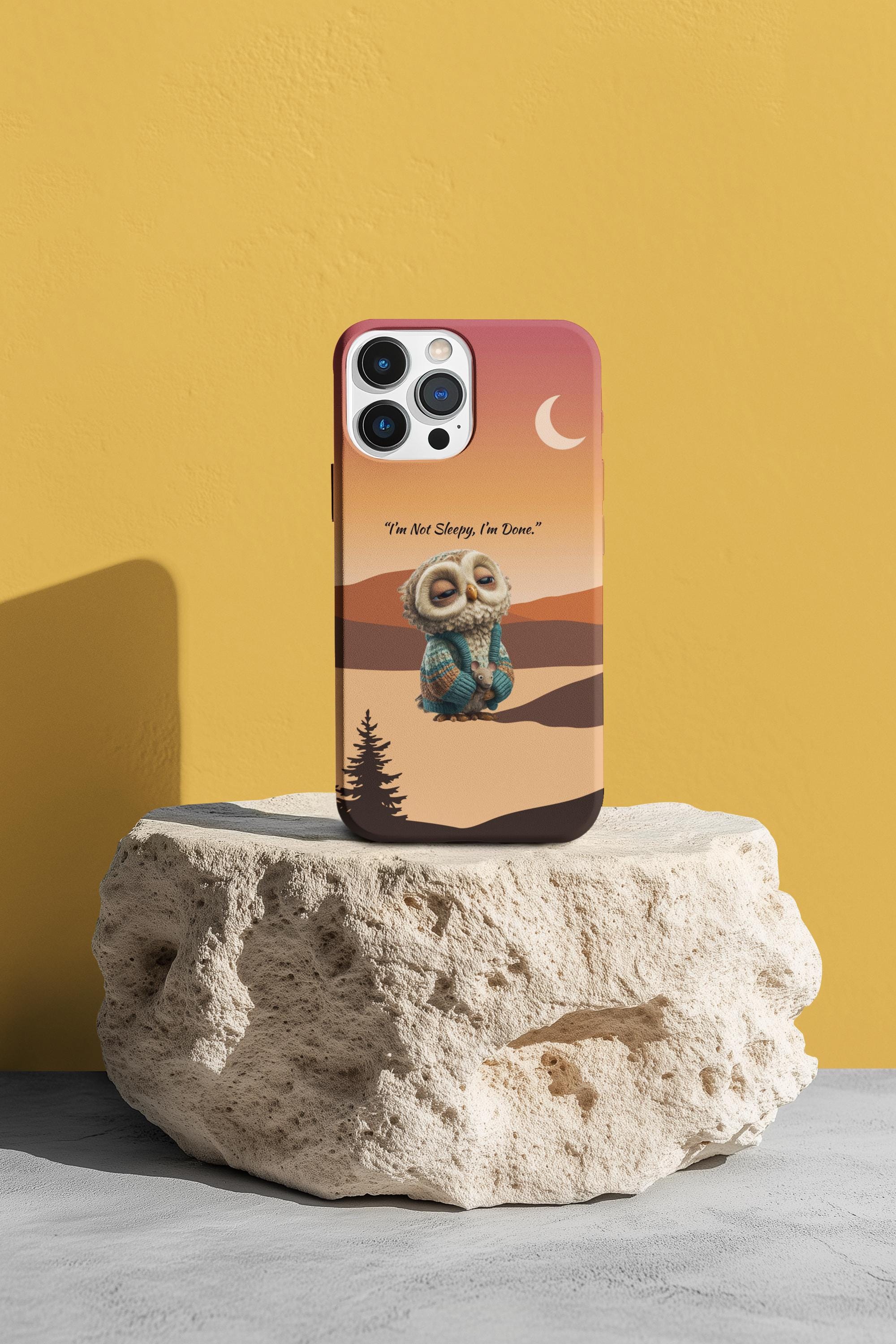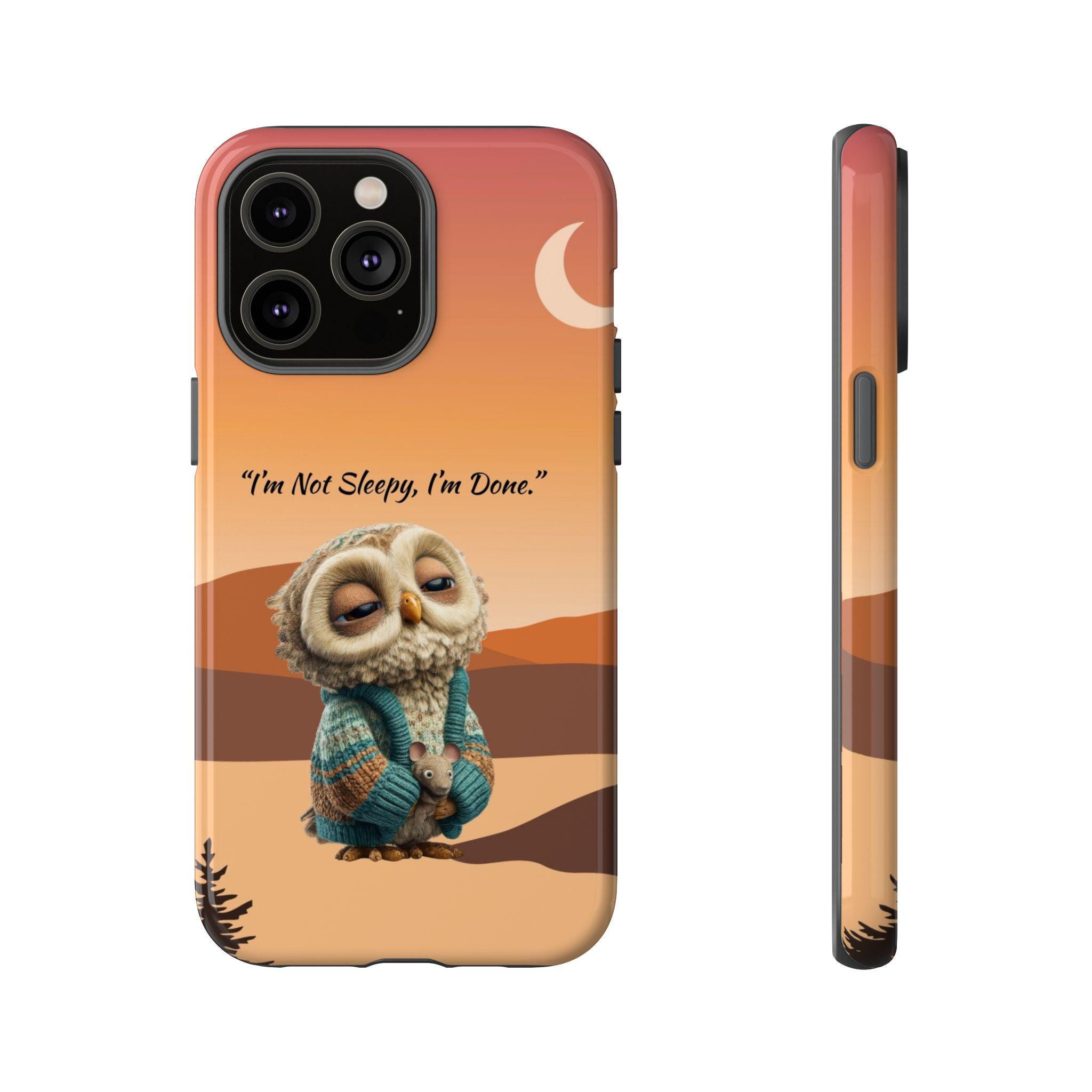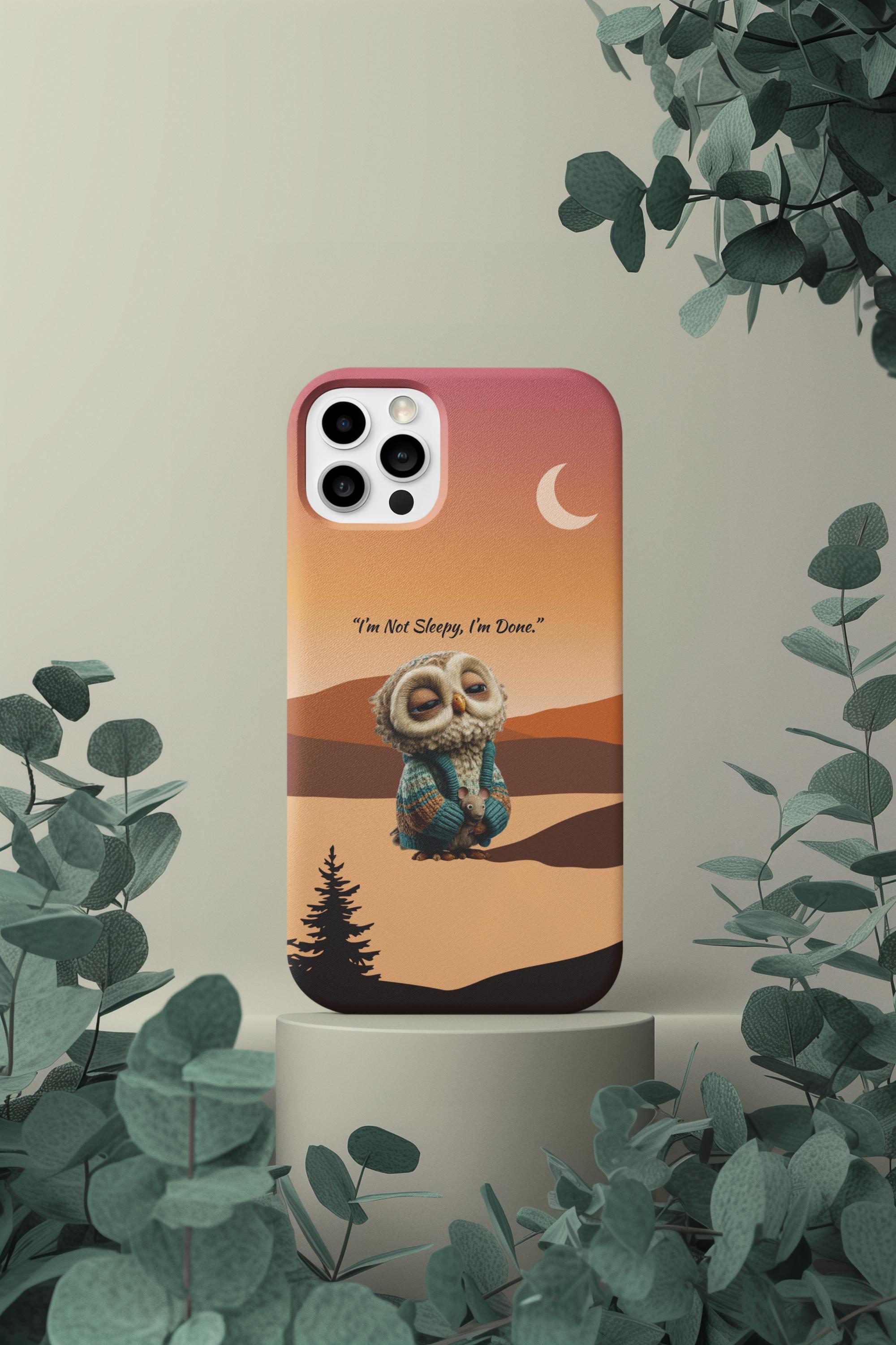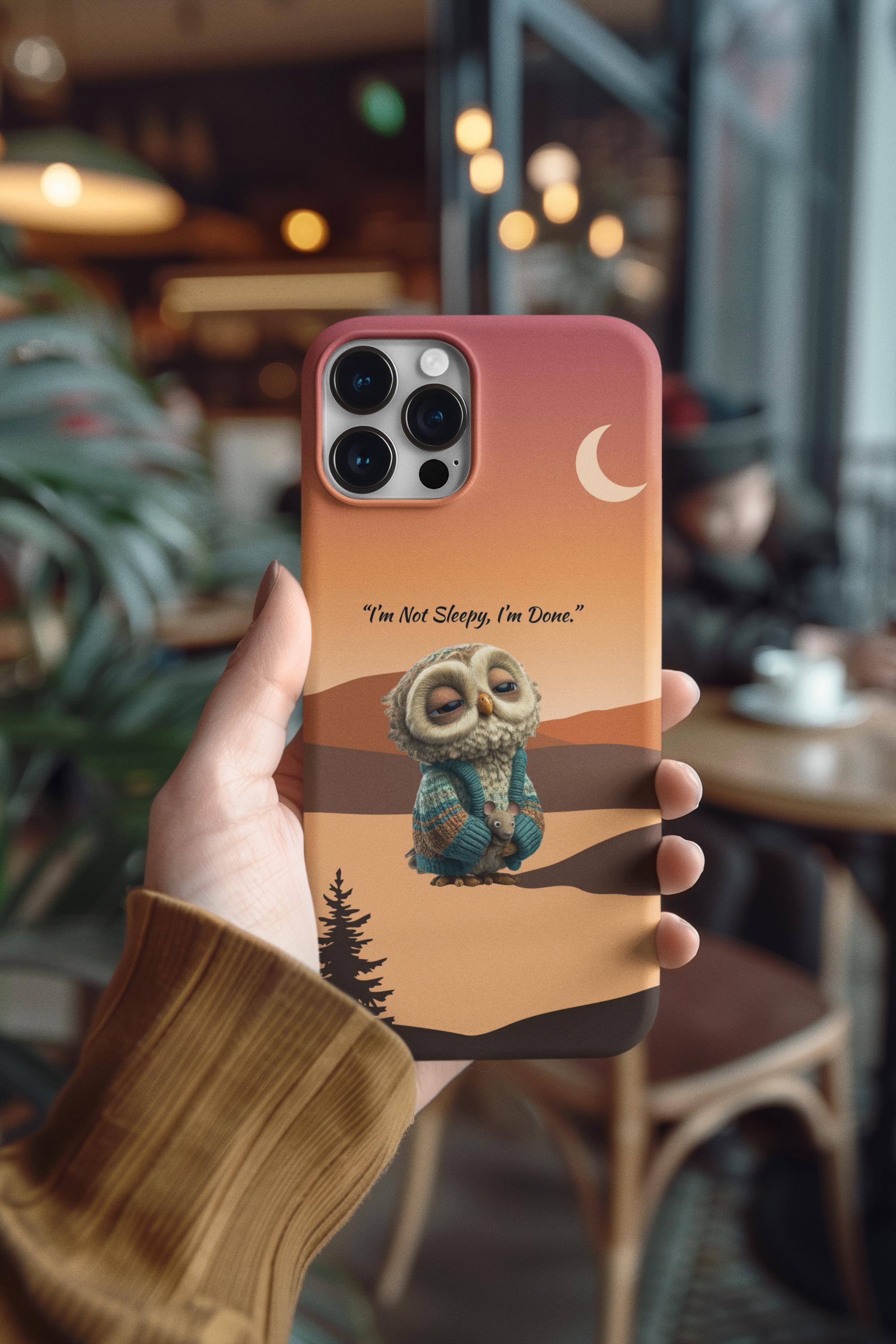 Bring humor and cozy vibes to your phone with this adorable sleepy owl phone case featuring the quote “I’m Not Sleepy, I’m Done.”