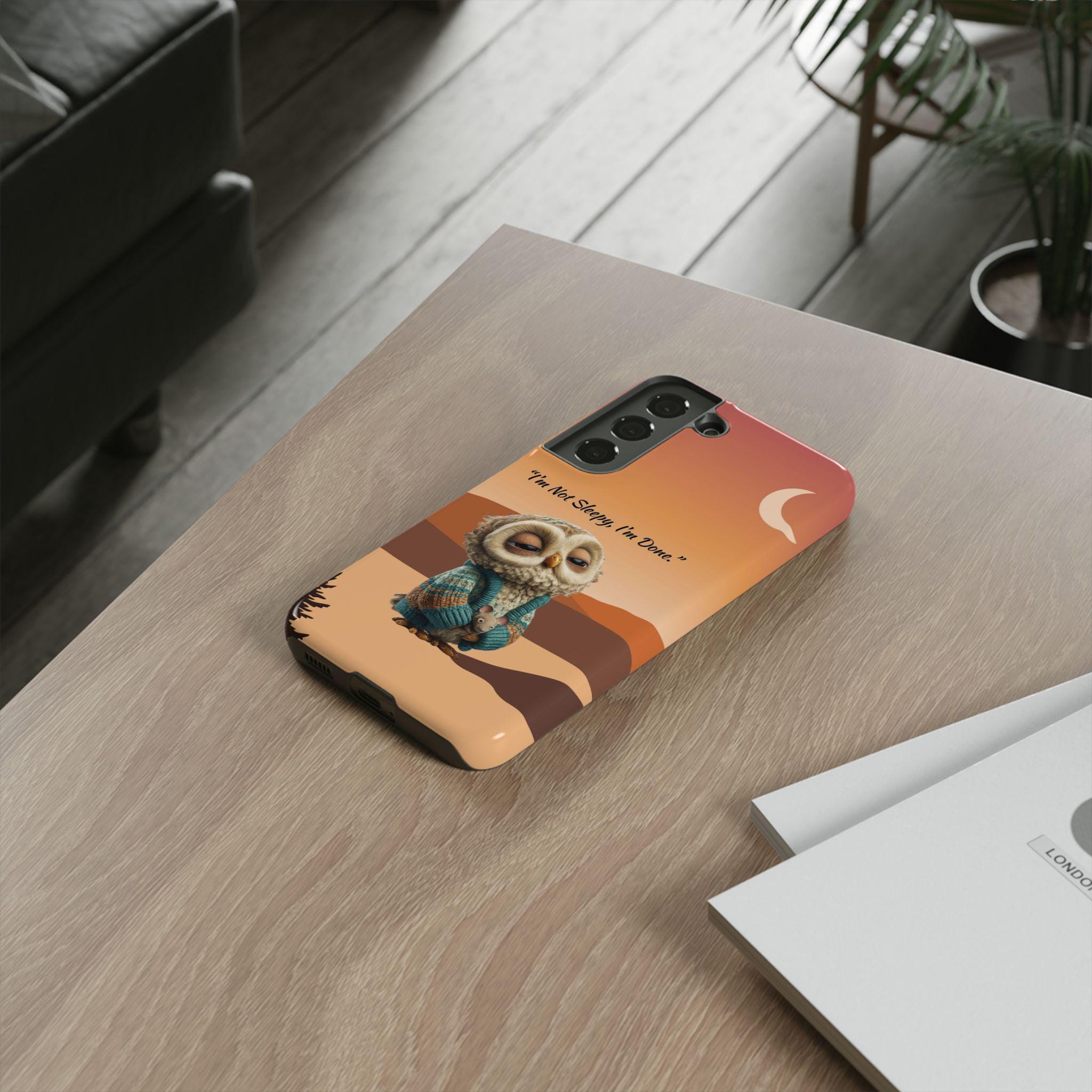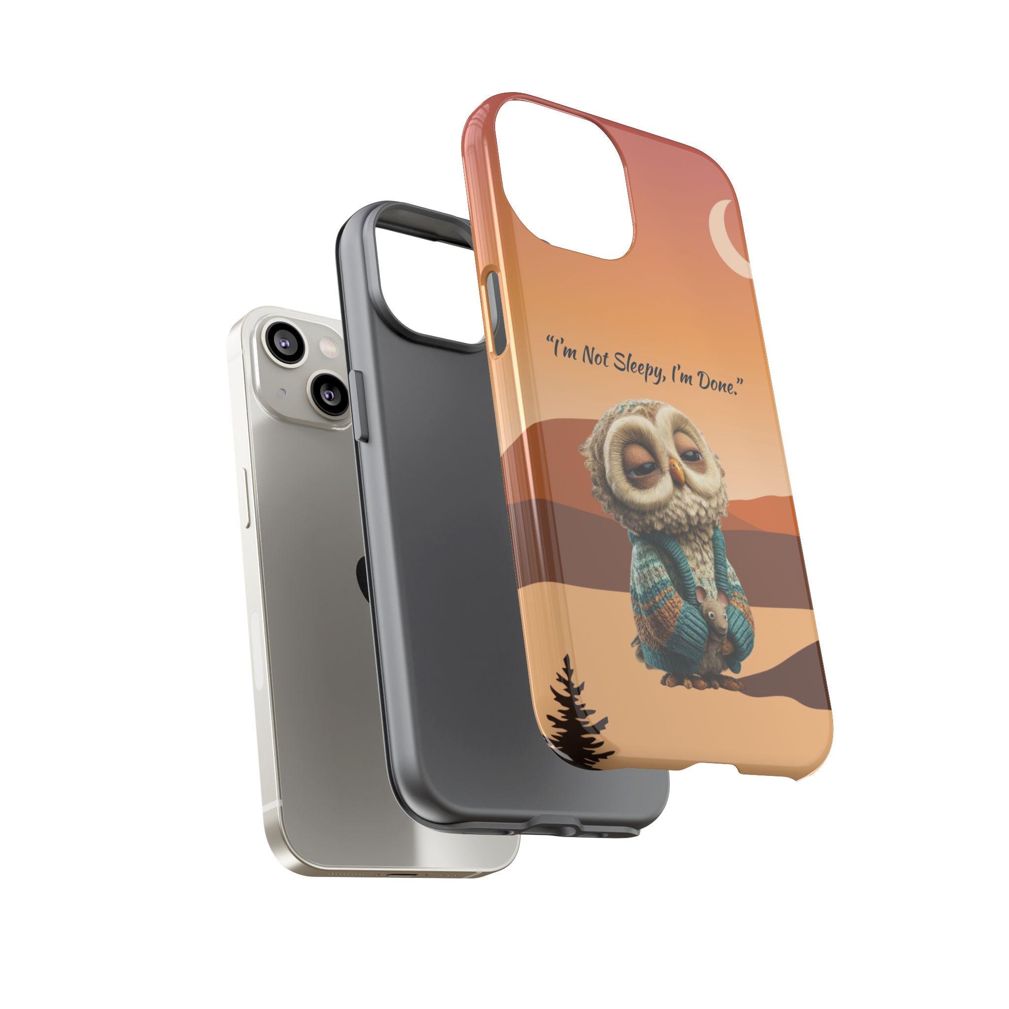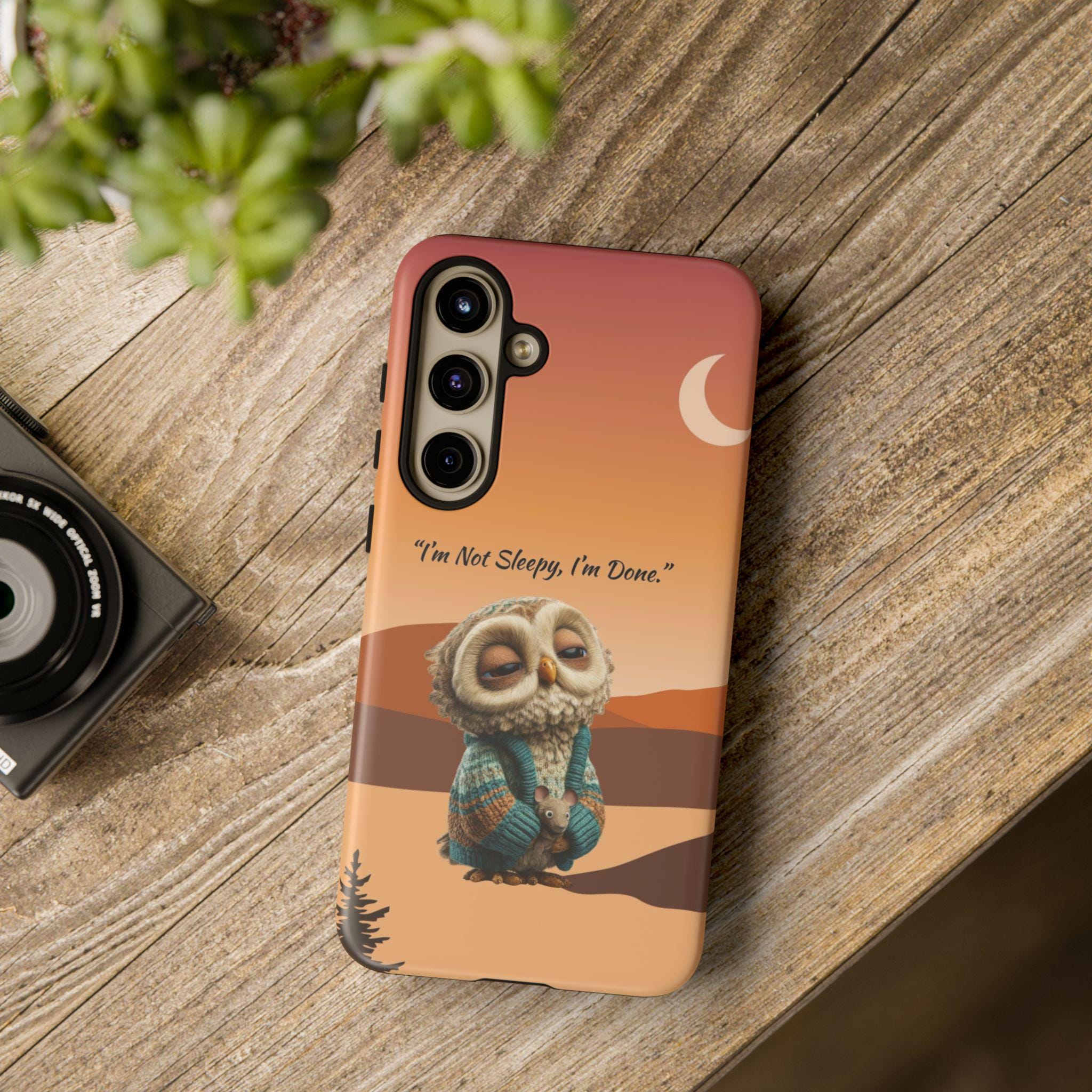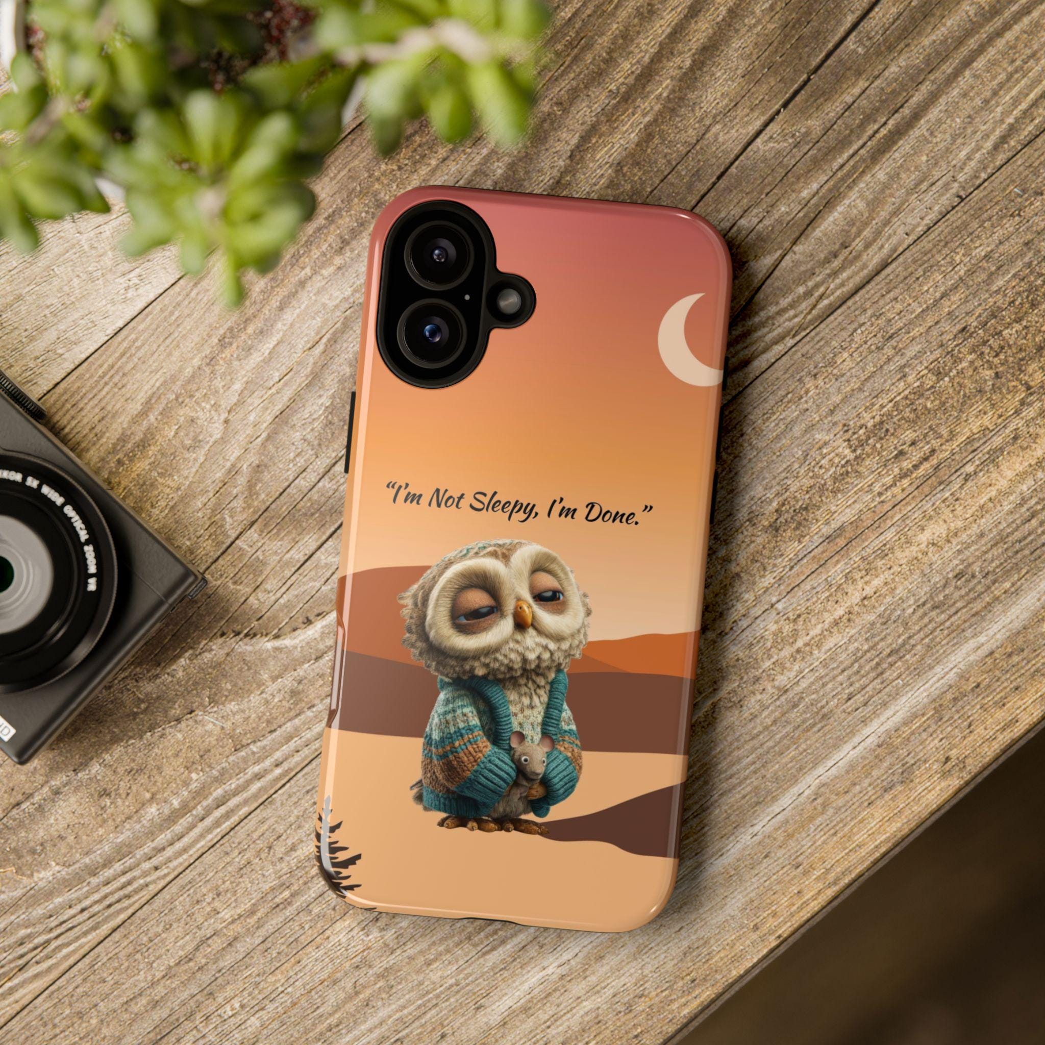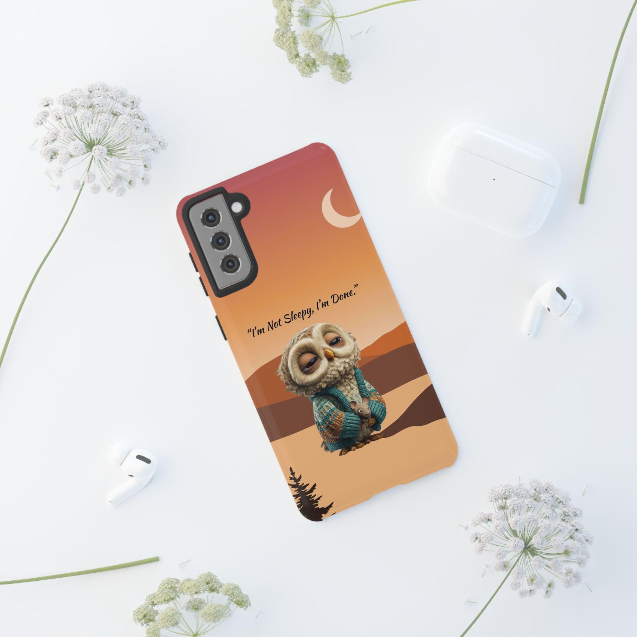 Bring humor and cozy vibes to your phone with this adorable sleepy owl phone case featuring the quote “I’m Not Sleepy, I’m Done.”