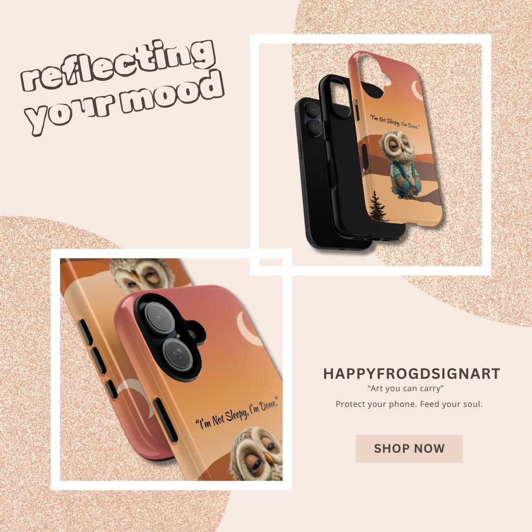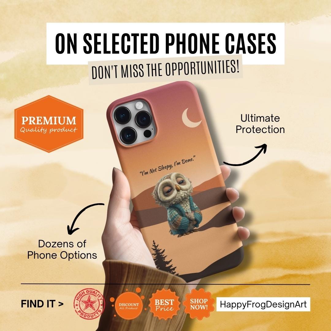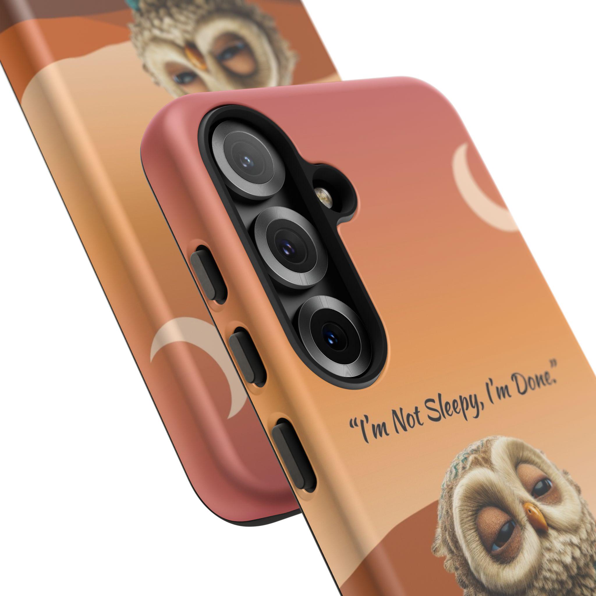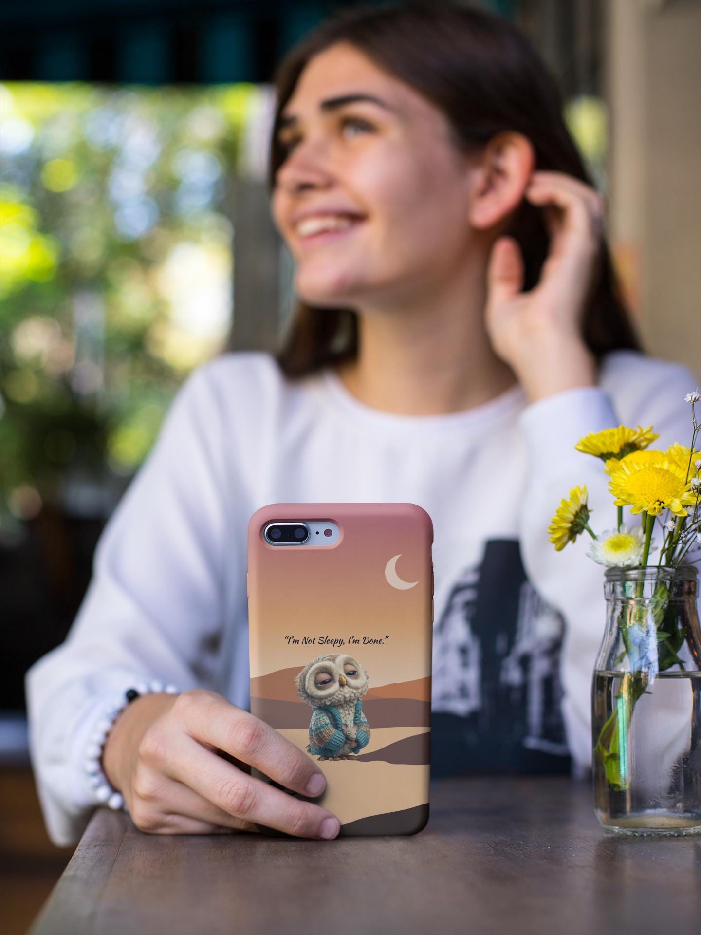 Bring humor and cozy vibes to your phone with this adorable sleepy owl phone case featuring the quote “I’m Not Sleepy, I’m Done.”