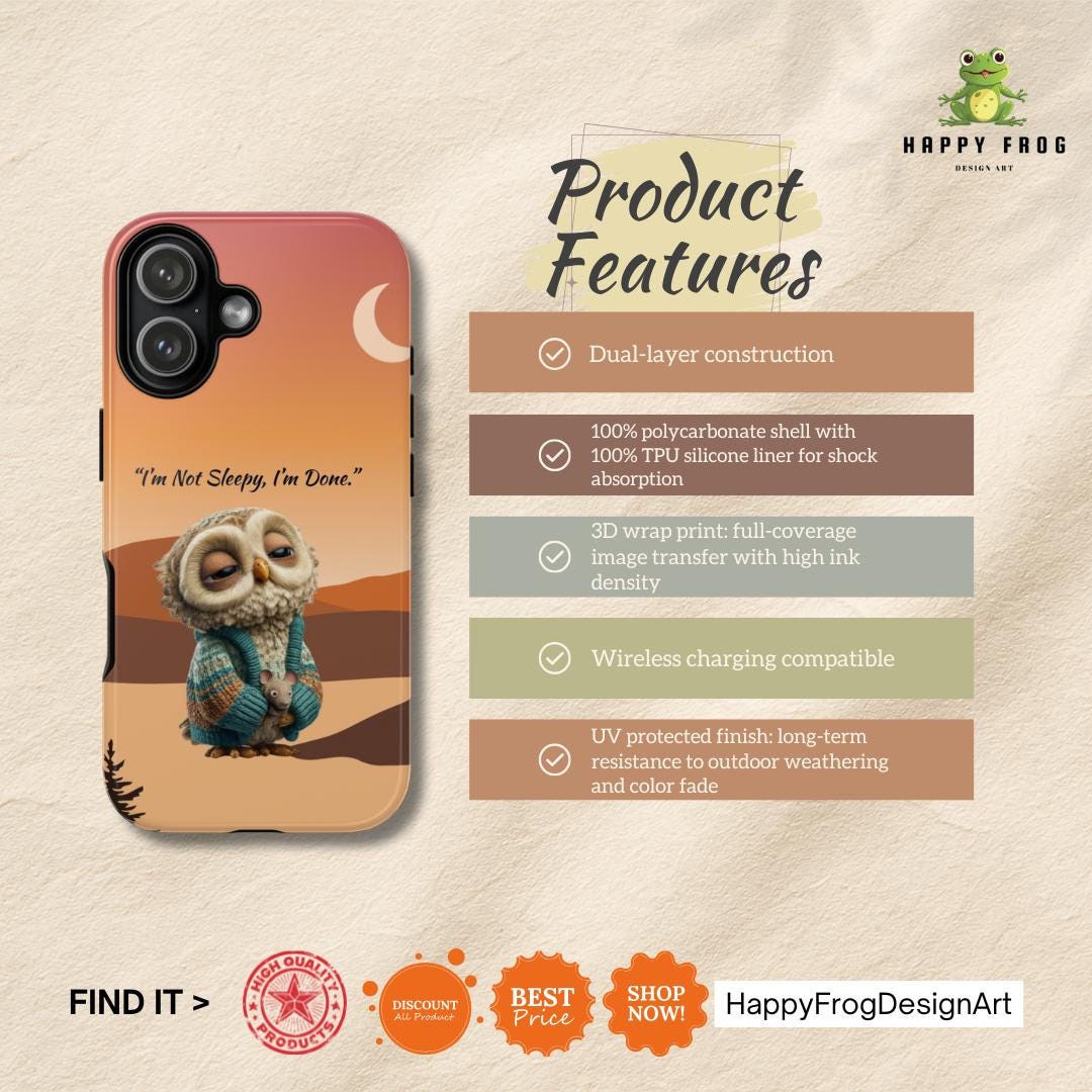 This protective phone case combines playful charm with rugged protection. A sleepy, wide-eyed owl in a cozy knit sweater sits against a warm, layered desert sunset under a crescent moon — a calming scene for late-night scrollers and night-owl personalities. The full-wrap print keeps the artwork vibrant across the back and sides while a glossy or matte finish protects the colors. Dual-layer construction (polycarbonate shell + TPU silicone liner) cushions against drops and absorbs shocks, while clear ports and wireless charging compatibility keep daily convenience intact. Subtle weathering resistance and certified material safety provide peace of mind for everyday use. This case feels like a small, comforting companion you can hold every time your phone buzzes.