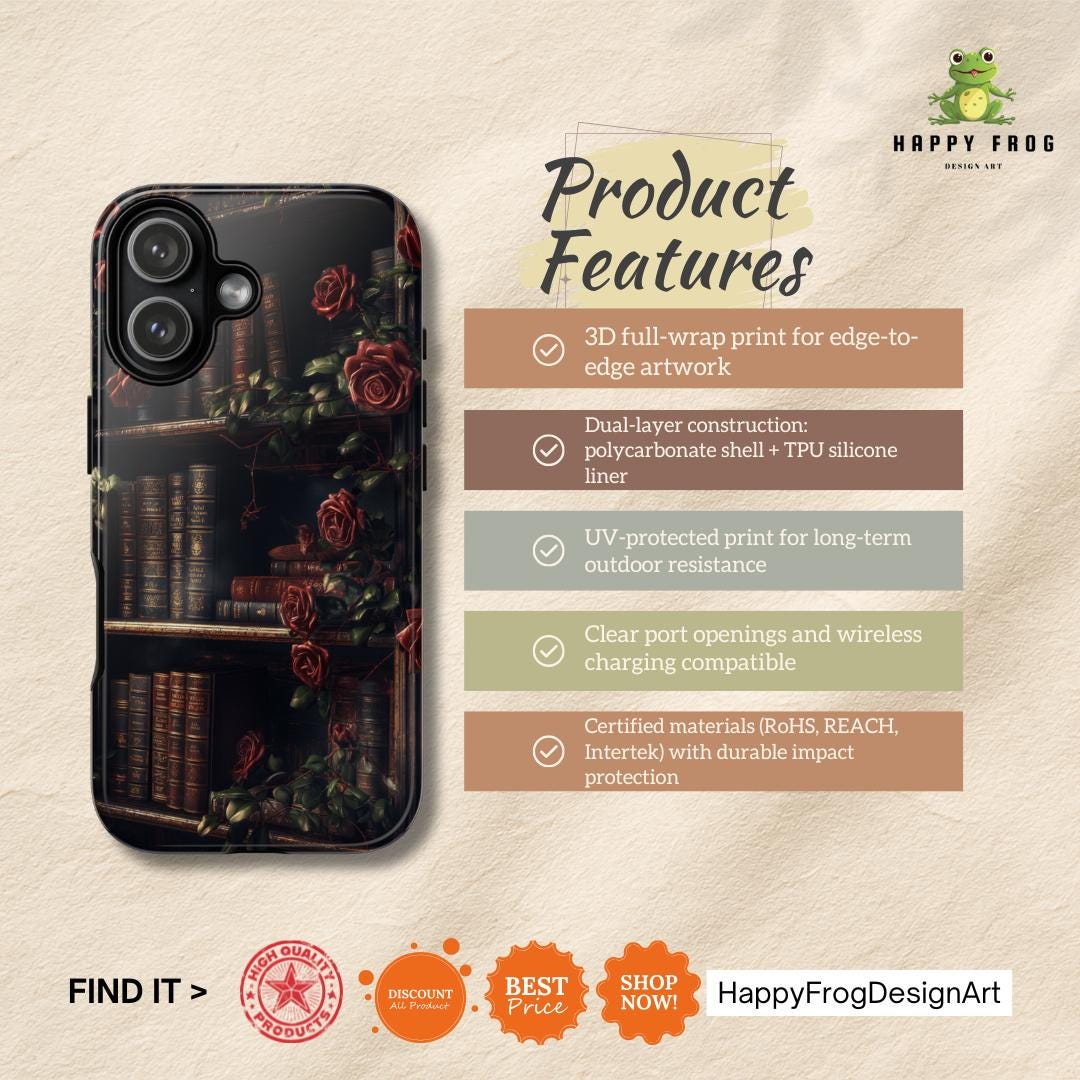 A slim, double-layer protective case that marries vintage library charm with modern phone protection. The design wraps fully around the case: worn leather-bound books stacked on dark wooden shelves, threaded with deep red roses and drifting ivy. It feels like carrying a secret study in your pocket — warm, slightly mysterious, and quietly elegant. The rigid polycarbonate shell and soft TPU liner work together to absorb shocks while the glossy/matte finish keeps the printed scene rich and detailed. Good for everyday use, this case resists outdoor fading and leaves your ports accessible while supporting wireless charging.