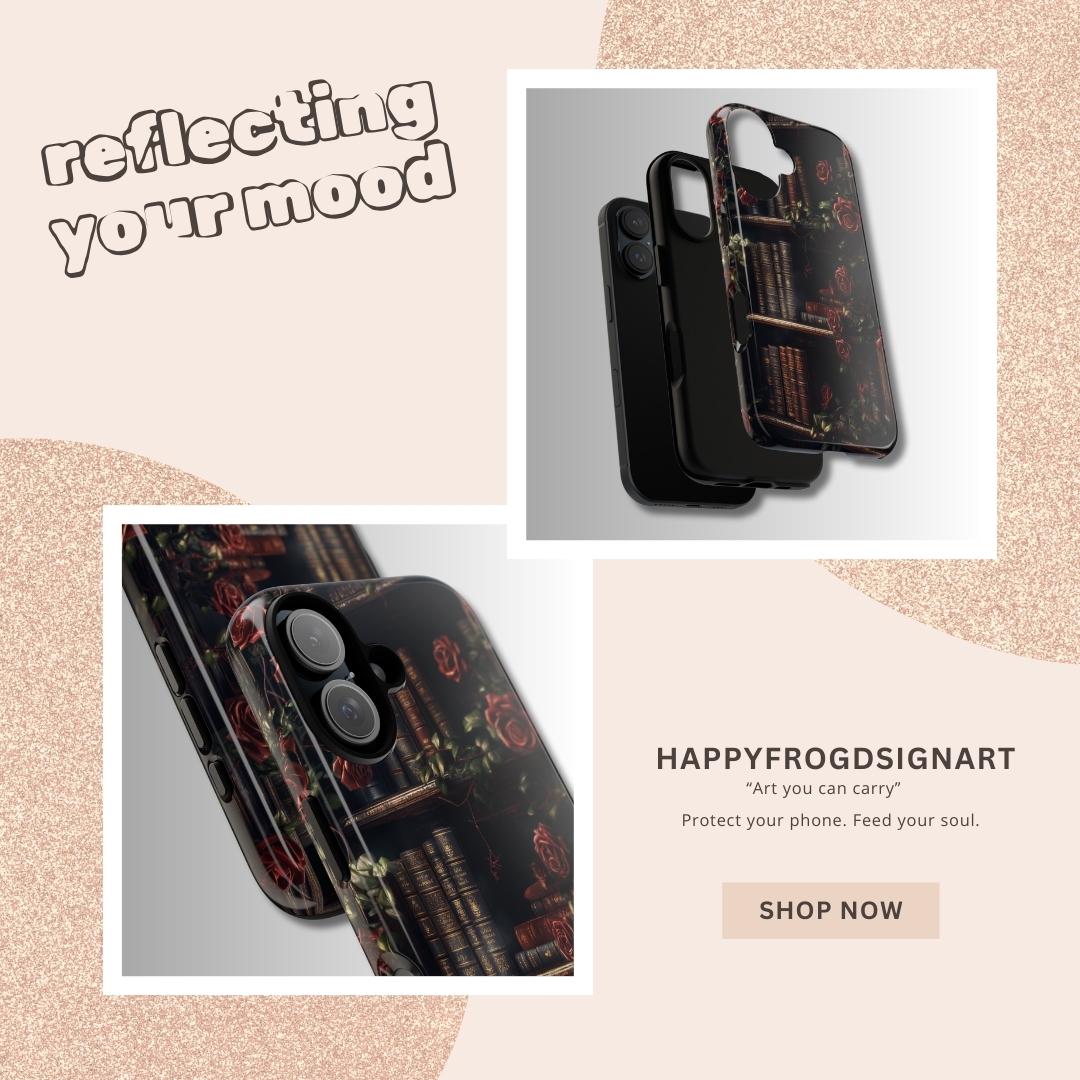 Step into a world of shadows, stories, and timeless elegance with this Dark Academia Goth Book Phone Case by HappyFrogDesignArt. Designed for book lovers, gothic souls, and aesthetic enthusiasts, this case features a moody vintage bookshelf wrapped in deep shadows and intertwined with rich red roses, creating a romantic, mysterious atmosphere straight out of a dark fantasy novel.