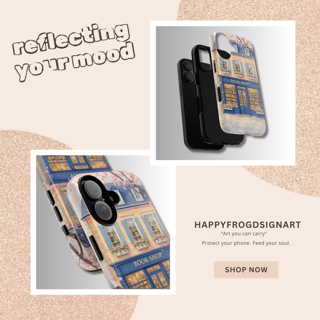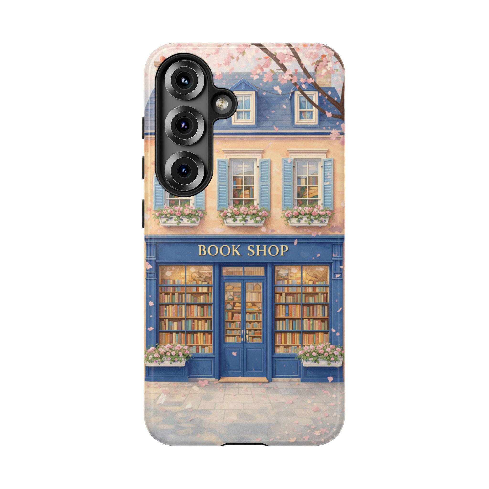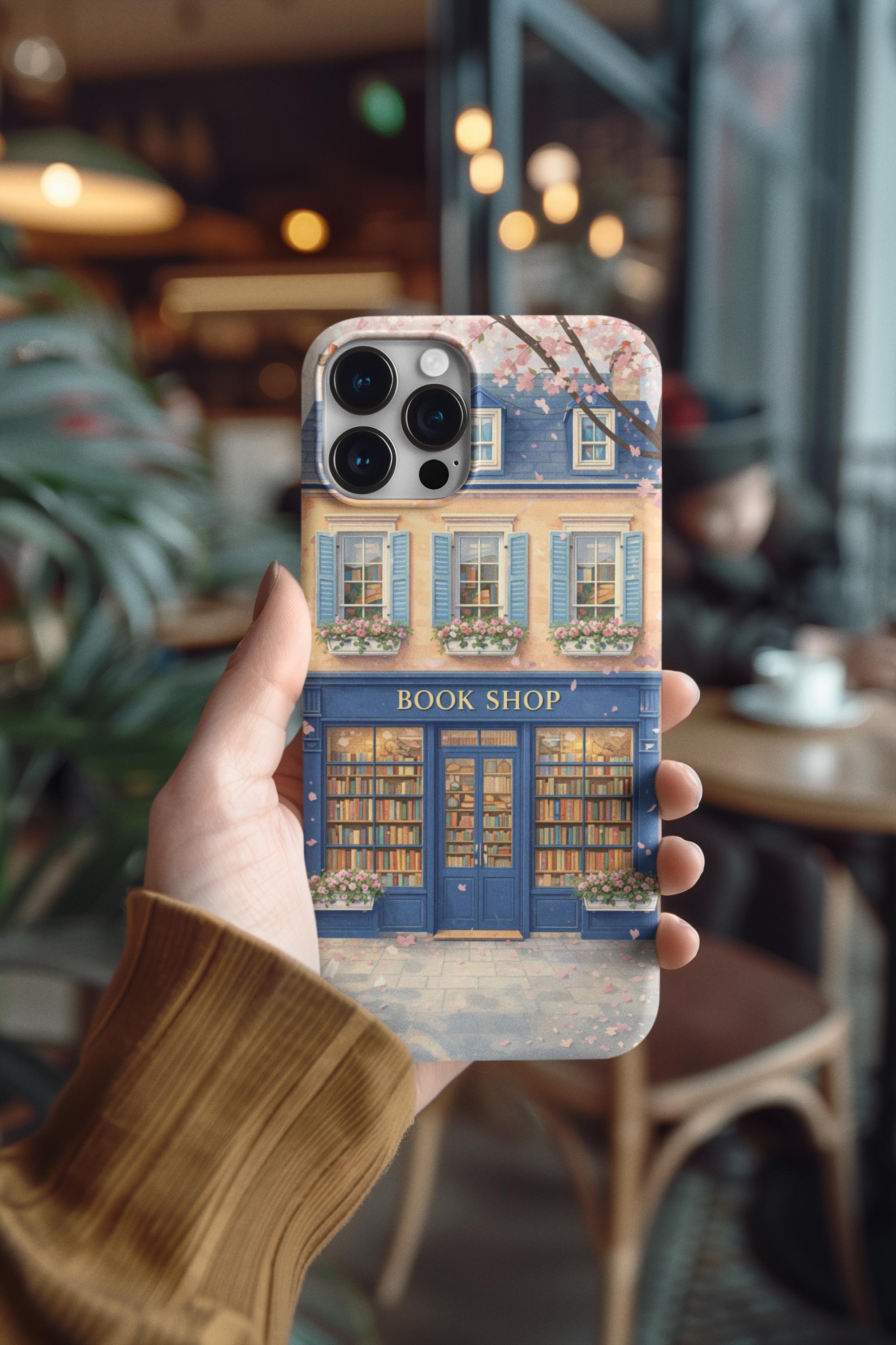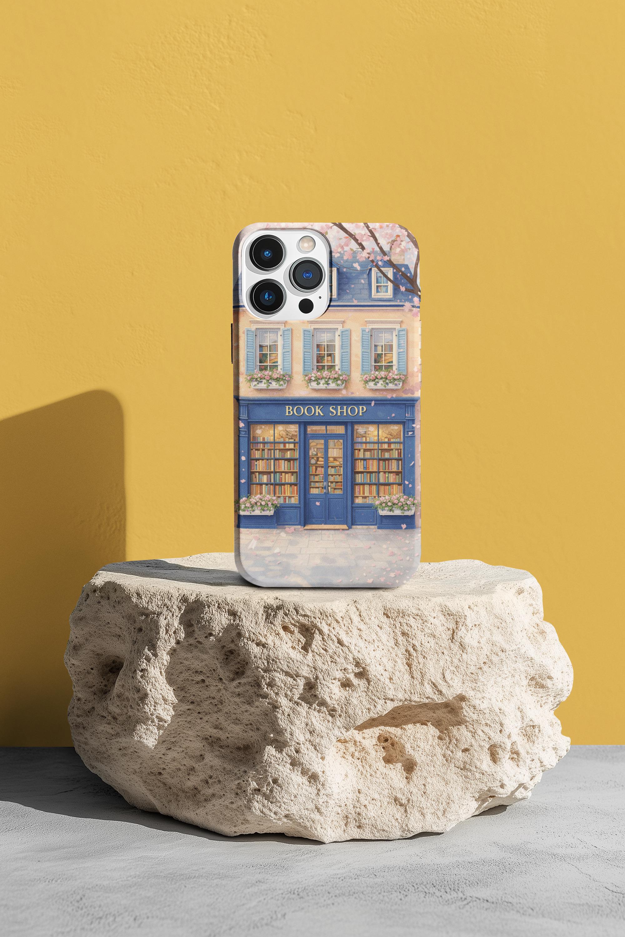 A protective phone case that feels like a tiny window into a storybook street. The wraparound art shows a cozy blue bookshop with flower boxes and warm, glowing windows—soft pastels and delicate details that catch the eye without shouting. It’s built as a dual-layer shell with a shock-absorbing TPU liner and glossy or matte finish options, so it keeps your phone safe while adding a quiet, literary charm to your day. Weather-resistant inks preserve the illustration outdoors, and precise cutouts keep charging and ports effortless. For those who carry their books and small pleasures with them, this case blends function with a gentle sense of place.