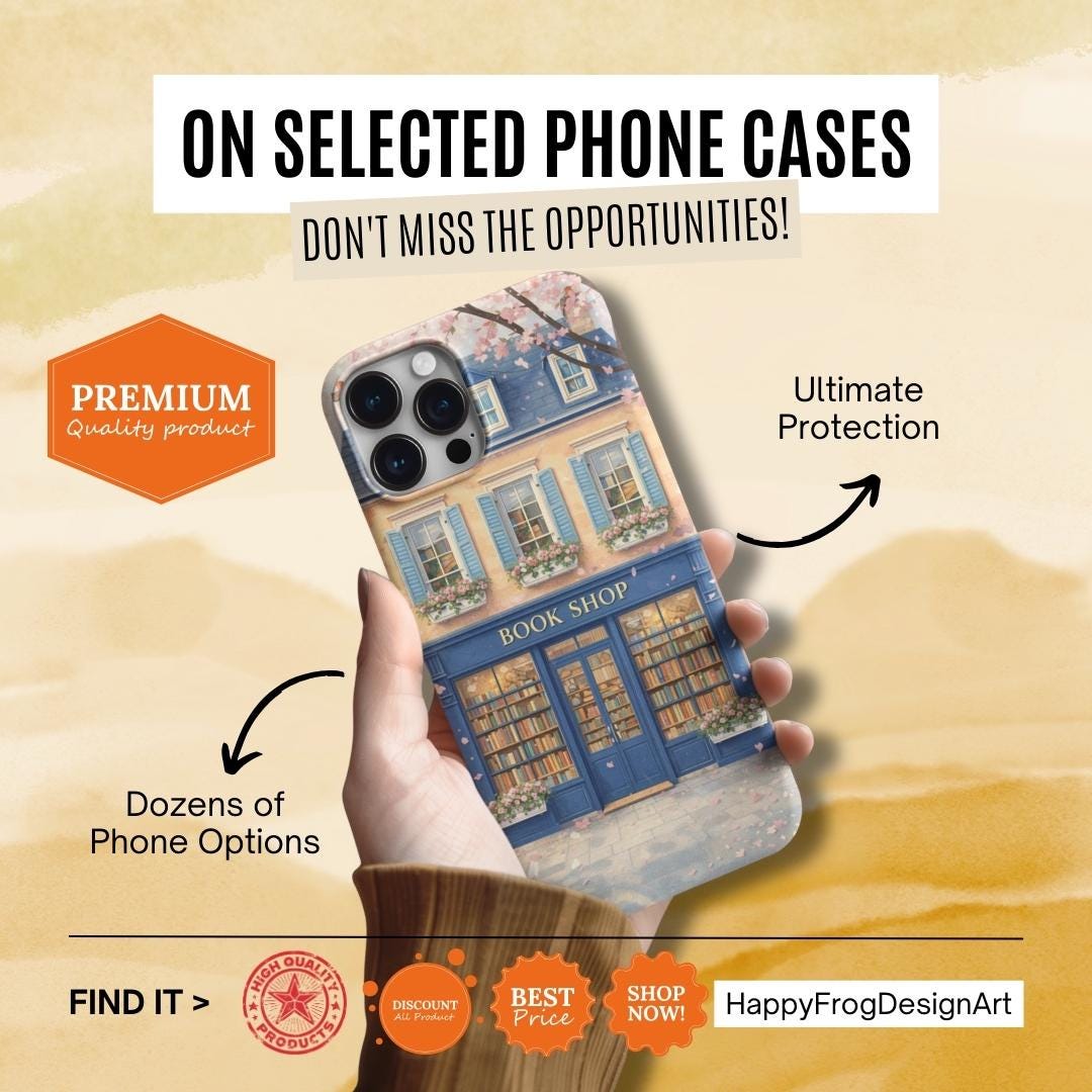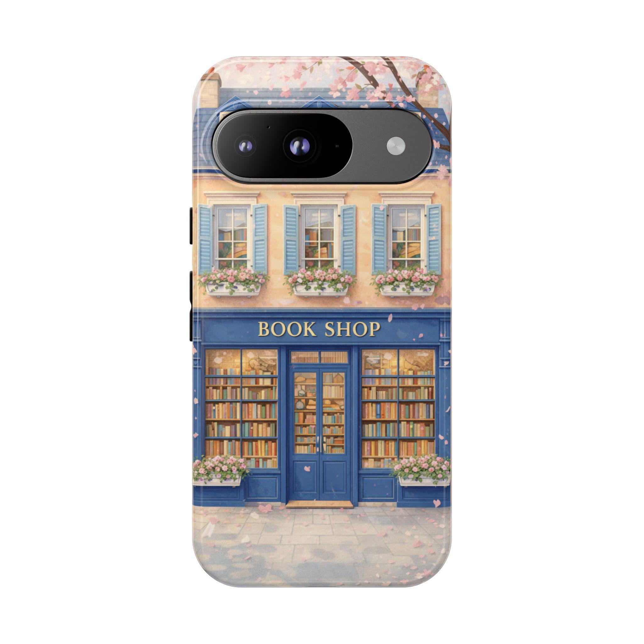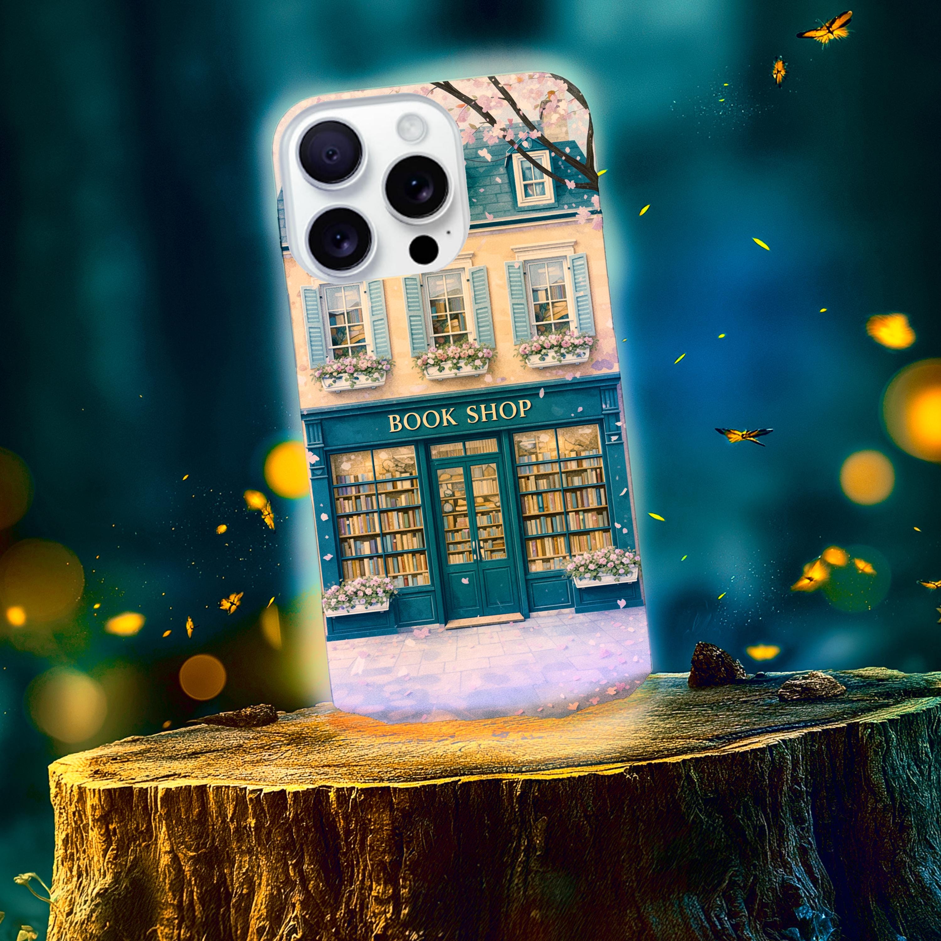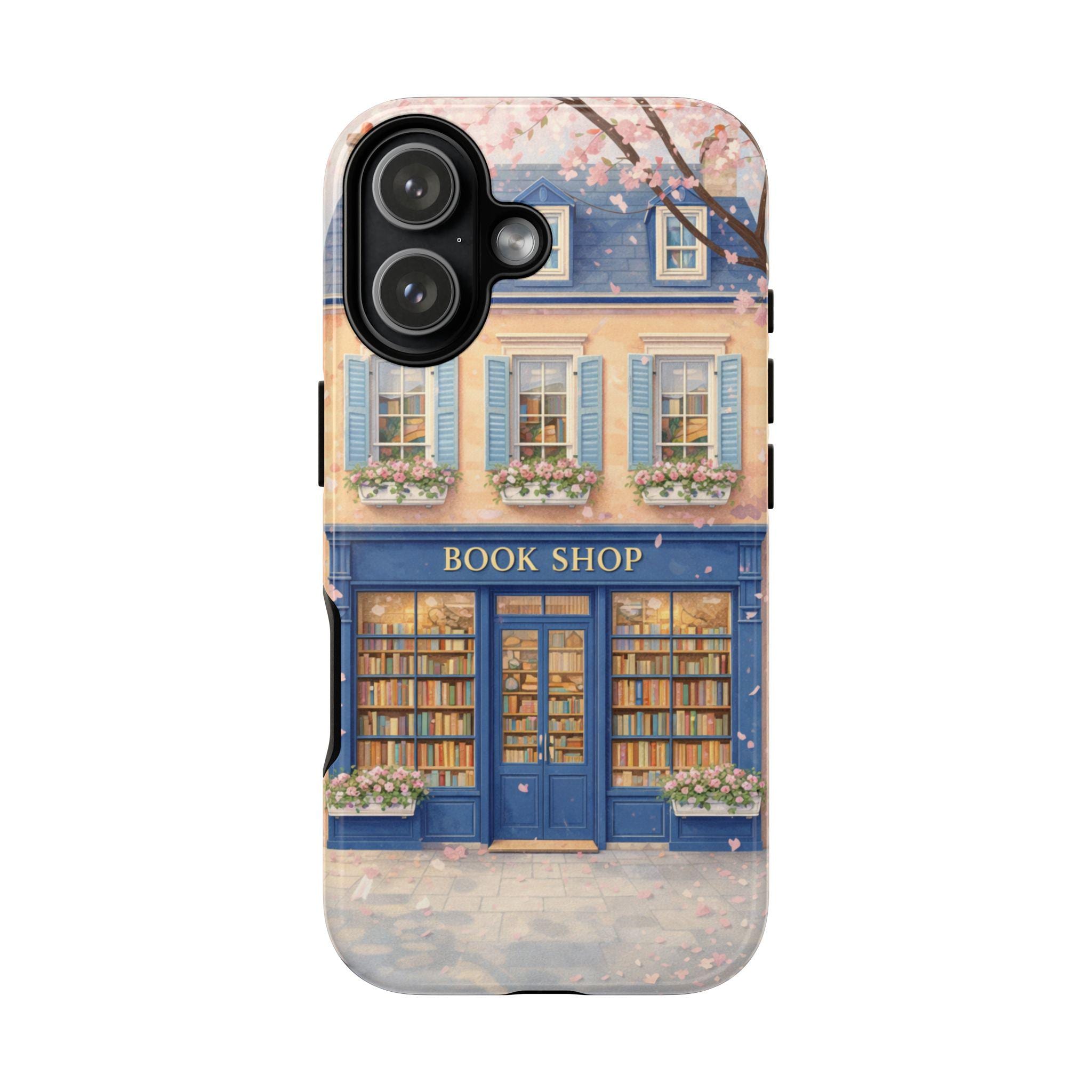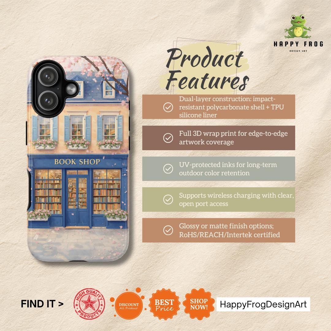 A protective phone case that feels like a tiny window into a storybook street. The wraparound art shows a cozy blue bookshop with flower boxes and warm, glowing windows—soft pastels and delicate details that catch the eye without shouting. It’s built as a dual-layer shell with a shock-absorbing TPU liner and glossy or matte finish options, so it keeps your phone safe while adding a quiet, literary charm to your day. Weather-resistant inks preserve the illustration outdoors, and precise cutouts keep charging and ports effortless. For those who carry their books and small pleasures with them, this case blends function with a gentle sense of place.