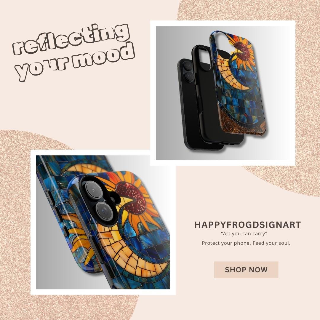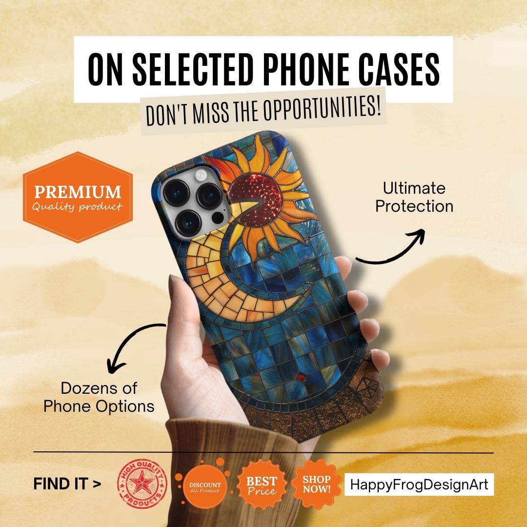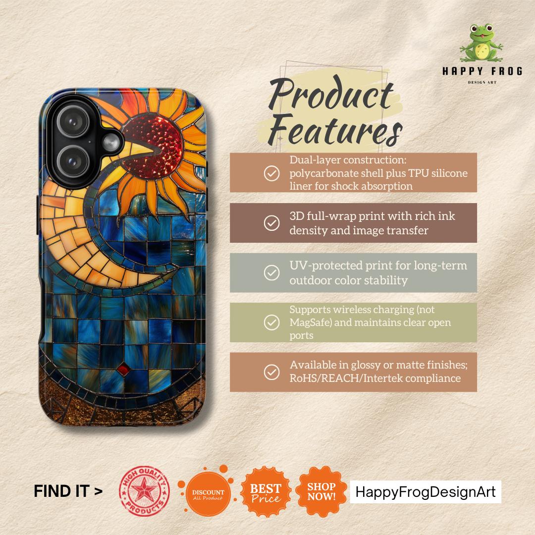 This protective phone case wraps your device in a mosaic of deep blues, warm amber, and sunburst gold. The stained-glass moon and sun motif catches the eye — luminous tesserae arranged like a chapel window, softened by a glossy or matte finish. Built as a dual-layer shell with a silicone TPU liner, it cushions everyday knocks while keeping ports clear and wireless charging available. The design resists fading with UV protection, but gentle care keeps the colors vivid. Carry a piece of evening light with you: it feels like holding a small window to the sky when you answer a call or scroll through photos.