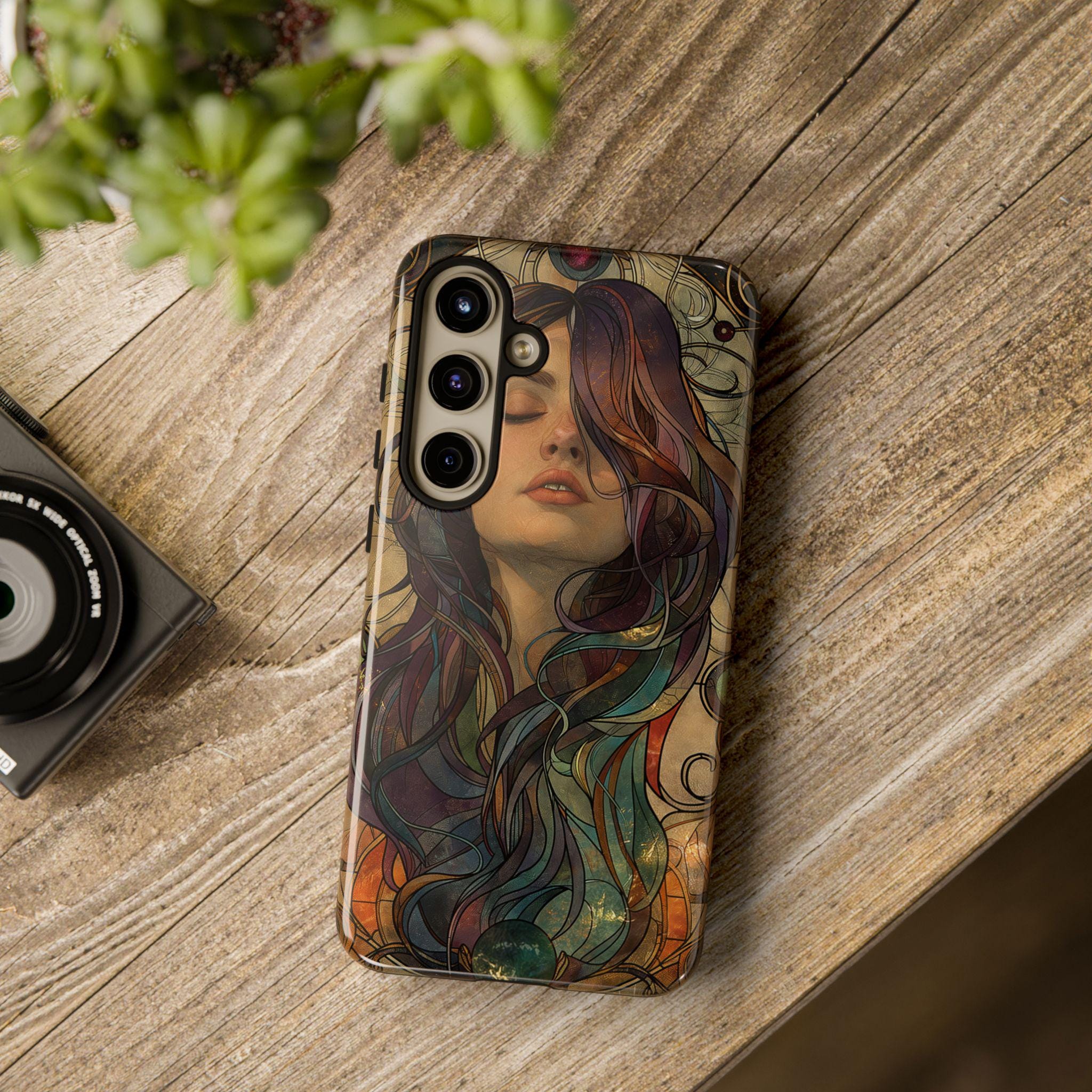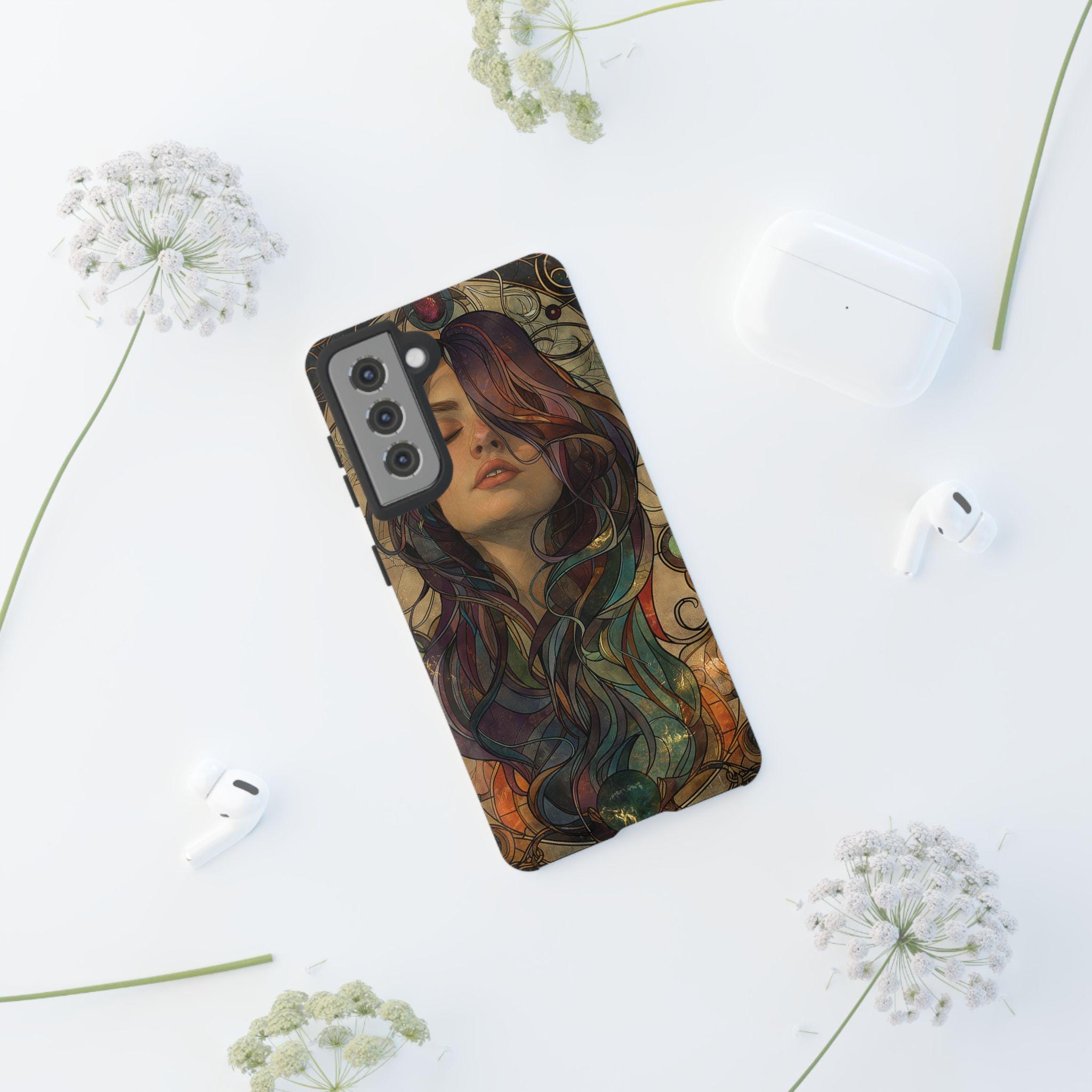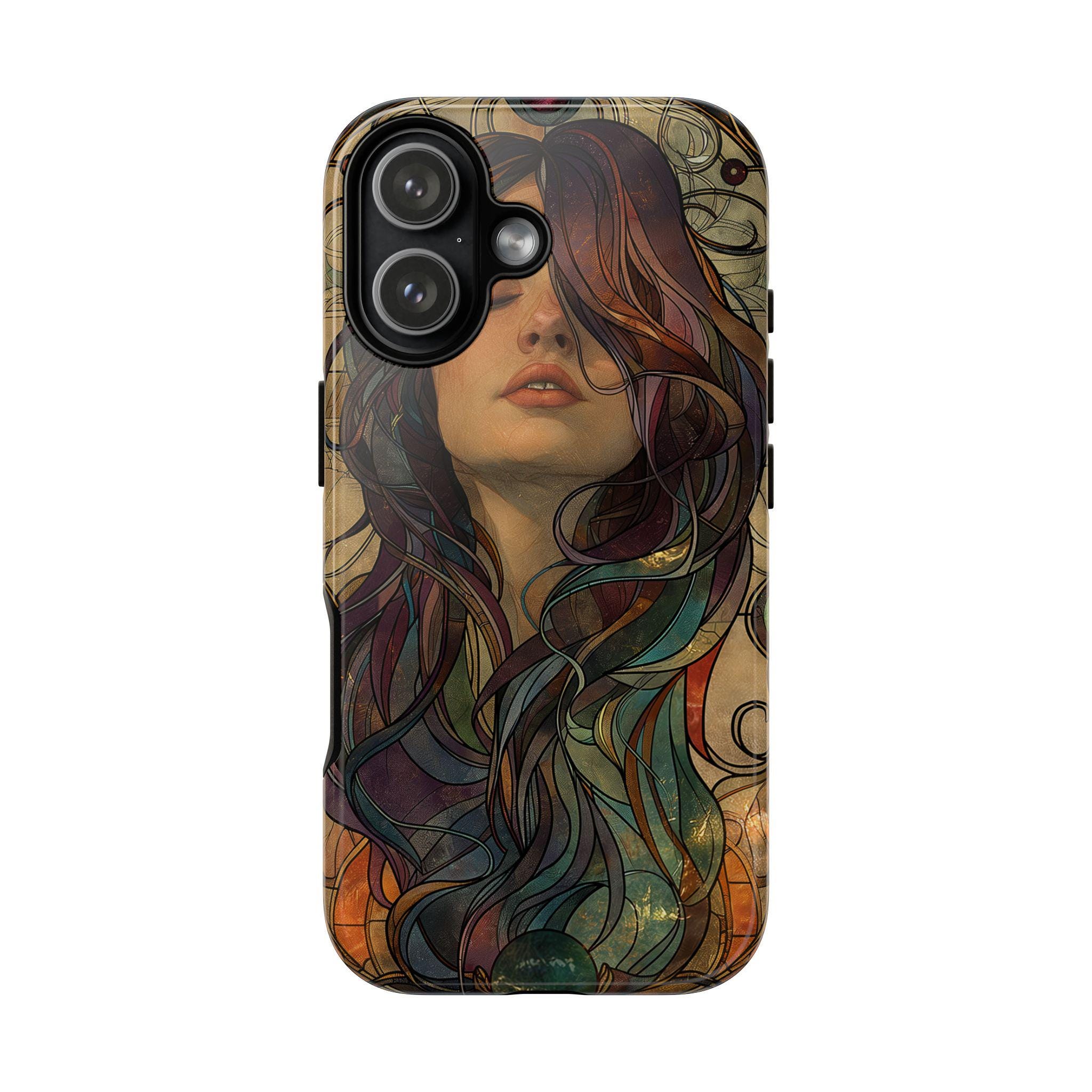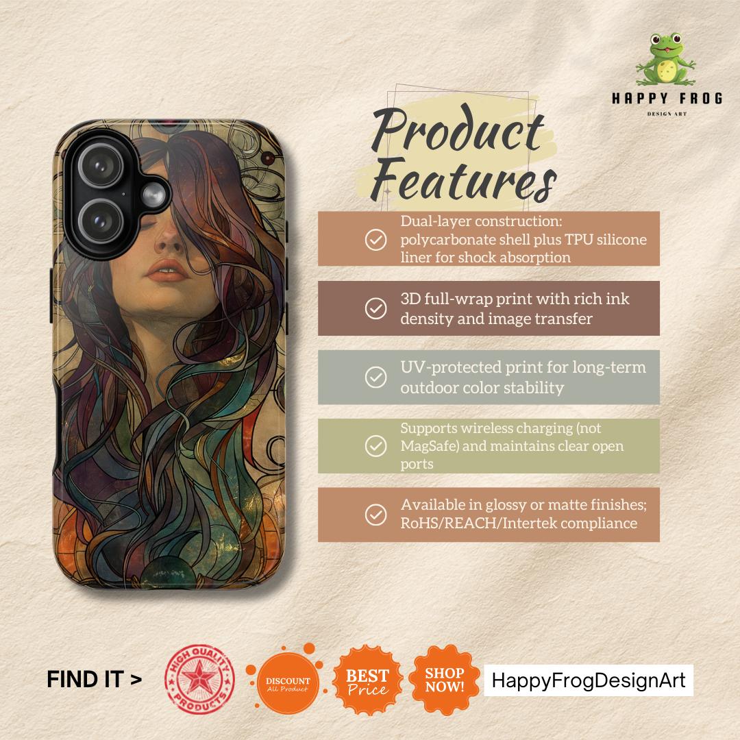 A protective phone case that feels like wearable art. The slim, dual-layer shell wraps a richly detailed portrait in full-color, edge-to-edge print — hair flowing in jewel-toned swirls against a warm, muted backdrop. It absorbs the little shocks of daily life while keeping the artwork vivid with UV-resistant inks. The soft TPU liner cushions drops and the rigid polycarbonate outer shell resists impacts and scratches. Open ports and wireless charging compatibility keep your phone fully functional, while the glossy or matte finish lets you choose the exact look you want. This case brings an artful, slightly vintage mood to everyday carry and holds up to regular use when handled with care.