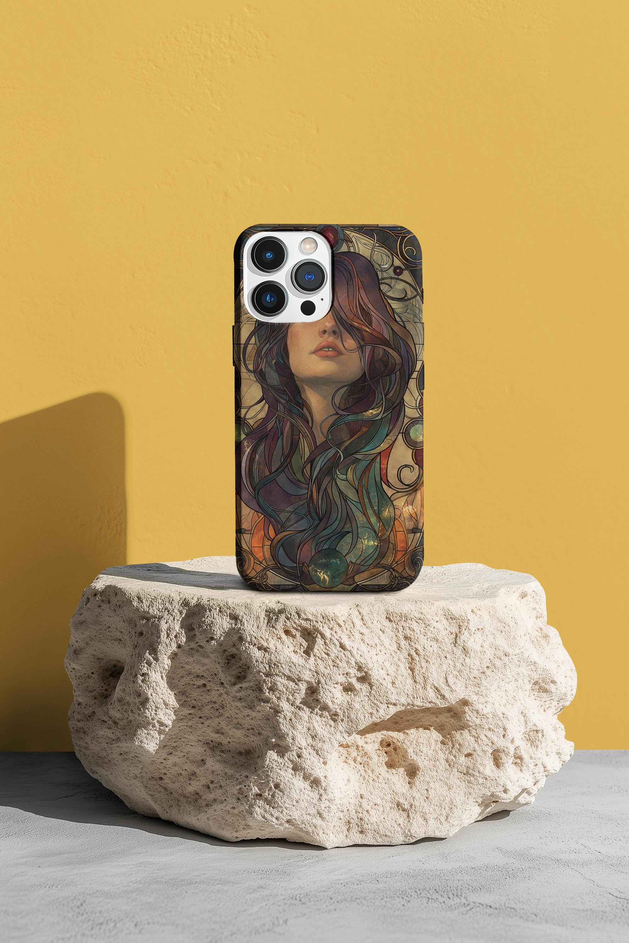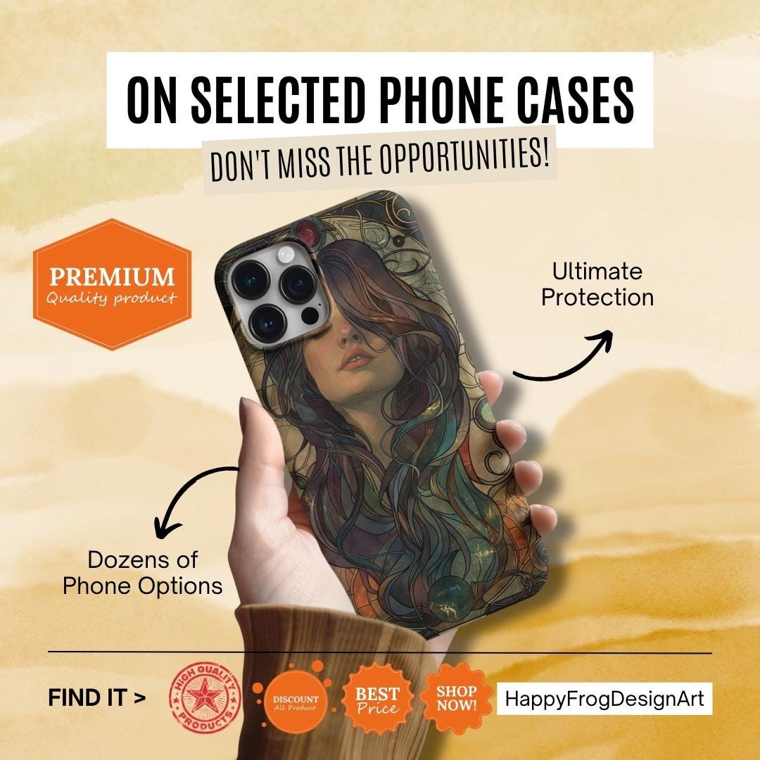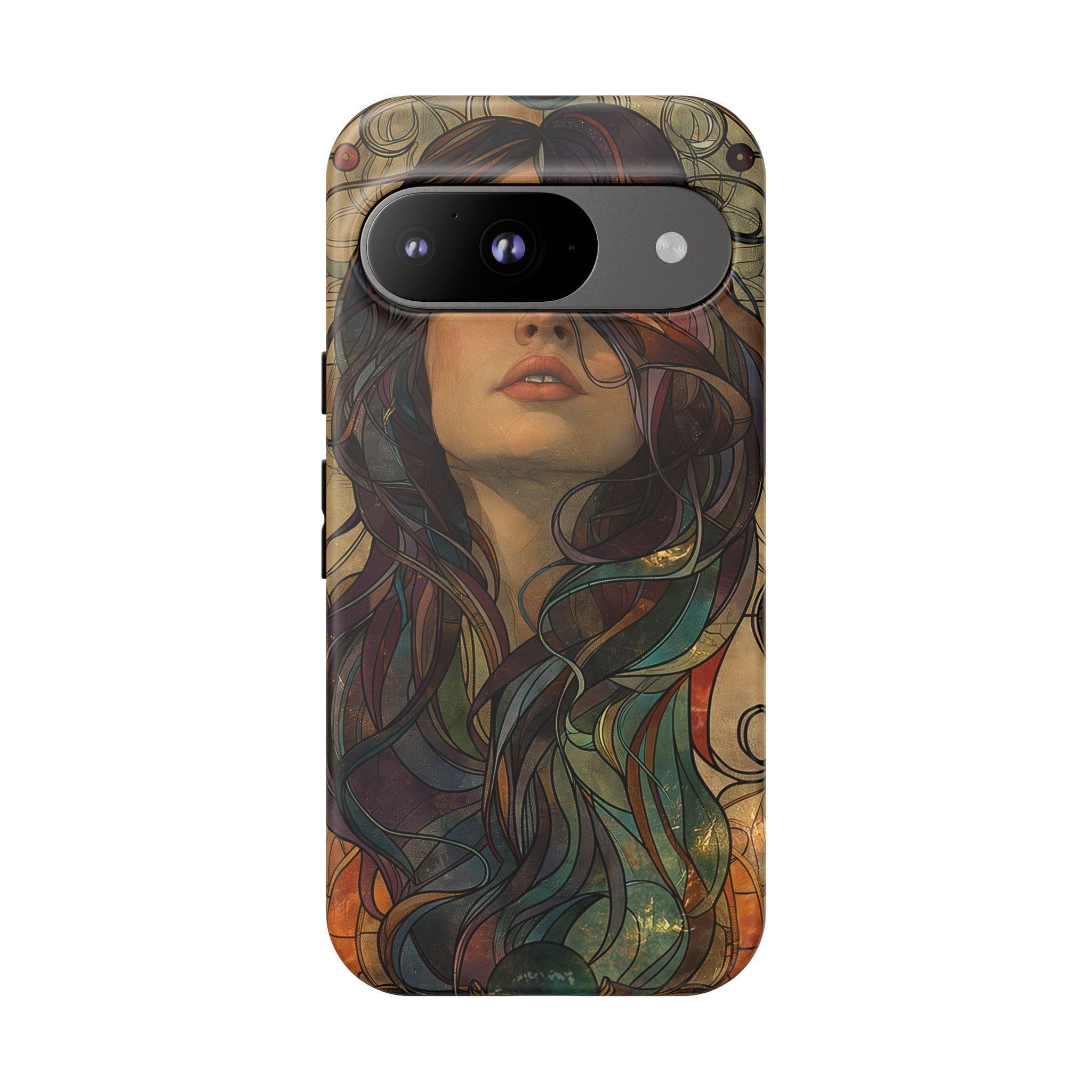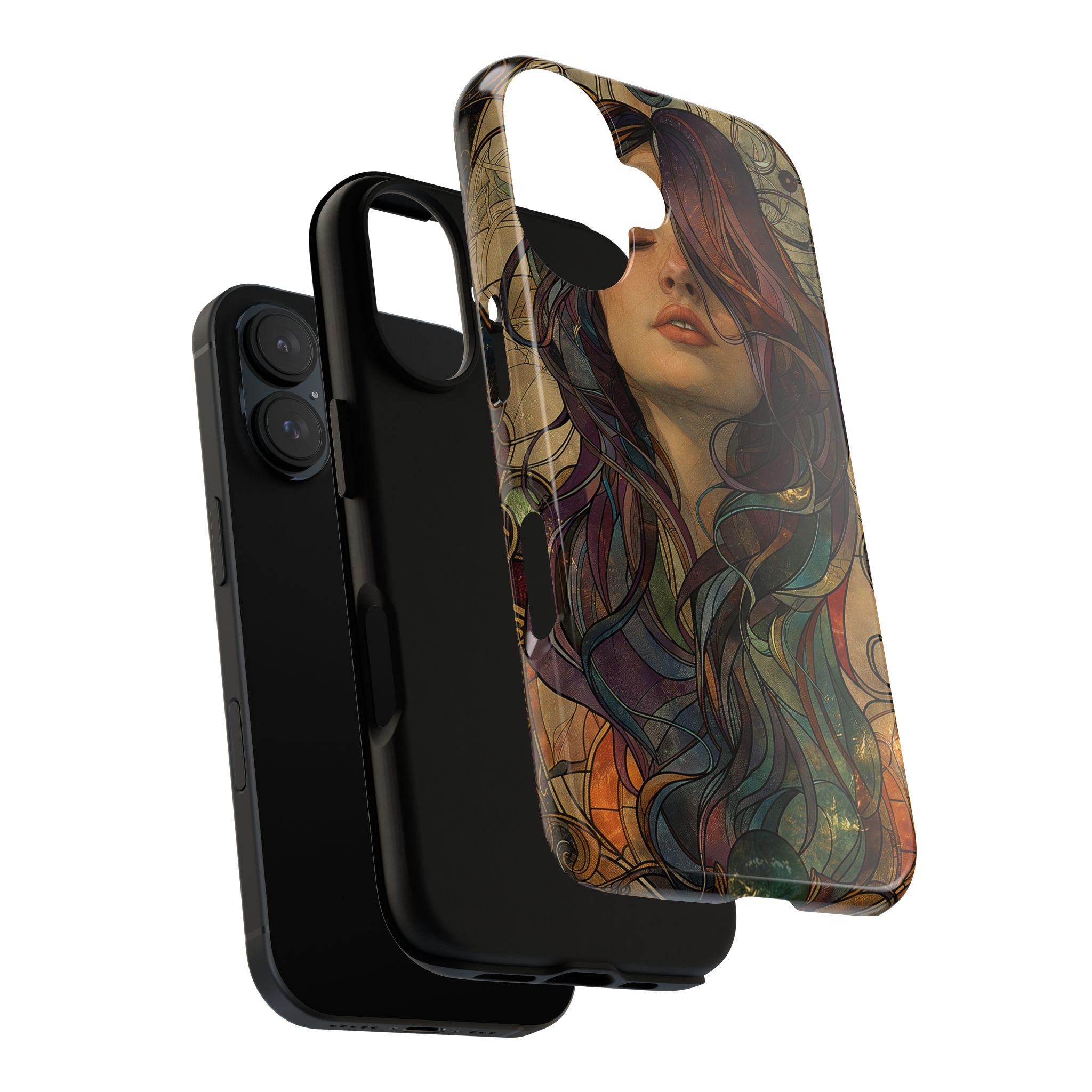 A protective phone case that feels like wearable art. The slim, dual-layer shell wraps a richly detailed portrait in full-color, edge-to-edge print — hair flowing in jewel-toned swirls against a warm, muted backdrop. It absorbs the little shocks of daily life while keeping the artwork vivid with UV-resistant inks. The soft TPU liner cushions drops and the rigid polycarbonate outer shell resists impacts and scratches. Open ports and wireless charging compatibility keep your phone fully functional, while the glossy or matte finish lets you choose the exact look you want. This case brings an artful, slightly vintage mood to everyday carry and holds up to regular use when handled with care.
