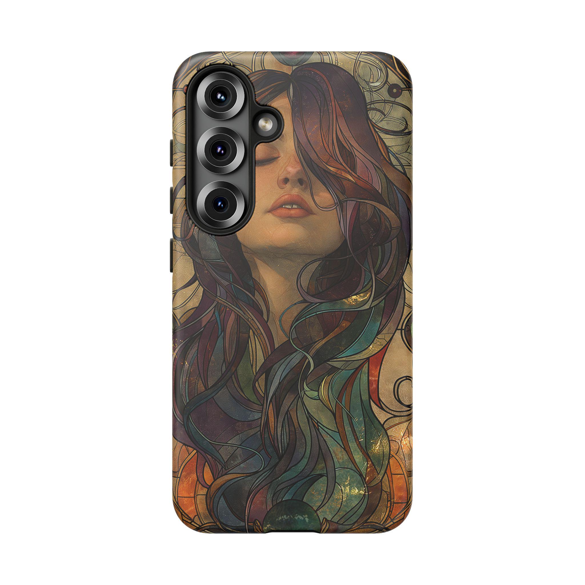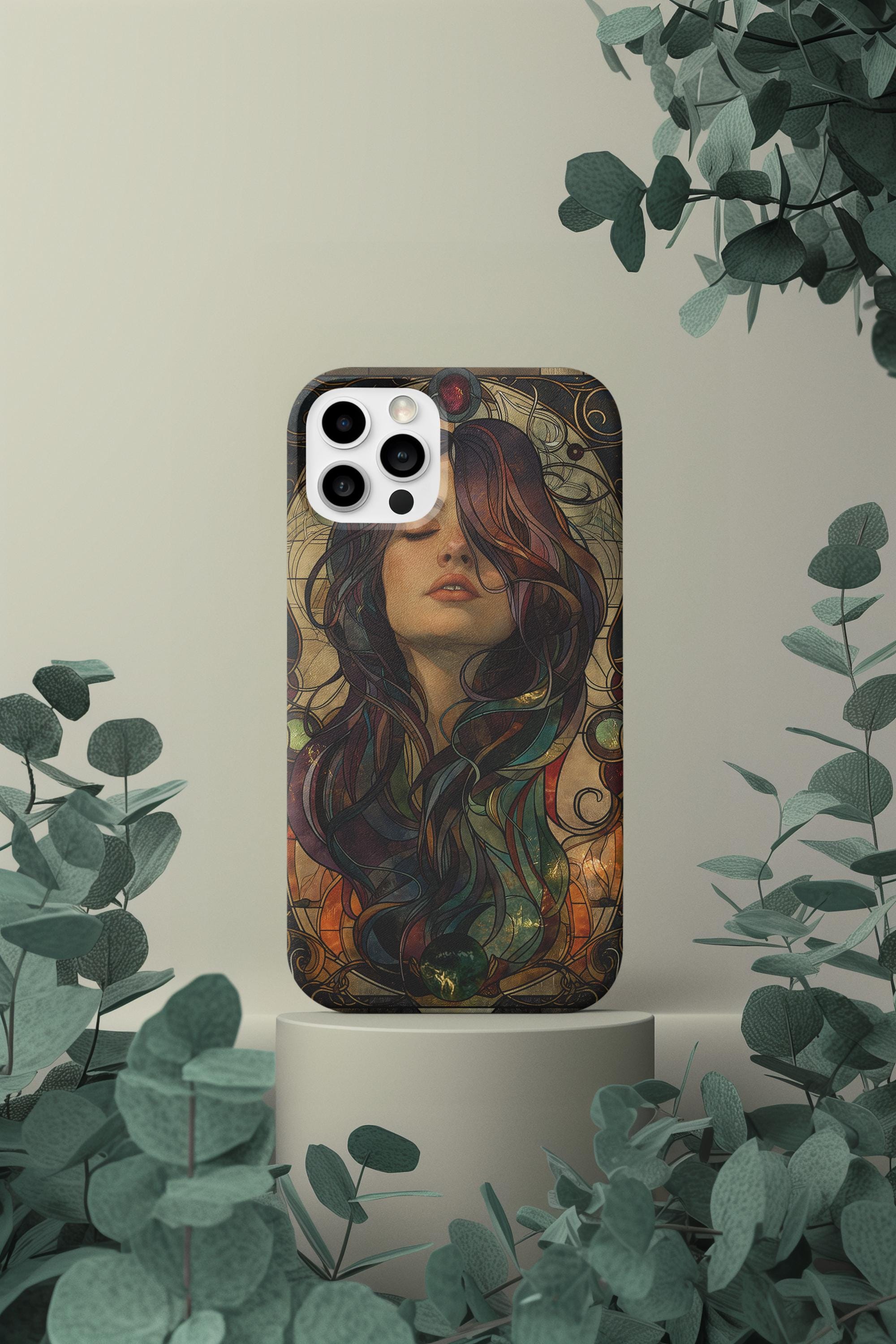 Featuring a dreamy feminine portrait with flowing hair, earthy jewel tones, and elegant ornamental linework, this design captures the timeless beauty of vintage art nouveau illustration. The muted greens, warm browns, and soft plum accents create a sophisticated and aesthetic phone case that feels both artistic and modern.