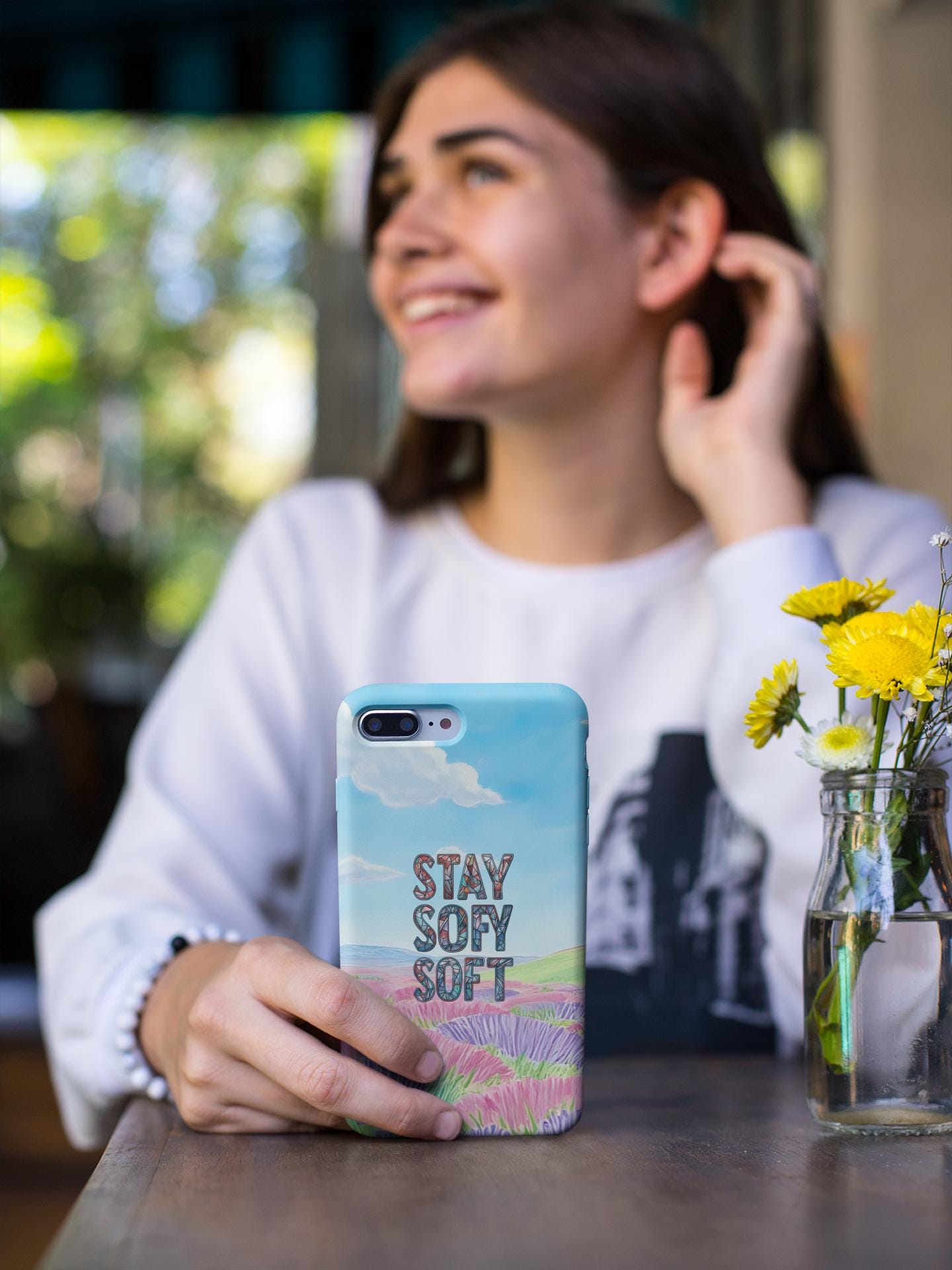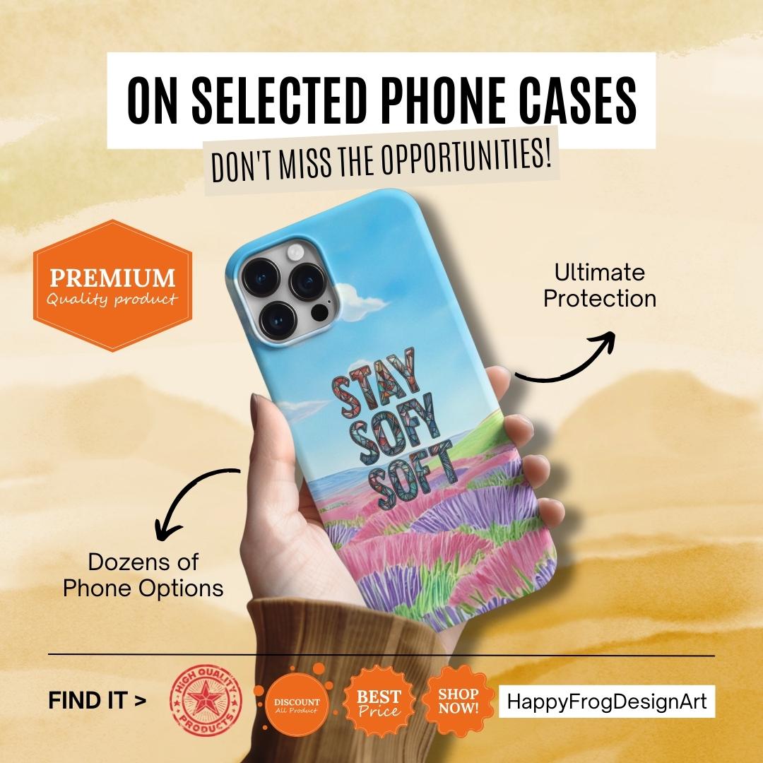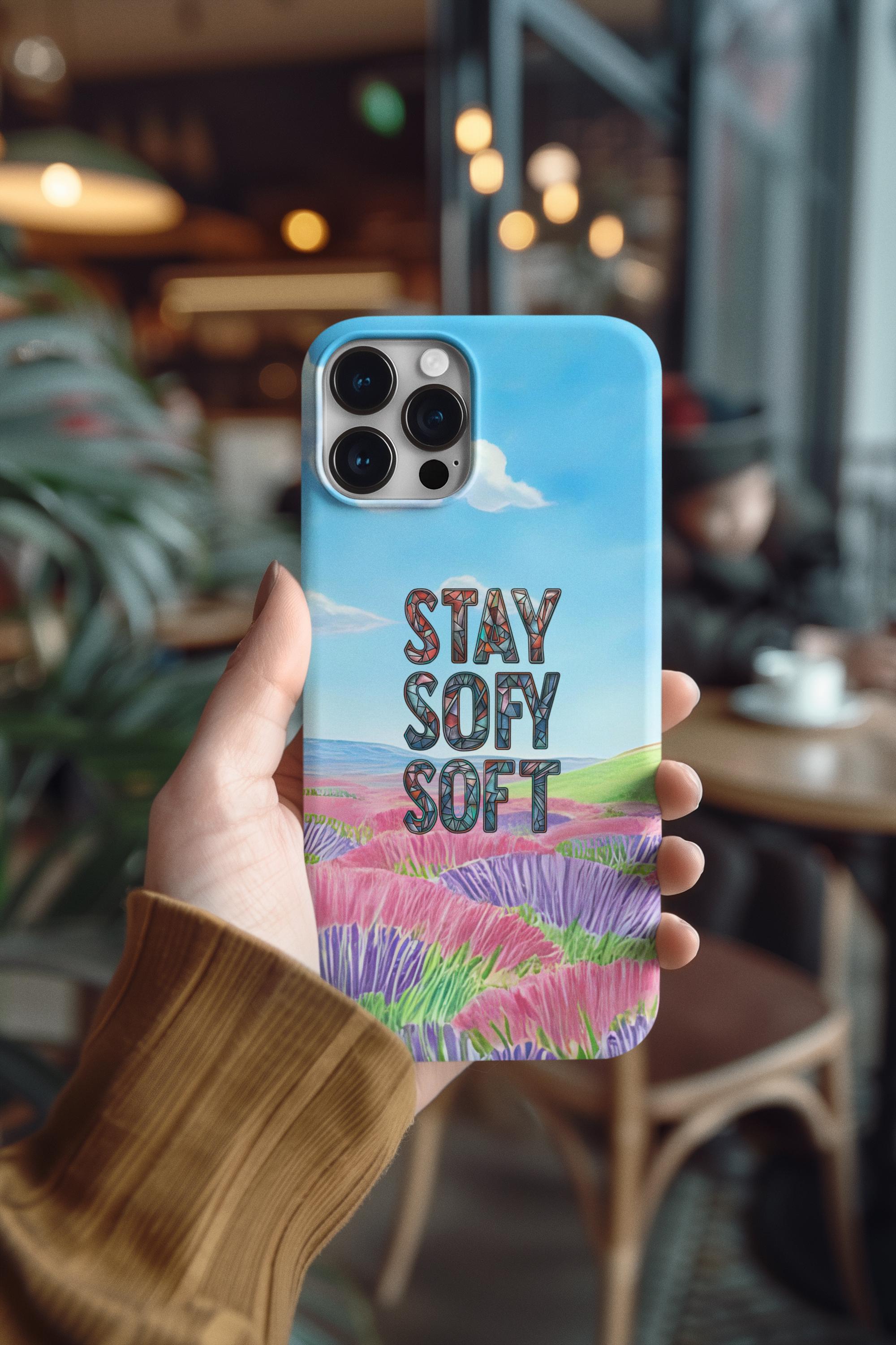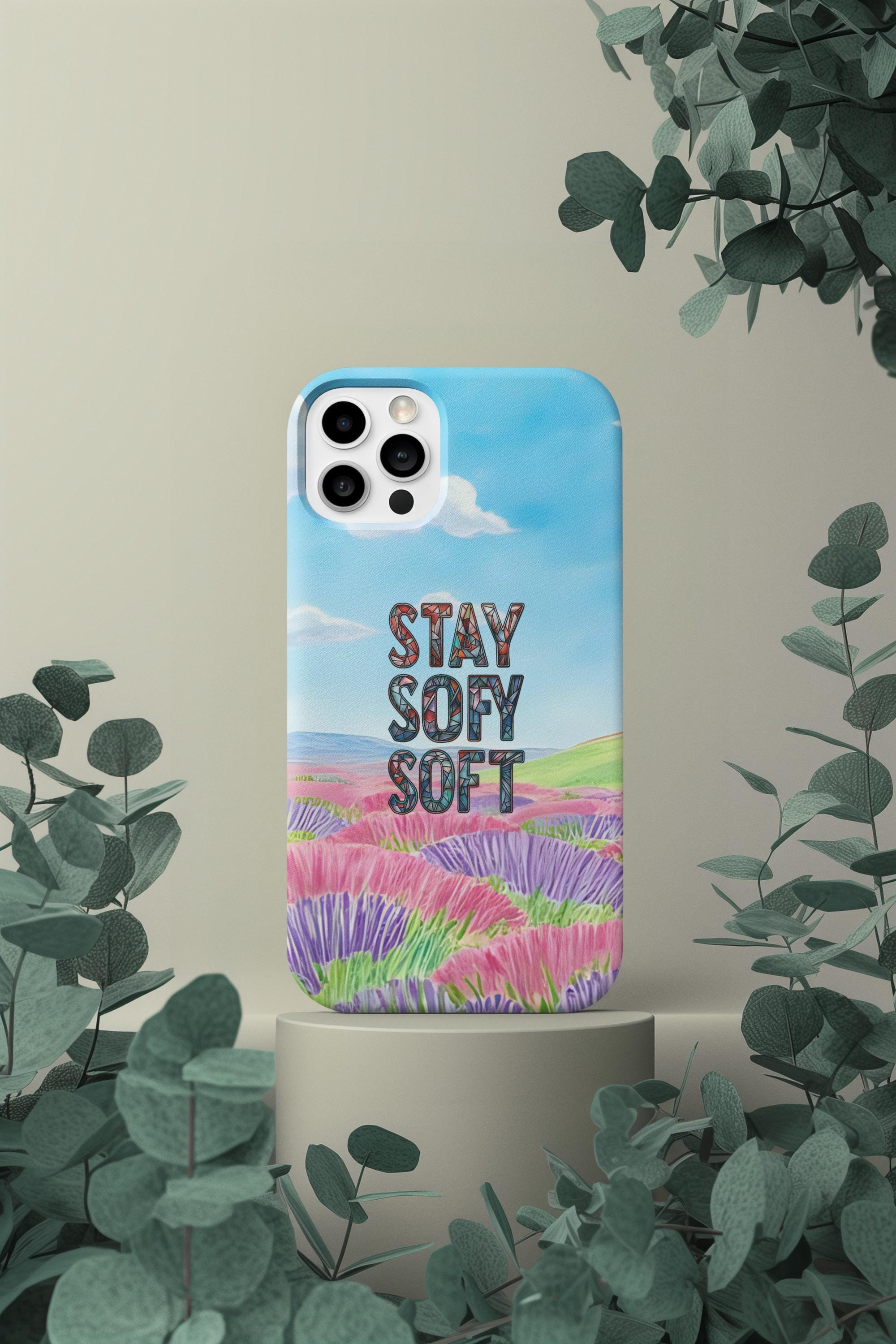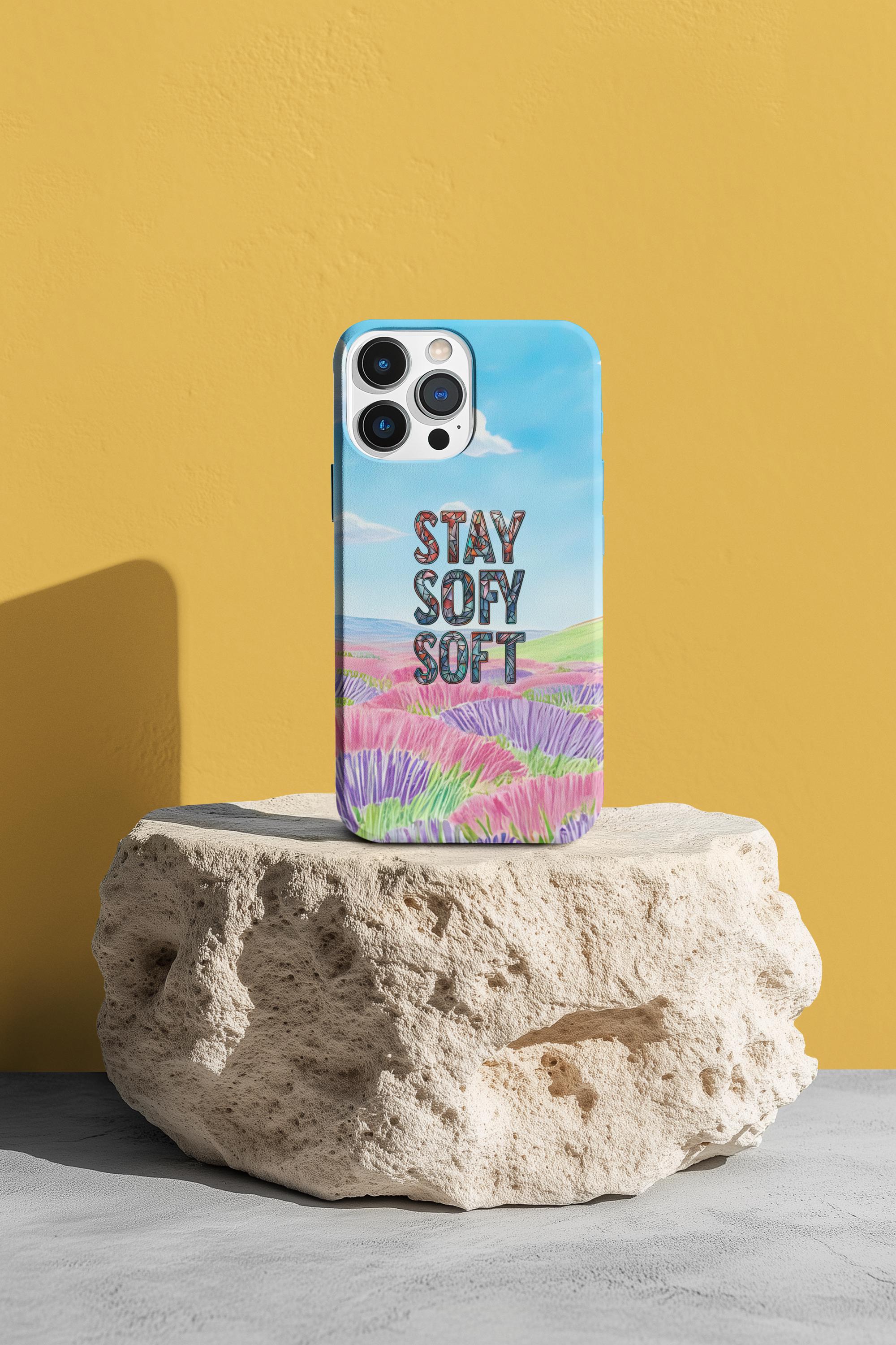 This phone case carries you into a lavender field at dusk, the sky threaded with soft, cottony clouds. The artwork wraps edge-to-edge, turning your device into a tiny handheld canvas. At the center, the phrase “STAY SOFY SOFT” is rendered as an illustrated statement: each letter filled with delicate floral patterns that pick up the purple and pastel tones of the background, so the text feels grown from the scene rather than pasted on it. The finish options—glossy or matte—let you choose the subtle sheen that matches your style, while the dual-layer construction and TPU liner quietly shoulder everyday bumps and drops. Lightweight but protective, it stays in your hand like a familiar talisman for calm mornings, lavender walks, and slow, soft moments.