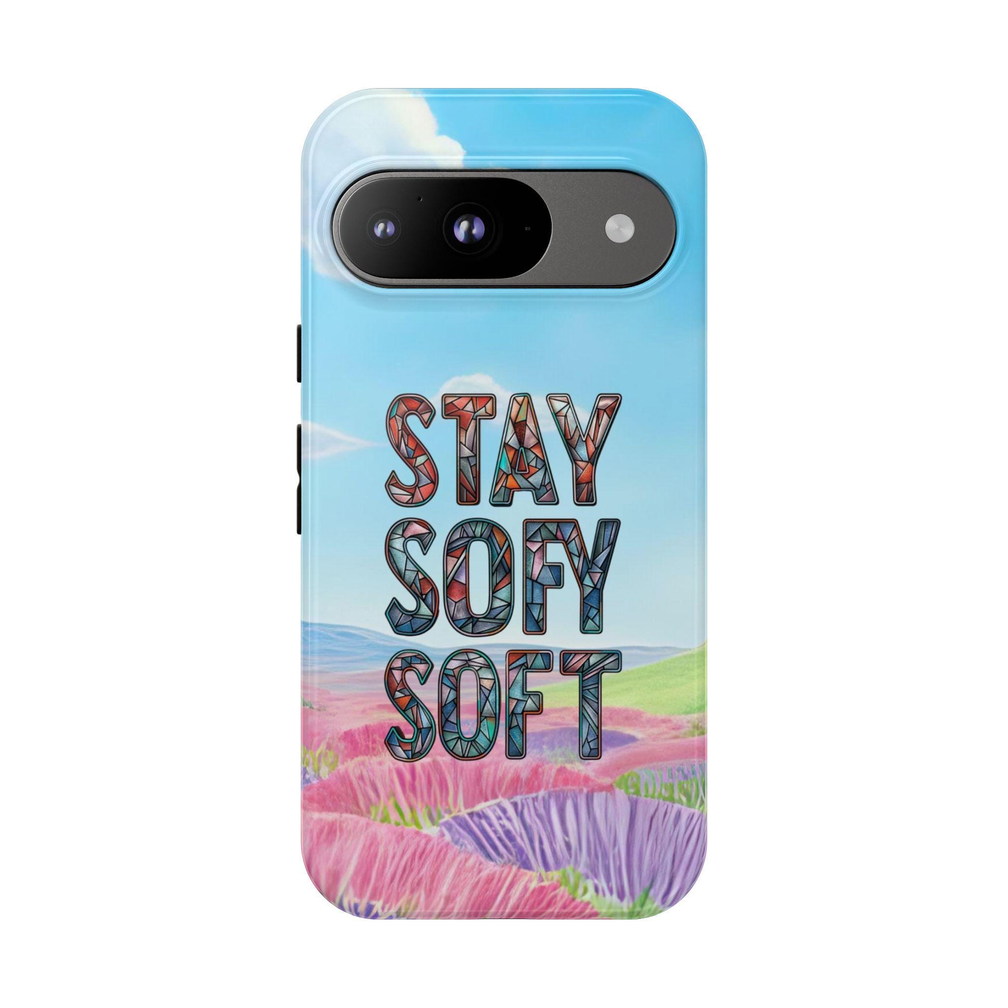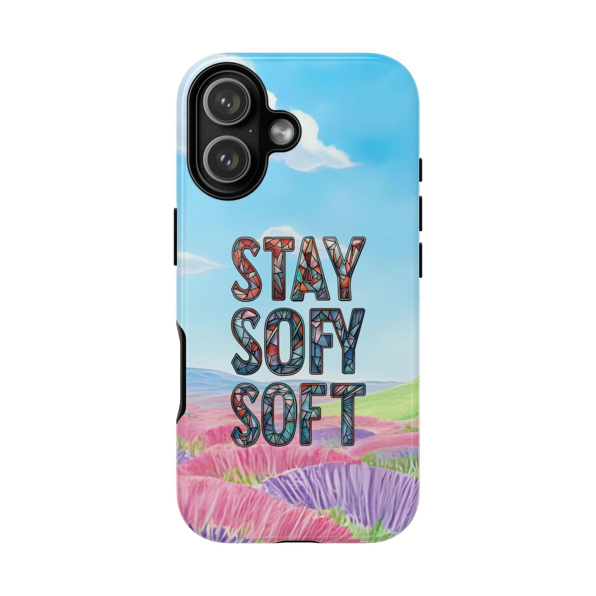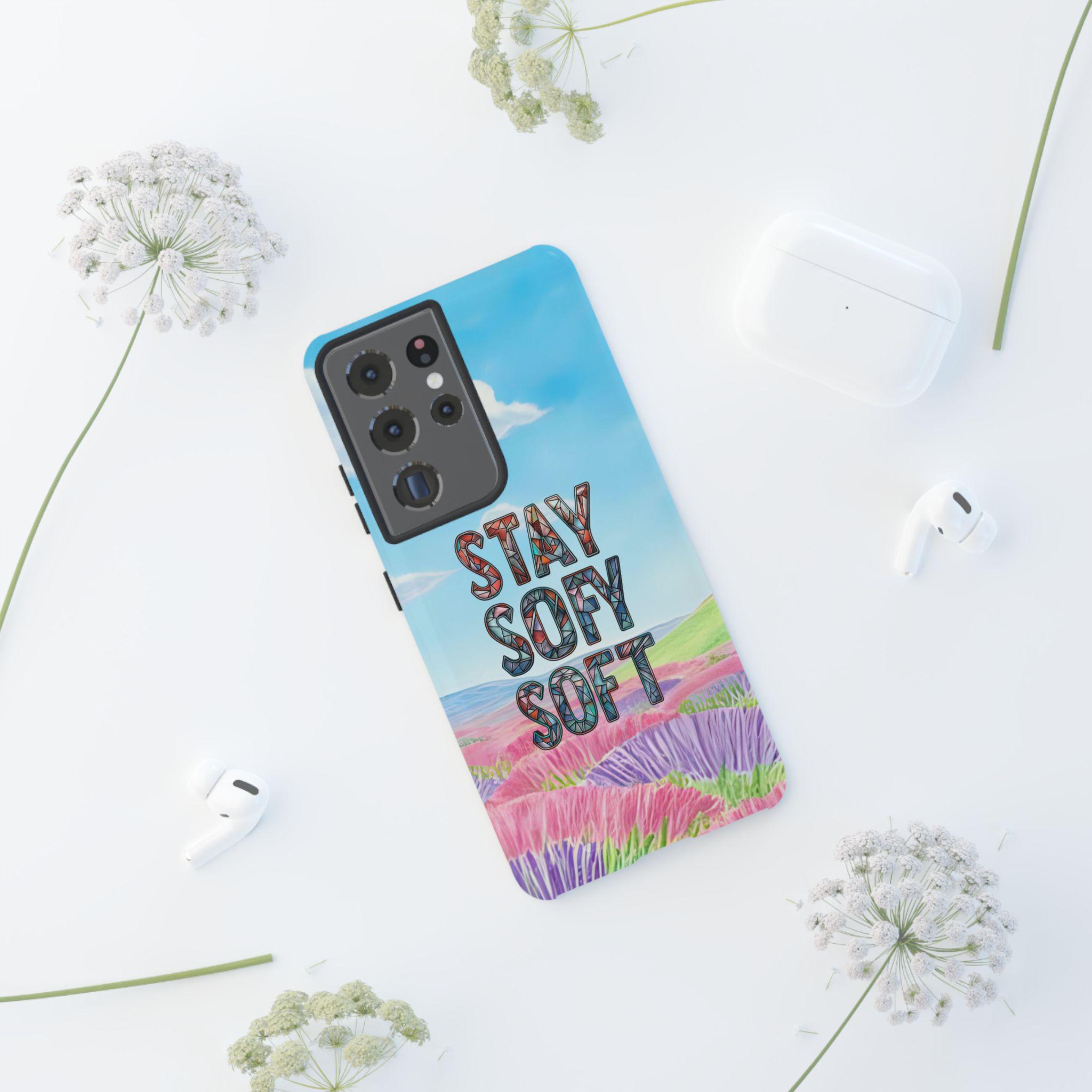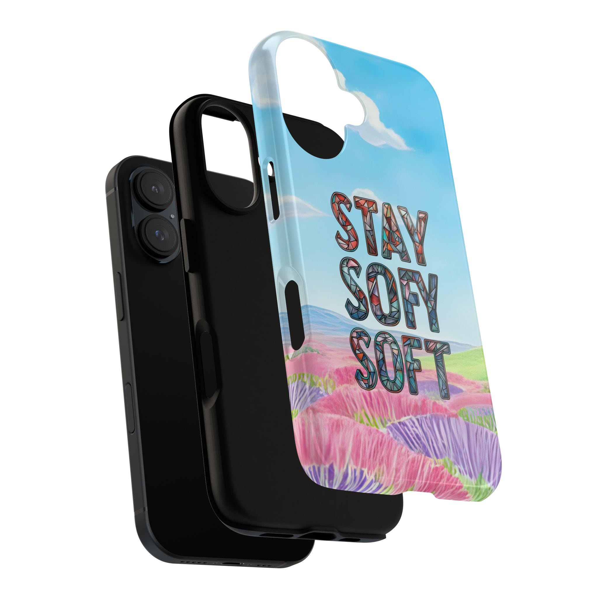 This phone case carries you into a lavender field at dusk, the sky threaded with soft, cottony clouds. The artwork wraps edge-to-edge, turning your device into a tiny handheld canvas. At the center, the phrase “STAY SOFY SOFT” is rendered as an illustrated statement: each letter filled with delicate floral patterns that pick up the purple and pastel tones of the background, so the text feels grown from the scene rather than pasted on it. The finish options—glossy or matte—let you choose the subtle sheen that matches your style, while the dual-layer construction and TPU liner quietly shoulder everyday bumps and drops. Lightweight but protective, it stays in your hand like a familiar talisman for calm mornings, lavender walks, and slow, soft moments.