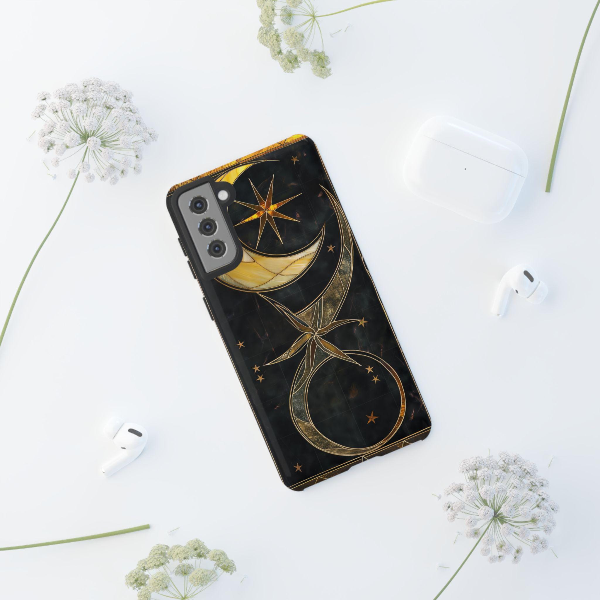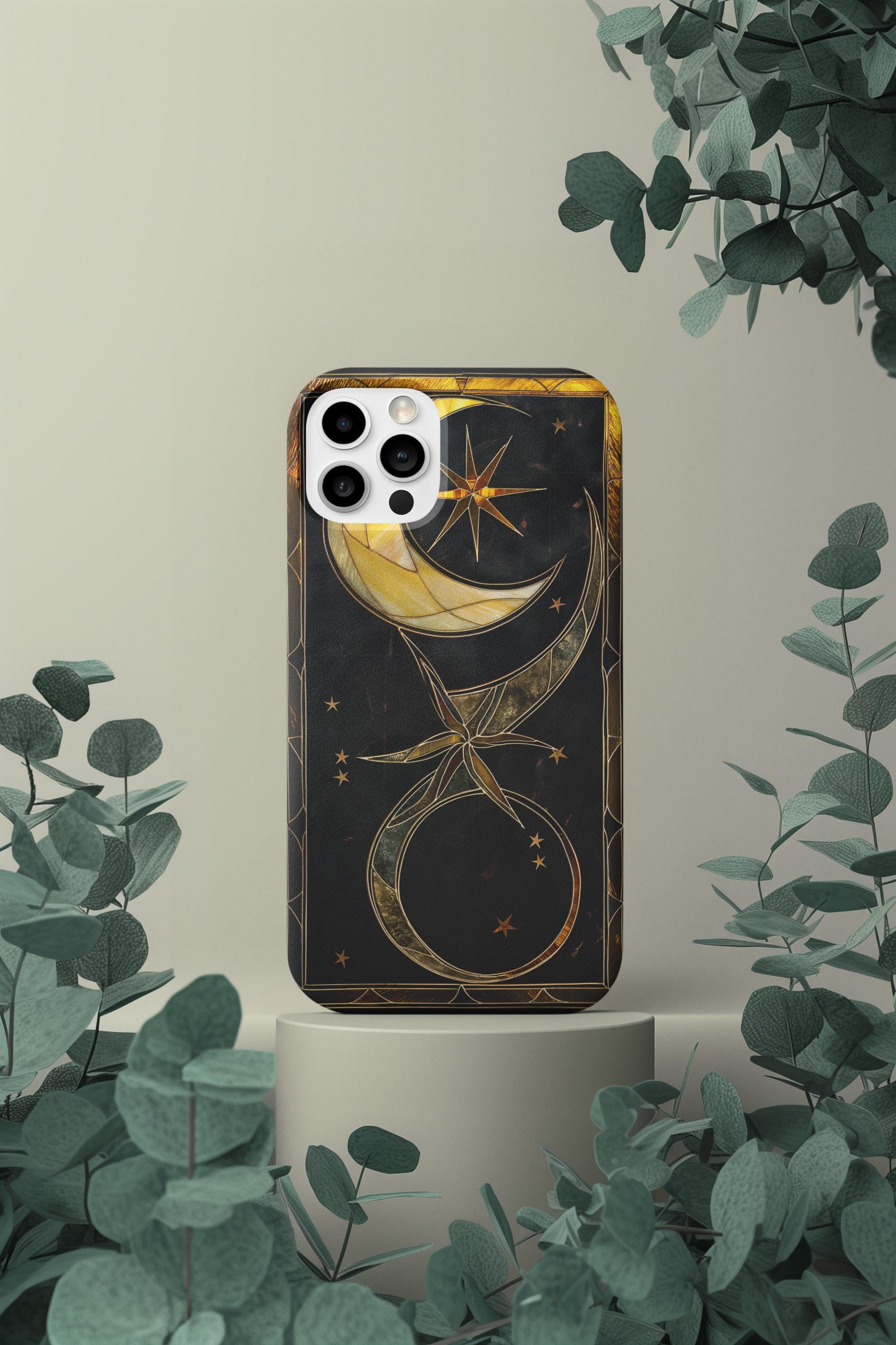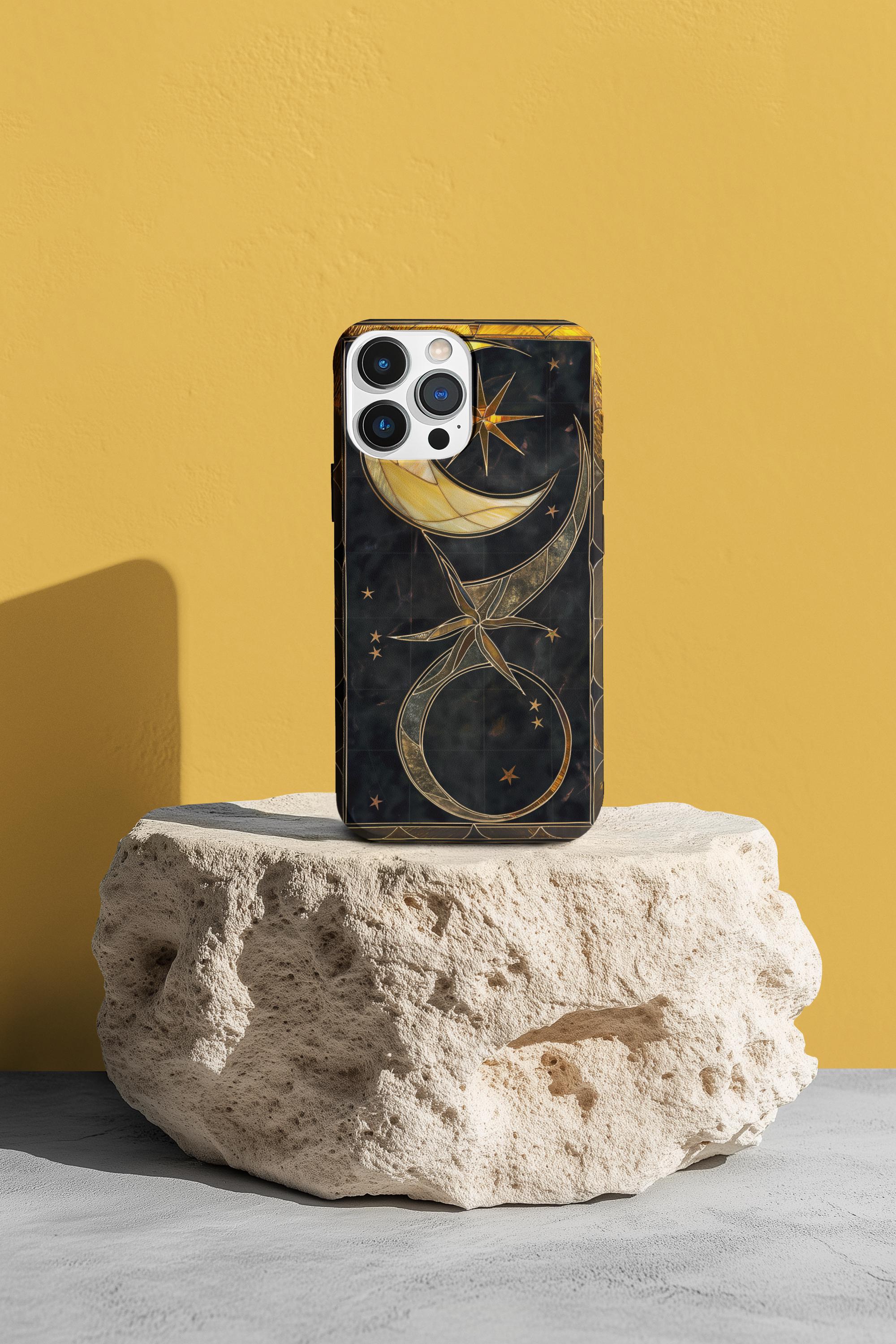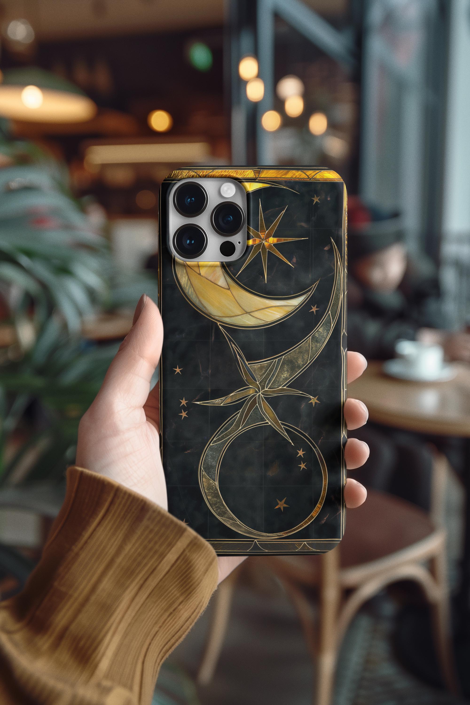 Moonlit and gilded, this phone case feels like holding a small stained-glass window to the night sky. Crescent moons and radiant stars arc across a deep midnight field, traced in luminous gold lines that catch light like filigree. The sculpted 3D effect gives the artwork depth—rich, tactile, and quietly luxurious—so each glance down at your screen becomes a moment of calm and wonder. Designed for people who love celestial style and crafted protection, it slips on easily, cushions impacts, and keeps that midnight glow looking fresh through daily life and evening outings.