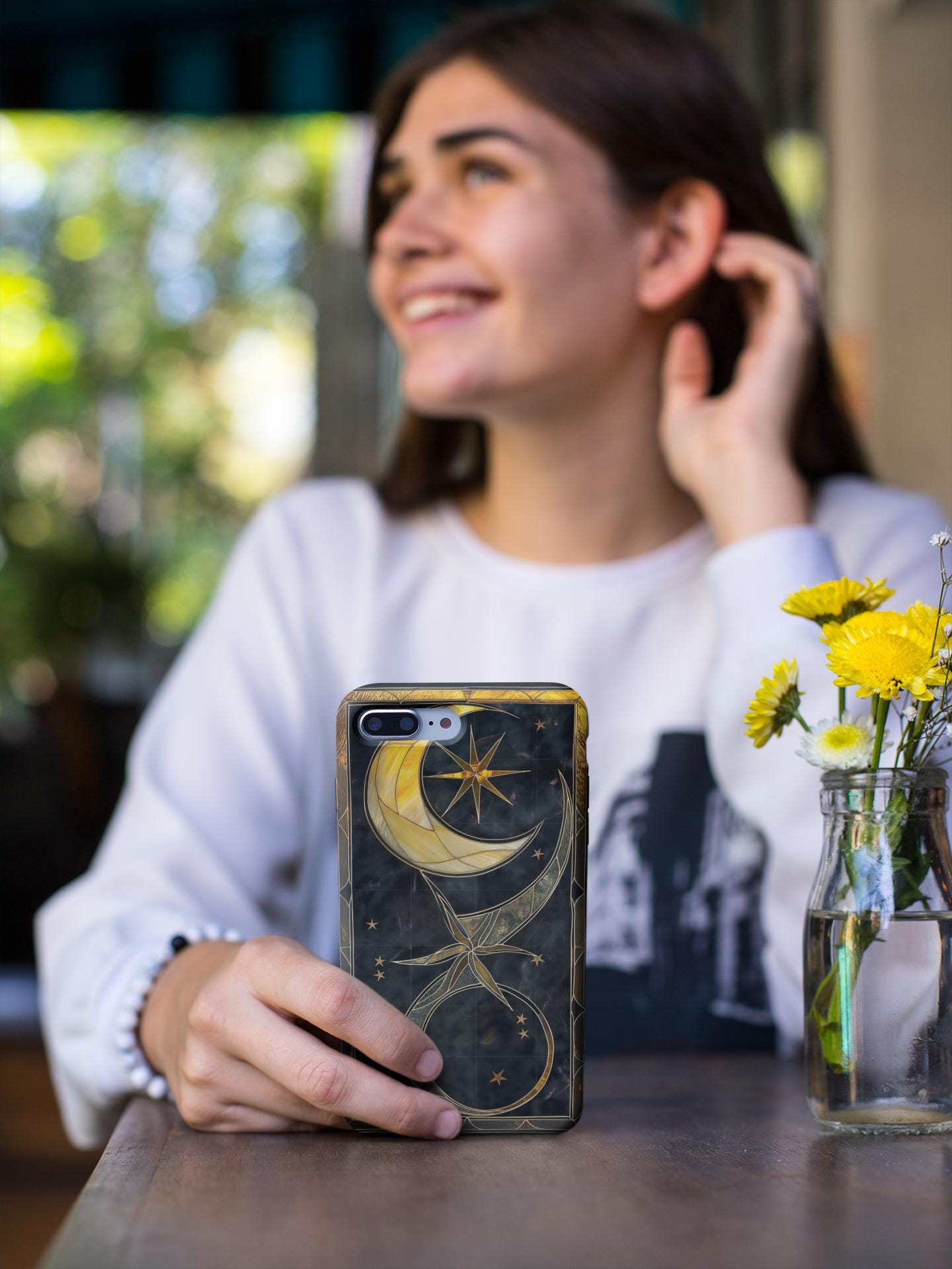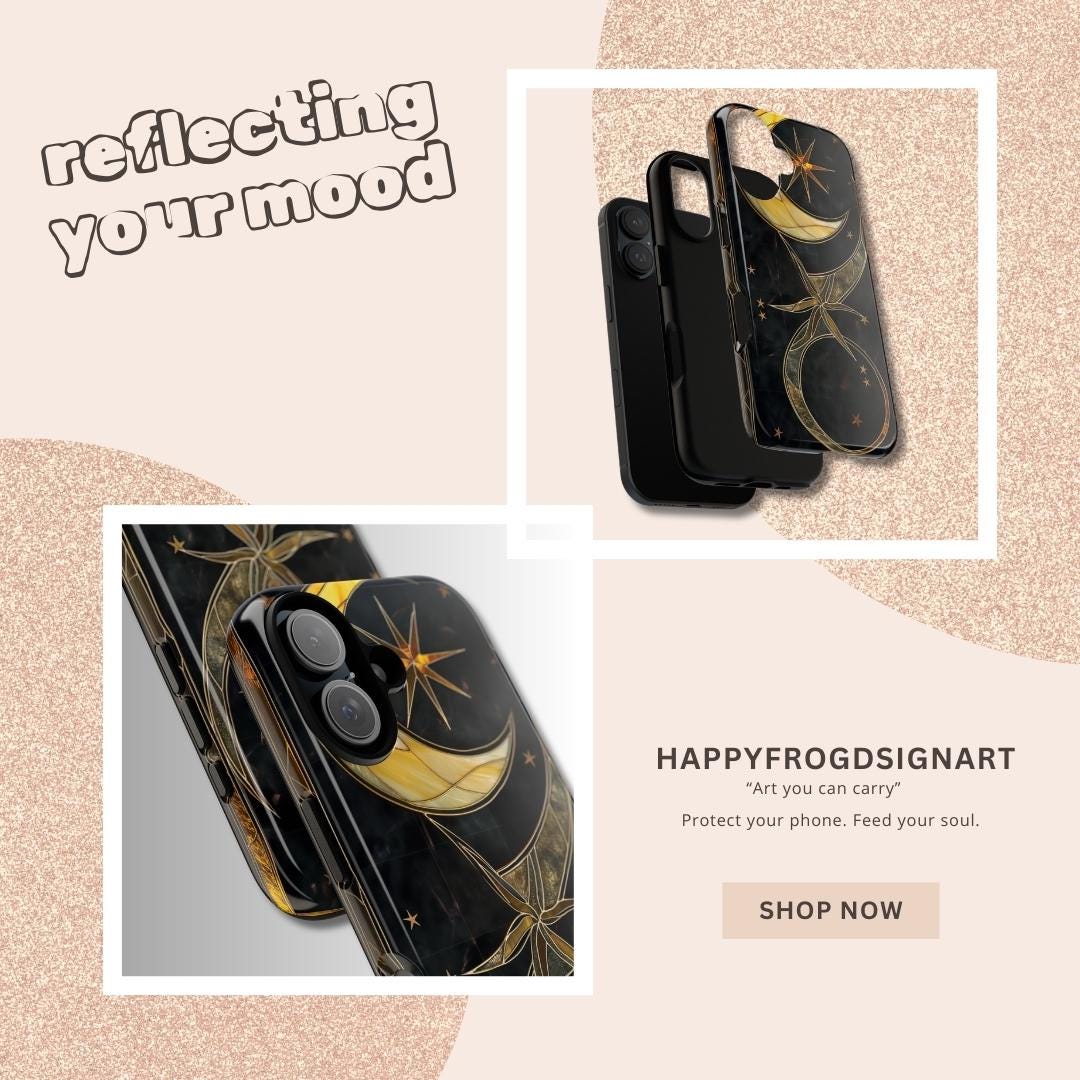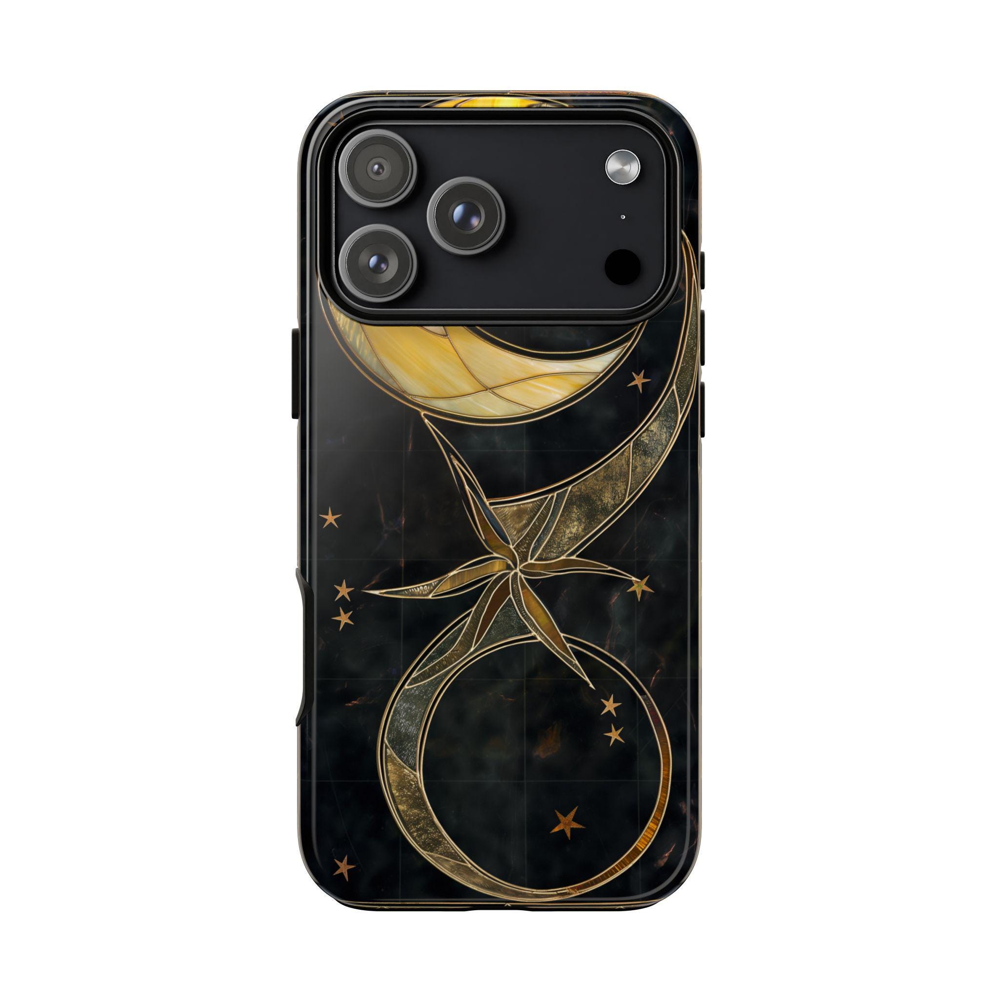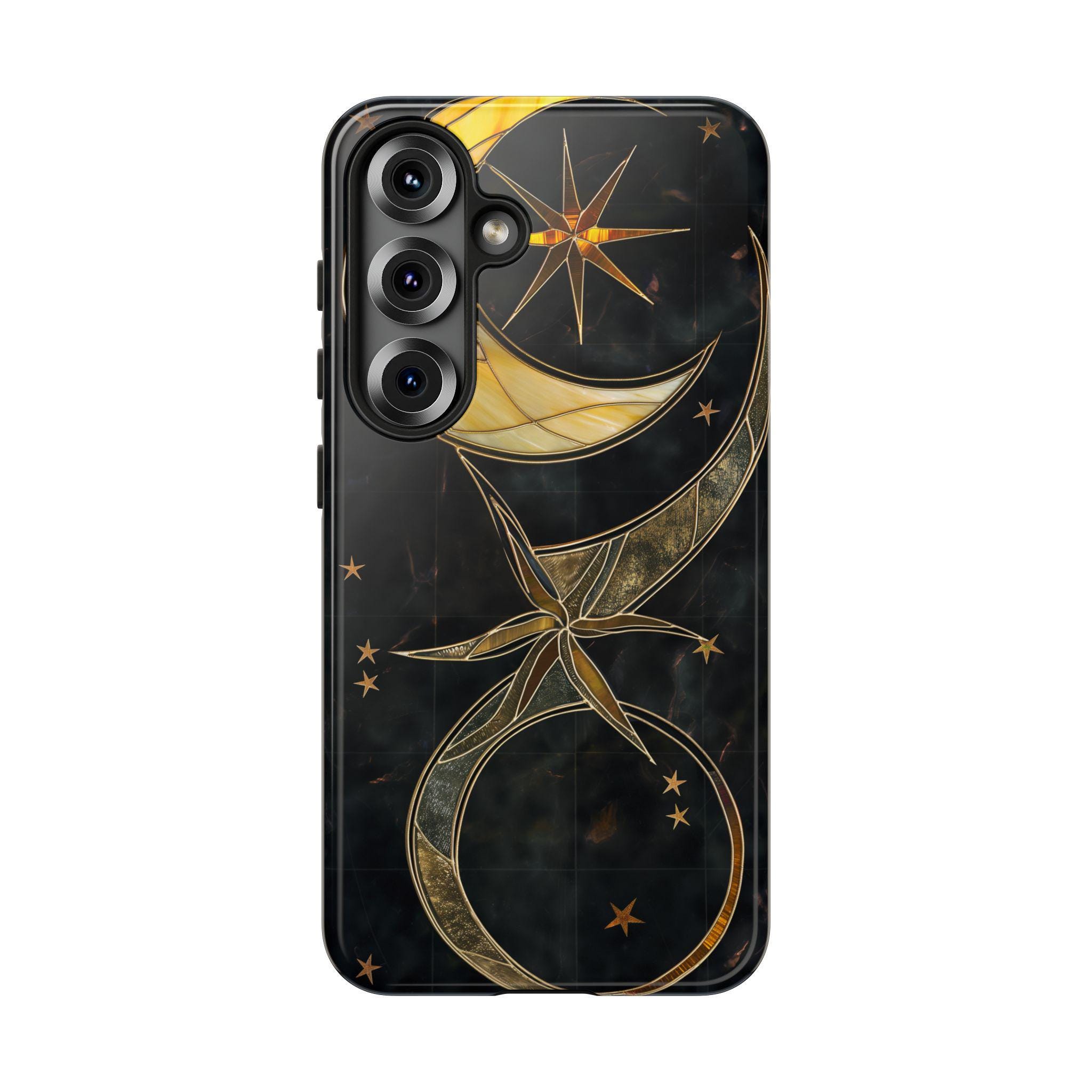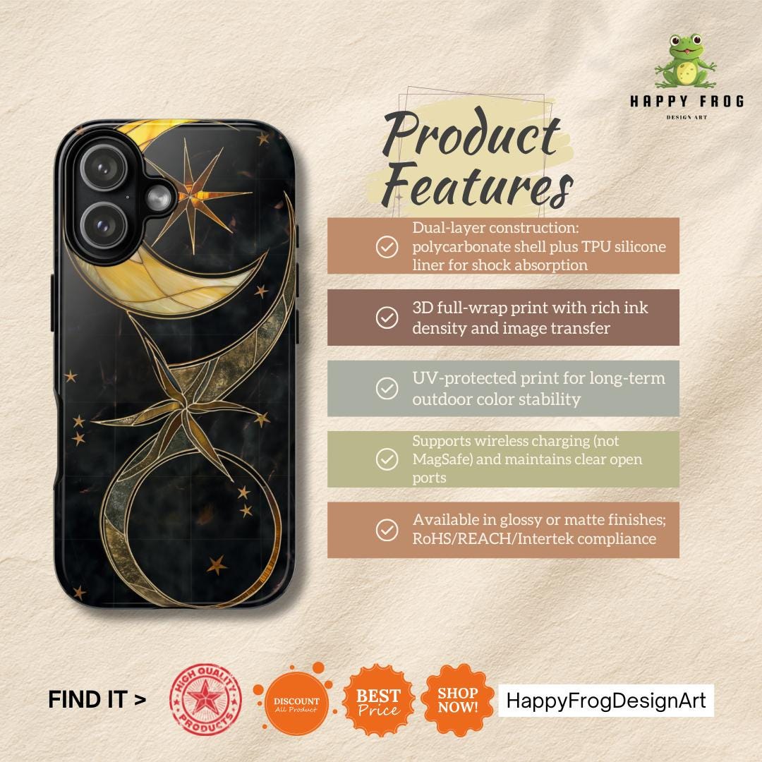 Moonlit and gilded, this phone case feels like holding a small stained-glass window to the night sky. Crescent moons and radiant stars arc across a deep midnight field, traced in luminous gold lines that catch light like filigree. The sculpted 3D effect gives the artwork depth—rich, tactile, and quietly luxurious—so each glance down at your screen becomes a moment of calm and wonder. Designed for people who love celestial style and crafted protection, it slips on easily, cushions impacts, and keeps that midnight glow looking fresh through daily life and evening outings.