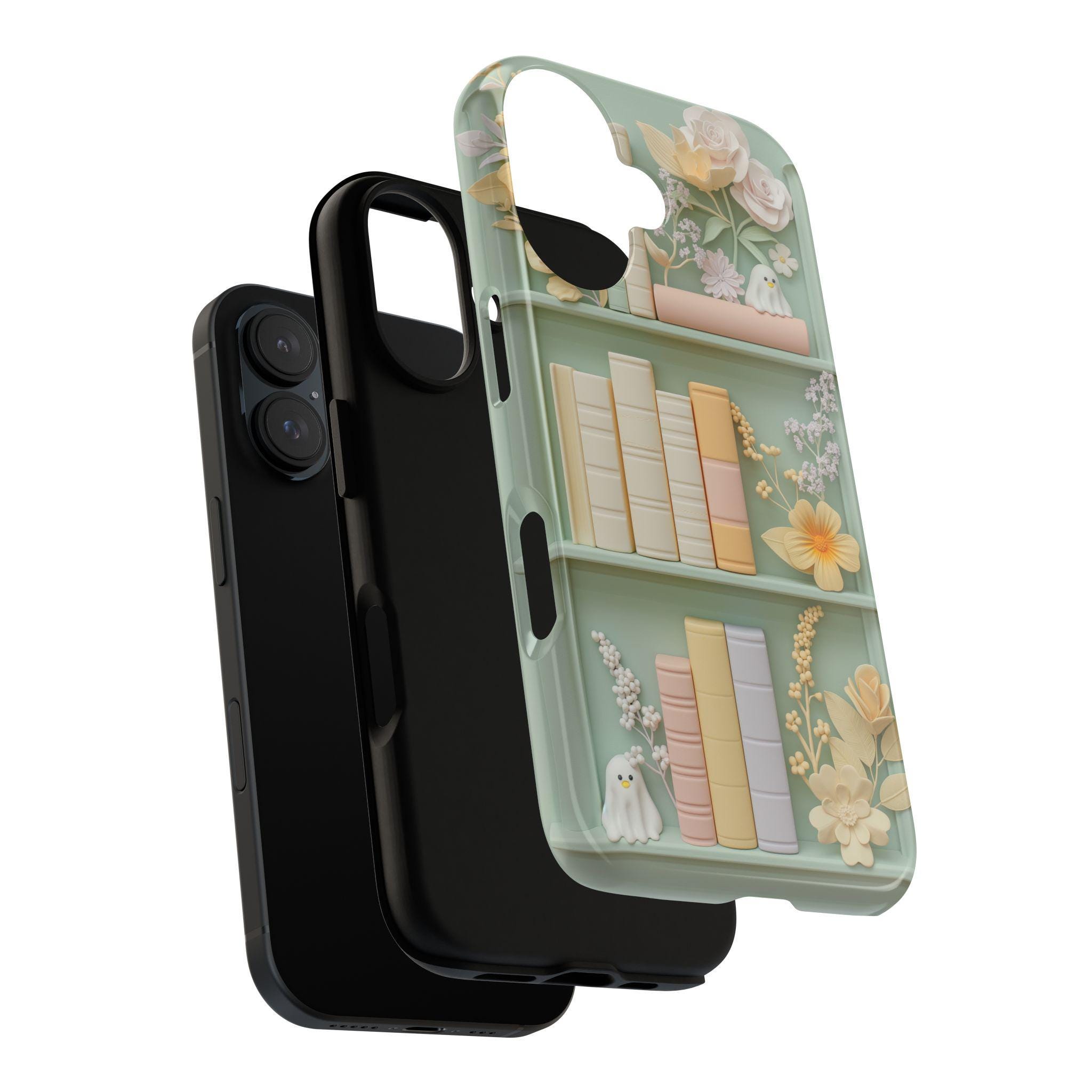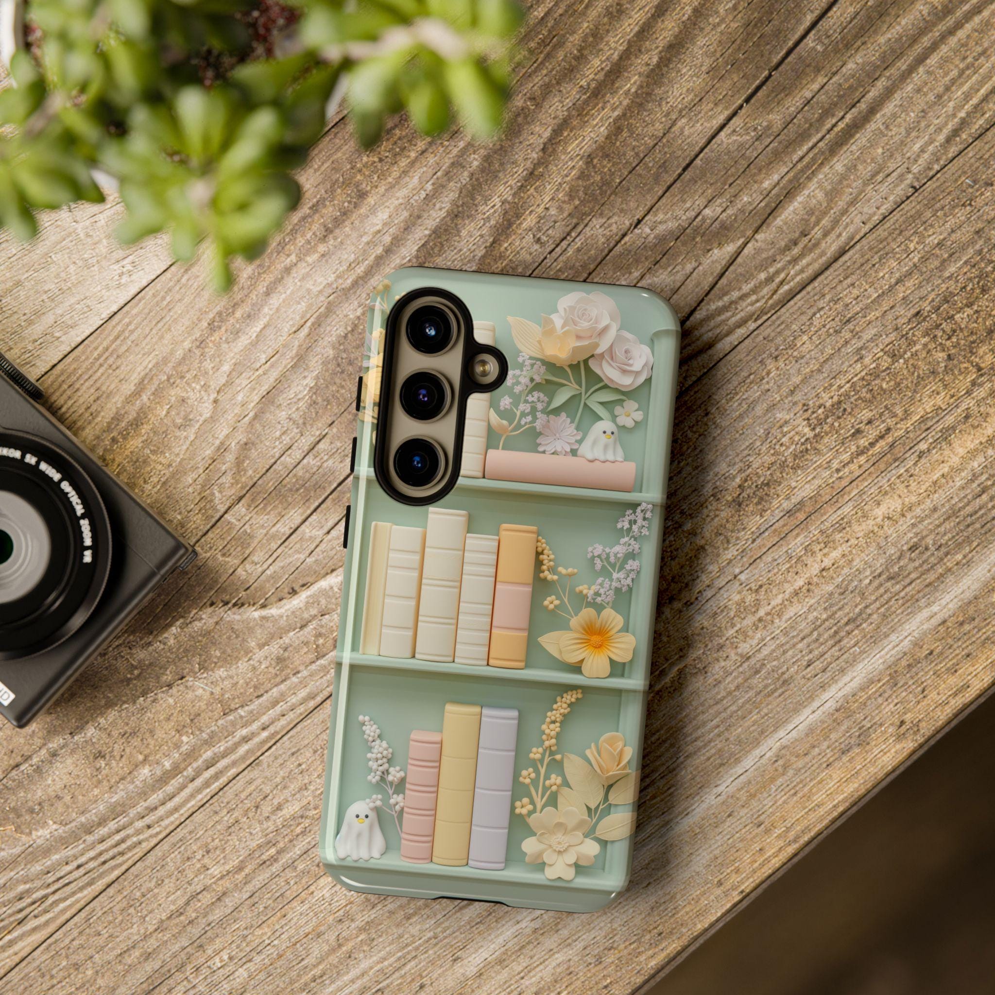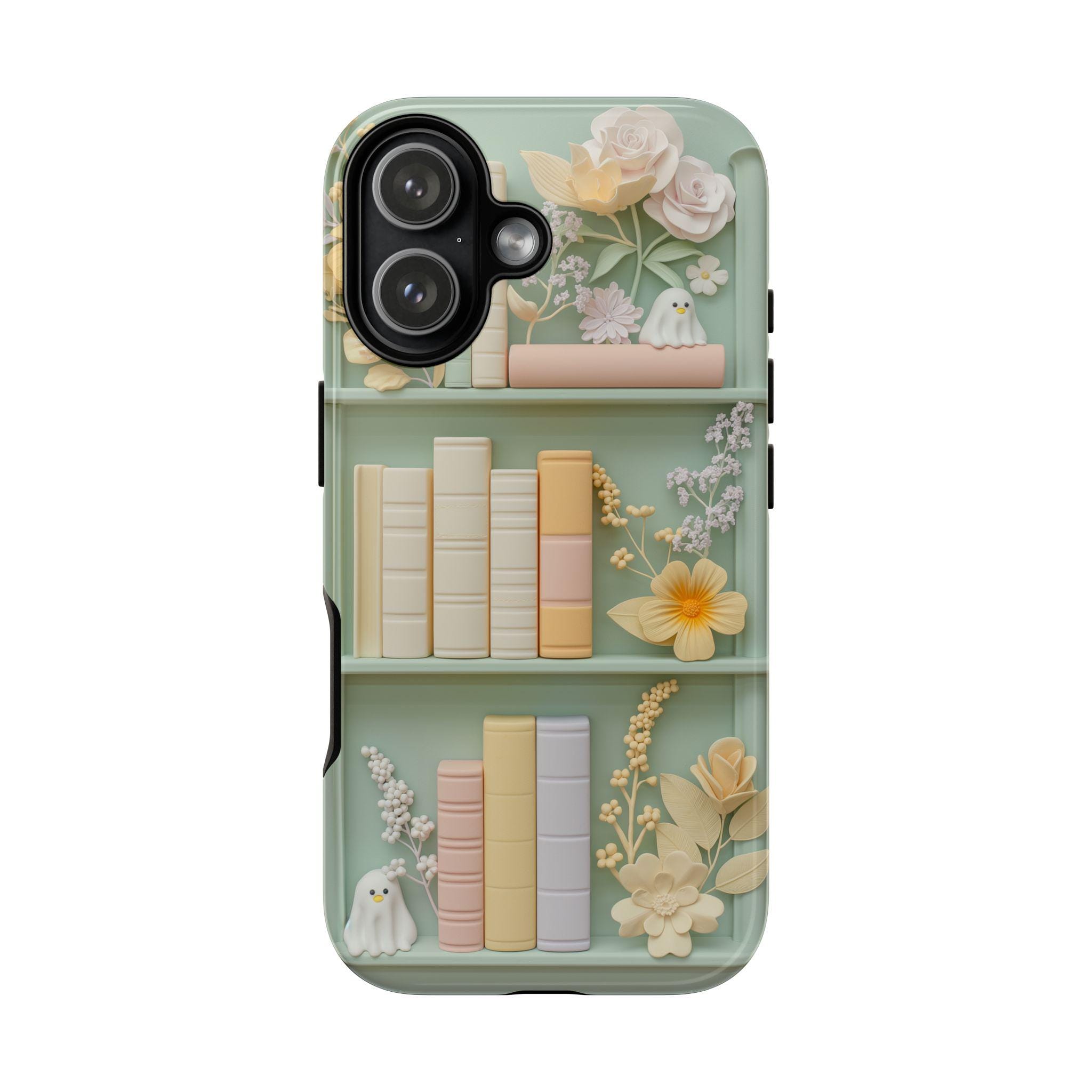 Pastel Claymorphism Books & Ghosts Tough Cases | Minimalist Floral Bookshelf