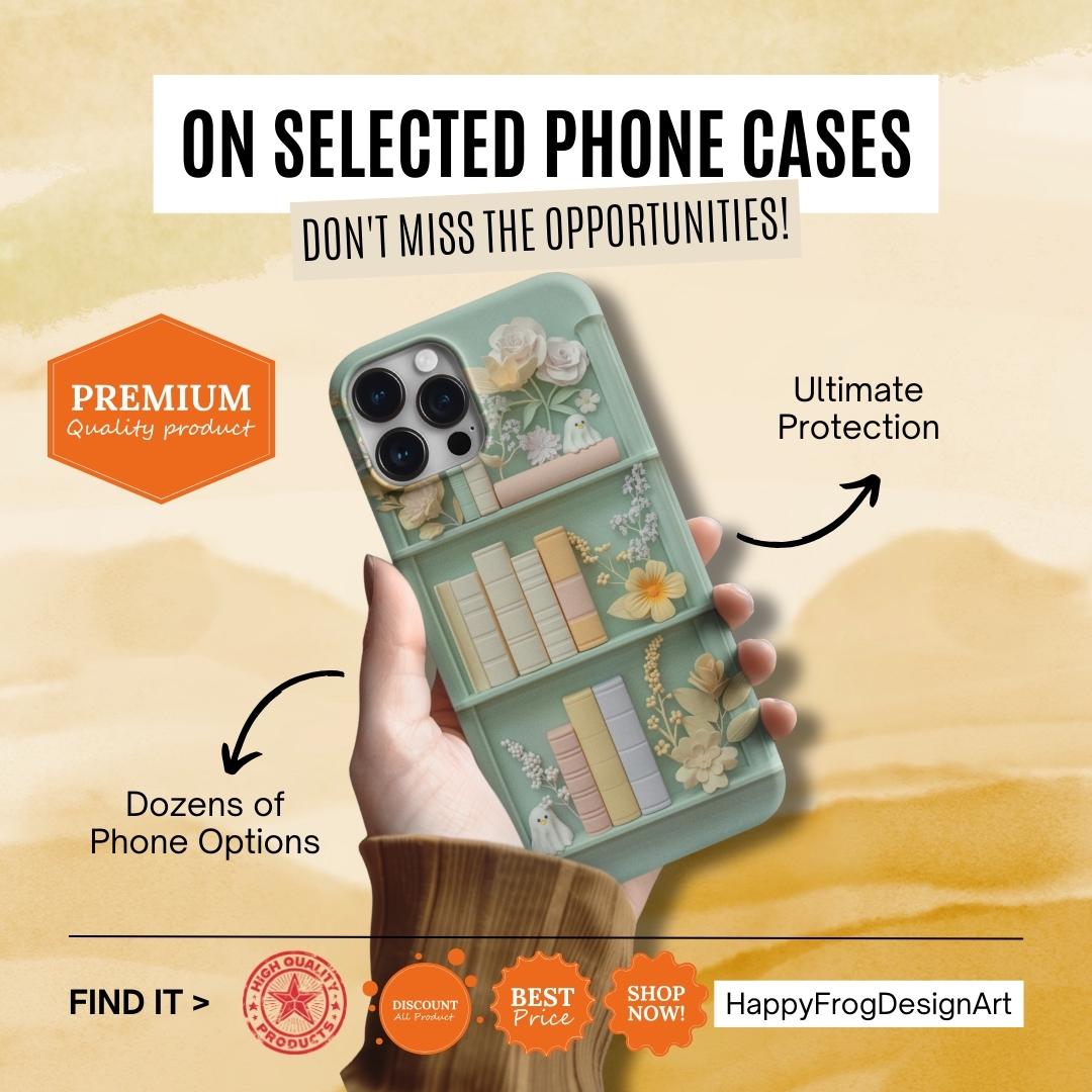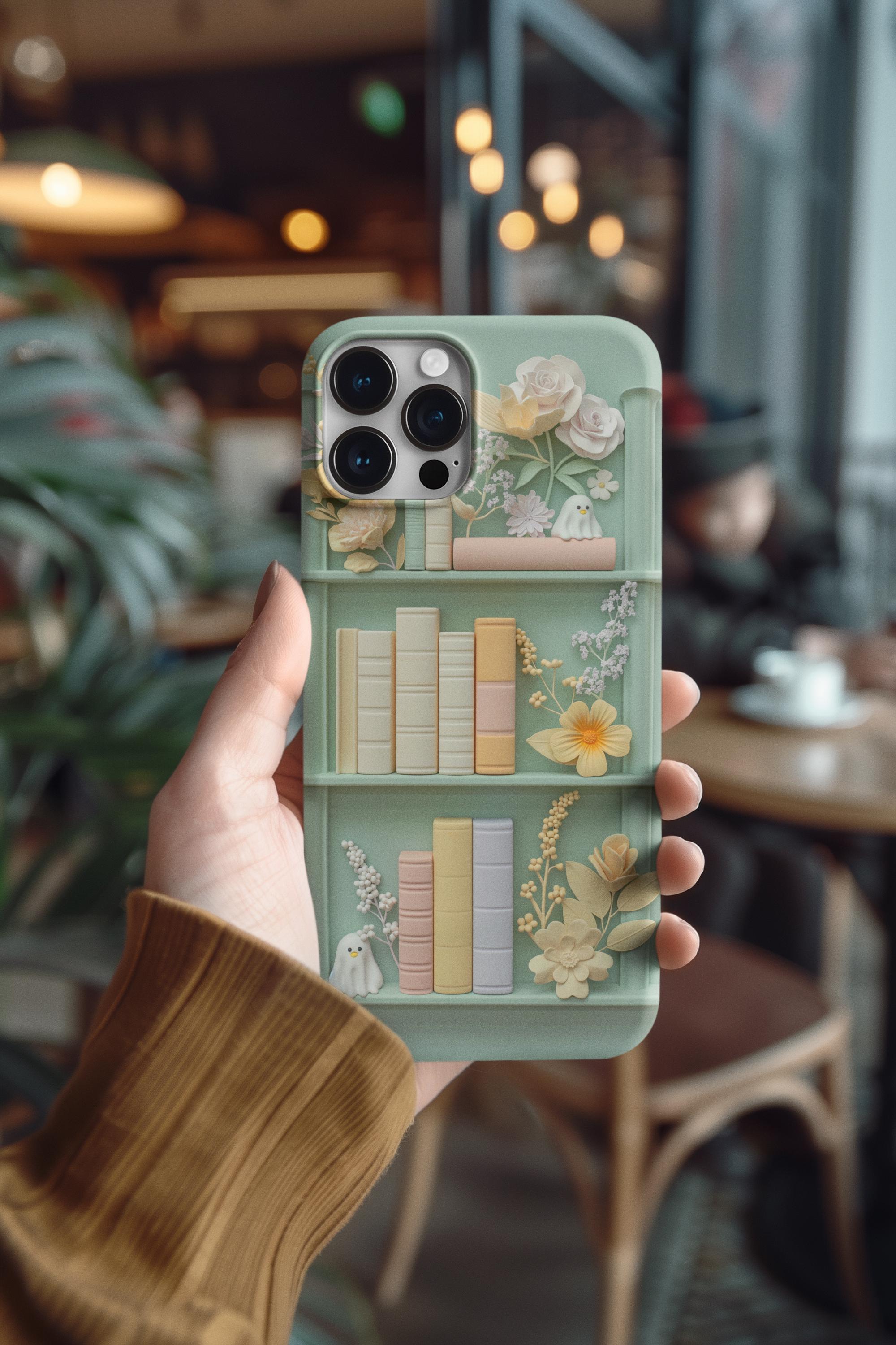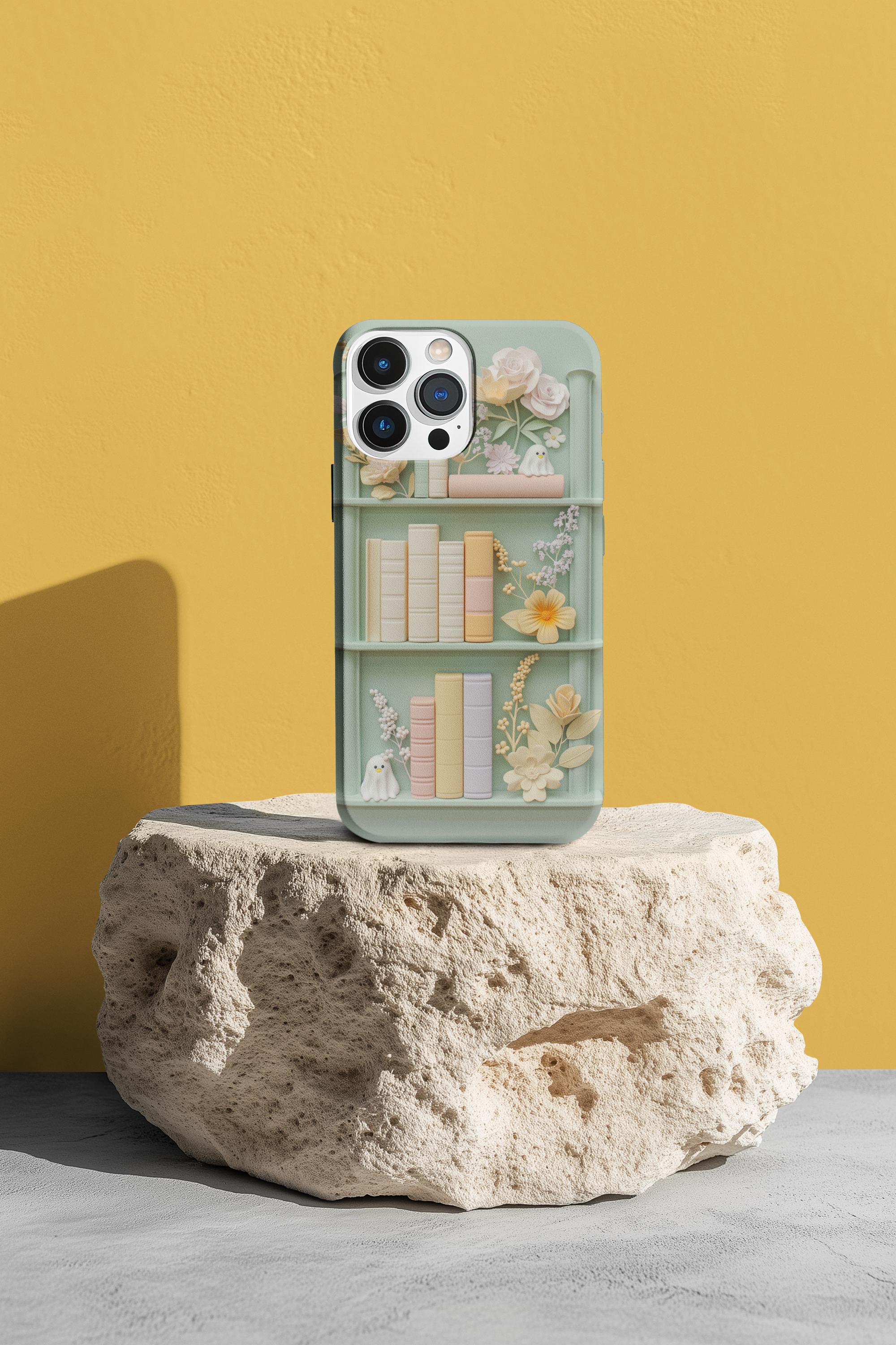This phone case brings a calm, bookish corner into your daily carry. Soft pastel tones and a claymorphism aesthetic give the design gentle, rounded depth — tiny ghosts peek from between stacked books while delicate blooms settle on the shelves. It reads like a quiet afternoon: warm light on paper, the hush of pages turning. For someone who treasures small, thoughtful details and quiet moments, this case turns your device into a little portable vignette that feels both modern and tender. The muted palette and minimalist shapes keep it subtle on the outside, while the layered 3D feel rewards a closer look.