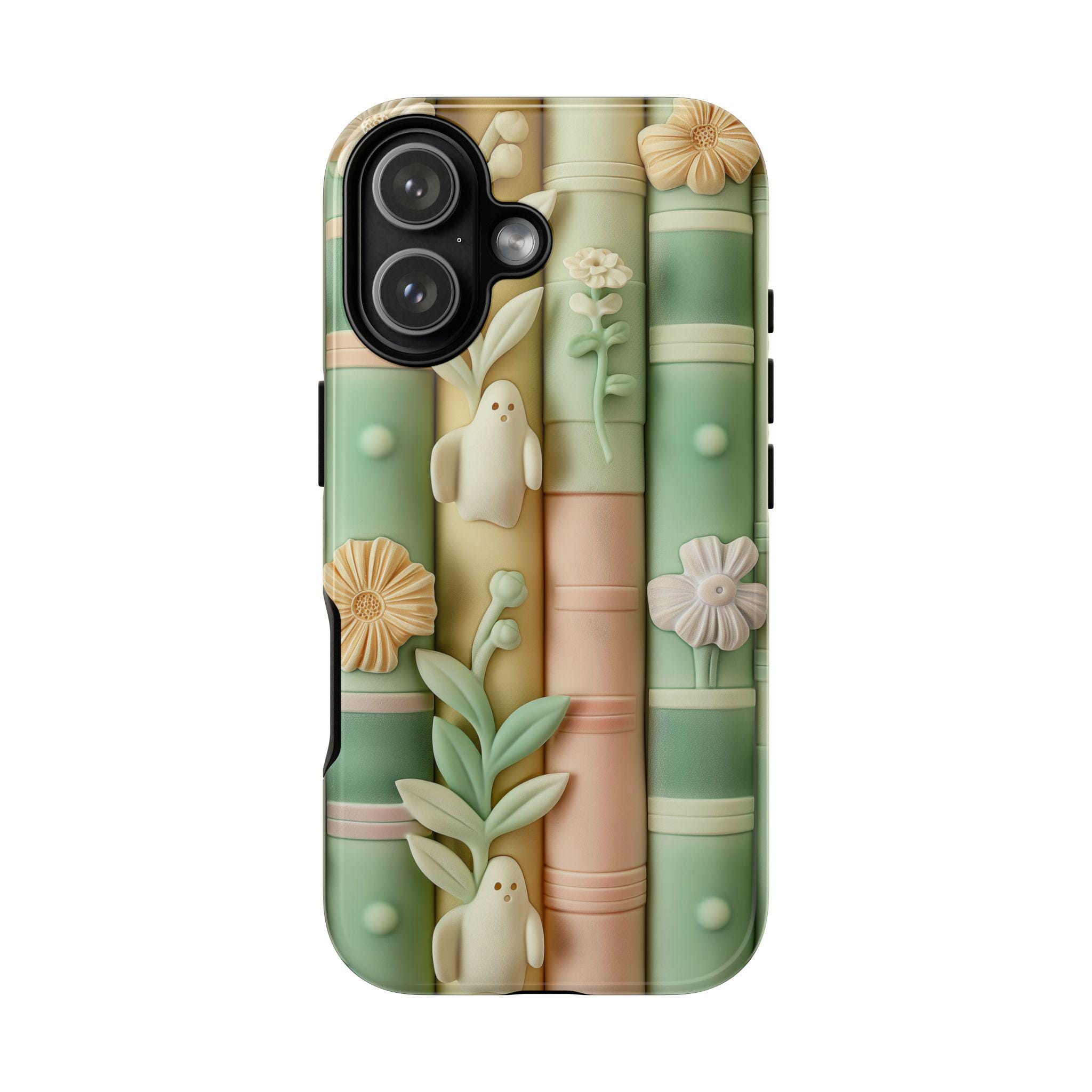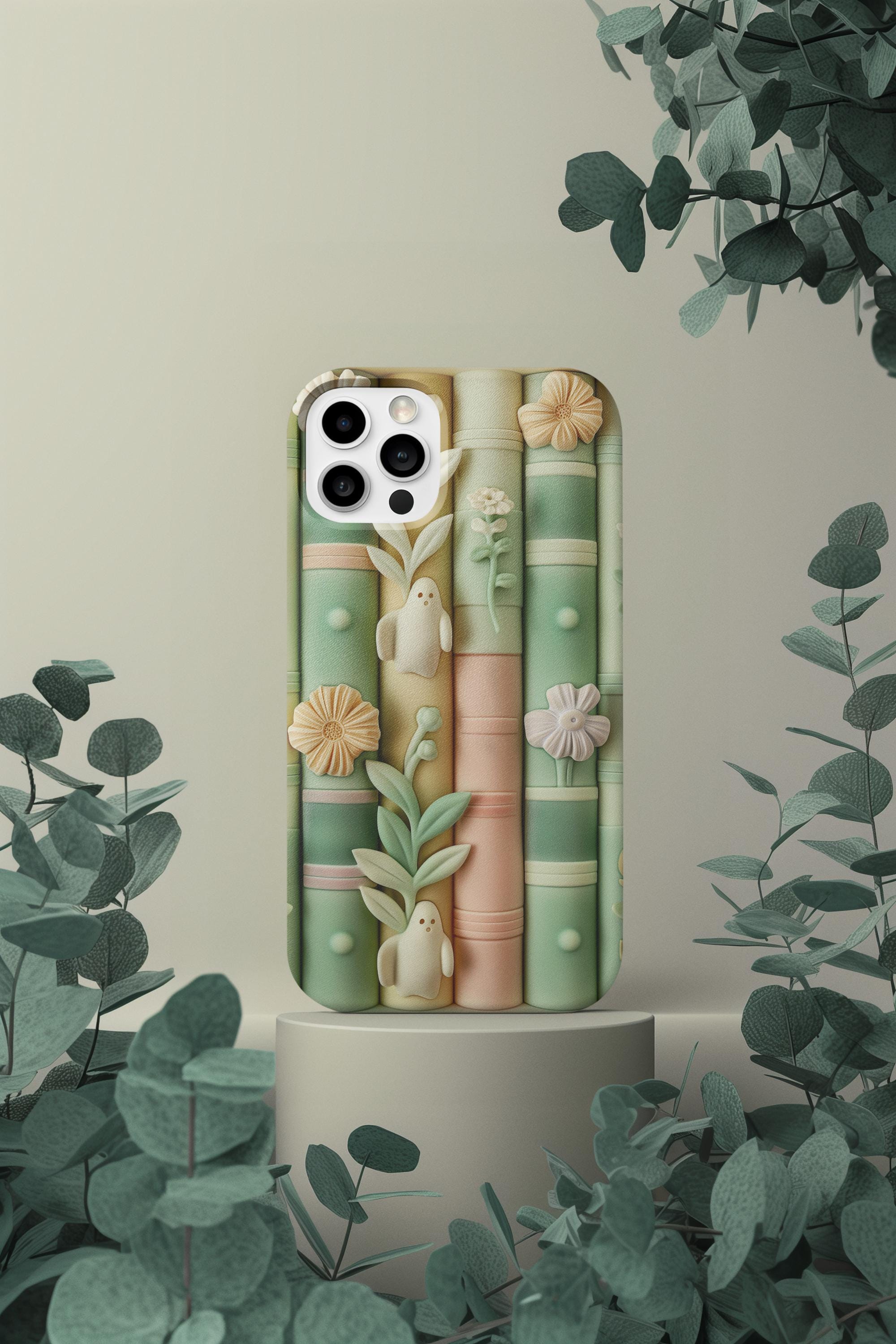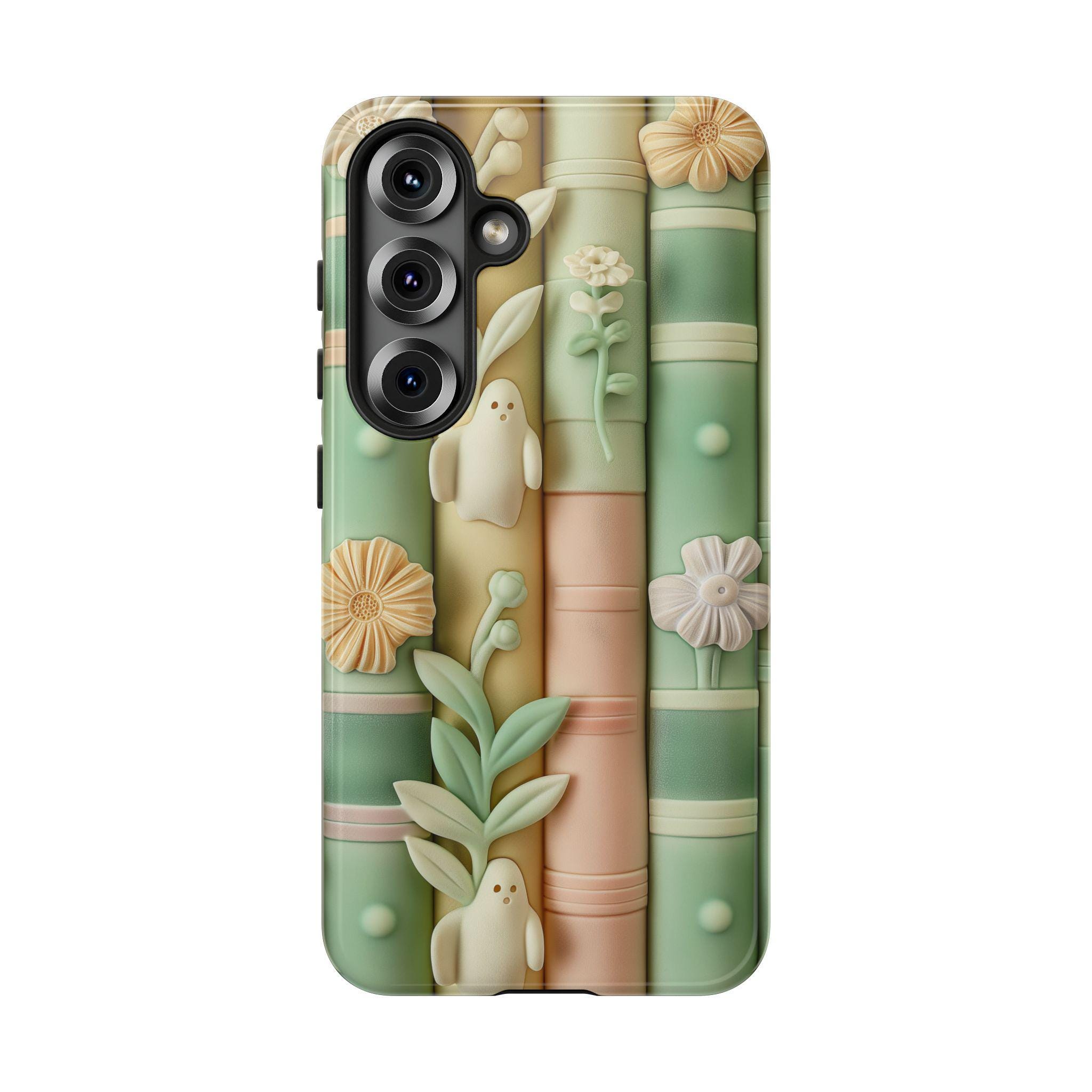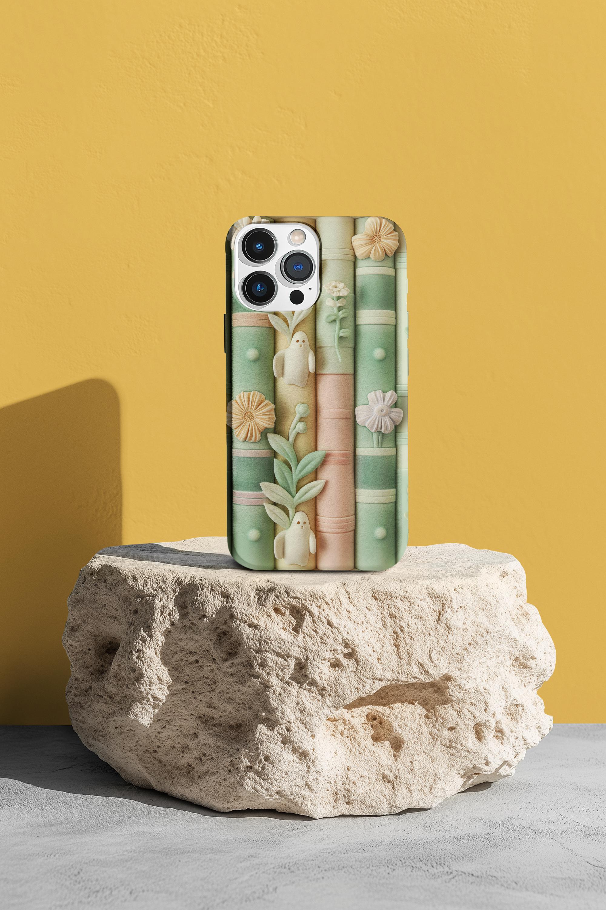 Pastel Bookshop Ghosts phone case | claymorphism 3D illusion, floral shelves