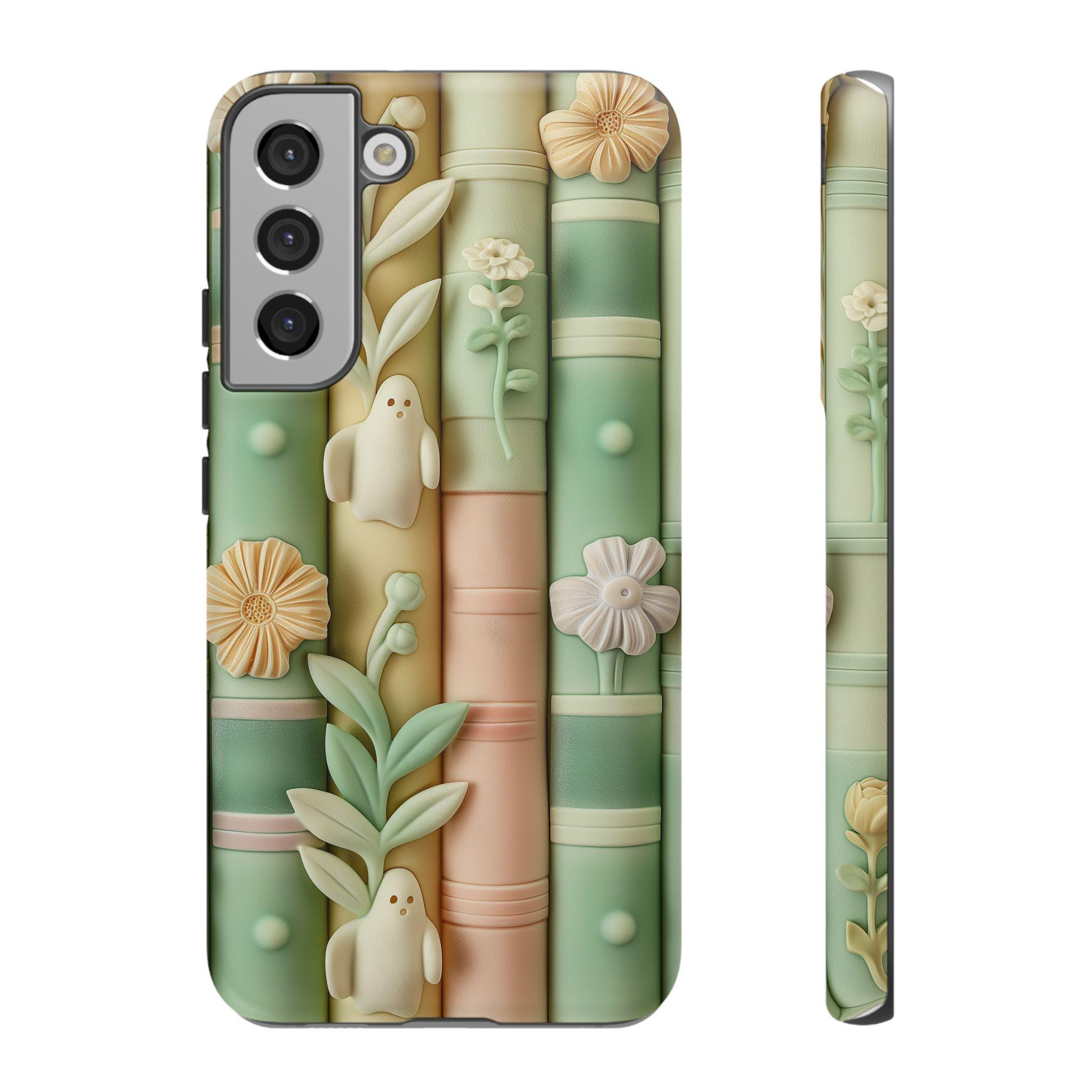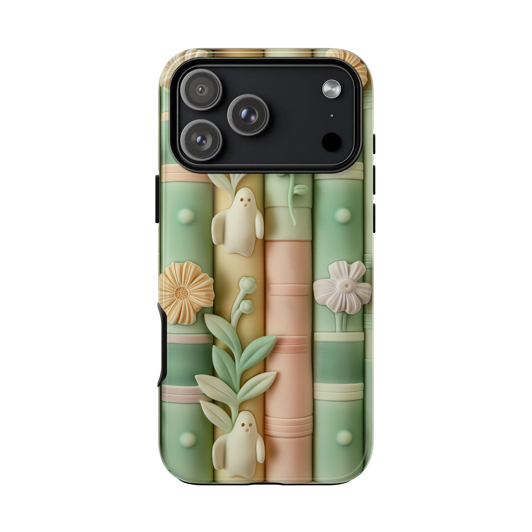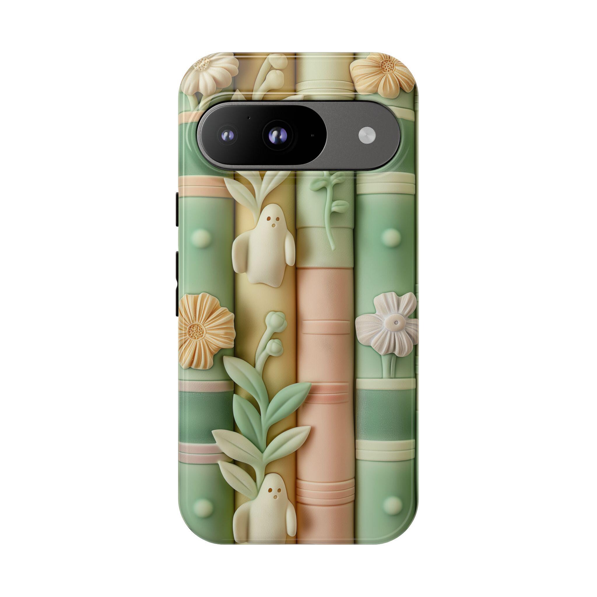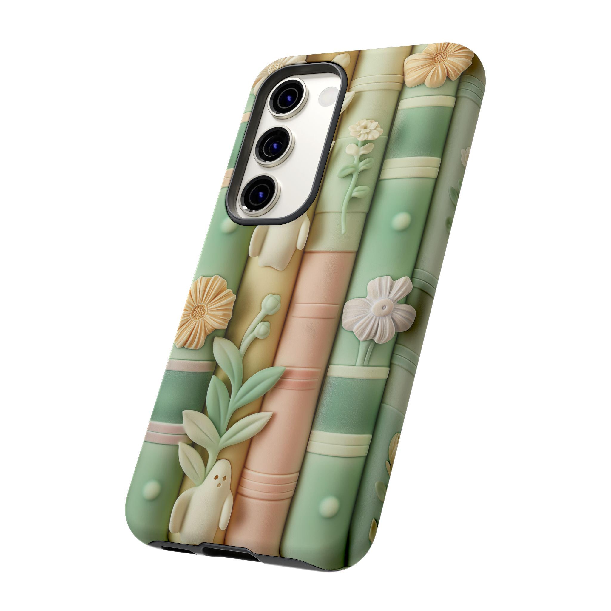 Pastel Bookshop Ghosts phone case | claymorphism 3D illusion, floral shelves