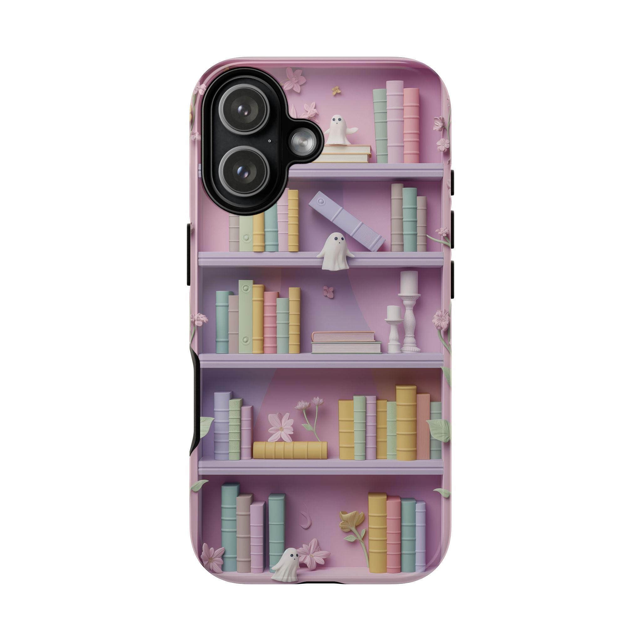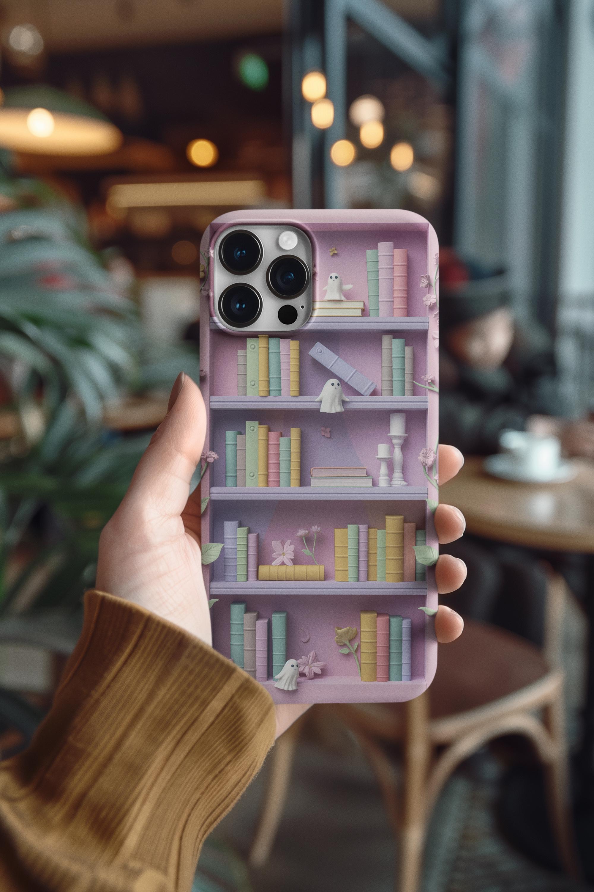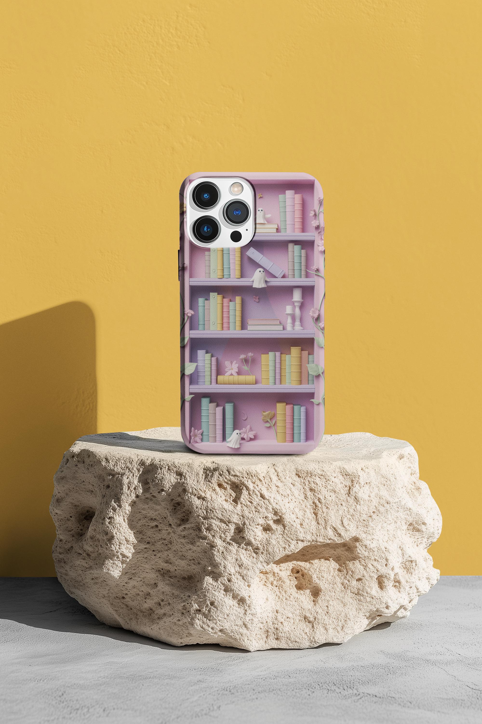 Pastel Bookshop Ghosts phone case | claymorphism 3D illusion floral shelves