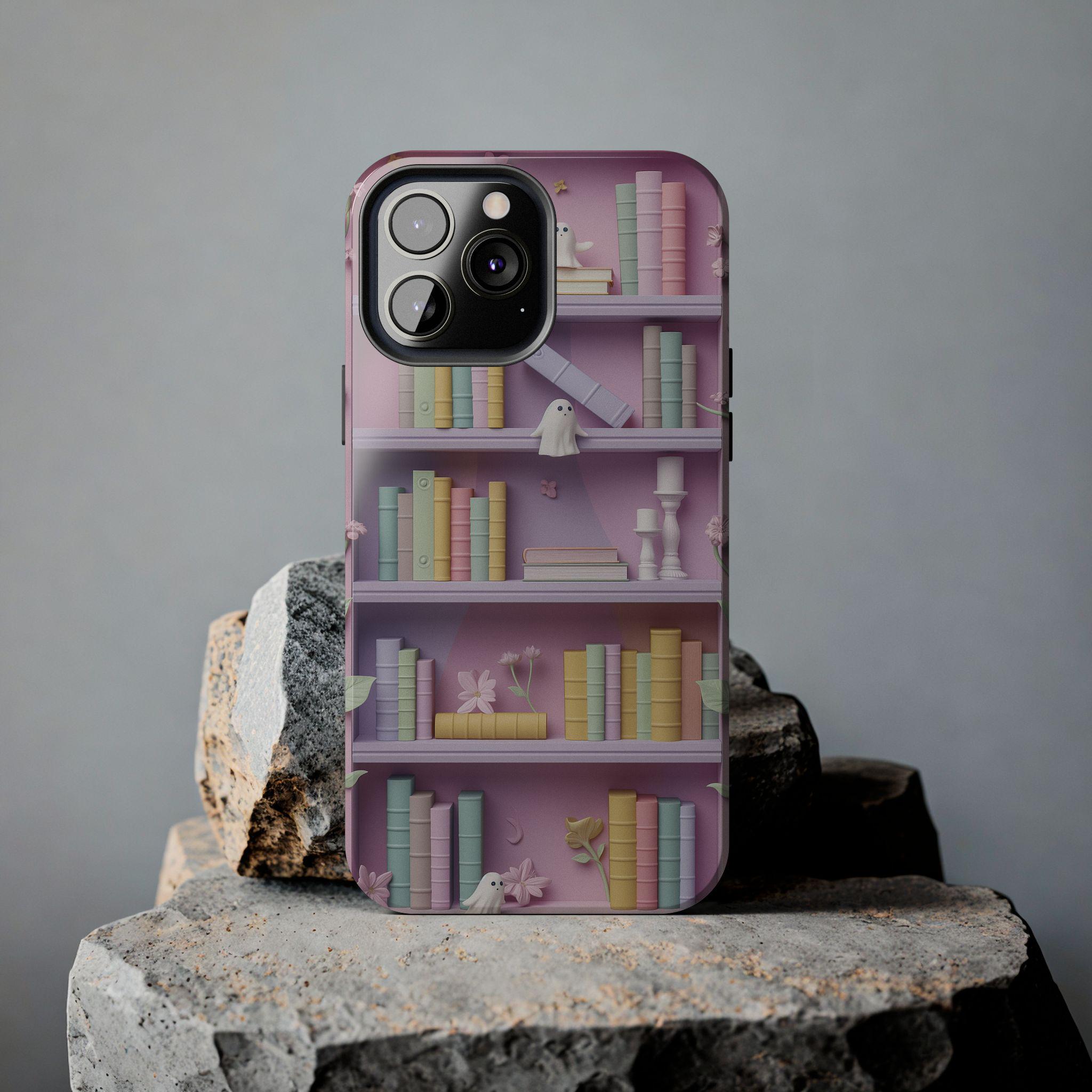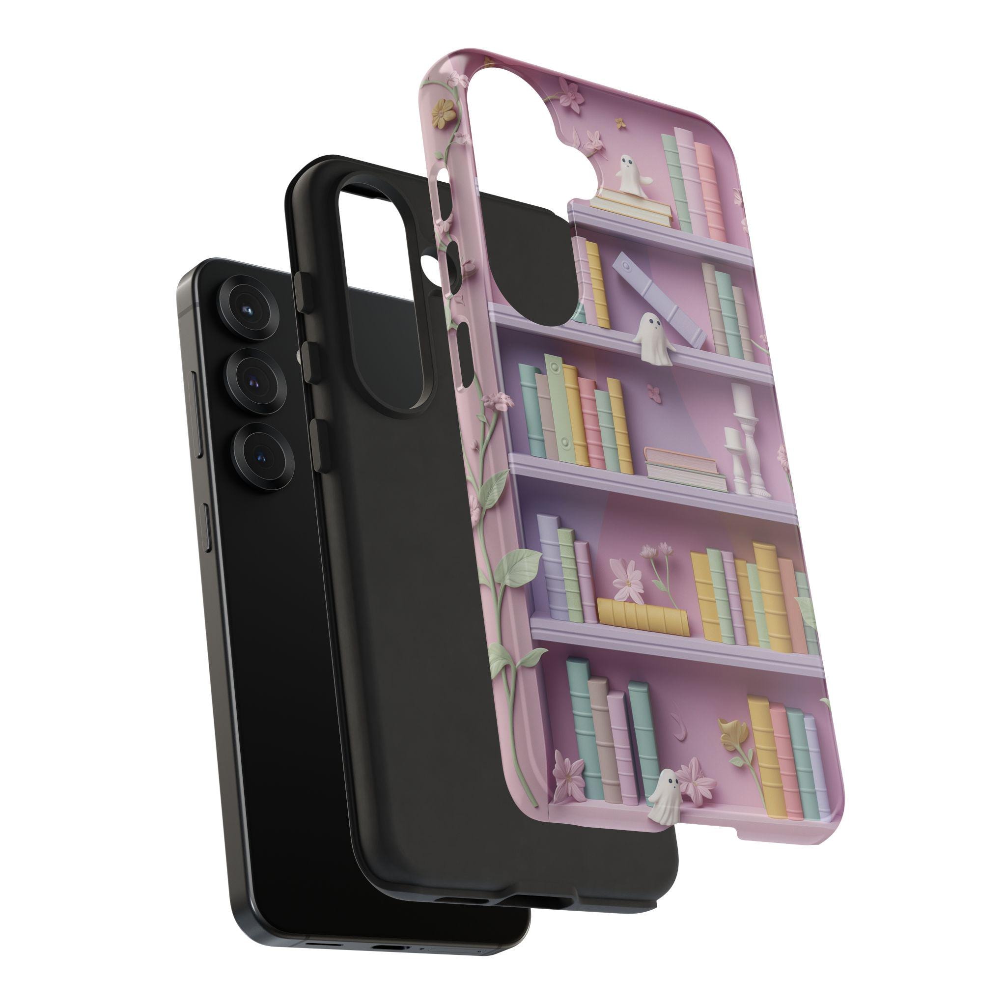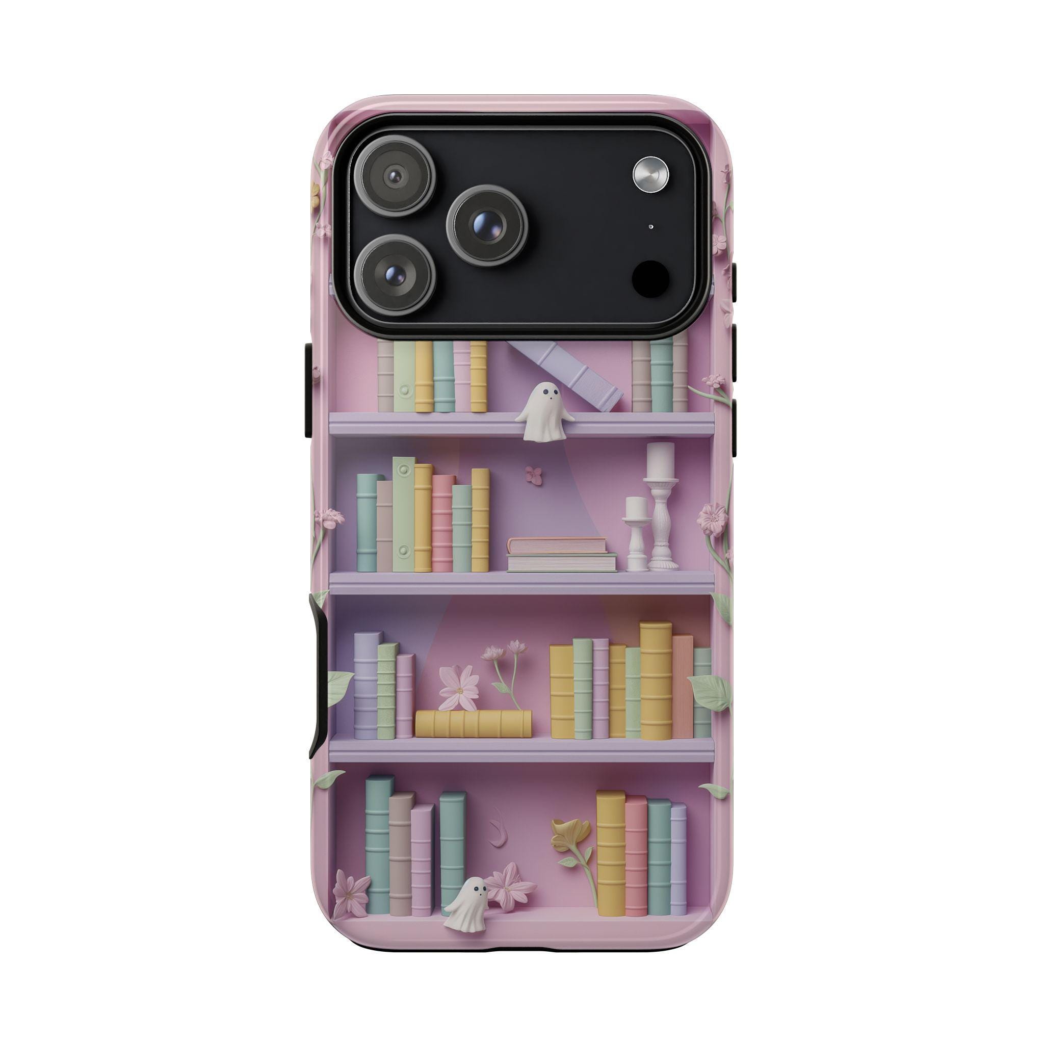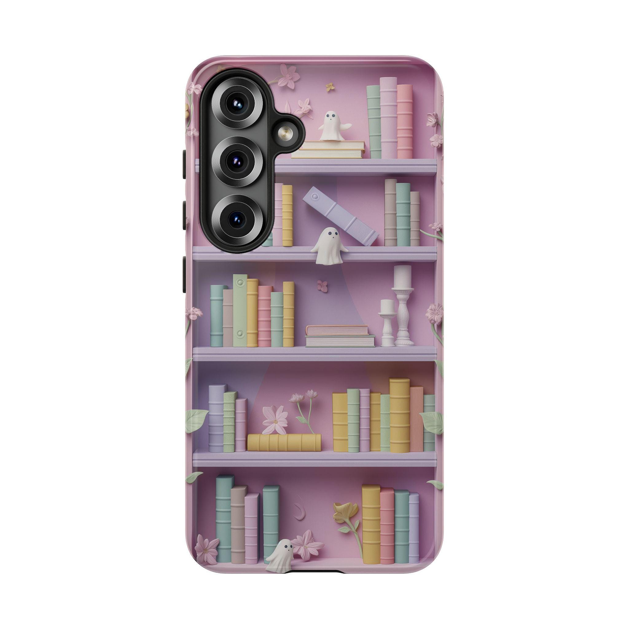 Pastel Bookshop Ghosts phone case | claymorphism 3D illusion floral shelves
