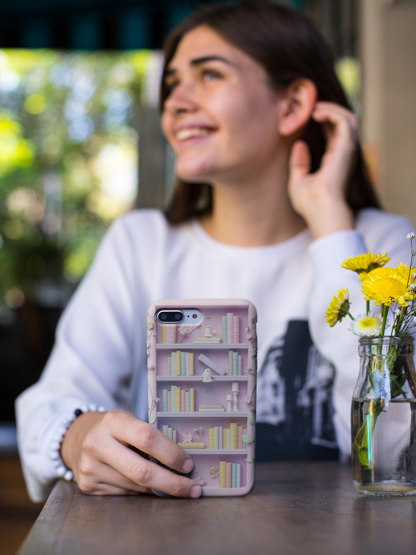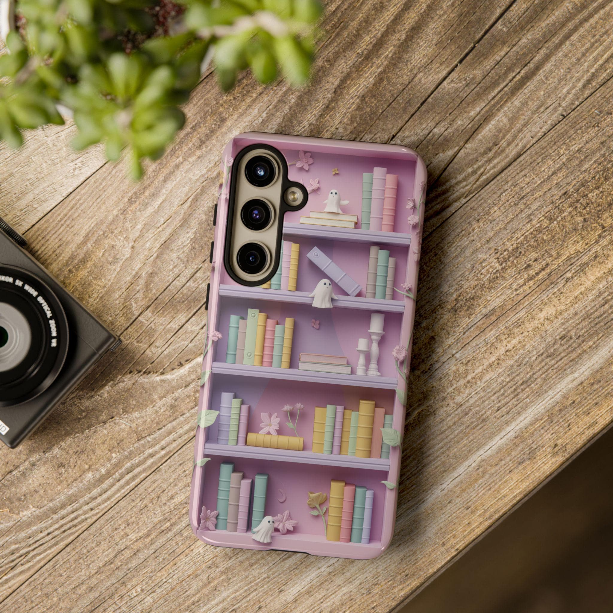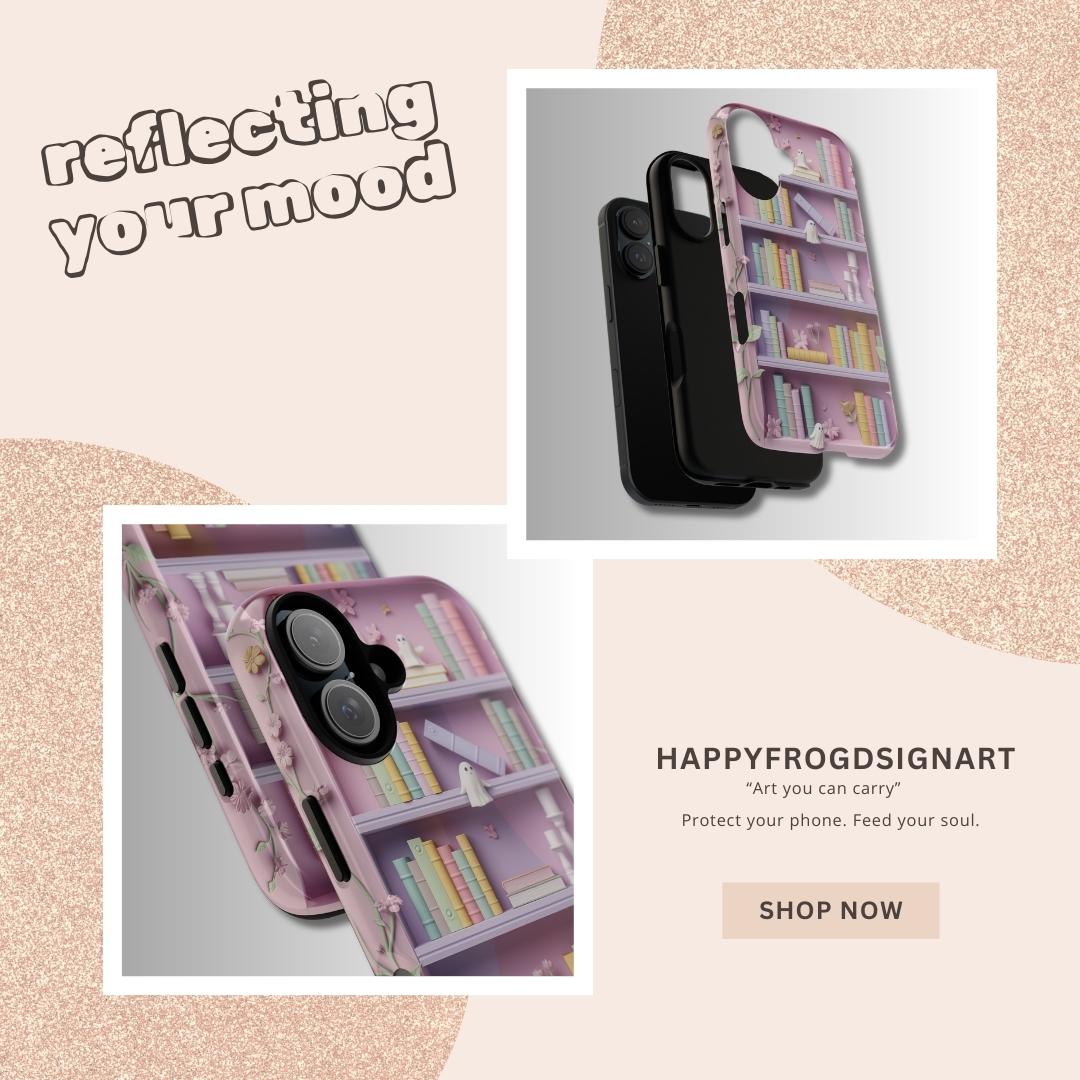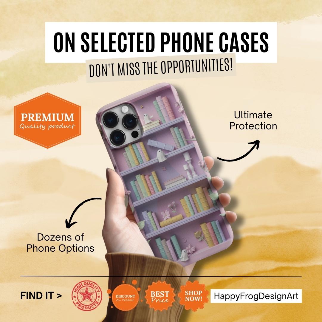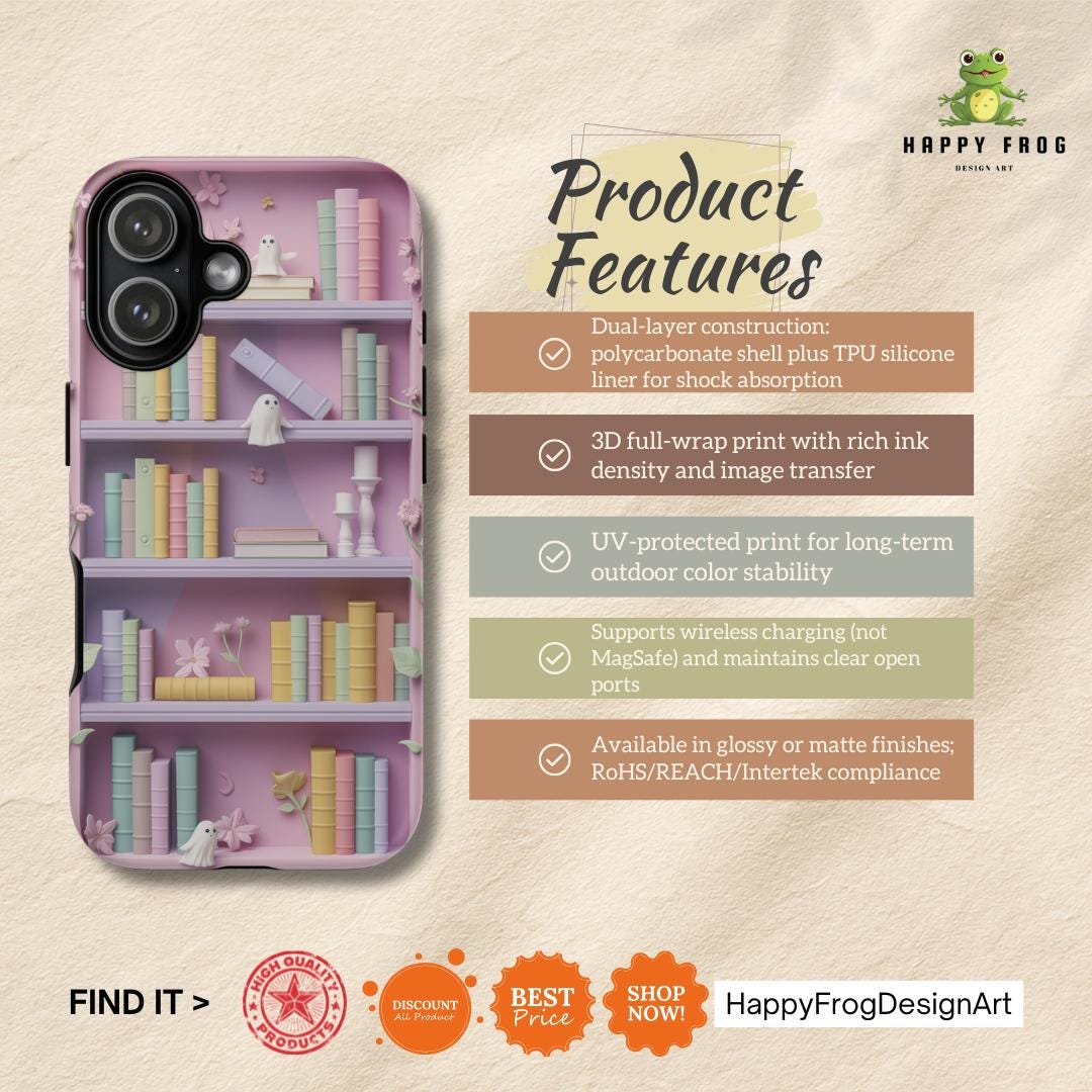 Soft pastel shelves come alive on this protective phone case — a tiny fairytale you can hold. Delicate flowers and hidden ghost friends nestle among stacked books rendered in a gentle claymorphism style, giving the illusion of subtle 3D texture without added bulk. Each glance invites a quiet moment: the hush of reading nooks, the lightness of imagined worlds, and the playful surprise of shy spirits peeking from behind spines. Built as a dual-layer case, it balances dreamy aesthetics with practical protection so your everyday adventures keep their calm and color. Let it sit on your desk, slip into your pocket, or rest in your hand as a small, comforting token of wonder.