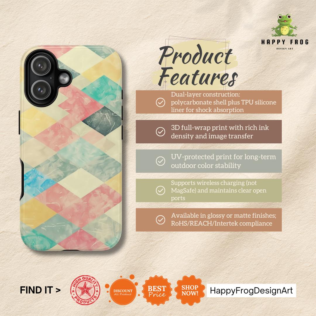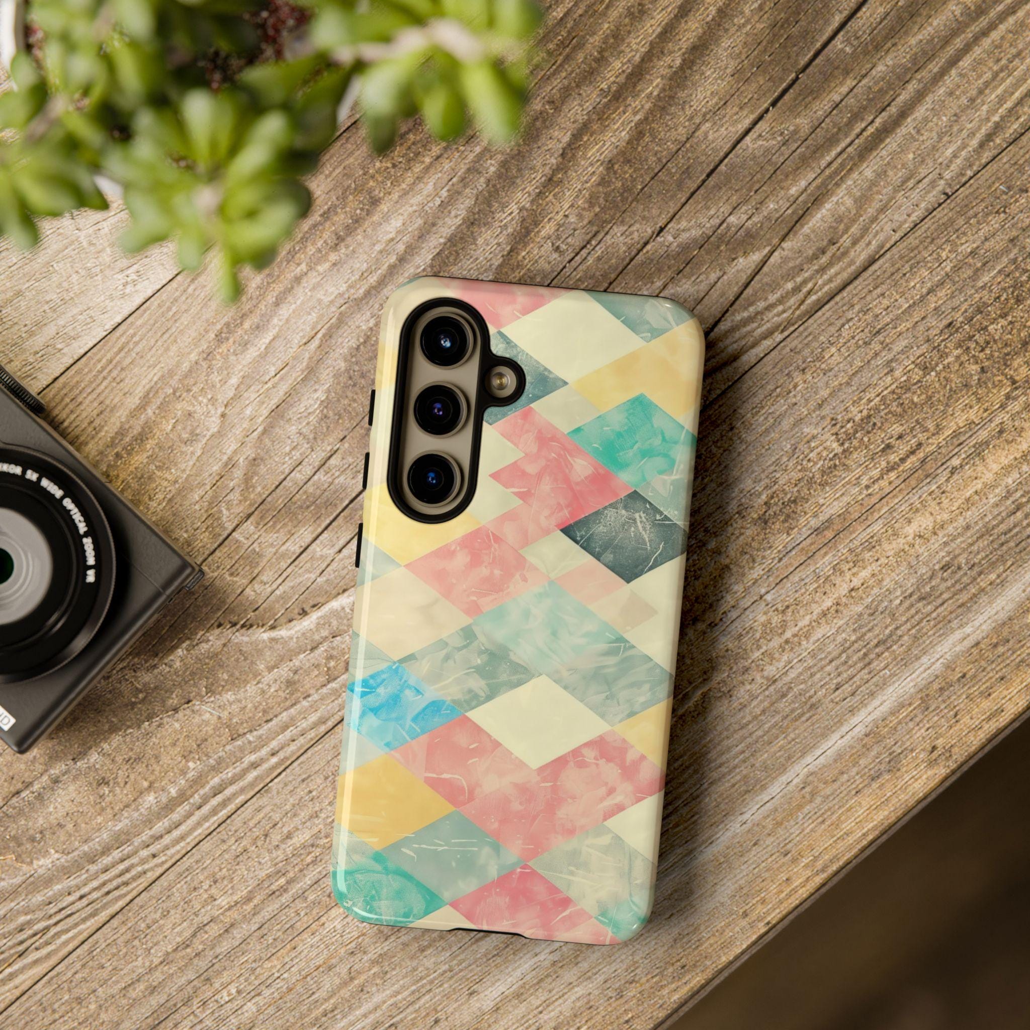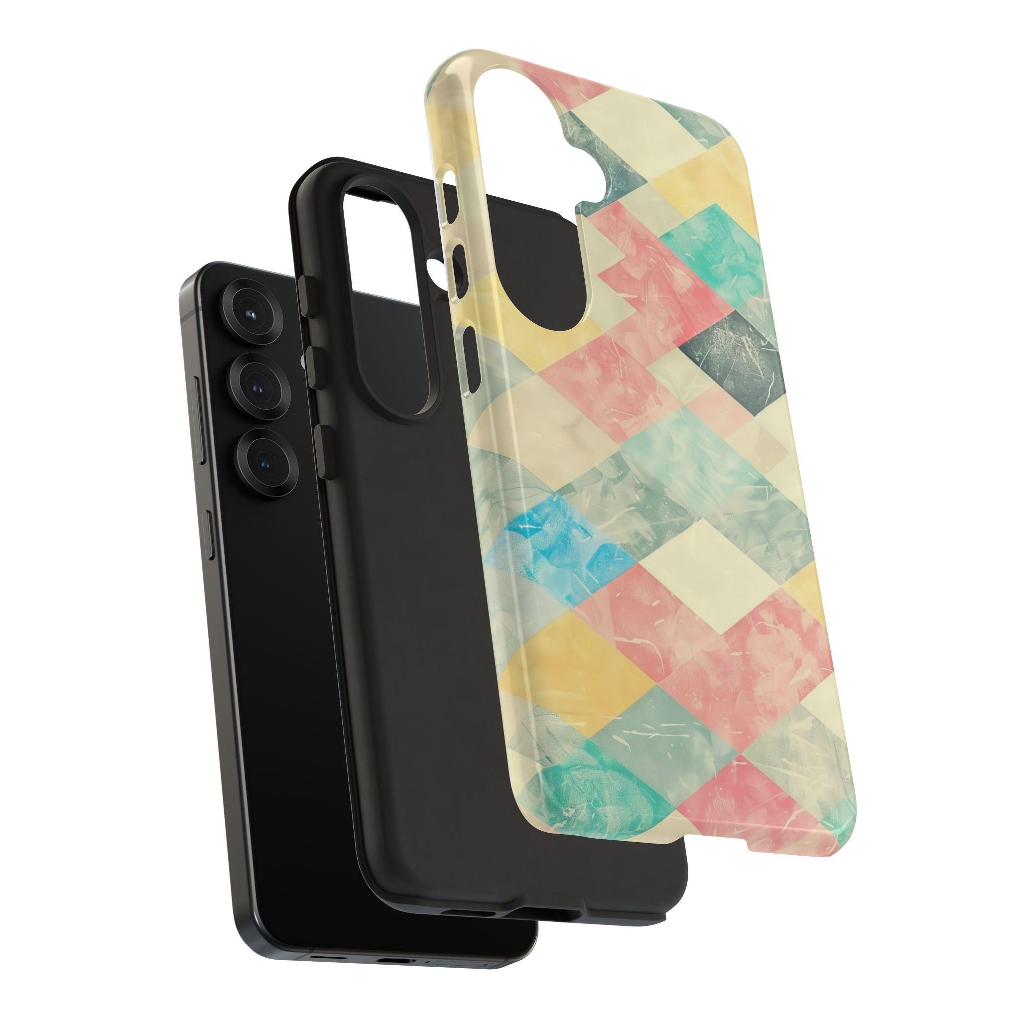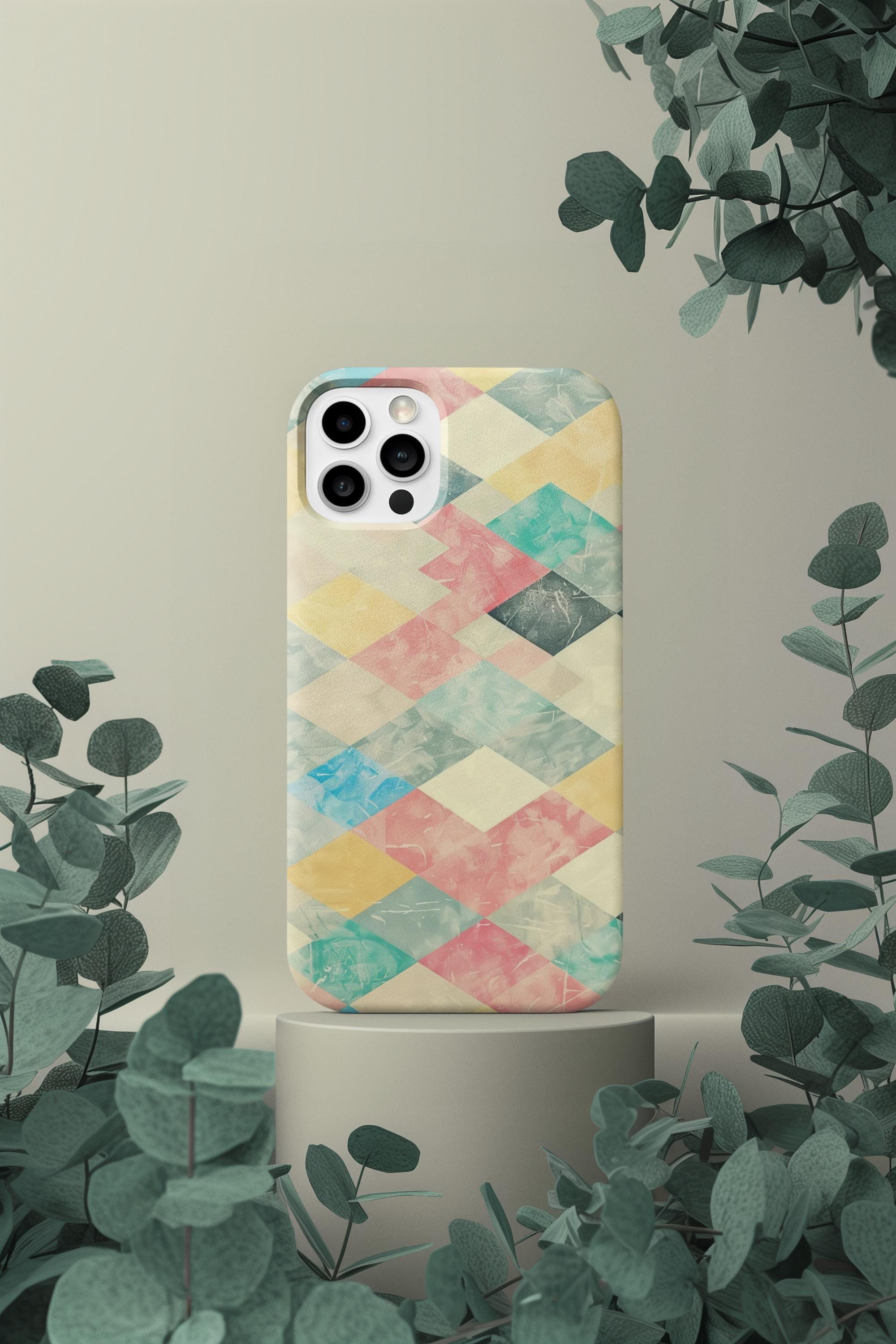 This protective phone case blends vintage baklava geometry with modern abstract art. Soft pastel gradients and marbled veins give each case a lived-in, textured look that feels both retro and fresh. The wraparound design flows across the shell, so the pattern reads seamlessly from edge to edge. It’s designed to sit comfortably in your hand while showing off a composed, artistic aesthetic—great for people who appreciate subtle color stories and tactile detail. The slightly aged finish makes everyday handling feel less precious and more personal; this case looks like it’s already part of your life the moment you put it on your phone.