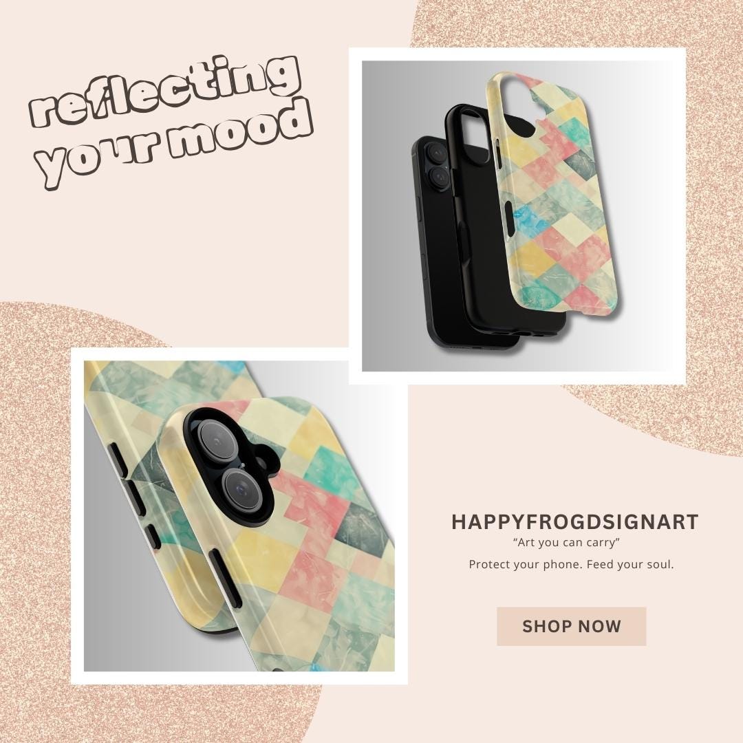 Step into a world of timeless elegance. This HappyFrogDesignArt exclusive features a sophisticated blend of retro geometric patterns and modern abstract textures. With its beautifully distressed finish and soft pastel palette, it’s the perfect accessory for those who appreciate art in its purest form.