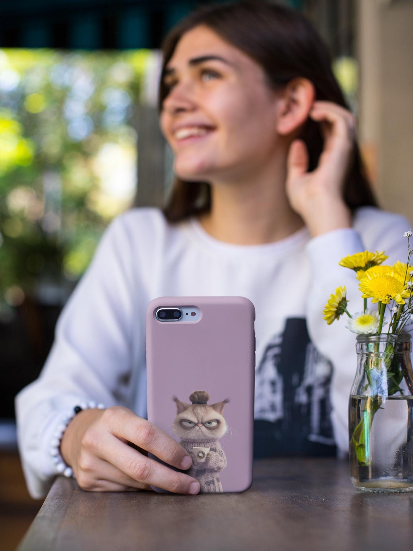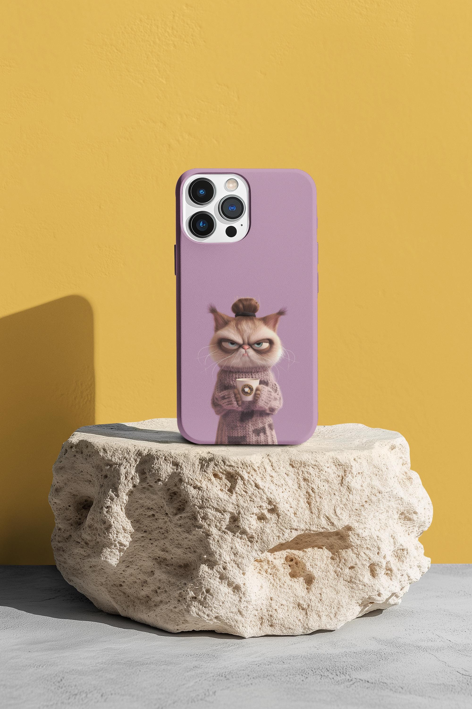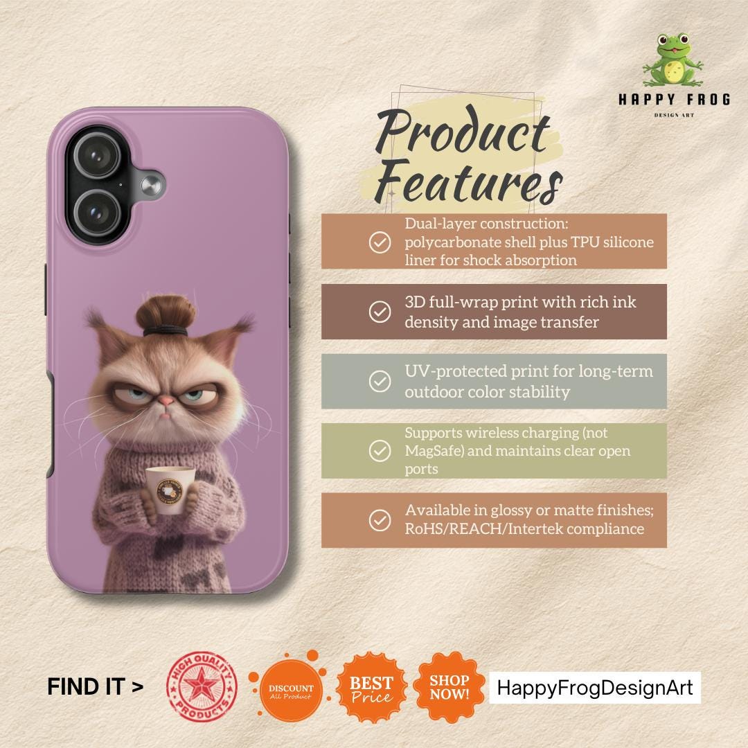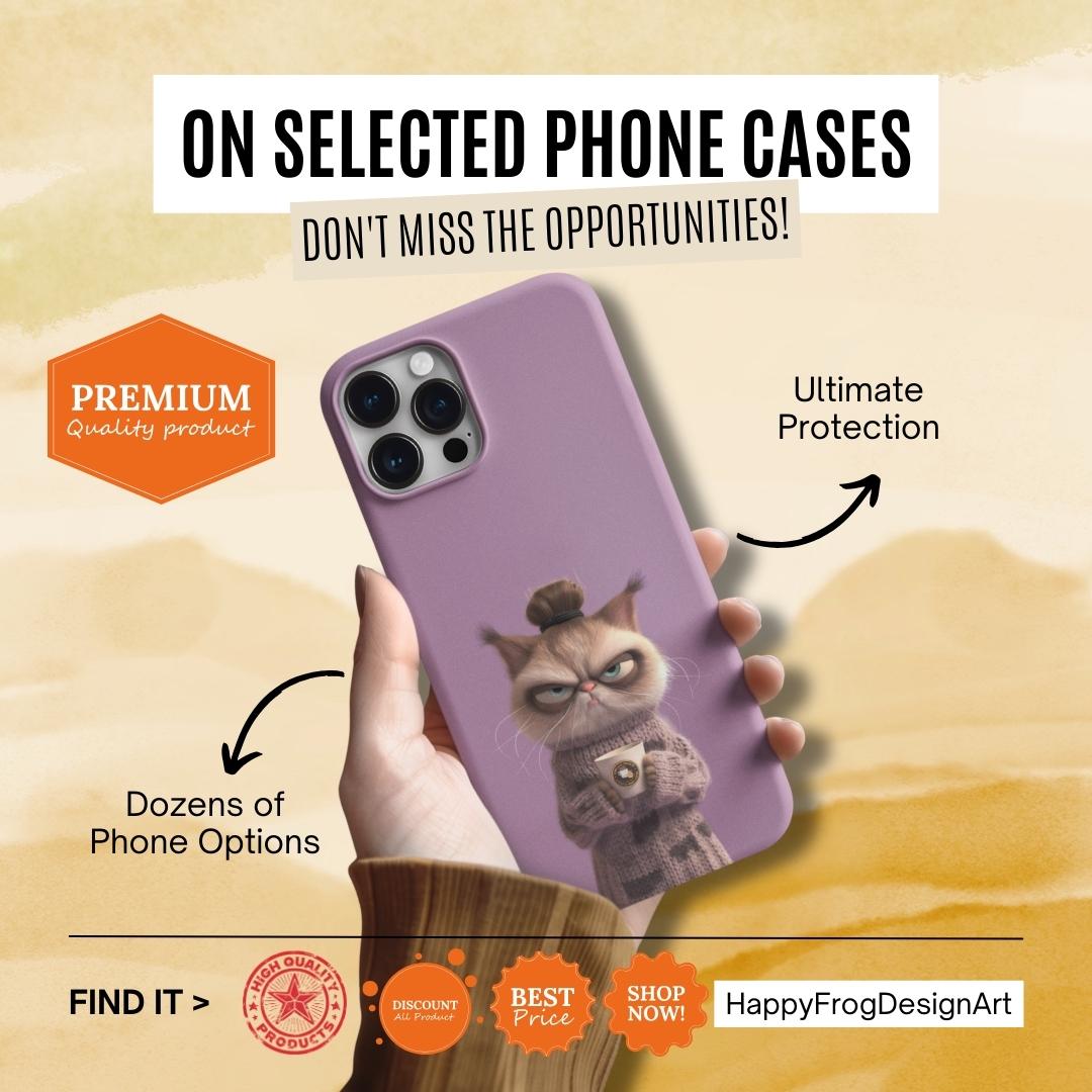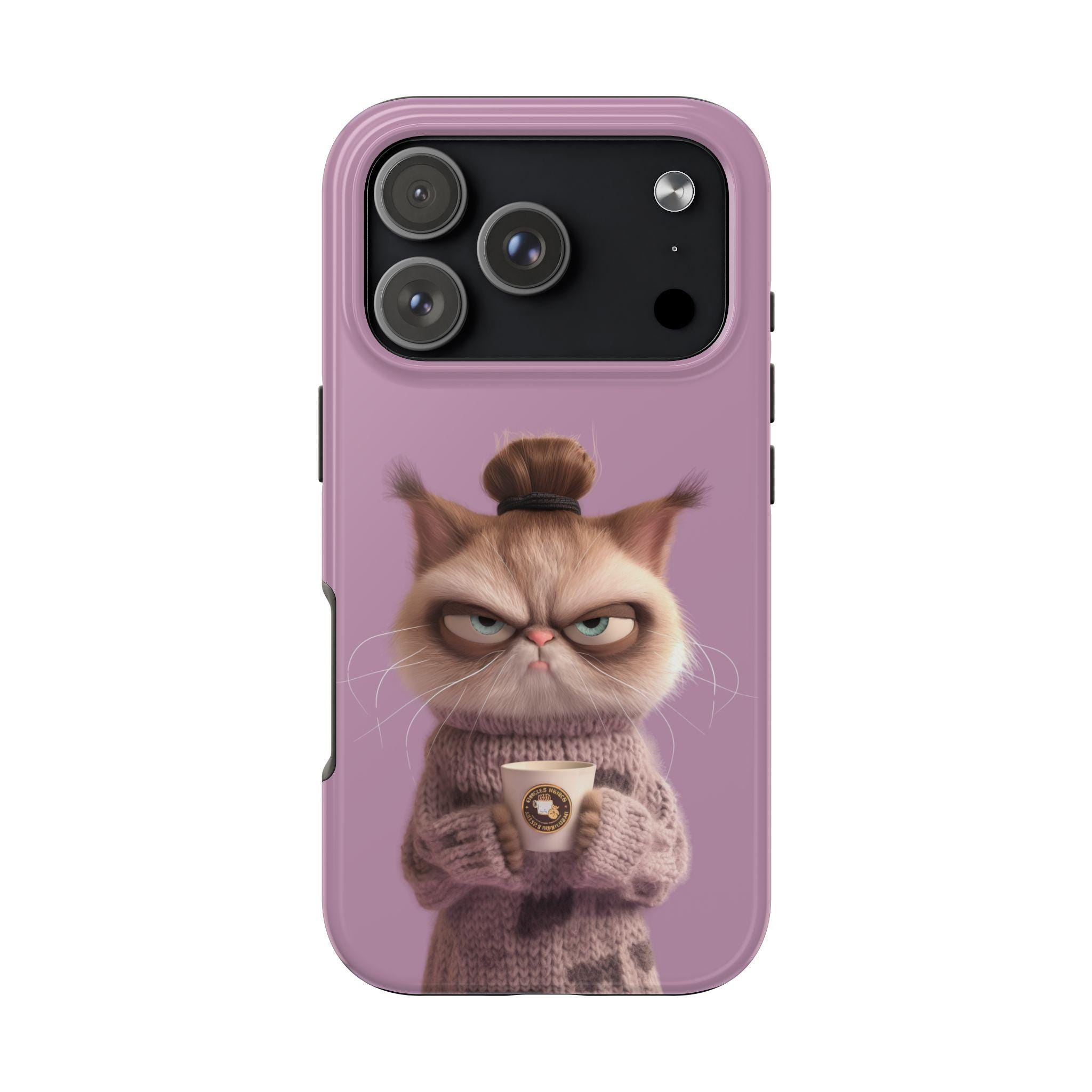A tough, personality-filled phone case that turns the slow-morning mood into wearable art. The grumpy bun-haired cat, wrapped in a knitted sweater and clutching a coffee cup, sits against a soft lilac backdrop and delivers the deadpan line: "I'm not awake yet." It’s more than protection — it’s a tiny comic moment you carry with you. The sturdy two-piece shell and flexible rubber liner absorb everyday shocks, while the lay-flat bezel keeps your screen safe from light scratches. The glossy, full-color finish keeps the illustration vivid through daily use, and UV protection helps preserve the lilac background from fading. Designed for adults who appreciate dry humor and a touch of cozy aesthetic, this case slips on easily, supports wireless charging, and matches the rhythm of slow mornings and coffee runs.