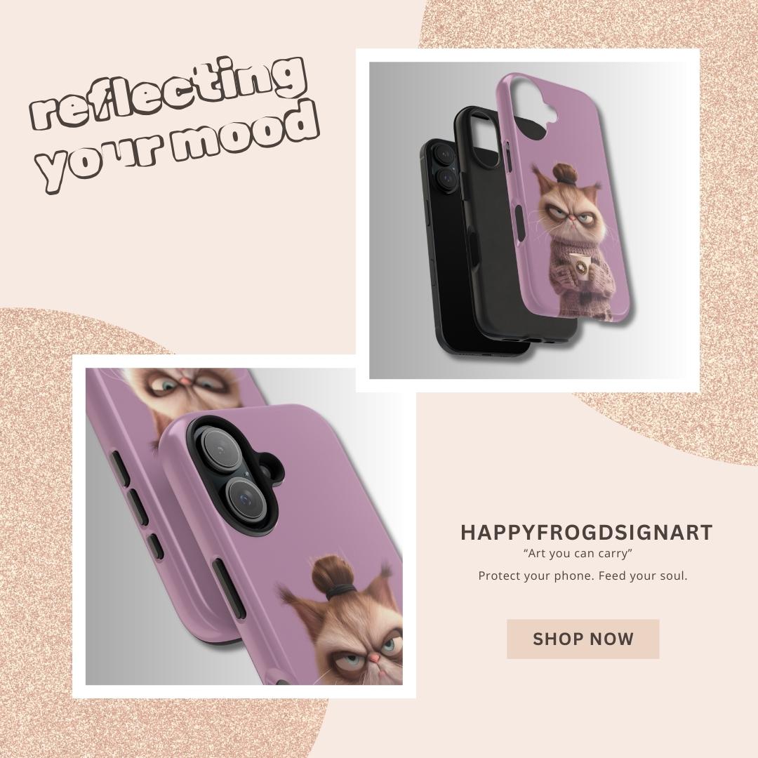 We’ve all been there. This exclusive HappyFrogDesignArt creation features our favorite "Morning Grump" cat—complete with a messy bun, a cozy oversized sweater, and that essential first cup of coffee. It’s the perfect accessory for those who don’t do mornings but do style.