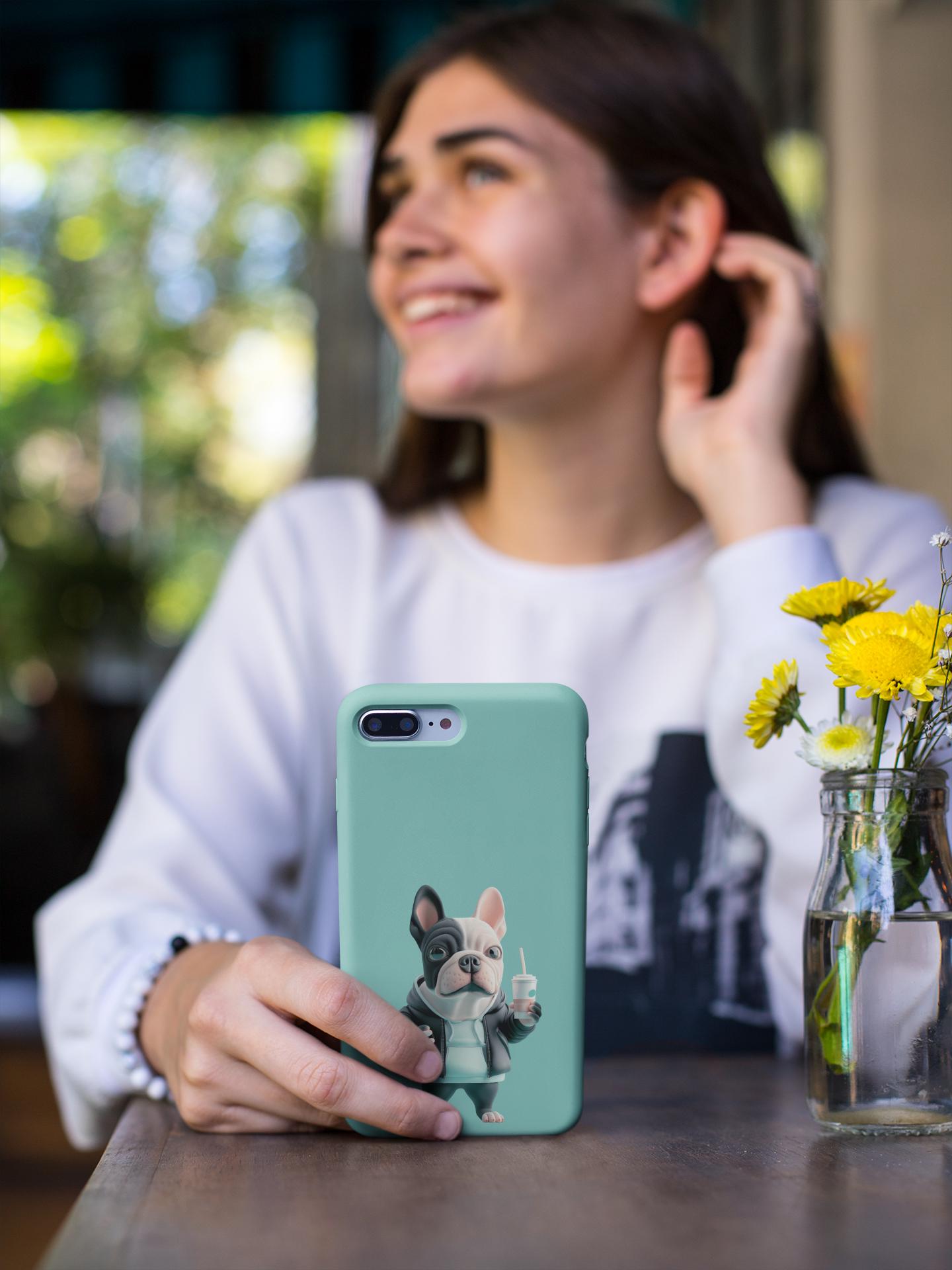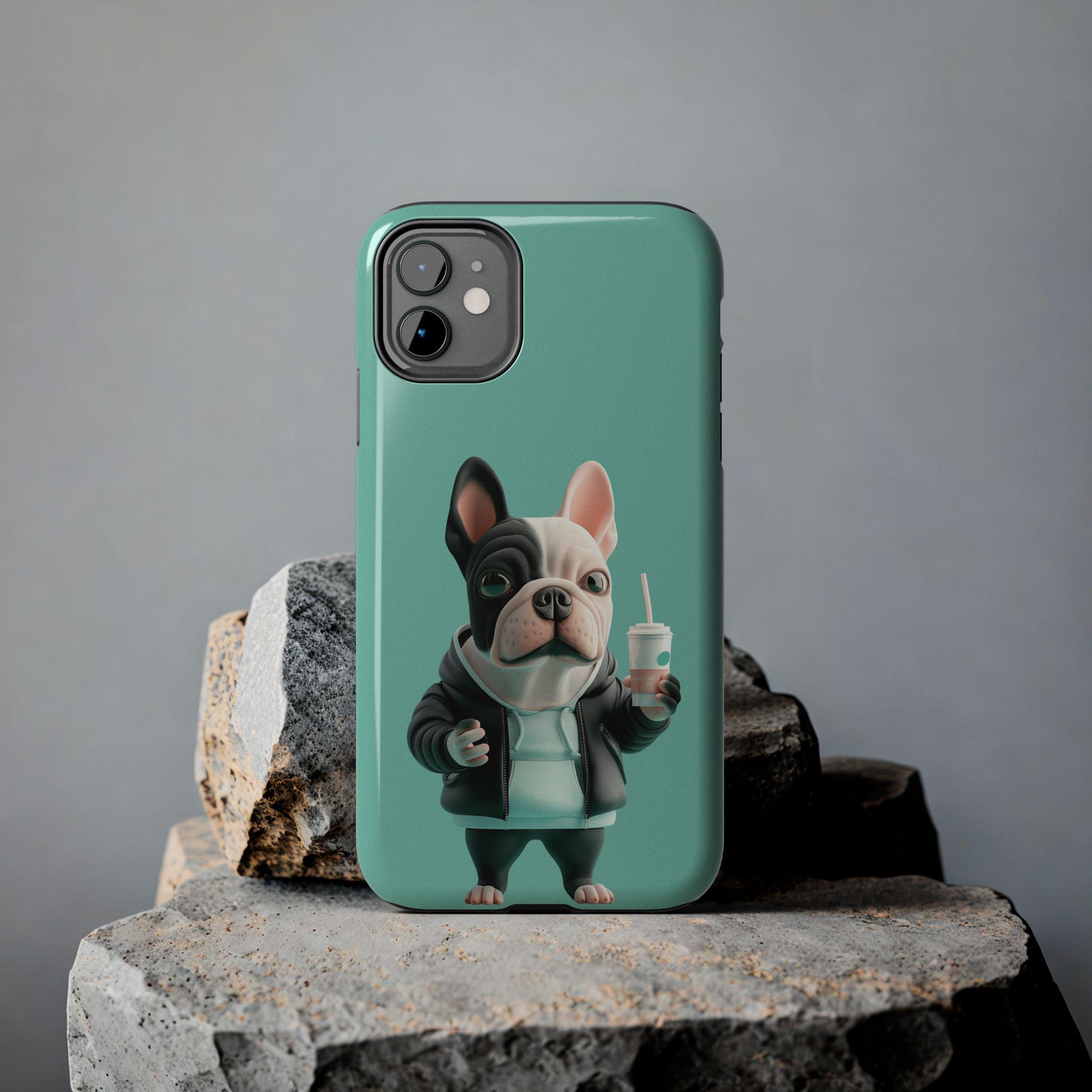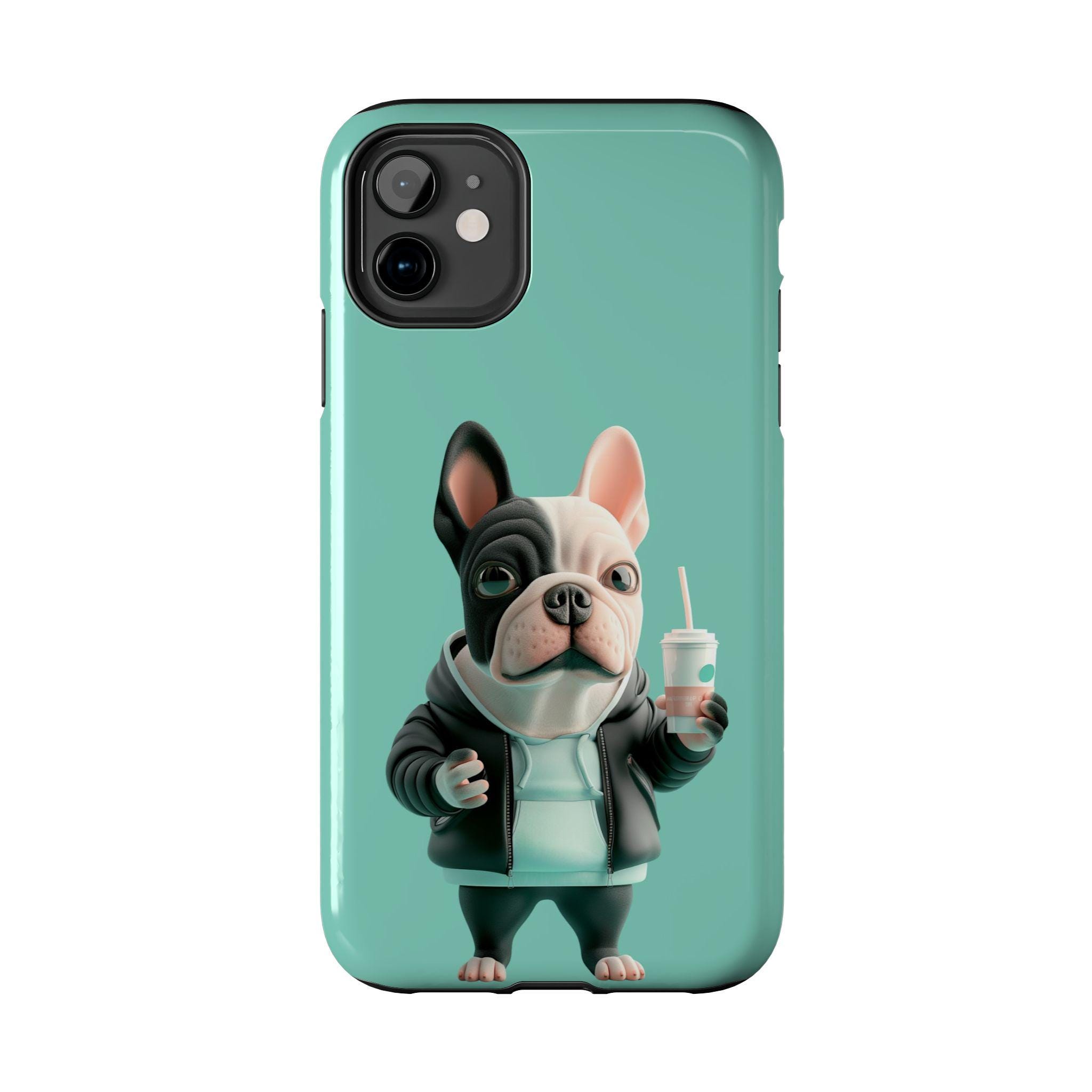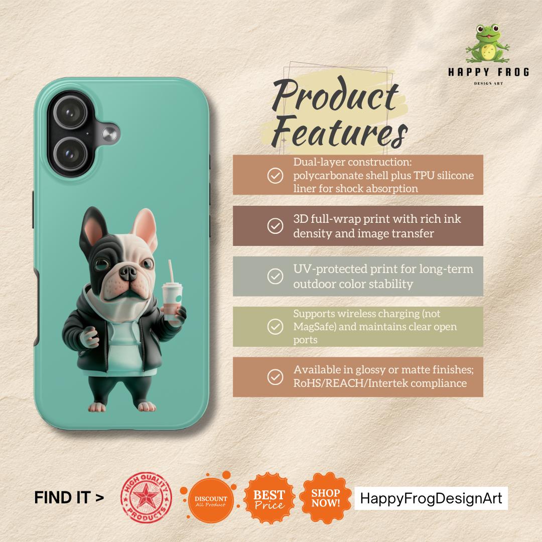 This glossy phone case brings a playful, streetwise vibe to everyday protection. A chunky, stylized French bulldog stands center stage against a cool teal backdrop, hoodie up, holding a takeaway cup — equal parts cheeky and chill. The two-piece shell and soft TPU liner work together to absorb drops while the lay-flat bezel keeps the screen from grazing surfaces. Lightweight and UV-resistant, the case keeps that vivid full-color artwork sharp through daily wear. It’s made for someone who wants practical impact protection without sacrificing personality — a small, joyful statement every time the phone is pulled out.