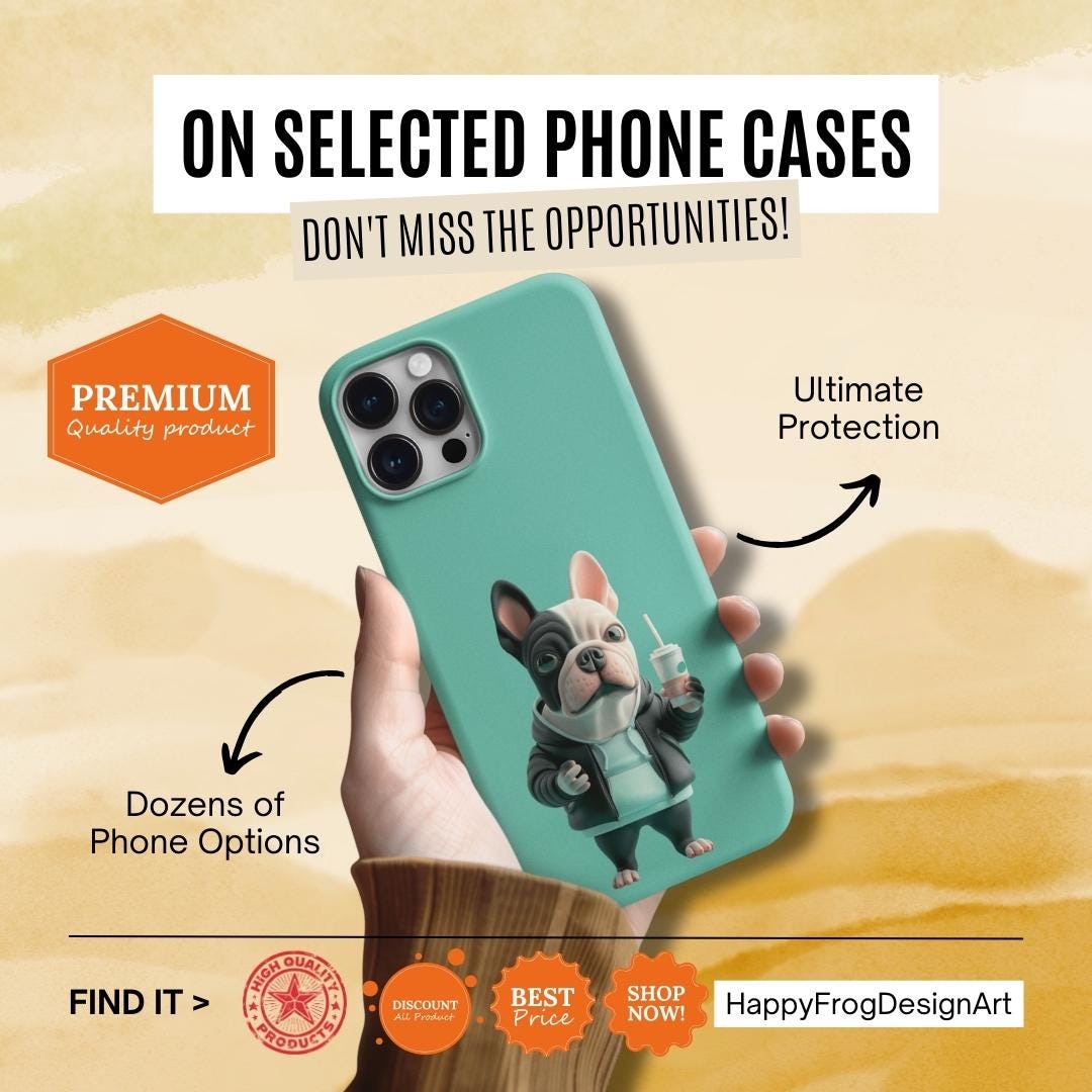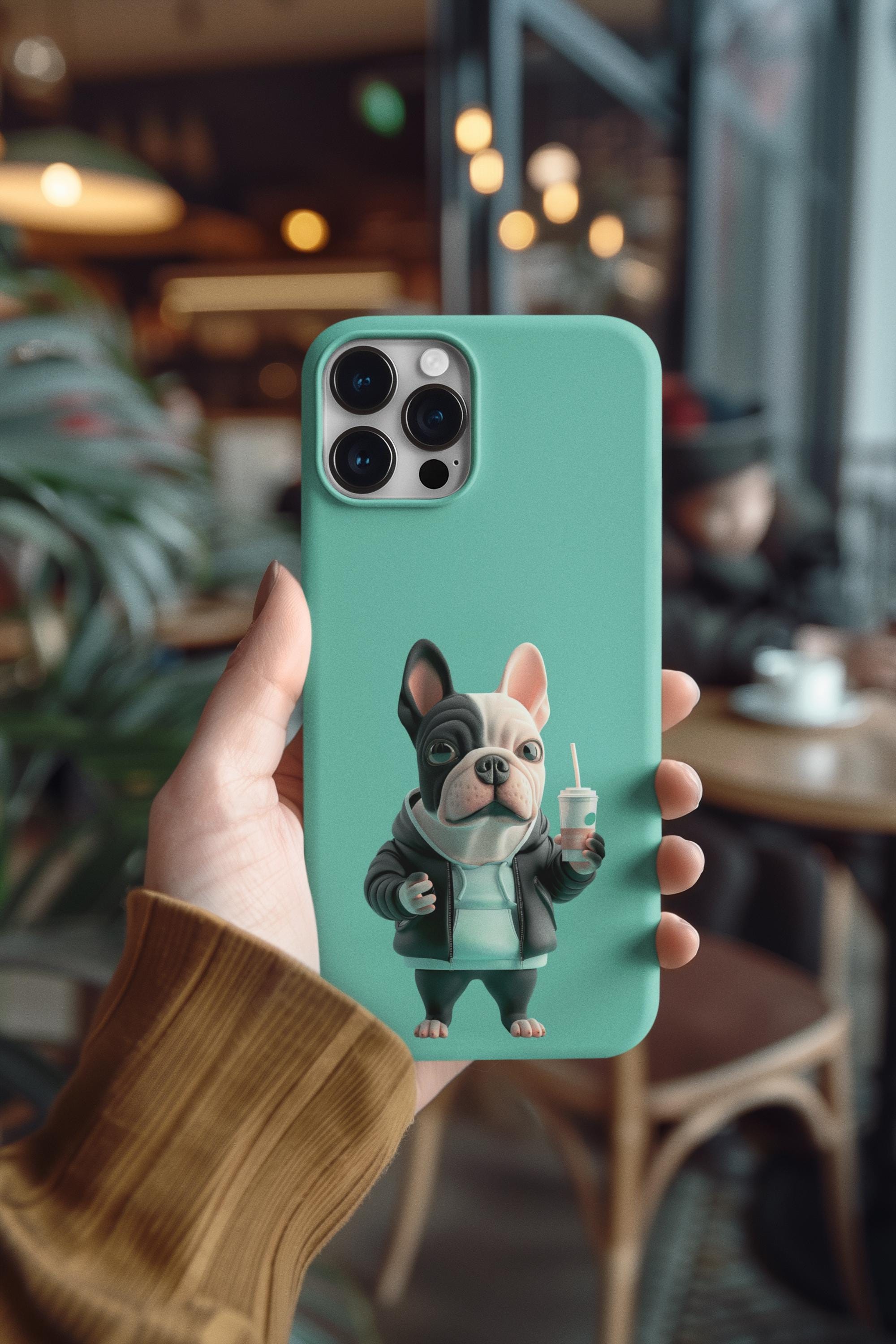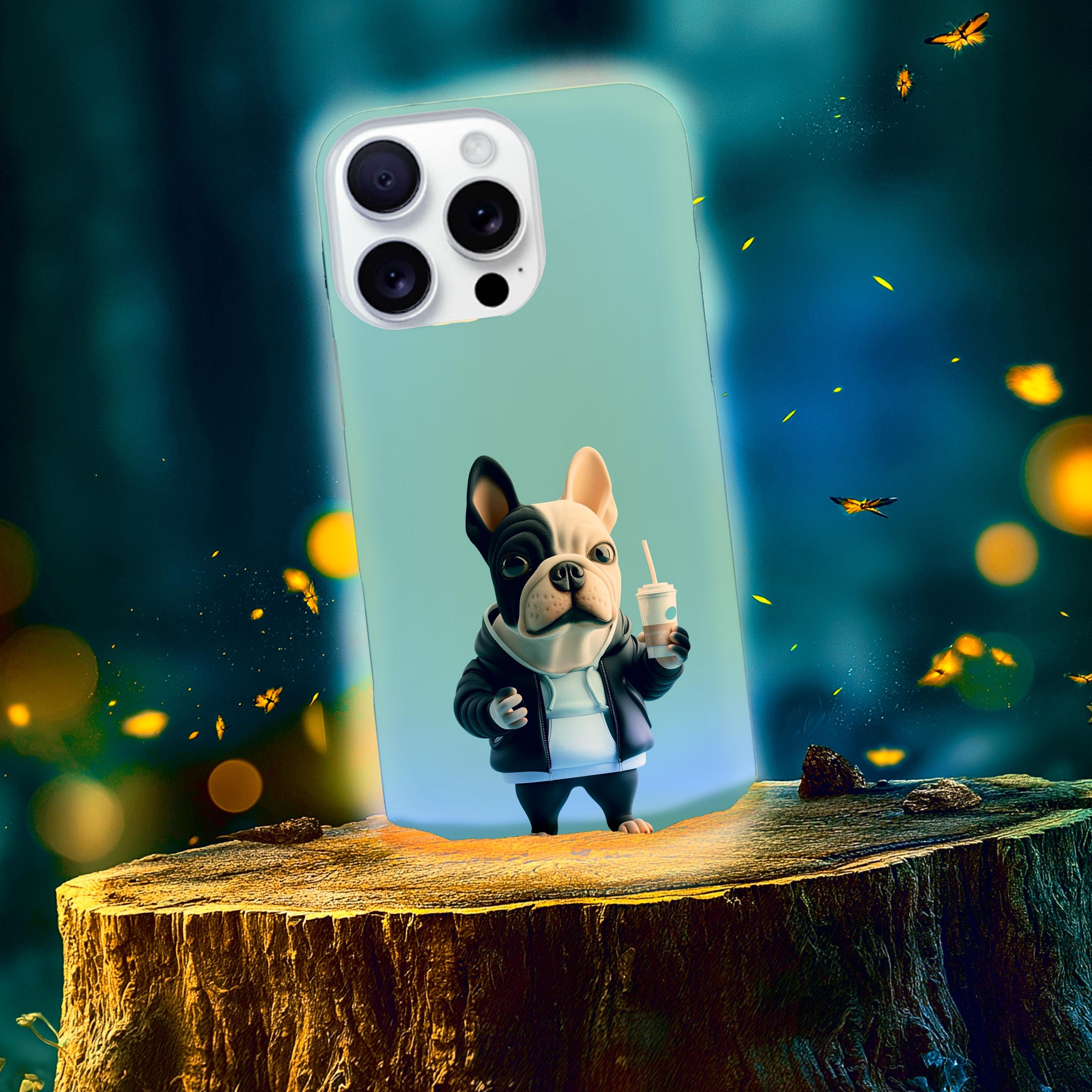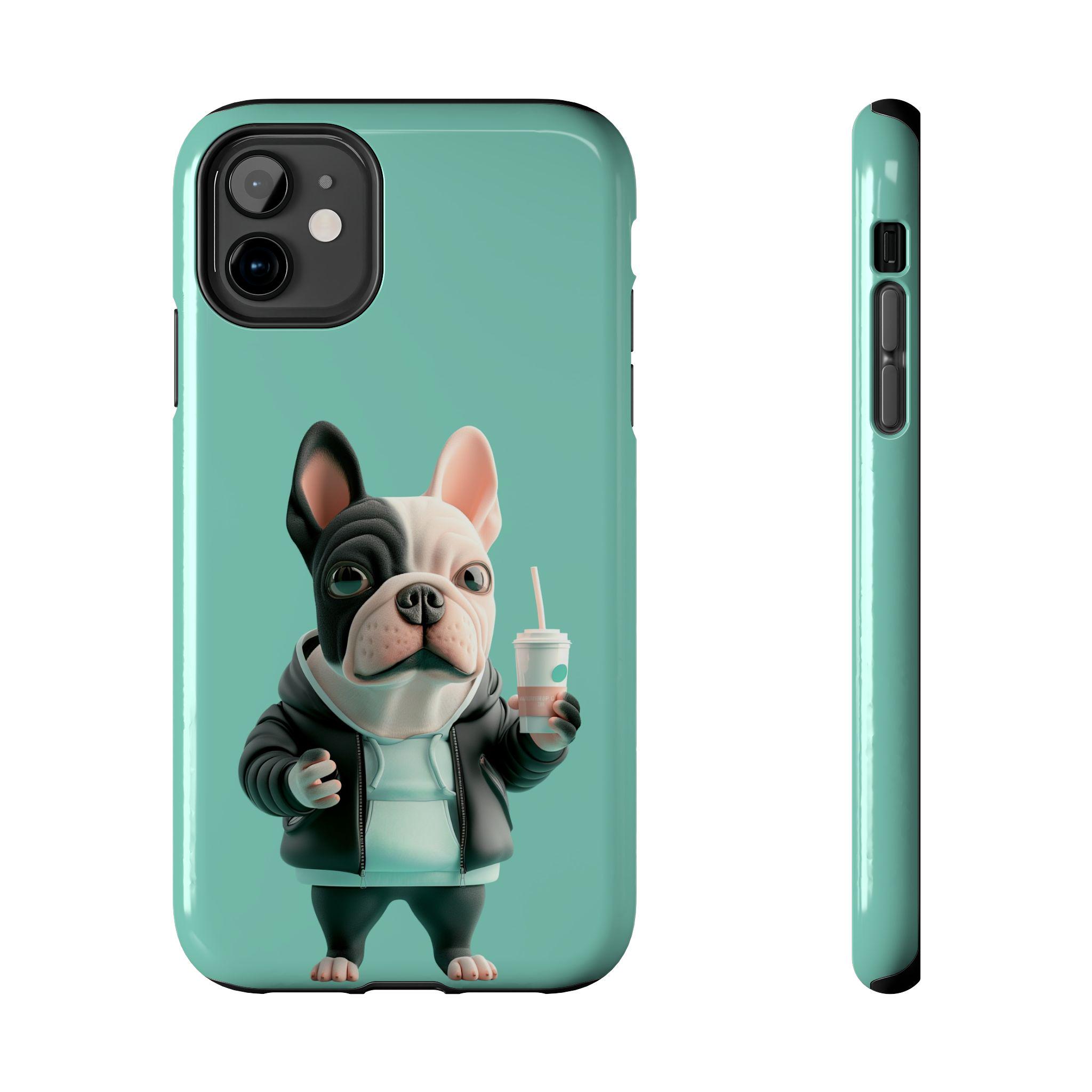 This glossy phone case brings a playful, streetwise vibe to everyday protection. A chunky, stylized French bulldog stands center stage against a cool teal backdrop, hoodie up, holding a takeaway cup — equal parts cheeky and chill. The two-piece shell and soft TPU liner work together to absorb drops while the lay-flat bezel keeps the screen from grazing surfaces. Lightweight and UV-resistant, the case keeps that vivid full-color artwork sharp through daily wear. It’s made for someone who wants practical impact protection without sacrificing personality — a small, joyful statement every time the phone is pulled out.