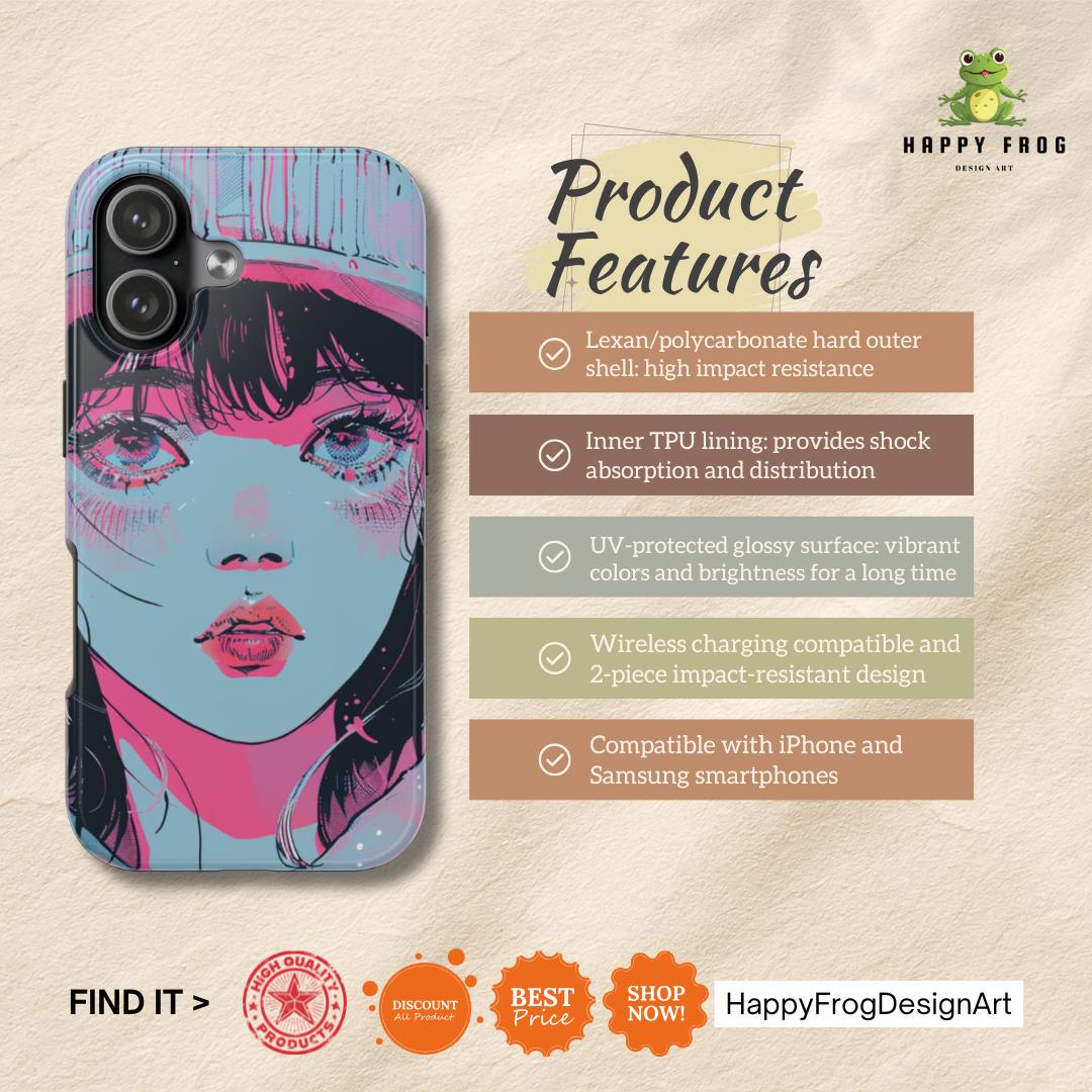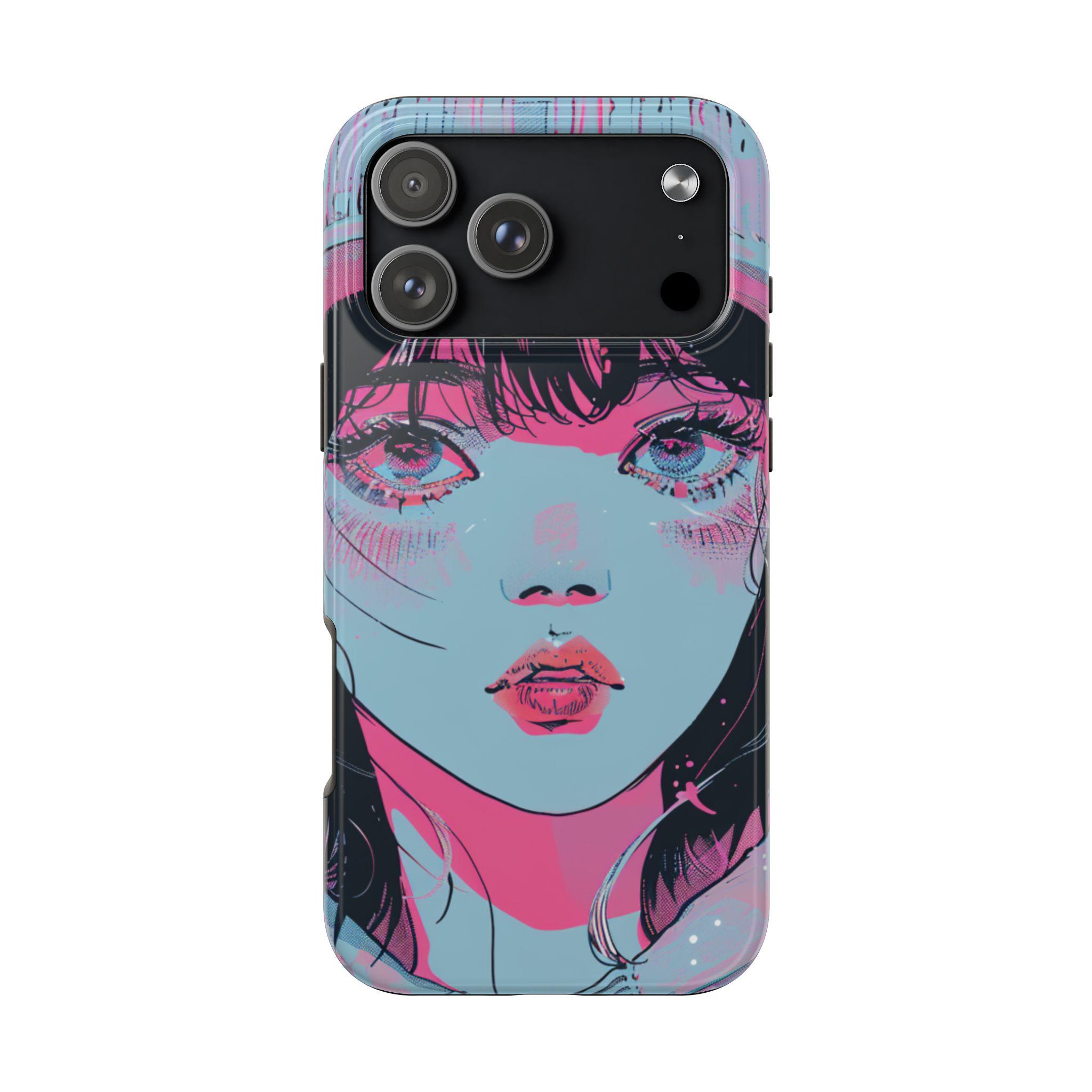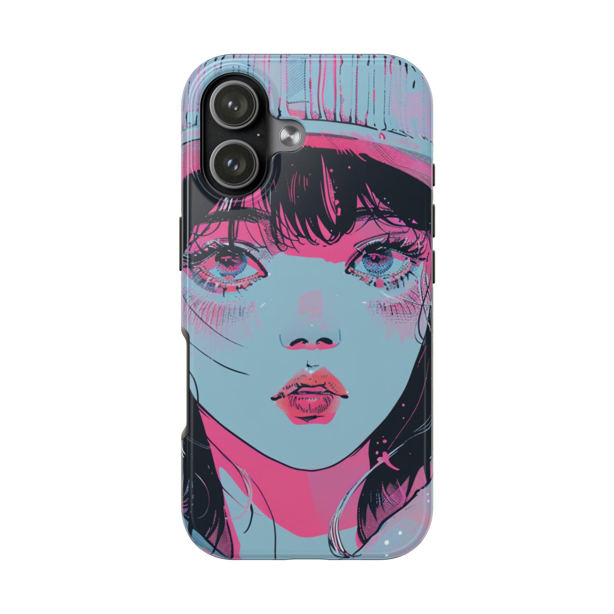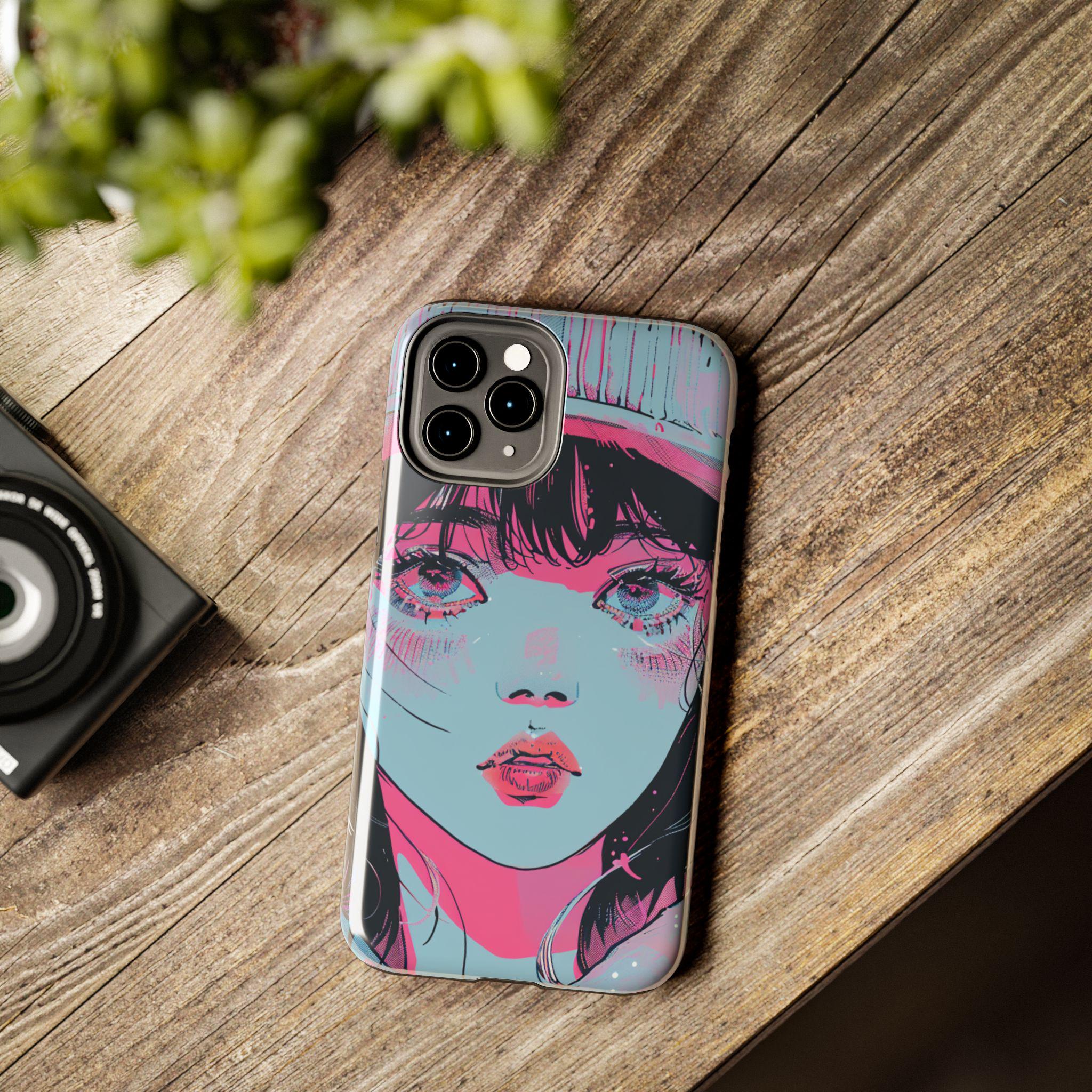 This sturdy phone case wears bold, sketchy brushstrokes like an attitude. The retro-anime portrait—rendered in aqua, neon pink, and black—feels both nostalgic and electric, a handheld piece of graphic art that catches the eye without shouting. The two-piece shell hugs the phone while the flexible rubber liner soaks up shocks, and the lay-flat bezel keeps the screen safe from everyday scuffs. Weather-resistant UV protection keeps the colors vivid, and the glossy finish deepens the neon contrast for a striking, gallery-ready look. For people who treat their phone as an extension of personal style, this case blends art and armor in one confident package.
