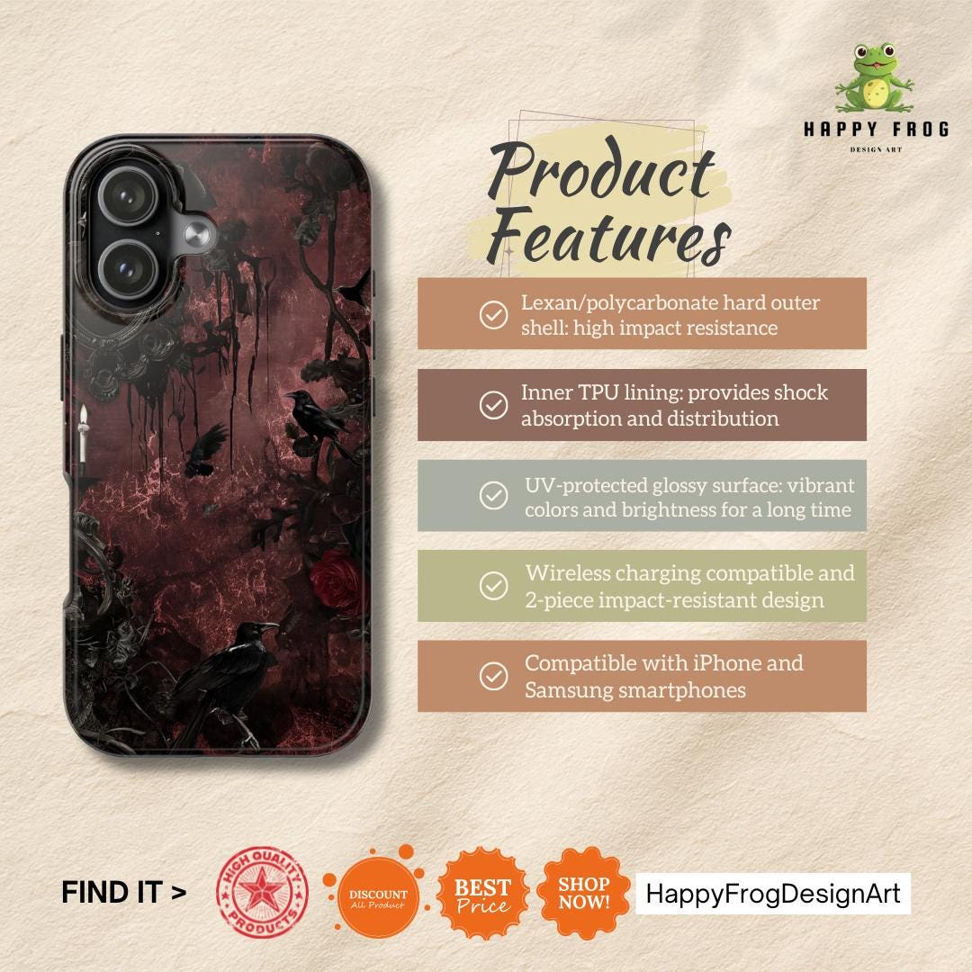 Enter a world of shadows and elegance. This exclusive HappyFrogDesignArt masterpiece captures the soul of gothic romance. Featuring majestic ravens, deep red roses, and the haunting glow of a single candle against a misty crimson background, this case is for those who find beauty in the dark and the mysterious.