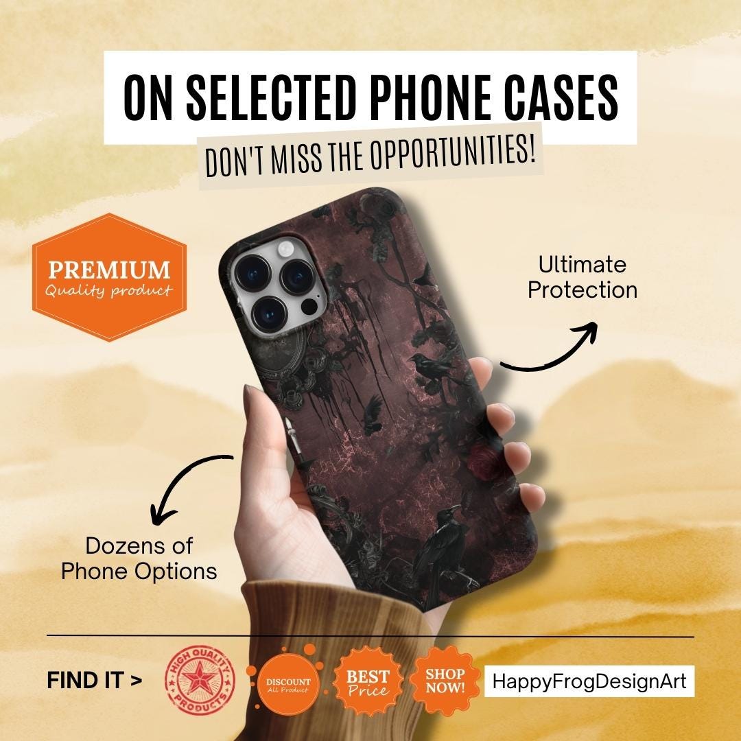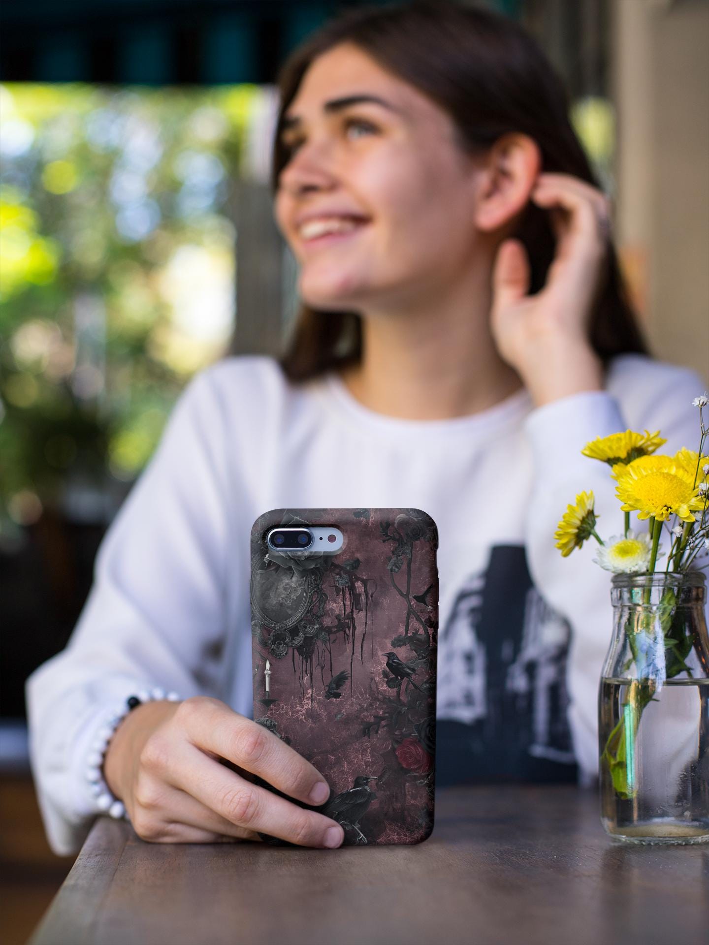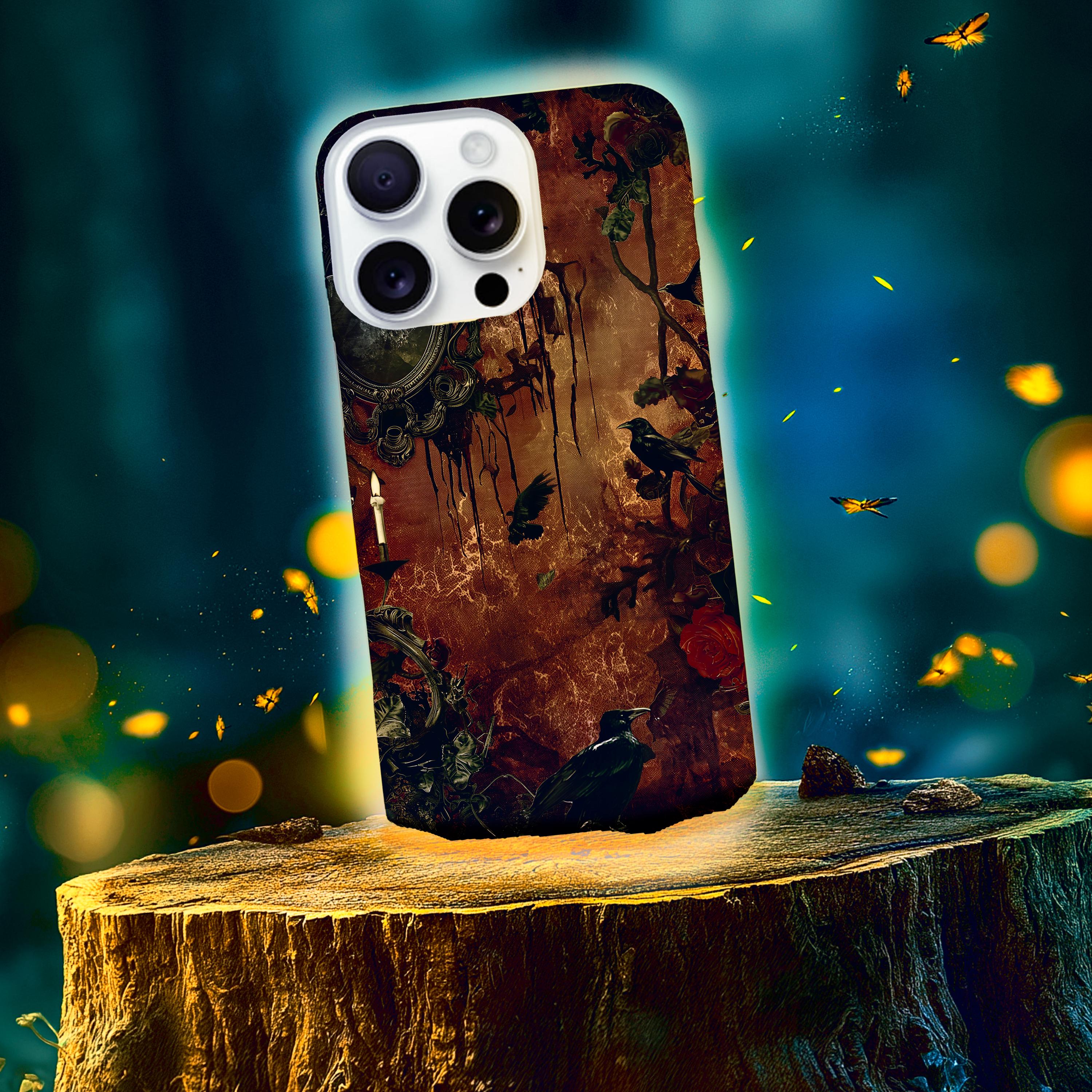 A tough phone case that brings Victorian Gothic mood into everyday life. Deep burgundy and inky black form a hazy backdrop for ravens perched among red roses, lit by dripping candlelight. Hold it and you feel the hush of an old parlor, the whisper of pages and smoke — but with modern protection built in. The sturdy shell and soft inner liner work together so your phone weathers city streets, late-night cafés, and alleyway rain without losing its dark, romantic edge. This case suits someone who dresses their devices with atmosphere: collectors of gothic art, late-shift writers, and anyone who likes beauty with teeth.