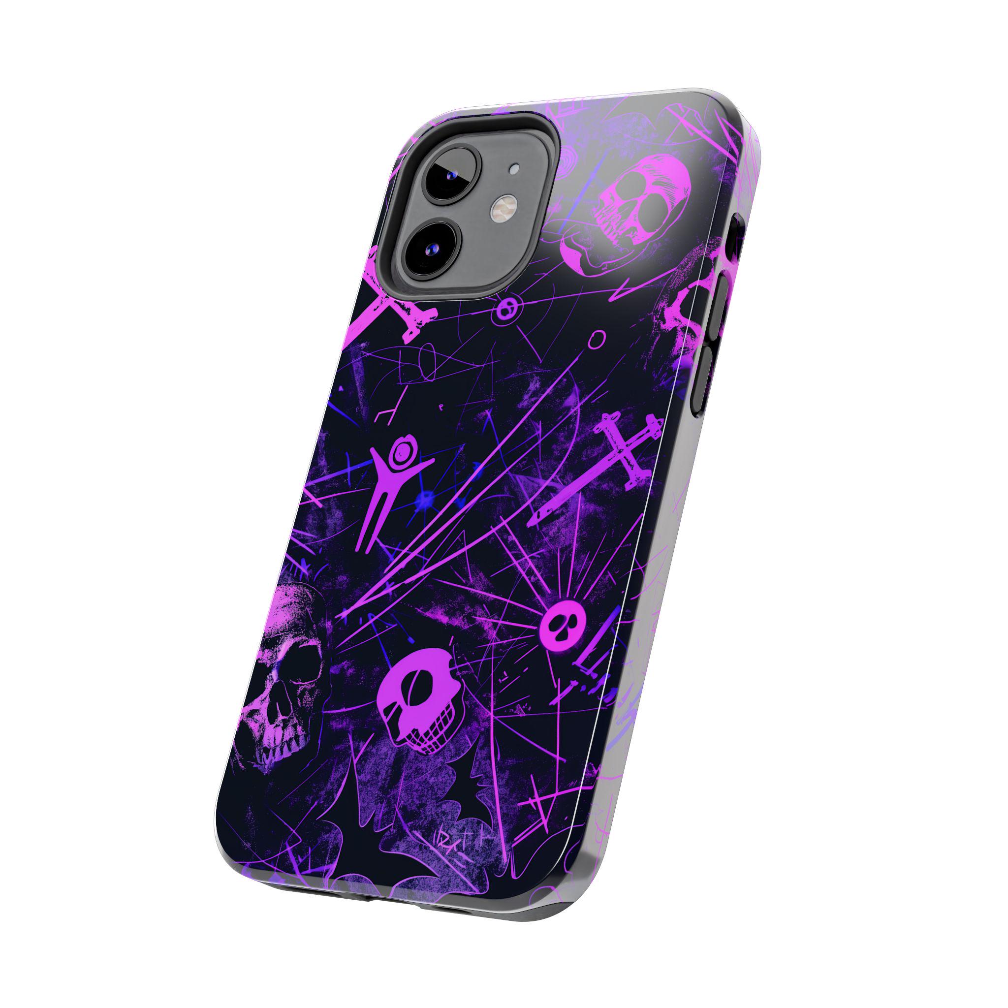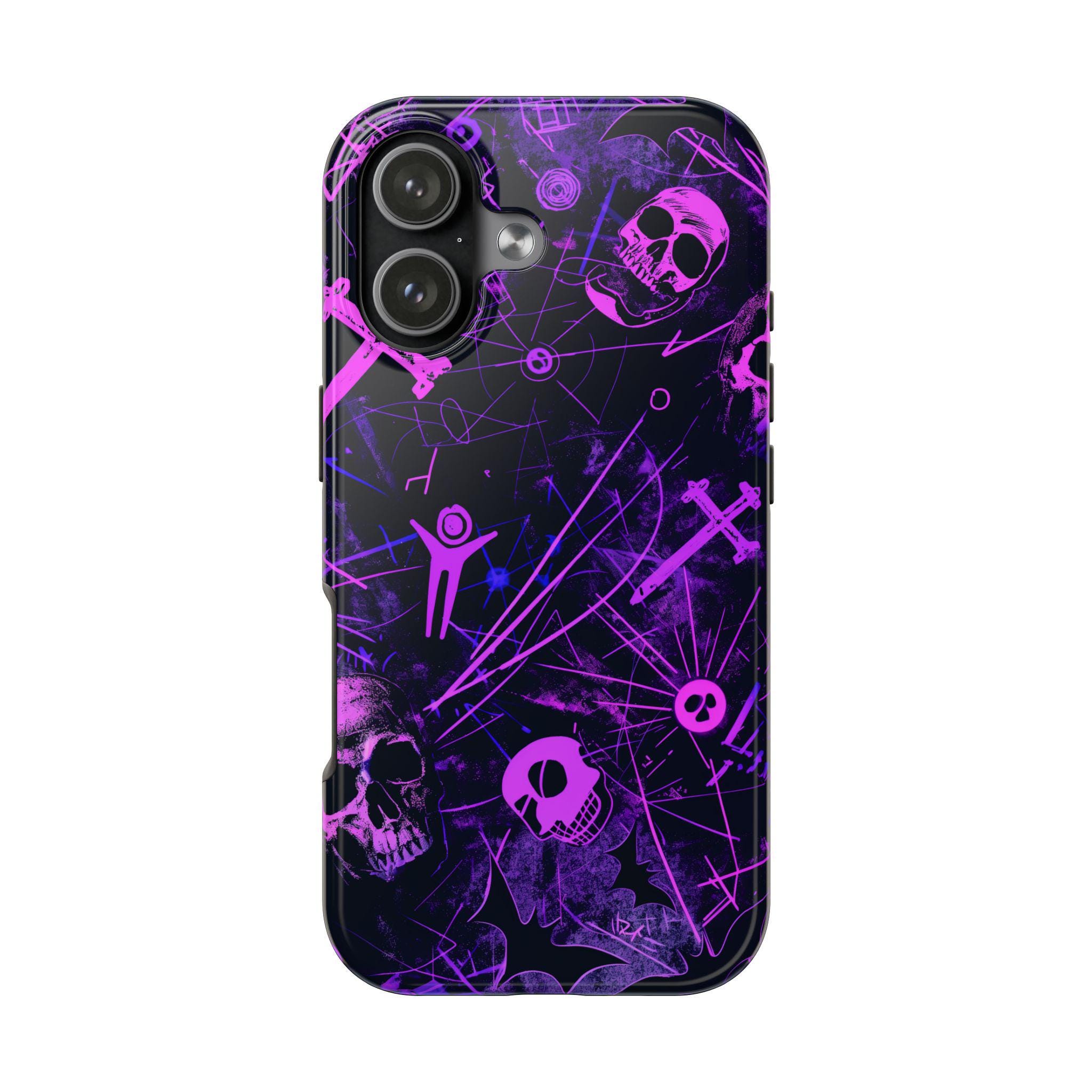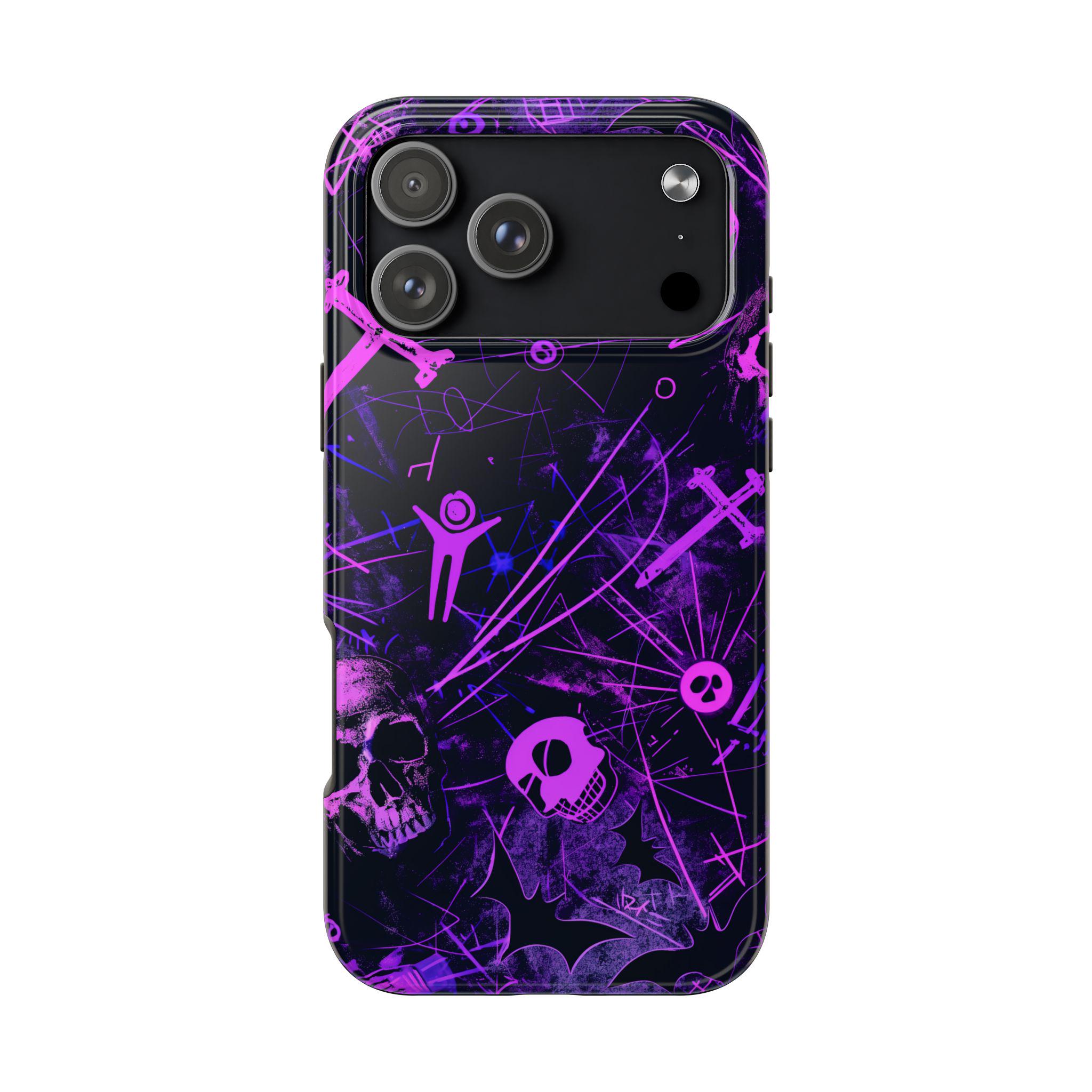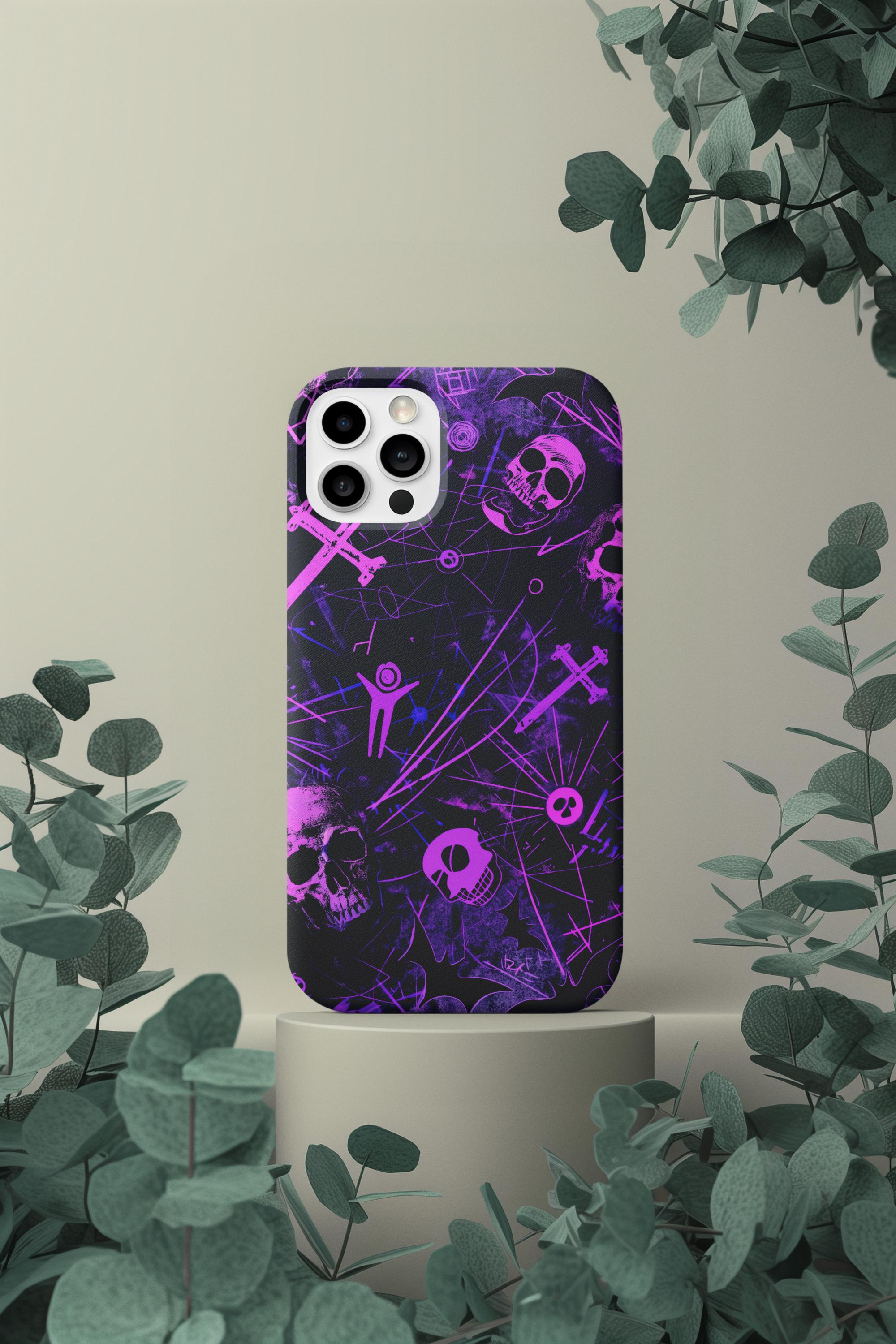 A bold phone case that channels the pulse of after-dark city life. Neon pink skull silhouettes and tangled energy lines cut across a deep purple and black field, creating an Urban Gothic vibe that feels equal parts nightclub and occult map. It sits heavy in the hand but light in attitude — a protective shell that reads like a statement. Slip it on before a late-night walk, a show, or when you want your phone to stand out in a crowd. The glossy surface makes the neon pop under streetlights, while the dark backdrop keeps the look gritty and mysterious. This case becomes part of your carry — a tactile reminder of subway rides, vinyl bars, and whispered city myths.