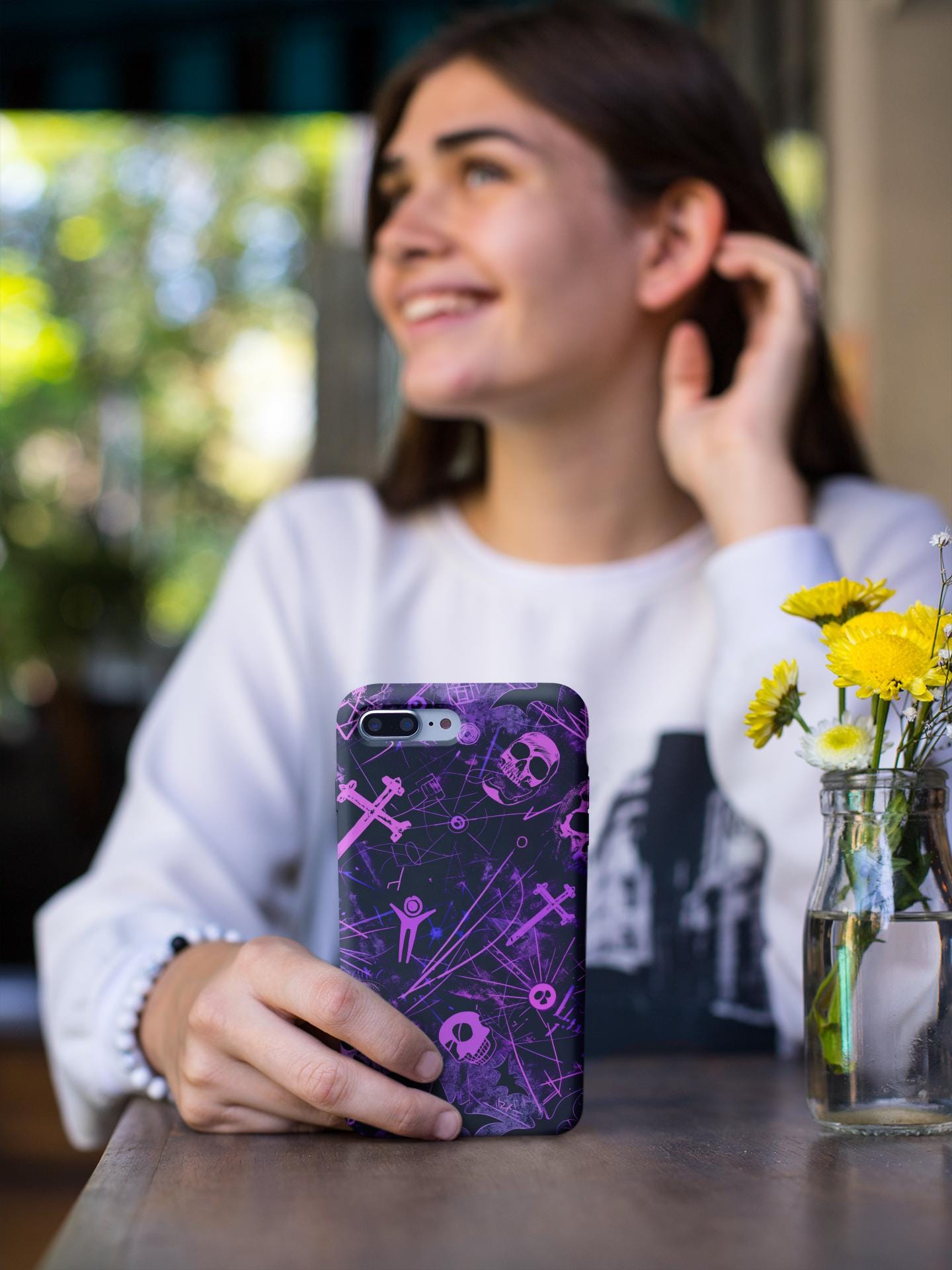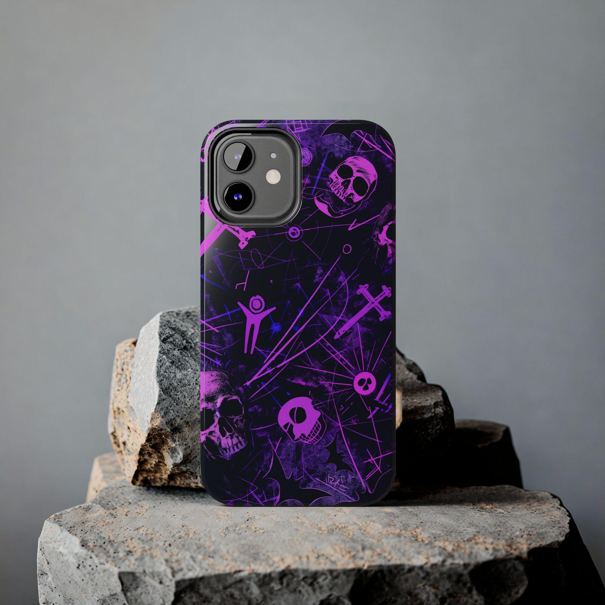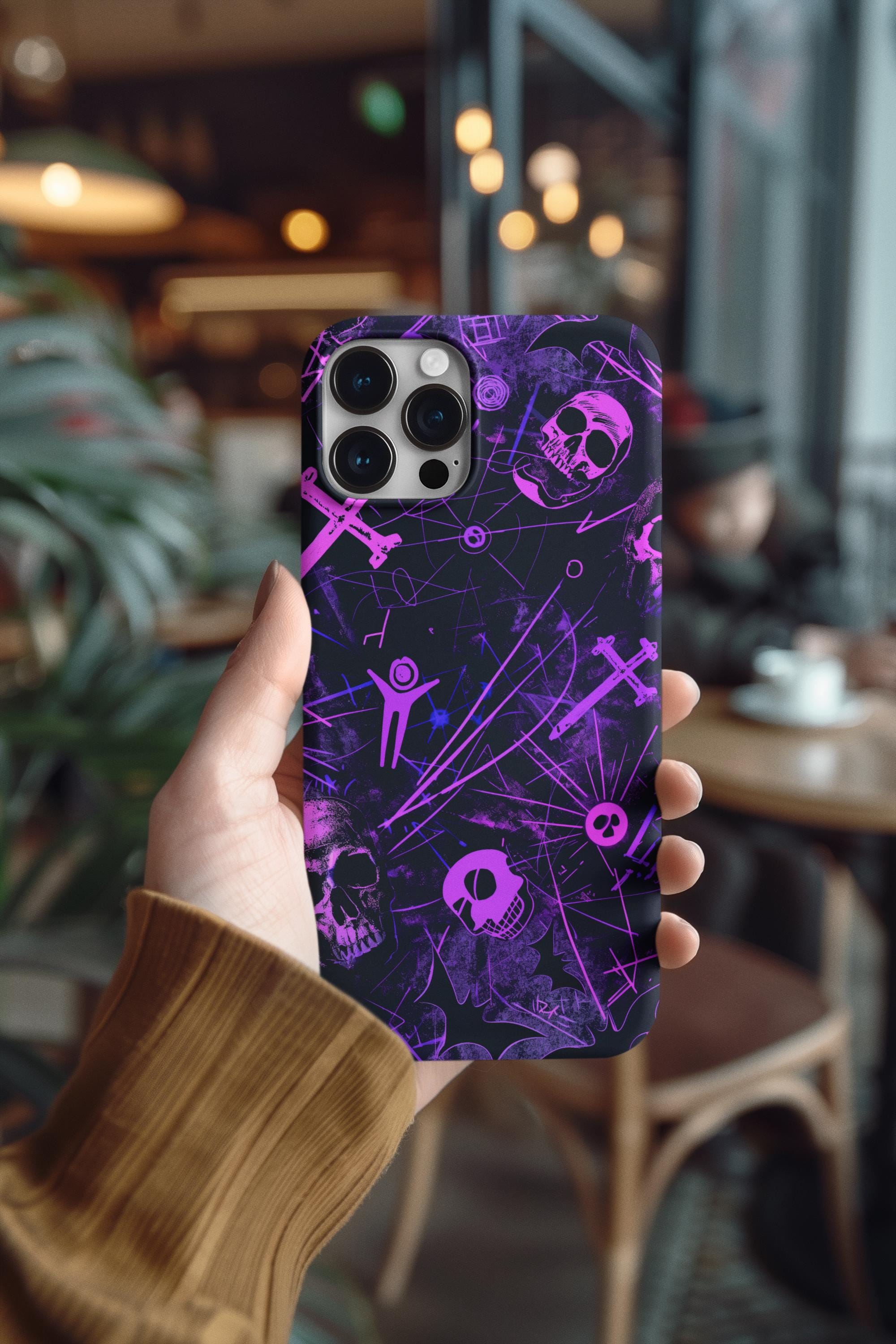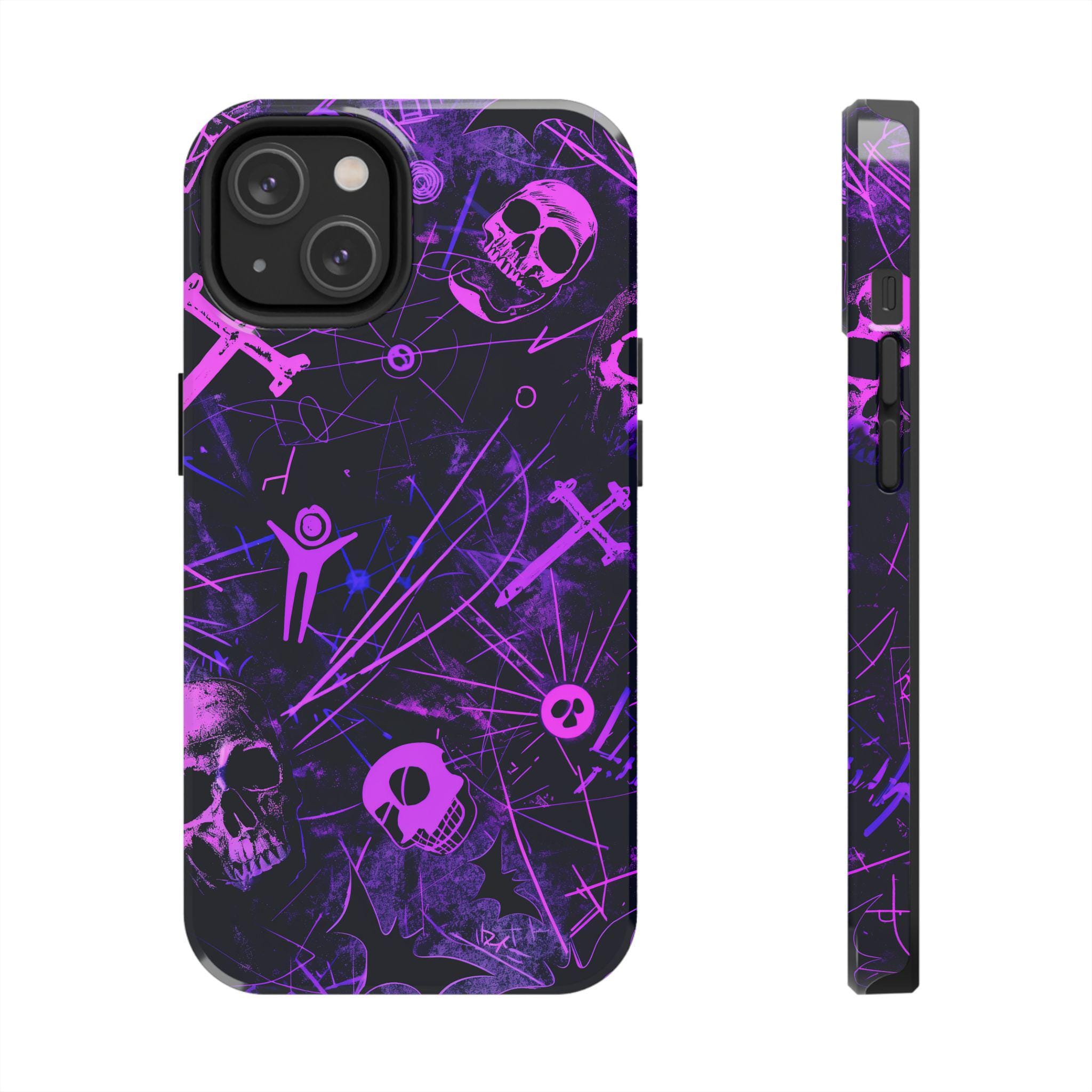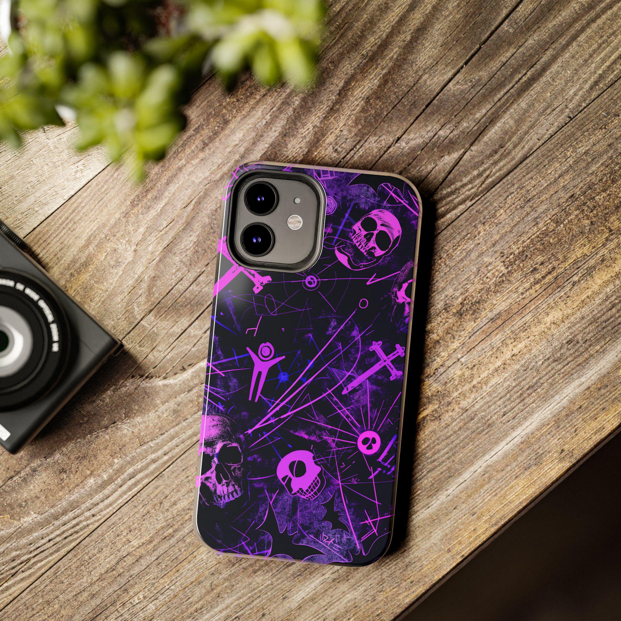 A bold phone case that channels the pulse of after-dark city life. Neon pink skull silhouettes and tangled energy lines cut across a deep purple and black field, creating an Urban Gothic vibe that feels equal parts nightclub and occult map. It sits heavy in the hand but light in attitude — a protective shell that reads like a statement. Slip it on before a late-night walk, a show, or when you want your phone to stand out in a crowd. The glossy surface makes the neon pop under streetlights, while the dark backdrop keeps the look gritty and mysterious. This case becomes part of your carry — a tactile reminder of subway rides, vinyl bars, and whispered city myths.