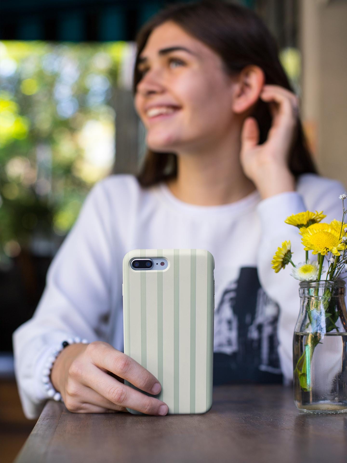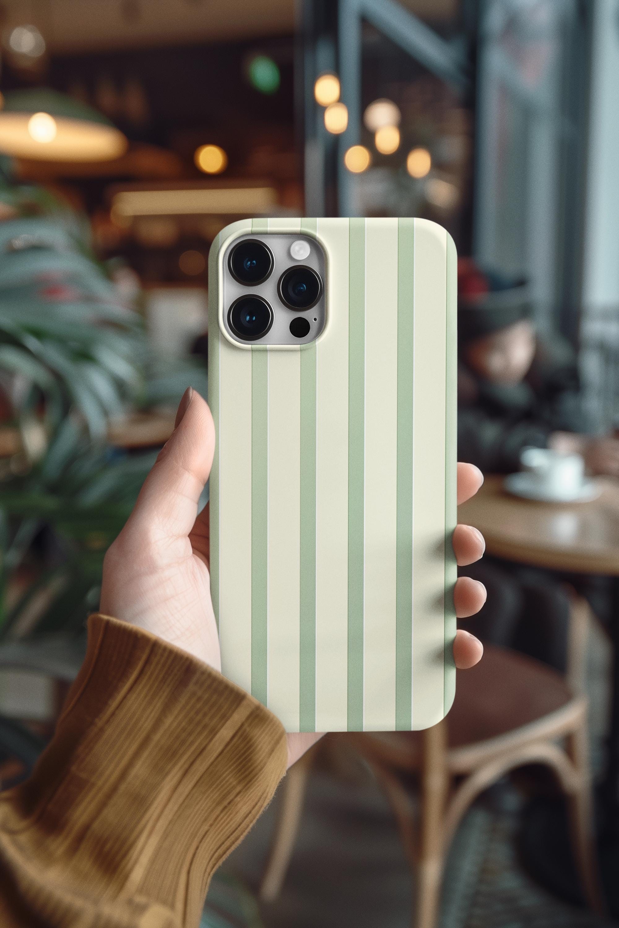 A slim, protective phone case with soft, muted vertical stripes that bring calm to your everyday carry. The glossy finish gives the gentle sage and cream palette a subtle sheen while the two-piece construction — a tough polycarbonate shell and a flexible TPU liner — guards against drops and bumps. The lay-flat bezel keeps the screen off surfaces, and UV protection helps the colors stay true through outdoor use. Lightweight and pocket-friendly, this case blends dependable impact resistance with a quiet, timeless look you’ll reach for every day.