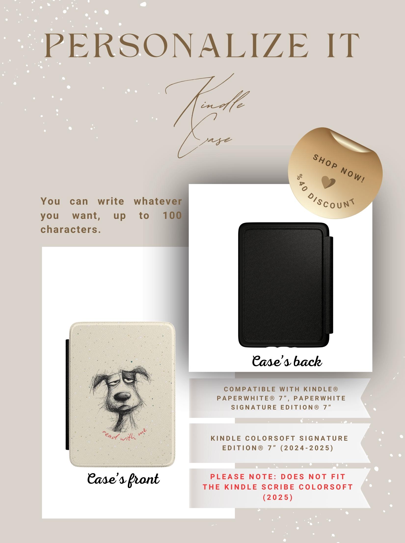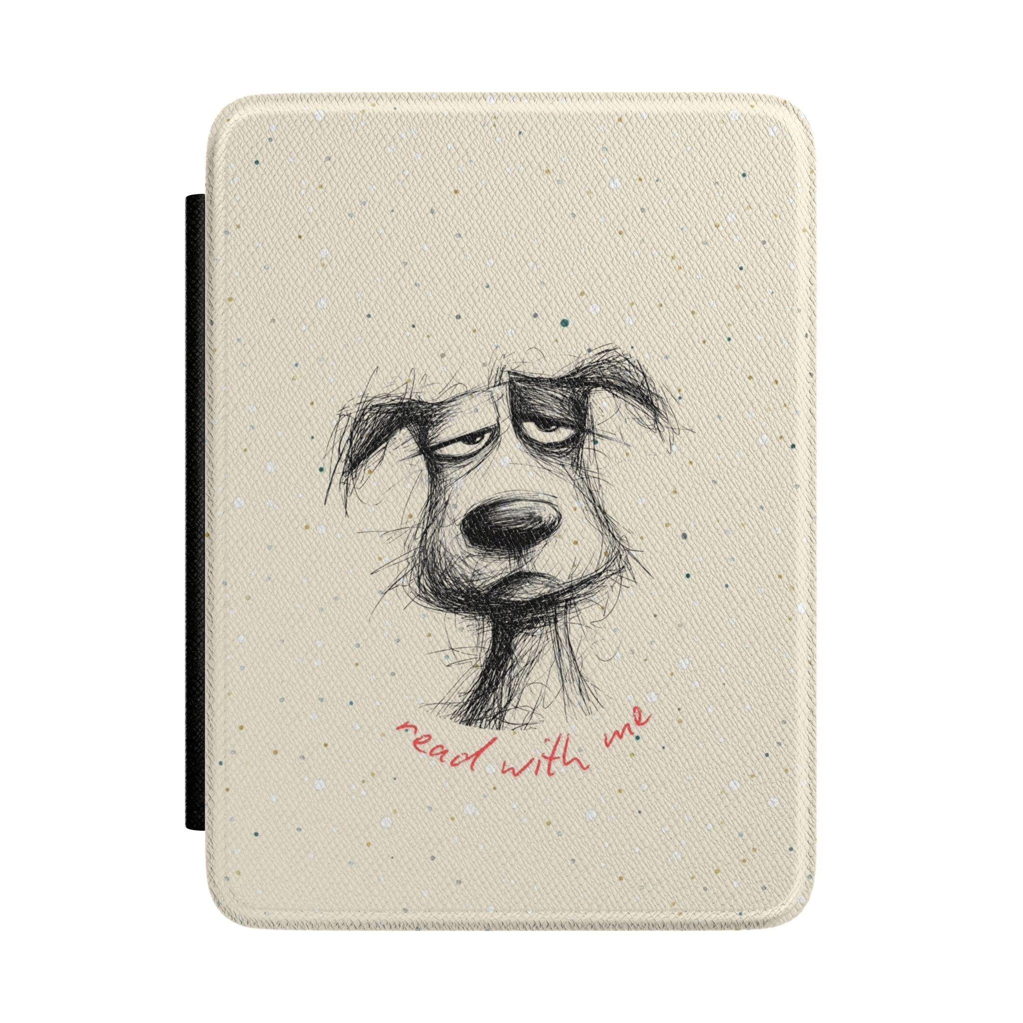 This soft, satiny Kindle case brings gentle charm to quiet reading moments. The cream-colored cover features a hand-sketched, slightly grumpy dog face and the small, hand-lettered phrase “read with me,” creating a warm, wry companion for slow evenings and long commutes. The magnetic front lid closes securely while the soft fabric lining cushions your Paperwhite, and the interior hand strap keeps your device steady while you turn pages or relax in bed. Lightweight and durable 100% PU leather gives the look of leather without heavy maintenance. It slips easily into bags and nests comfortably on nightstands—made for readers who value comfort, personality, and a touch of humor in their everyday gear.